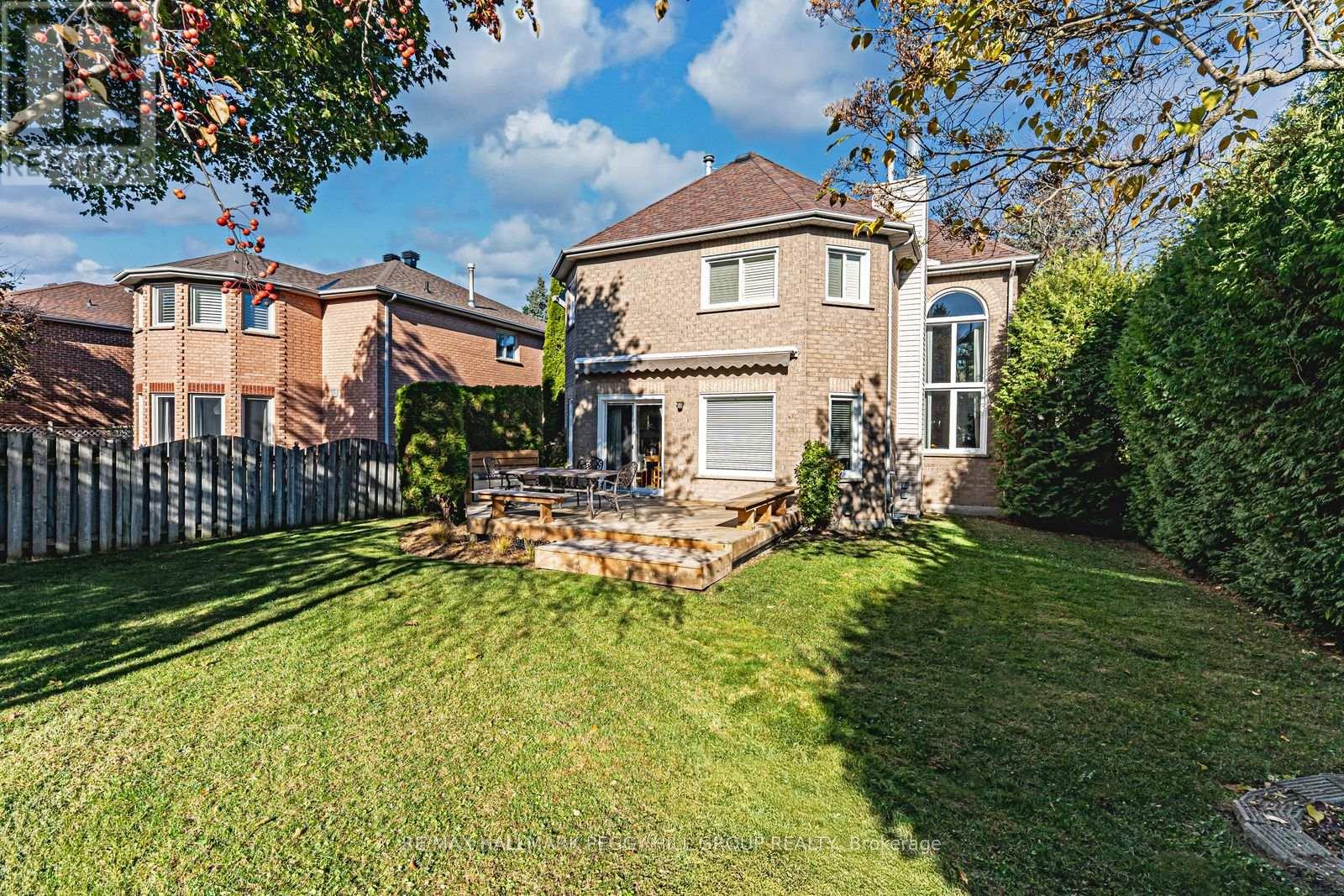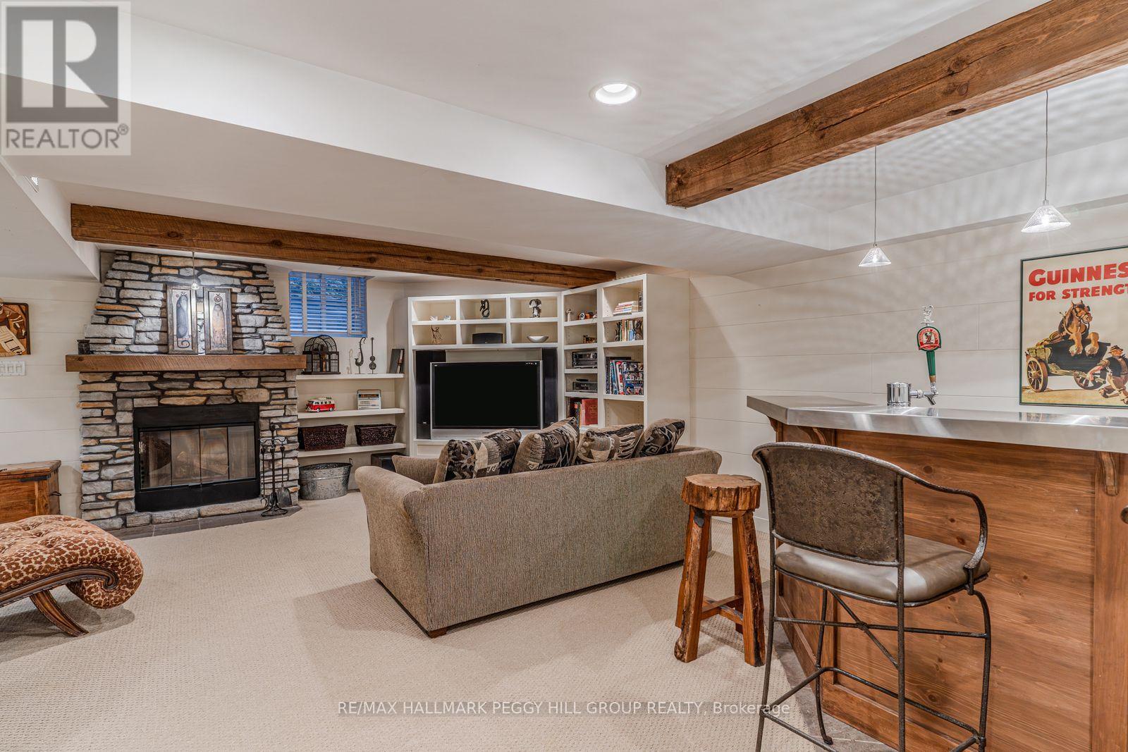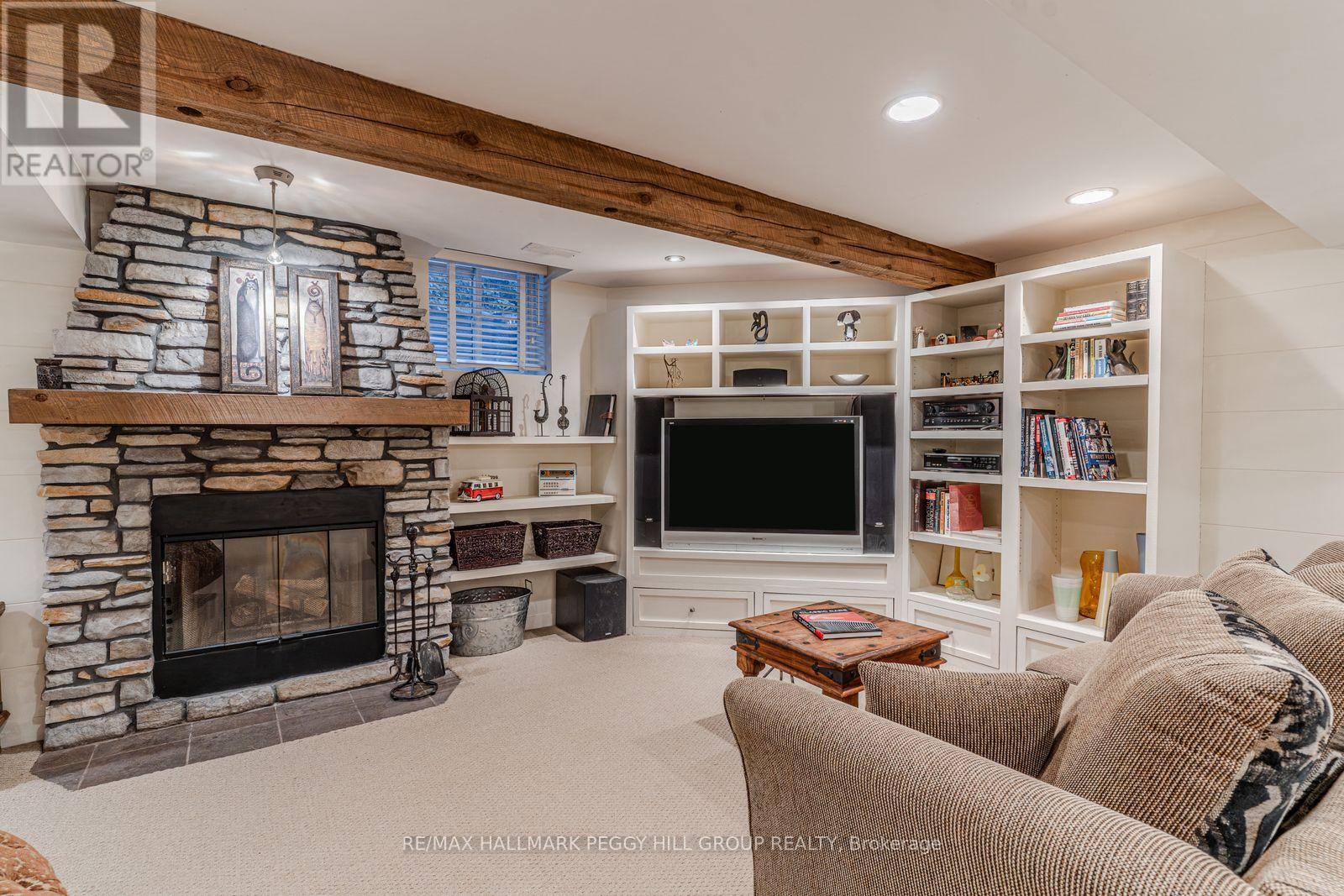 SPACIOUS FAMILY HOME WITH STANDOUT CURB APPEAL ON A PREMIUM LOT! 15 Charing Crescent is a Coscan-built, all-brick 2-storey set on a quiet crescent in Aurora Highlands, surrounded by established homes and a street that feels easy to come home to. An interlock walkway, stone detailing, black window trim and doors, and a covered front porch are complemented by an attached double-car garage and driveway parking for 4. Nearly 2,400 square feet above grade showcases soaring ceilings and oversized arched windows filling the great room and dining room with natural light. The well-equipped kitchen features white cabinetry, stainless steel appliances, an island, and a striking three-sided gas fireplace that connects the kitchen and family room and draws people together. Four upper-level bedrooms include a primary retreat with a walk-in closet and a spa-inspired 5-piece ensuite complete with a glass-walled shower, freestanding soaker tub, and dual vanity. The finished basement adds flexibility, featuring a recreation room with a bar, shiplap accents, a wood-burning fireplace, a 5th bedroom, a 4-piece bathroom, and plenty of storage. Outdoors, the fully fenced backyard is framed by mature trees and shrubs, with a deck featuring built-in benches and an awning that invites relaxed evenings and casual gatherings. Schools, parks, playgrounds, and public transit are within walking distance, while St. Andrew's College, Highway 400, and Highway 404 are under 15 minutes away. This is a #HomeToStay that quietly fits into your life and feels right long after the door closes behind you. (id:51158)