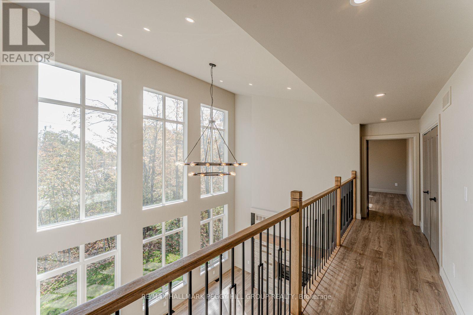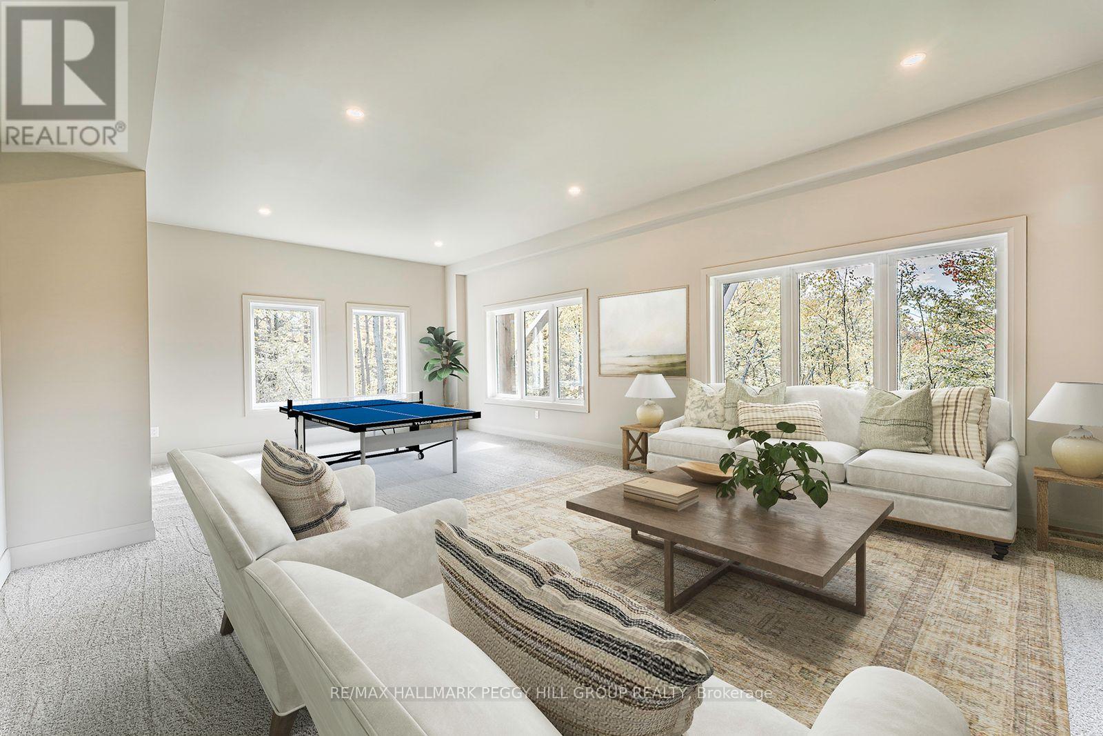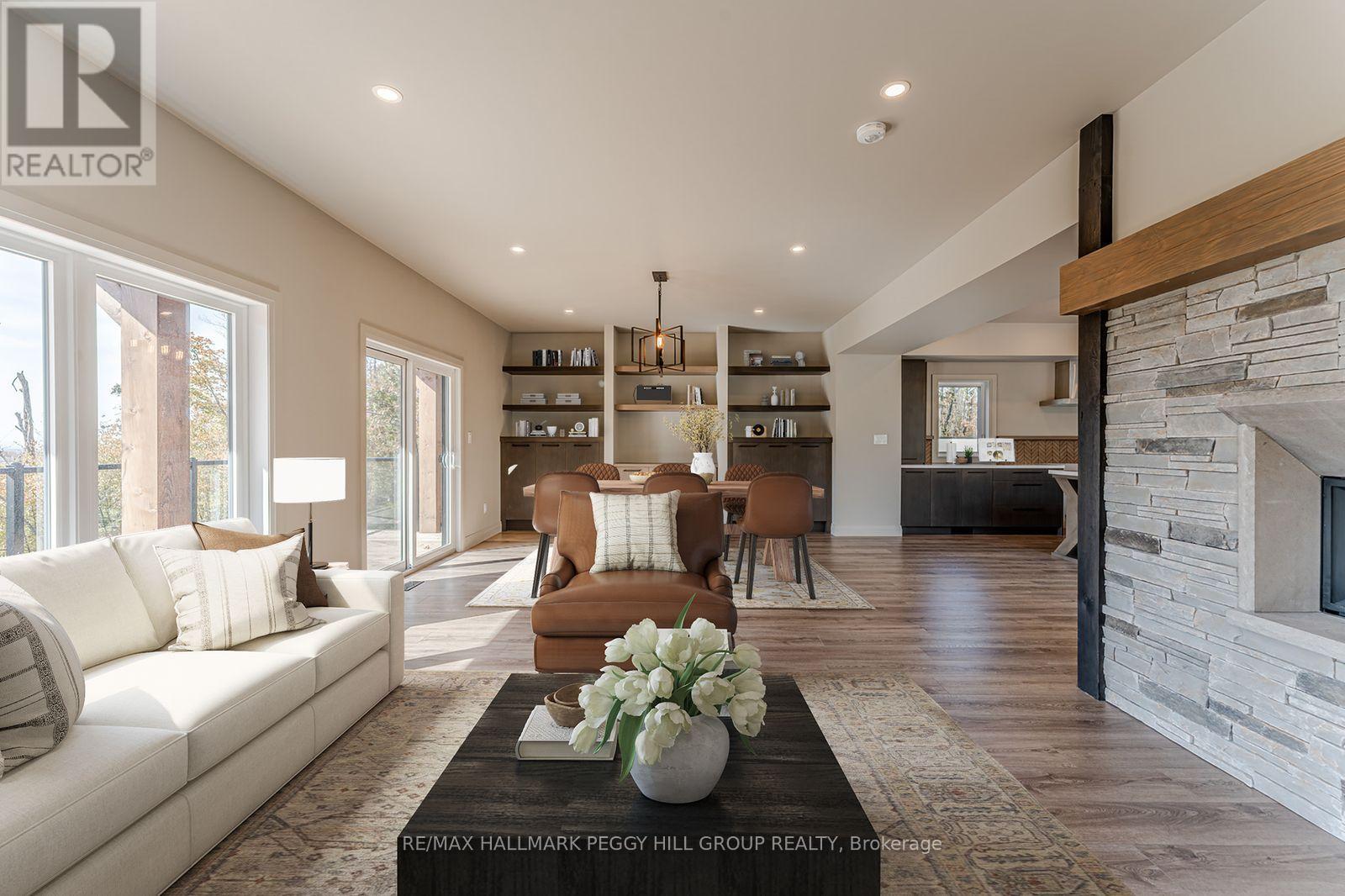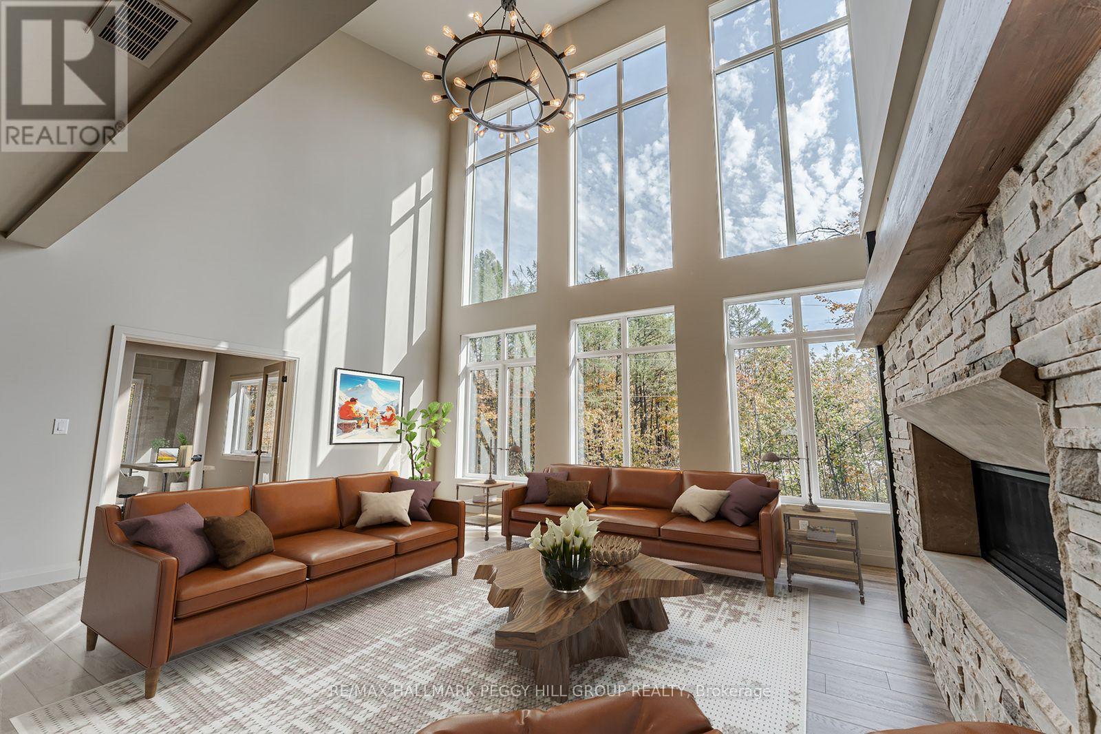 2024-BUILT 4,200+ SQ FT CHALET-STYLE RESIDENCE MEETS FOUR-SEASON ADVENTURE IN HORSESHOE VALLEY! Indulge in the artistry of modern design at this custom-built 2024 home in Horseshoe Valley, capturing panoramic western views and sunsets from its commanding hilltop setting. Boasting over 4,200 sq ft of above-grade living space, this modern chalet showcases striking black Hardie Board siding, stone facade accents, a fibreglass roof, and multiple glass-railed decks designed to celebrate the surrounding scenery. The open-concept main level is ideal for entertaining, highlighted by a 24-ft vaulted ceiling, floor-to-ceiling windows, and a double-sided Napoleon fireplace connecting the great room to the dining/family areas. The gourmet kitchen features Caesarstone quartz countertops, custom two-tone cabinetry, a dramatic X-leg island, a chevron tile backsplash, a pantry, and modern lighting, all flowing to a dining area with built-in shelving and a walkout. A private main-floor office provides a peaceful workspace, while the third level hosts the luxurious primary suite with its own fireplace, balcony, walk-in closet, and spa-inspired ensuite with a freestanding tub, double vanity, and glass shower, along with two additional bedrooms, a full bathroom, and a laundry room. The ground level extends the home's versatility with 9'9" ceilings, a bright rec room, an additional bedroom, and a full bathroom. Engineered hardwood, ceramic tile finishes, and meticulous craftsmanship are complemented by superior construction featuring an ICF foundation, LVL beams, and double-studded 2x6 walls. Within walking or golf cart distance to Horseshoe Resort, The Valley Club, tennis courts, and scenic trails, and just minutes to Vetta Nordic Spa, Copeland Forest, Lake Horseshoe, local dining, and Highway 400, this exceptional home is also near a new school, community centre, clinic, and fire station, defining sophisticated four-season living in one of Ontario's most prestigious destinations. (id:51158)