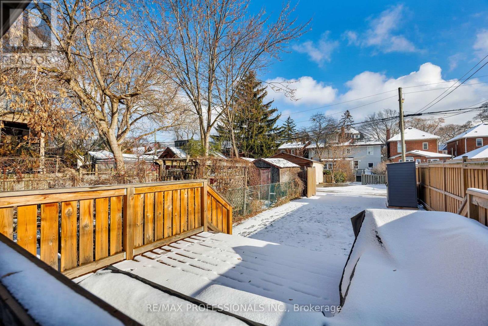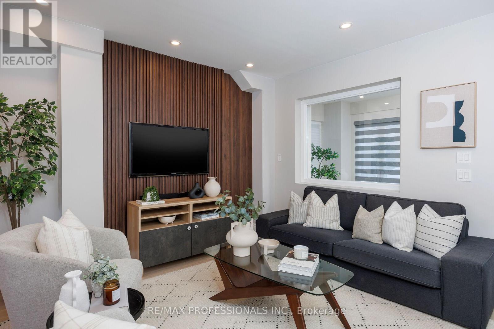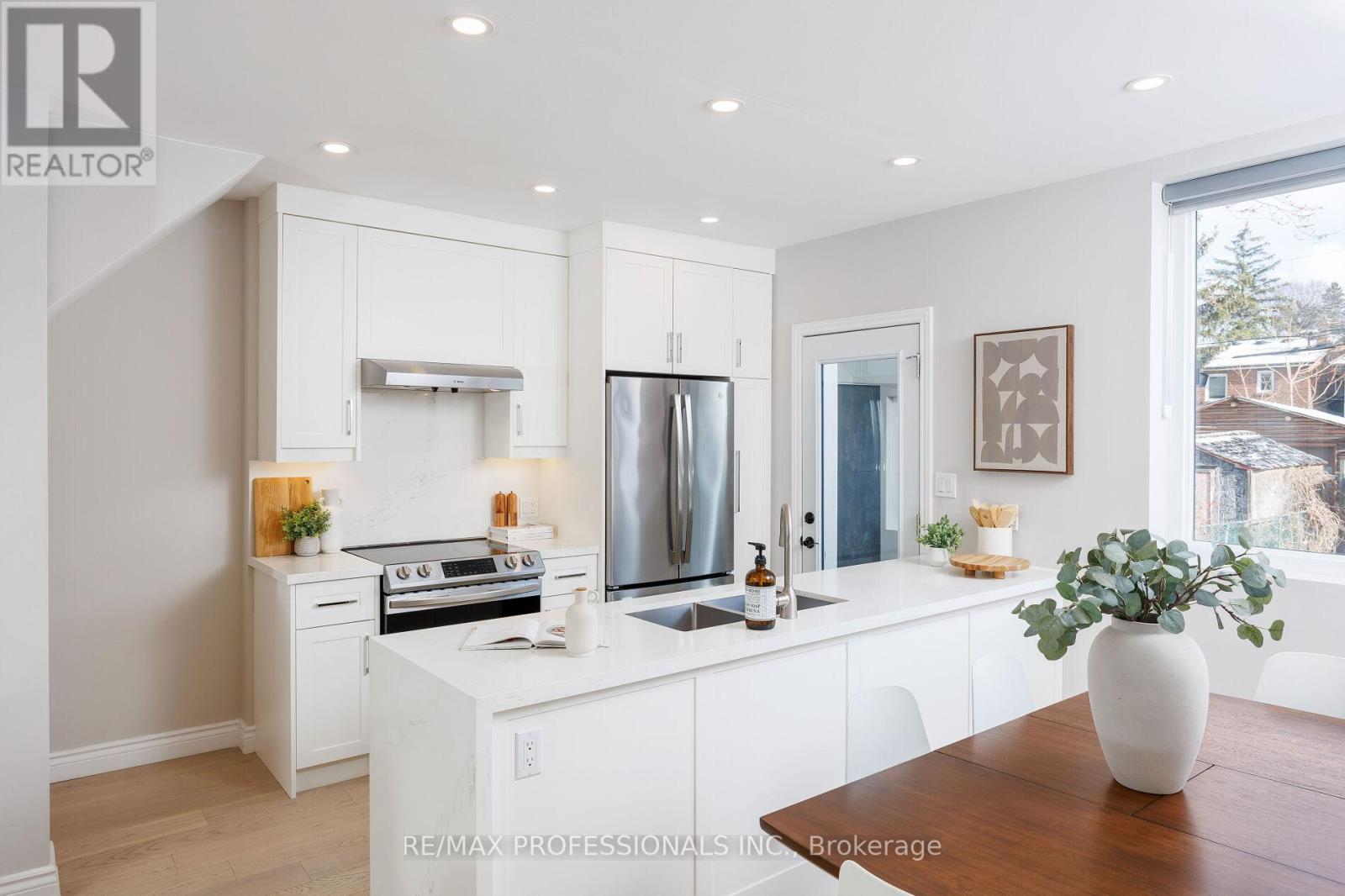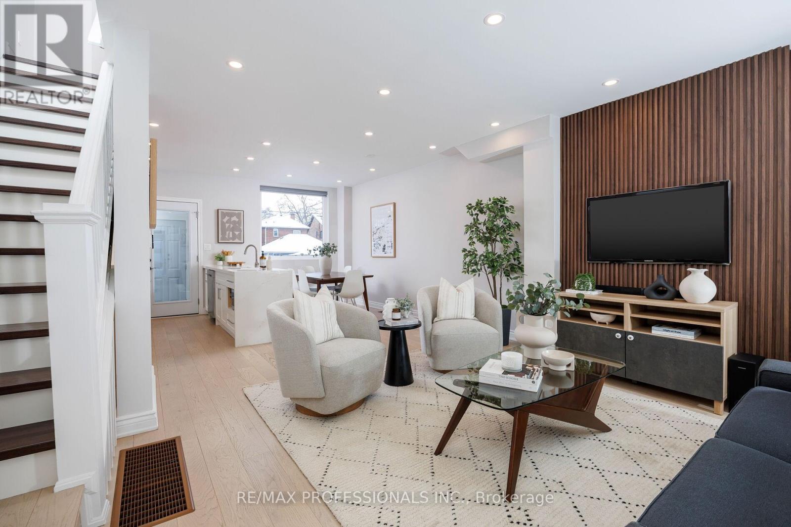 Discover this thoughtfully designed, turnkey home in the coveted Bloor West community. Plenty of natural light, the open-concept layout is perfectly suited for both family gatherings and entertaining guests. The designer eat-in kitchen is a features elegant quartz countertops, high-end appliances, and a generous pantry for your storage needs. Relax in the cozy family room, complete with a striking feature wall. Enjoy the convenience of a rare main floor powder room.Venture upstairs to find three spacious bedrooms, including a luxurious primary suite with double closets. Spa-like bathroom equipped with a large soaking tub, perfect for unwinding after a long day. The fully finished, open concept basement offers good ceiling height and additional living space, complete with laundry and stylish three-piece bathroom. Step outside to a landscaped and fenced backyard featuring a newer deck, perfect for summer evenings and entertaining. Generous parking for two cars. Located in highly desirable school districts. Enjoy all the neighbourhood amenities- including quick walk to TTC & family friendly parks. (id:51158)