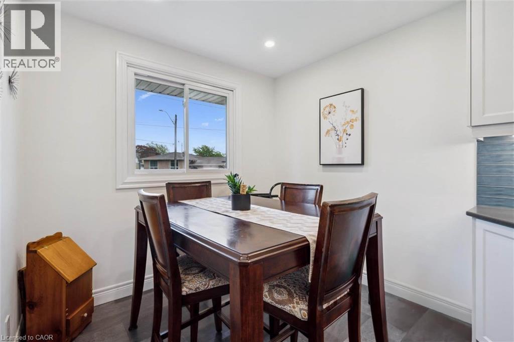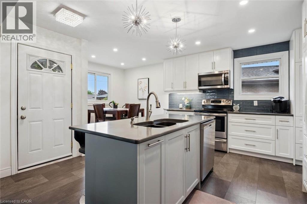 Beautifully updated 3+1 bdrm 4-level backsplit in quiet family-friendly court in Hamilton's desirable Templemead neighbourhood! Charming home blends style & functionality offering perfect sanctuary for growing families. Front porch W/charming arches welcomes you into the home. Heart of the home is stunning kitchen renovated in 2019 W/Caesarstone counters, subway tile backsplash, full-height white cabinetry, mostly S/ S appliances & 2 pantry cupboards. Centre island W/pendant lighting make it a hub for casual meals & entertaining. Adjoining dining area easily fits large table for formal gatherings! Luxury cushioned vinyl plank floors provide warm & soft feel underfoot, leading to living room where newer hardwood floors & bay window let natural light in. This open-concept space is ideal for relaxing & hosting guests. A few steps up reveal 3 bdrms W/closet space & natural light. Primary bdrm offers direct access to cheater ensuite W/large vanity & shower/tub. Lower level incl. rec room W/ brick wood-burning fireplace & sizable window creating warm atmosphere. There is 2pc bath & space for an office or a 4th bdrm. Down a few more steps is a massive versatile room-perfect for playroom, gym or hobby room. Utility room offers laundry & storage. Completing this level is28ft cold room. Sep entrance to bsmt opens the door to creating future in-law suite! Outside enjoy oversized back deck W/natural gas line, ideal for BBQs & lounging. Cool off in above-ground heated saltwater pool or unwind around firepit area. Fully fenced yard surrounded by gardens ensures a safe spot for kids & pets. Shed for storage. Updates incl: 2024 LG washer/dryer, 2019 power vented HWT, 2018 furnace & AC, updated electrical panel & approx. 3yr old pool liner providing peace of mind for yrs to come! Steps from Templemead Elementary School & park. Mins from shopping, groceries, restaurants, banks & more. Less than 10-min drive to 403, commuting to Burlington, Oakville, Mississauga & Toronto is a breeze! (id:51158)