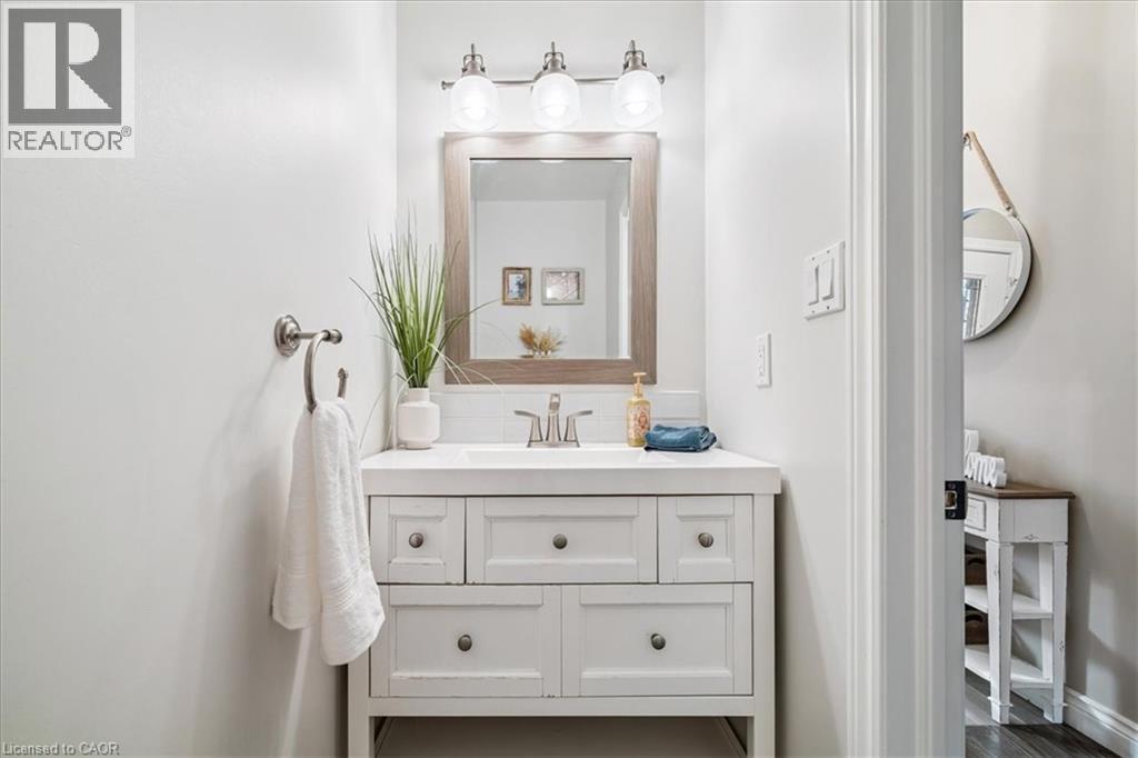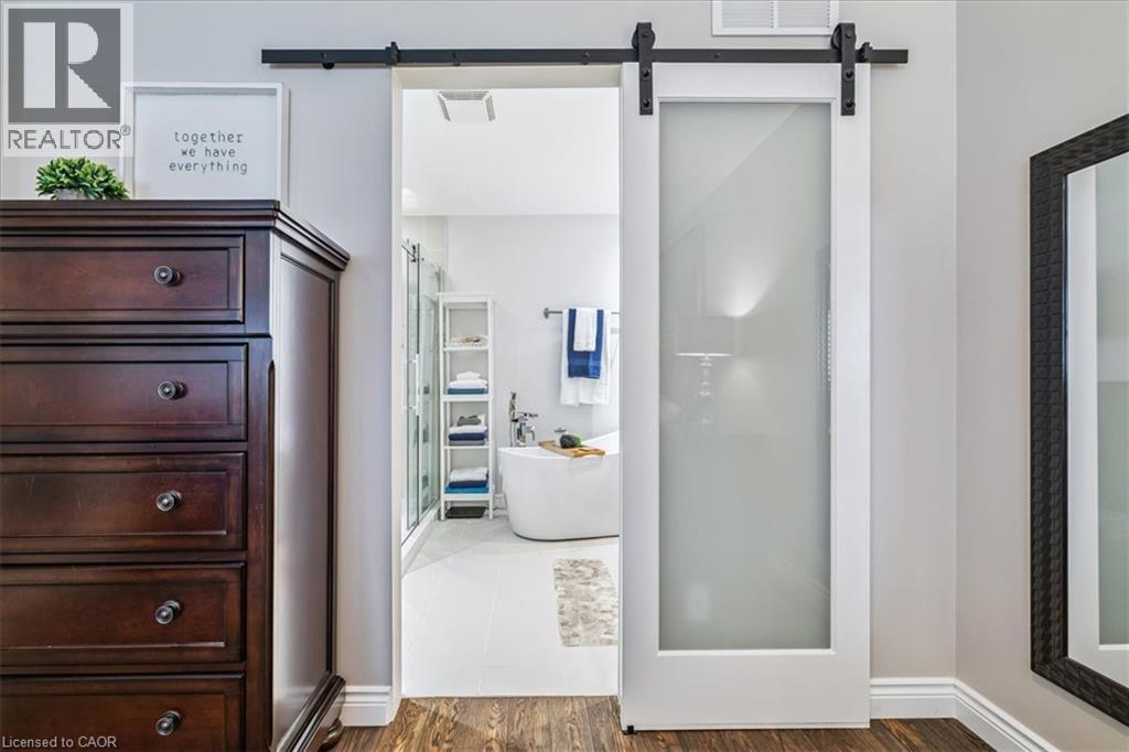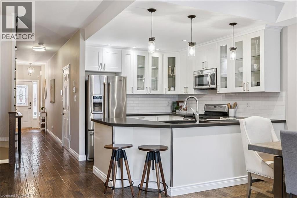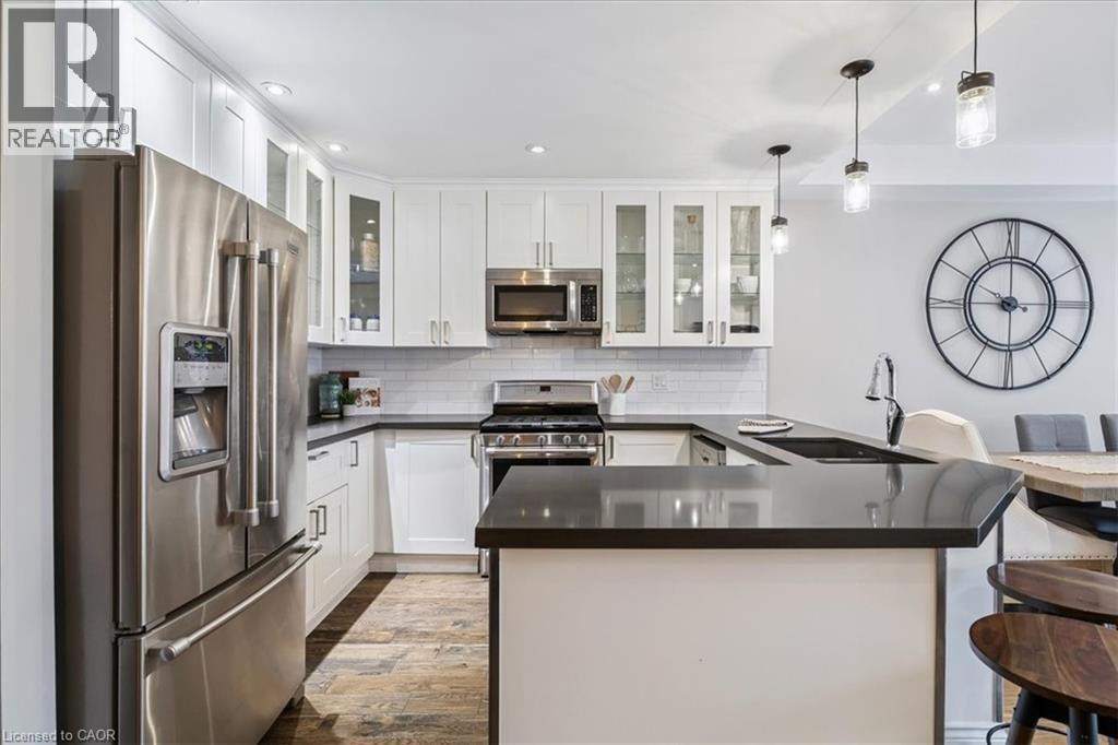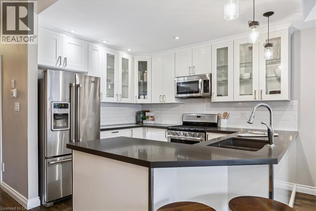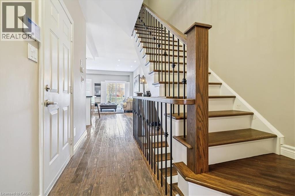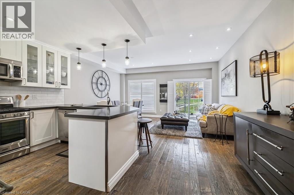 Stunning upgrades, elegant design & prime location! This beautifully updated townhome, just off HWY 403 & the Linc, blends modern style, comfort & everyday convenience. Enjoy rich 5” oak hardwood floors, upgraded lighting & LED pot lights throughout. The bright kitchen features Caesarstone counters, soft-close cabinets, stainless steel appliances, undermount sink & sleek subway tile backsplash. The open living/dining area offers great natural light & walkout to a private courtyard overlooking a landscaped parkette — a peaceful spot for morning coffee or evening relaxation. Interior garage access & stylish powder room complete the main level. Upstairs, the spacious primary suite offers 2 closets & a stunning 5-pc ensuite with soaker tub, stone accents, glass shower, frosted barn door & double vanity. The second bedroom also features a 4-pc ensuite & generous closets. The finished lower level includes a laundry room with cabinetry, sink & backsplash, plus a large rec room with media wall, stone fireplace & custom built-ins, along with an upgraded 3-pc bath. Located in a walkable, highly sought-after neighbourhood near scenic trails, the Bruce Trail, Chedoke Golf Course, Locke St., Westdale, McMaster & St. Joe’s Hospital. Minutes to shops, cafés & parks. Meticulously finished from top to bottom — a hidden gem offering the perfect blend of luxury & lifestyle! (id:51158)