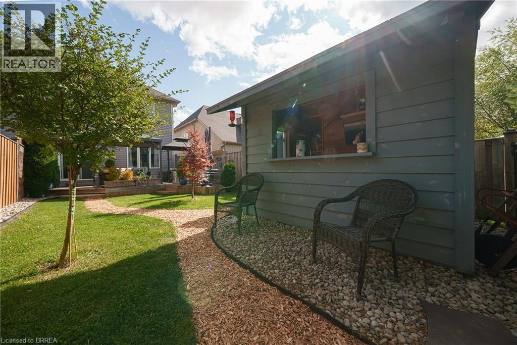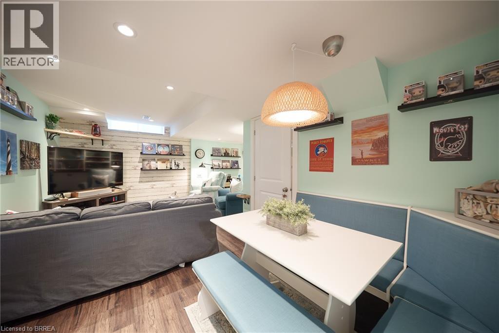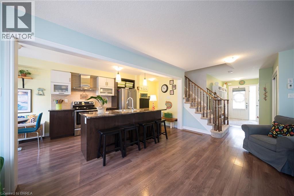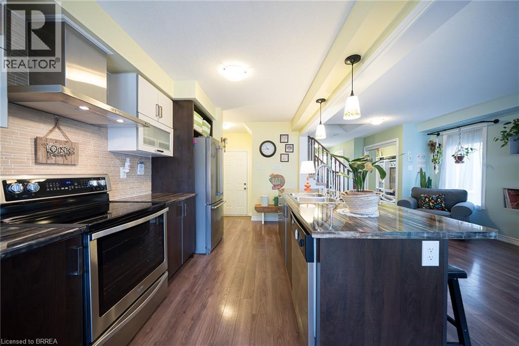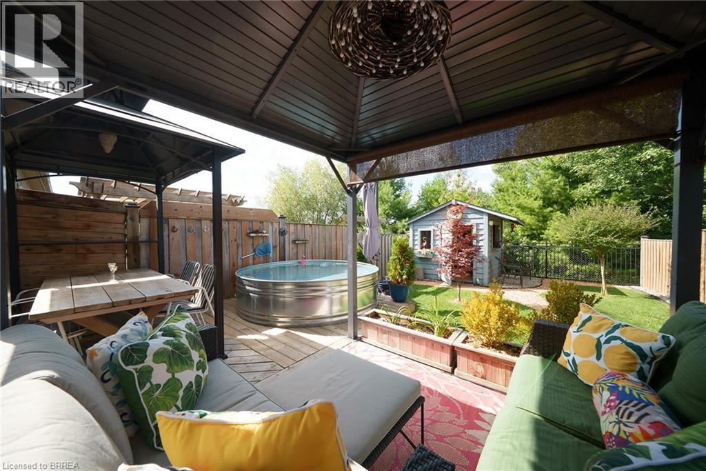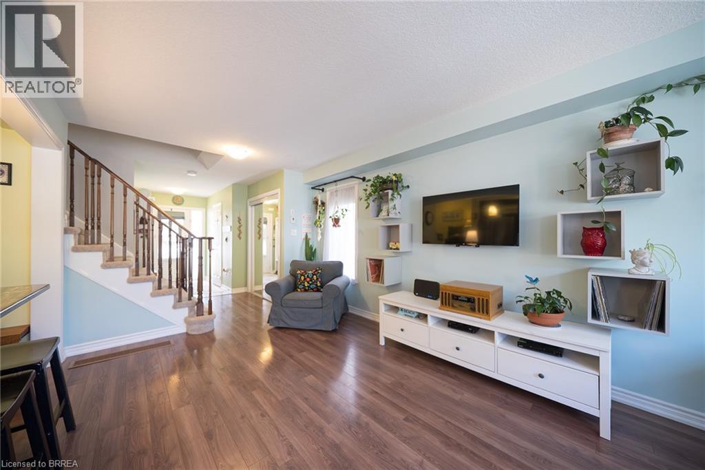 Welcome home to 100 Bisset Avenue in Brantford. This freehold 2-storey end-unit townhouse offers 1,296 sq ft of primary living space with 3 bedrooms, 2.5 bathrooms, a professionally finished basement, single-car garage and a fully fenced and gated backyard. Lovingly maintained by its original owners, this home is set in the sought-after, family-friendly Empire South community of vibrant West Brantford. The main level begins with a welcoming tiled foyer complete with built-in shelving and a convenient 2-piece bathroom. The carpet-free design continues with laminate flooring throughout the open-concept layout, featuring a spacious living room and an eat-in kitchen. The kitchen offers two-tone cabinetry, extended counters, updated fixtures, and stainless steel appliances, including a newer fridge and stove (2023). From here, sliding doors open to the backyard, and there is also direct inside access to the garage for added convenience. Upstairs are three bedrooms, including a primary suite with a walk-in closet and a 4-piece ensuite bathroom. A second 4-piece bathroom and a linen closet complete the upper level. The professionally finished basement (2020) expands the living space with a large recreation room featuring recessed lighting, built-in shelving and cabinetry. A finished laundry room with additional cabinetry adds function, while a utility room with built-in shelving provides organized storage. The level is complete with a cold room/cellar. The fully fenced backyard includes a raised wooden deck, a gazebo, and a covered BBQ gazebo for cooking in any weather. A large shed with a serving-style opening makes it ideal for storage or entertaining, while a gated throughway offers convenient access in and out of the yard. Just steps from excellent schools, walking and biking trails, public transit, and a variety of nearby shopping and dining options, this home combines everyday convenience with a family-friendly setting. (id:51158)