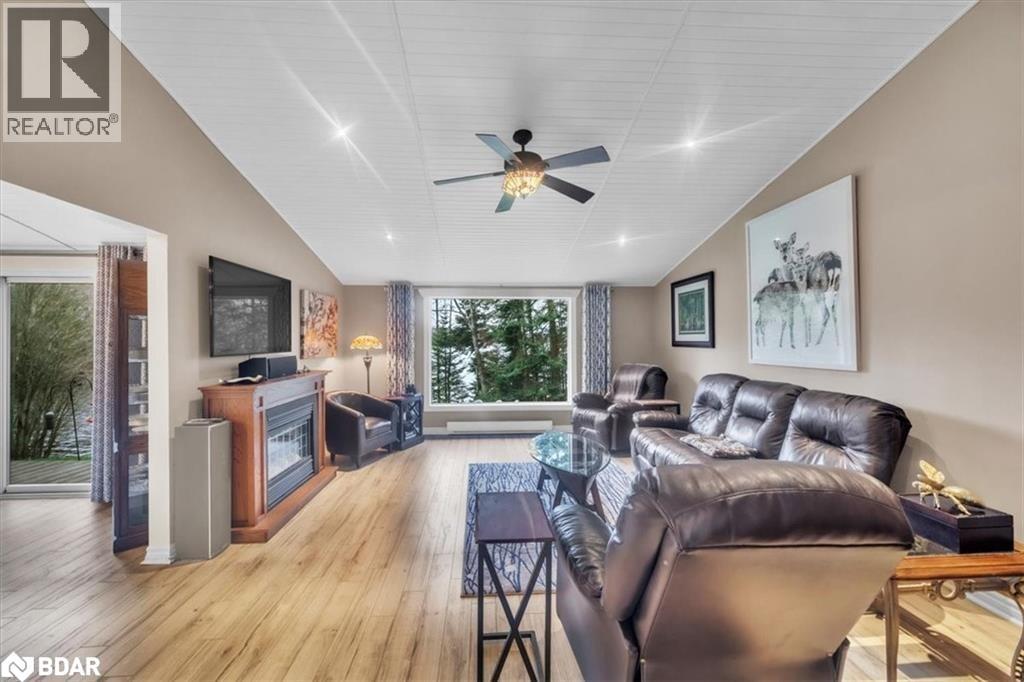 Stunning Lakefront Viceroy Bungalow on Haliburtons Premier 5-Lake Chain - Welcome to this breathtaking 3-bedroom, 2-bathroom Viceroy bungalow offering 2,147 sq ft of beautifully renovated living space, perfectly positioned on a premium, unobstructed 150 ft lakefront lot. This home blends elegant design with the ultimate waterfront lifestyle in one of Haliburtons most coveted locations. Step inside and be captivated by the open-concept layout featuring soaring vaulted ceilings and expansive windows that frame panoramic lake views from all principal rooms. The heart of the home is a gourmet kitchen boasting quartz countertops, a large island, and a seamless flow into the formal dining room, which walks out to a lakeside deck perfect for entertaining or enjoying serene morning coffee. The Huge formal Livingroom overlooks the lake and is off the dining room - great for large family gatherings. Efficient Napoleon propane stove heats the entire house. The spacious great room is anchored by a Wood Burning Stove fireplace, creating a cozy, stylish space to relax, with another walkout to your outdoor oasis. The designer main bathroom off Master and main-floor laundry and 2nd full bath off 2nd foyer entrance, add both comfort and convenience. Outside, the professionally landscaped grounds feature lush perennial gardens, multiple decks, and a crib dock for direct water access. Driveway parks 5 cars. This rare offering sits directly on the Haliburton 5-lake chain, providing over 30 miles of pristine boating and adventure. Two marinas are conveniently nearby, along with local stores and quick highway access via a private laneway. Wake up each morning to stunning easterly lake views and the soothing call of loons. This property truly embodies tranquil lakeside living with refined style. (id:51158)