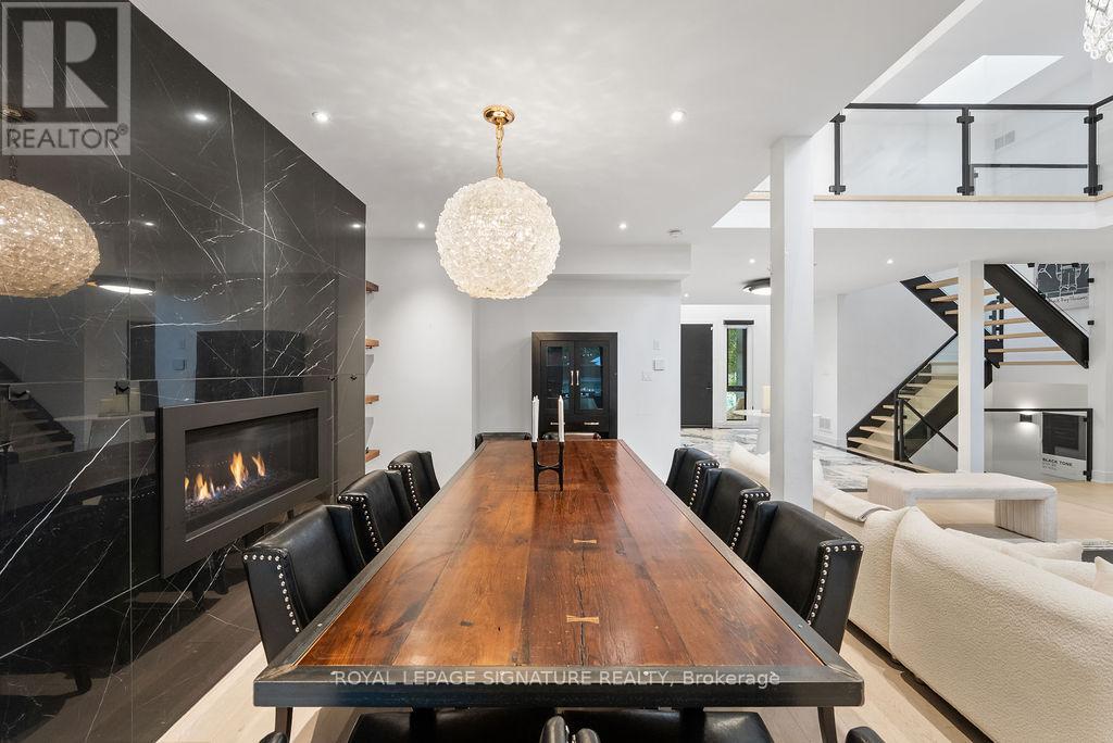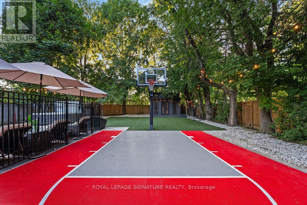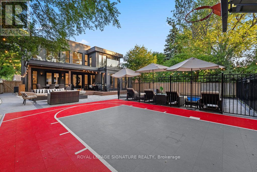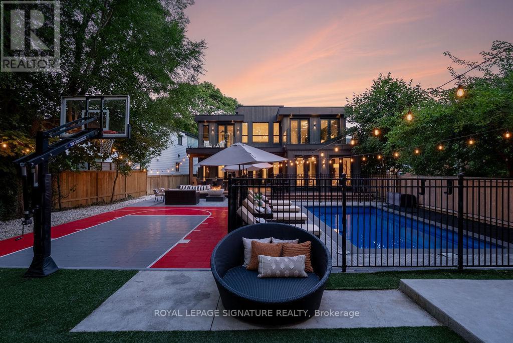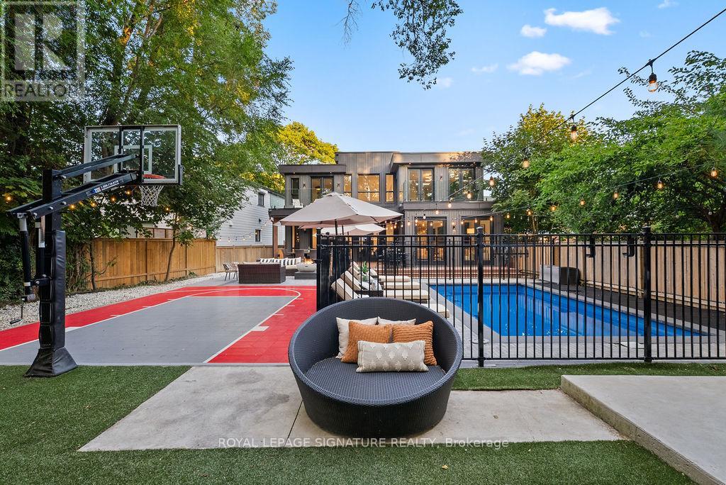 Welcome to 102 Midland Ave a modern showpiece just steps from the Bluffs.This 3+1 bedroom, 4-bathroom residence offers nearly 4,000 sq. ft. of refined living space on an impressive 185-ft deep lot. A soaring double-height great room with a statement chandelier sets the tone for grand yet comfortable living, while floor-to-ceiling windows fill the home with natural light.The open-concept layout is anchored by a chef-inspired kitchen featuring high-end appliances, a large island, butlers pantry, and even your own pizza oven. Seamlessly walk out to a private, resort-like backyard with a saltwater pool, jacuzzi hot tub, basketball court, soccer field, and a versatile studio shed perfect for a gym, yoga space, office, or guest retreat.Upstairs, the serene primary suite offers a custom walk-in closet, spa-like ensuite, and a private balcony overlooking the lush backyard. Additional bedrooms feature walk-in closets and a Jack & Jill bathroom, while a spacious second-level den overlooks the great room ideal as a lounge, office, or reading nook.Entertainment abounds with multiple balconies, a built-in home theatre (complete with popcorn machine), and a full bar for hosting. A bonus bedroom provides flexible space for guests or extended family, and the home comes fully furnished.Nestled on a quiet, family-friendly street, this one-of-a-kind property is just steps to the beach, top schools, shops, and TTC. Offering sophisticated design, ultimate functionality, and indoor-outdoor living at its finest, this is a rare opportunity to own a true modern masterpiece in one of Torontos most coveted neighbourhoods. (id:51158)