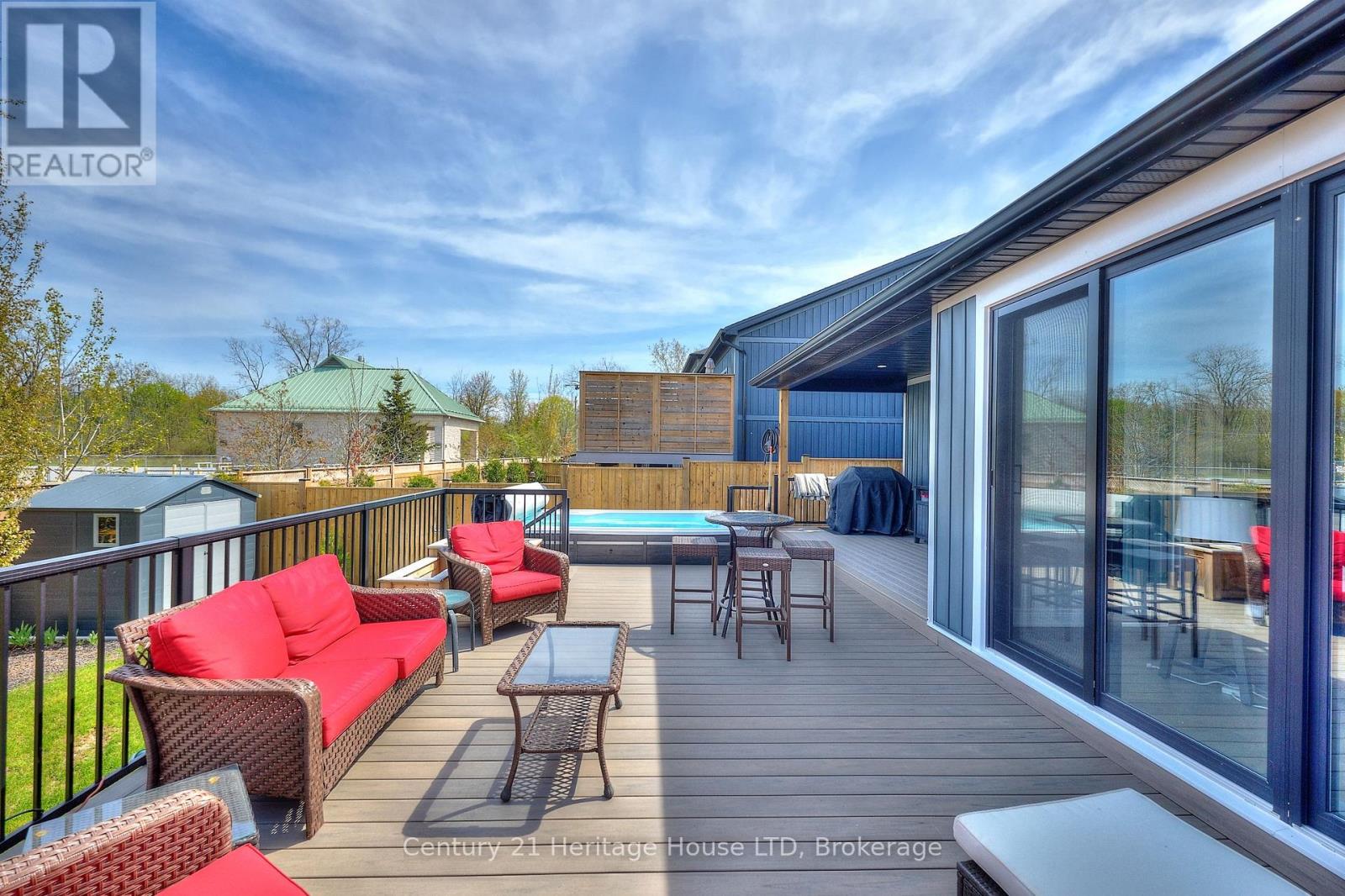 This thoughtfully customized 1,382 sq. ft. bungalow blends elegance, functionality, and comfort in a quiet Fort Erie cul-de-sac just minutes from the lake and Friendship Trail. From the moment you step inside, you're welcomed by soaring vaulted ceilings in the great room, anchored by a striking feature wall with a built-in fireplace, custom shelving, and a walk-out to the back deck. Floor-to-ceiling windows line the rear wall, flooding the space with natural light and offering tranquil views of the beautifully landscaped backyard. The open-concept kitchen is ideal for both everyday living and entertaining, showcasing stainless steel appliances, quartz countertops, a built-in mini fridge, and ample cupboard space. Walk out to the expansive composite deck - partially covered for rainy days, with an open section for sun lovers. The backyard is fully fenced and includes a 1-year-old large 12-ft hot-water swim spa, garden shed, and armour stone lining the property for added charm. The spacious primary suite features a stunning ensuite bath with a spa-like feel and double vanity, and convenient access to the adjacent laundry area. Flooring throughout is luxury vinyl flooring, and pot lighting enhances the modern, airy atmosphere. The recently renovated lower level offers even more space, with a large rec room, a full bath, and two additional bedrooms - all with egress windows and large closets. A double-car garage and generous driveway complete this exceptional offering. Located minutes from uptown Fort Erie amenities, waterfront trails, and the QEW, this home offers peaceful living without sacrificing convenience. A must-see for those seeking a turnkey property with refined finishes and thoughtful design throughout. See listing agent for a list of improvements completed in 2024. (id:51158)