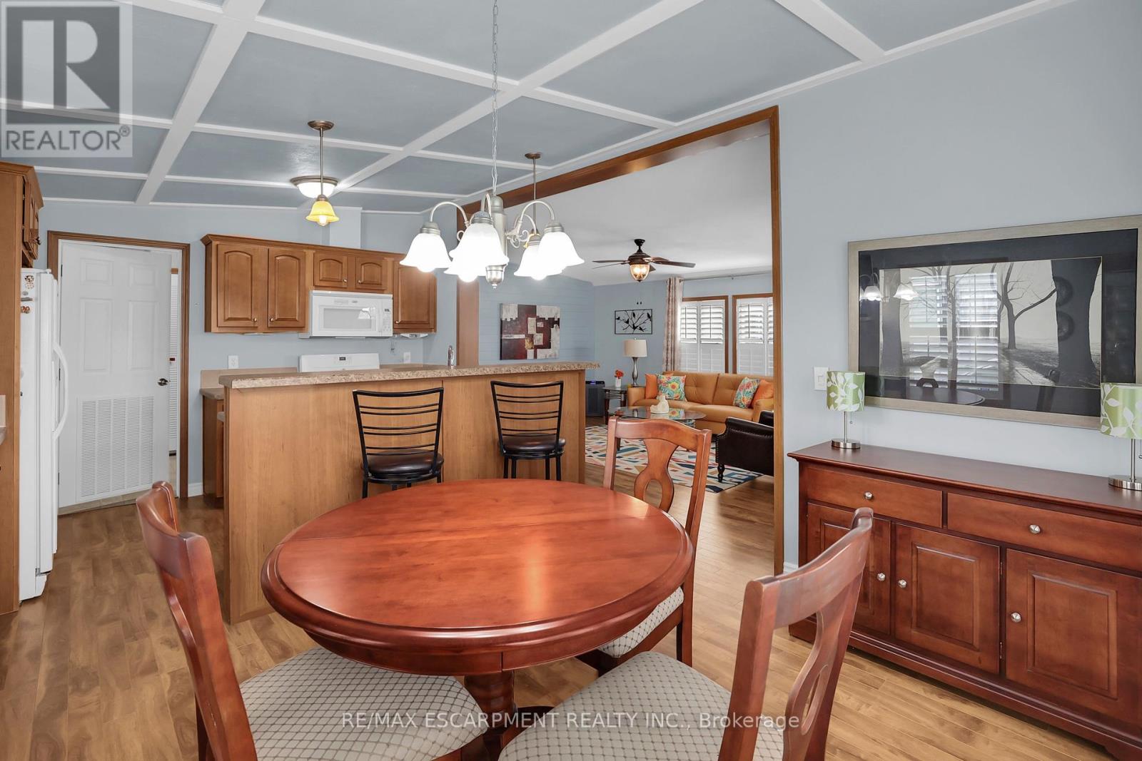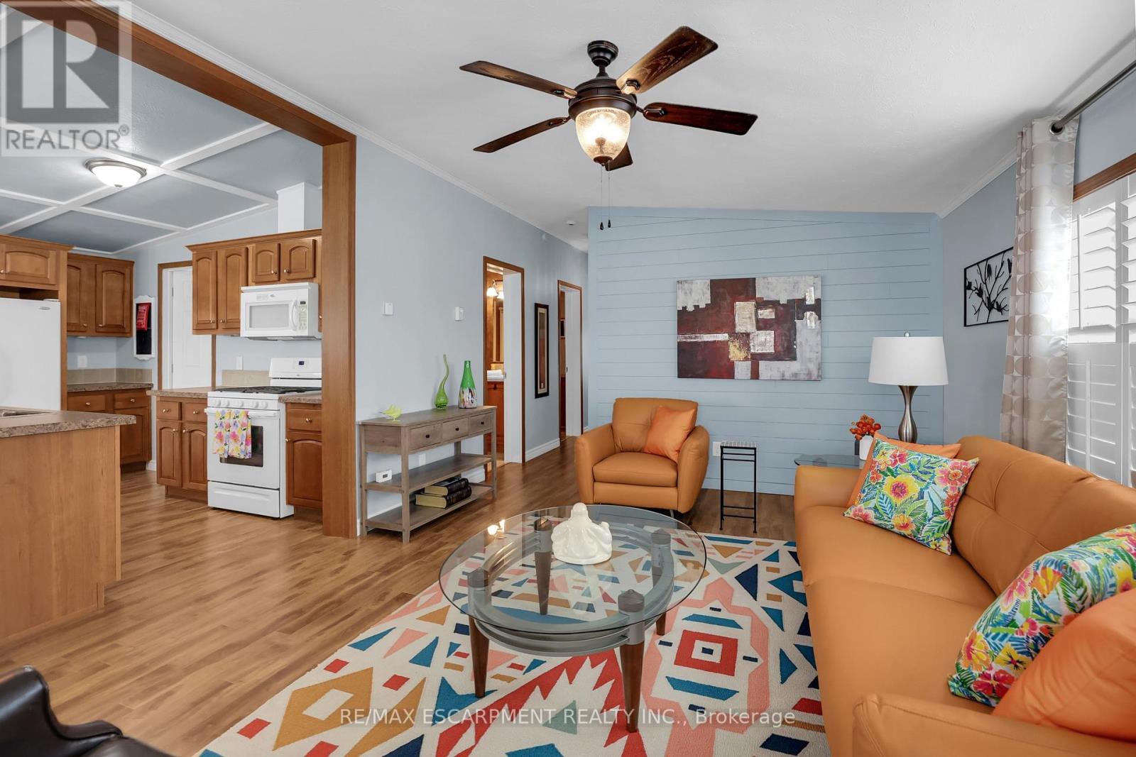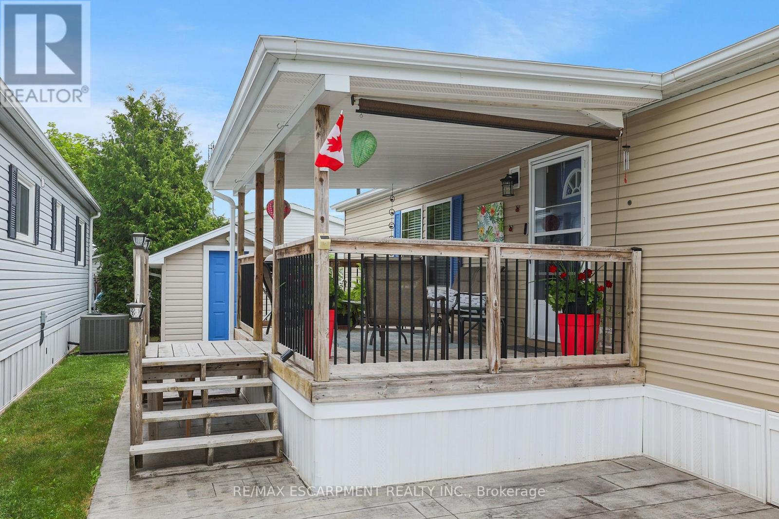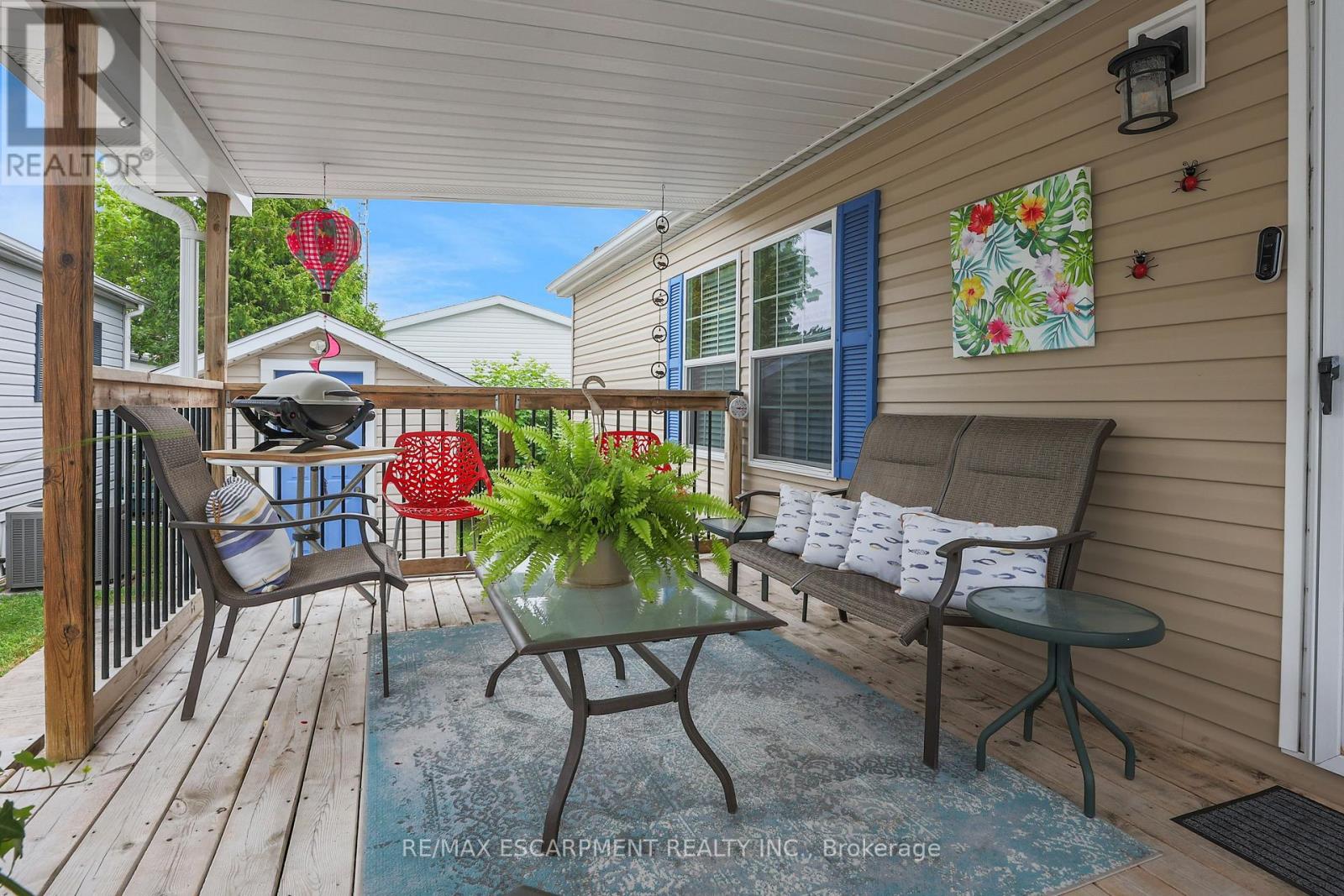 BRIGHT & SPACIOUS BUNGALOW ... Welcome to 107-3033 Townline Road (107 Tamarack Ave), nestled in the heart of Stevensville's vibrant and welcoming adult lifestyle community - a perfect blend of comfort, convenience, and carefree living. This beautifully maintained 3-bedroom, 2-bathroom home offers 1284 sq ft of thoughtfully designed space that's ideal for those seeking a relaxed and active lifestyle. Step inside to find a bright, OPEN CONCEPT layout featuring vaulted ceilings and California shutters throughout, a spacious living room with lovely accent wall, and flows seamlessly into the dining area and well-equipped kitchen - complete with a breakfast bar island, gas stove, and built-in microwave. The spacious primary suite is a private retreat with a WALK-IN CLOSET and ensuite bath featuring a WALK-IN SHOWER. Two additional bedrooms, a second full 4-pc bath, and a large linen closet offer plenty of room for guests or hobbies. Outside, enjoy your morning coffee on the covered front deck or unwind on the covered side deck with direct access from the laundry room. A walkway leads to a charming STAMPED CONCRETE patio beside the garden shed, perfect for enjoying the outdoors, and continues all the way out front to the double wide stamped concrete driveway (2022). Additional features include leaf filter gutter protection (2021) and a welcoming low-maintenance exterior. Living here means more than just a beautiful home; its a lifestyle. Enjoy full access to the community's incredible amenities: indoor/outdoor pools, sauna, clubhouse, shuffleboard, tennis/pickleball courts, fitness classes, and an active calendar of social events. If you're ready for low-maintenance living in a close-knit community that offers both peace and activity, this is your opportunity. Monthly Fees $1088.36 ($825.00 Land Lease + $263.36 Taxes, Approximate). (id:51158)