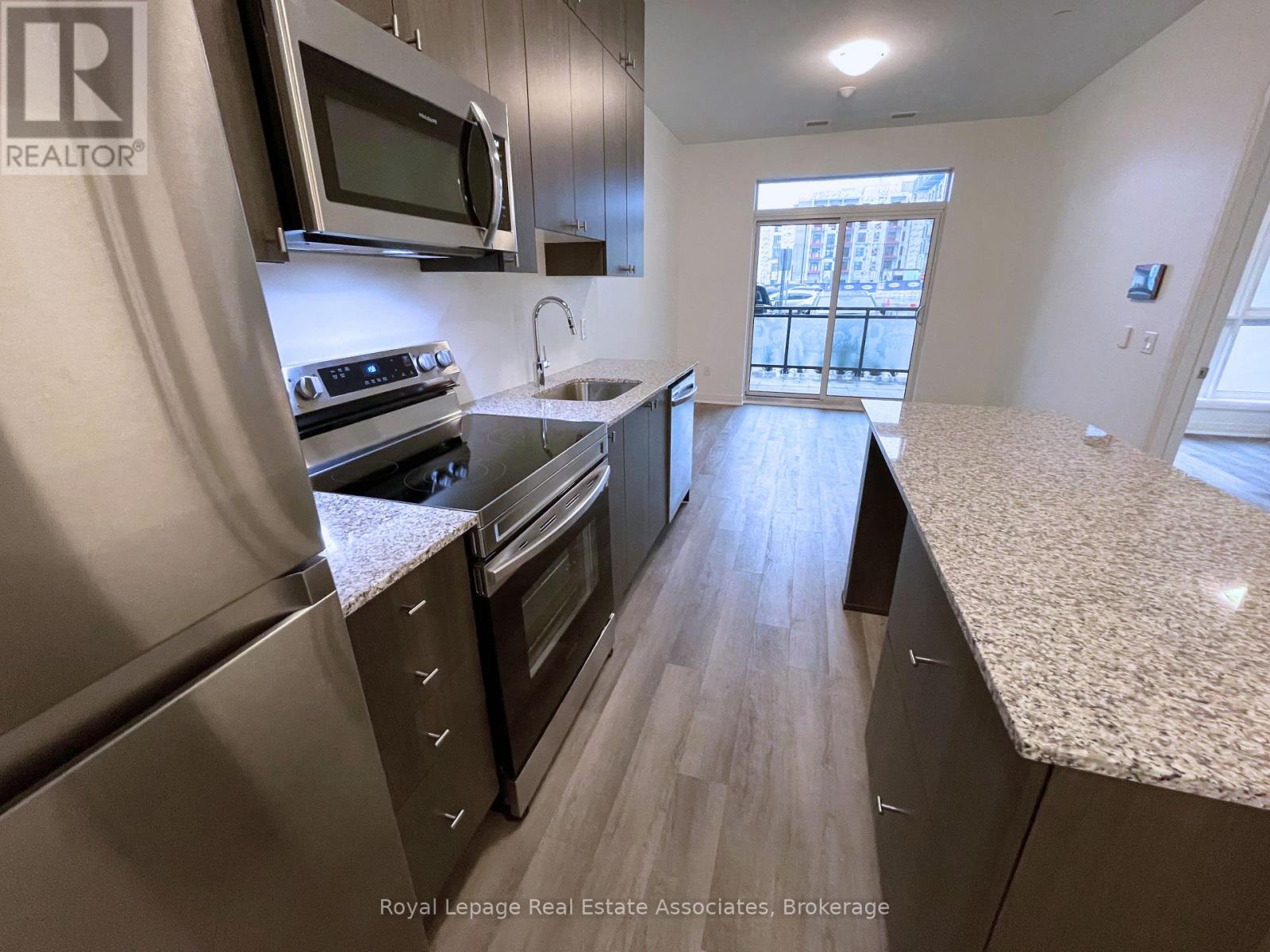 $368.33 MonthlyMattamy-built, main floor suite with 9" ceilings! Enjoy the SS appliances in the upgraded gourmet kitchen with quartz countertops, modern cabinetry & over-sized island with seating! Primary bedroom has upgraded mirrored closets, a separate den that can used for an office and an upgraded washroom with custom glass shower. Open-concept living area overlooks the extra-deep terrace for summer entertaining; the terrace is also easy for move-ins, going out and grocery drop-off. Comes with 1 parking,1 locker and ensuite laundry. The building amenities include security, tons of visitor parking, party/meeting room, gym and roof-top terrace. Equipped With The Latest In Smart Technology To Control Your Suites Features/Concierge Communication. Conveniently located near to parks, shops, Niagara Escarpment, recreation centre and Milton Hospital. Don't miss this opportunity to live in this amazing home! (id:51158)