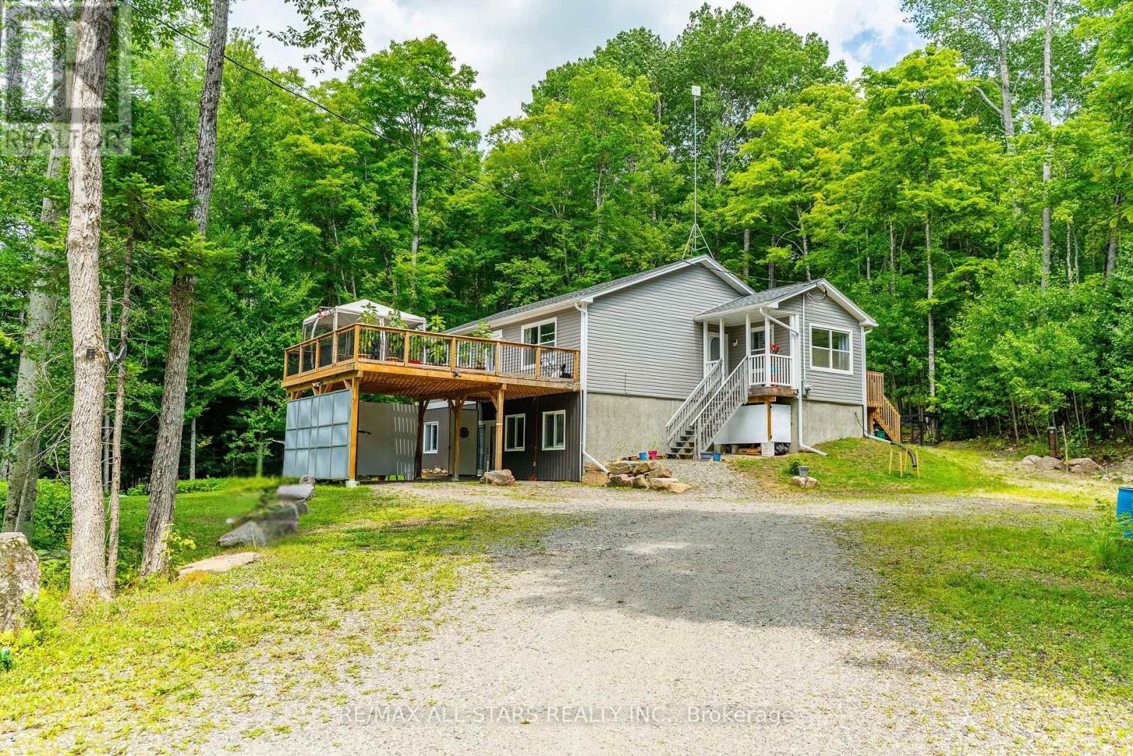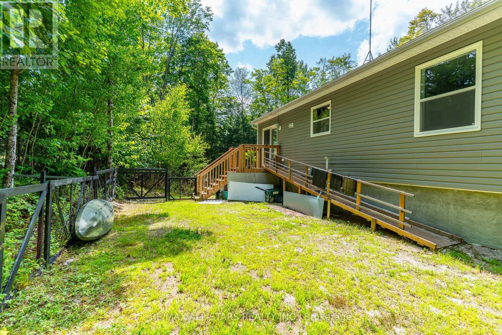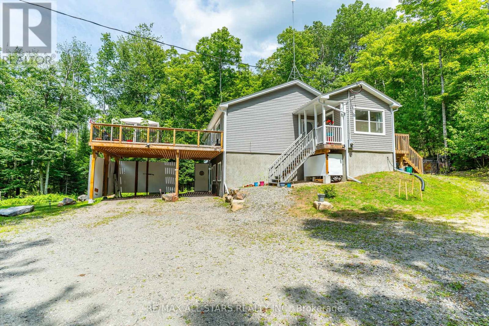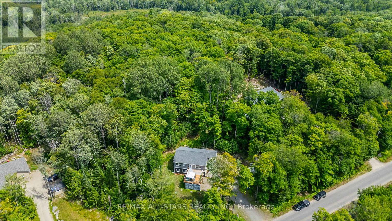 Tucked away on a quiet township road just 10 minutes form Haliburton, this well maintained raised bungalow offers the perfect mix of comfort, privacy, and outdoor adventure.  Set on a peaceful 1.8 -acre lot, this 4-bedroom, 2-bathroom home is only 7 years old and move-in ready.  The main floor features a bright, open-concept layout with a modern kitchen, stainless steel appliances, and a dedicated dining space framed by large windows that bring in views of the surrounding forest.  The spacious living area includes a walkout to a large deck. Ideal for entertaining, relaxing or grilling with friend and family. Downstairs, the finished lower level offers incredible flexibility with a generous rec room, a fourth bedroom, 3-piece bathroom and a dedicated laundry/utility room. A walkout leads directly to the covered carport providing sheltered parking or extra storage for outdoor gear. Just a short stroll down the road brings you to municipal lake access, where you can enjoy swimming at the sandy shoreline or launch your boat for fishing and exploring the waters of Spruce and Drag Lakes (id:51158)
