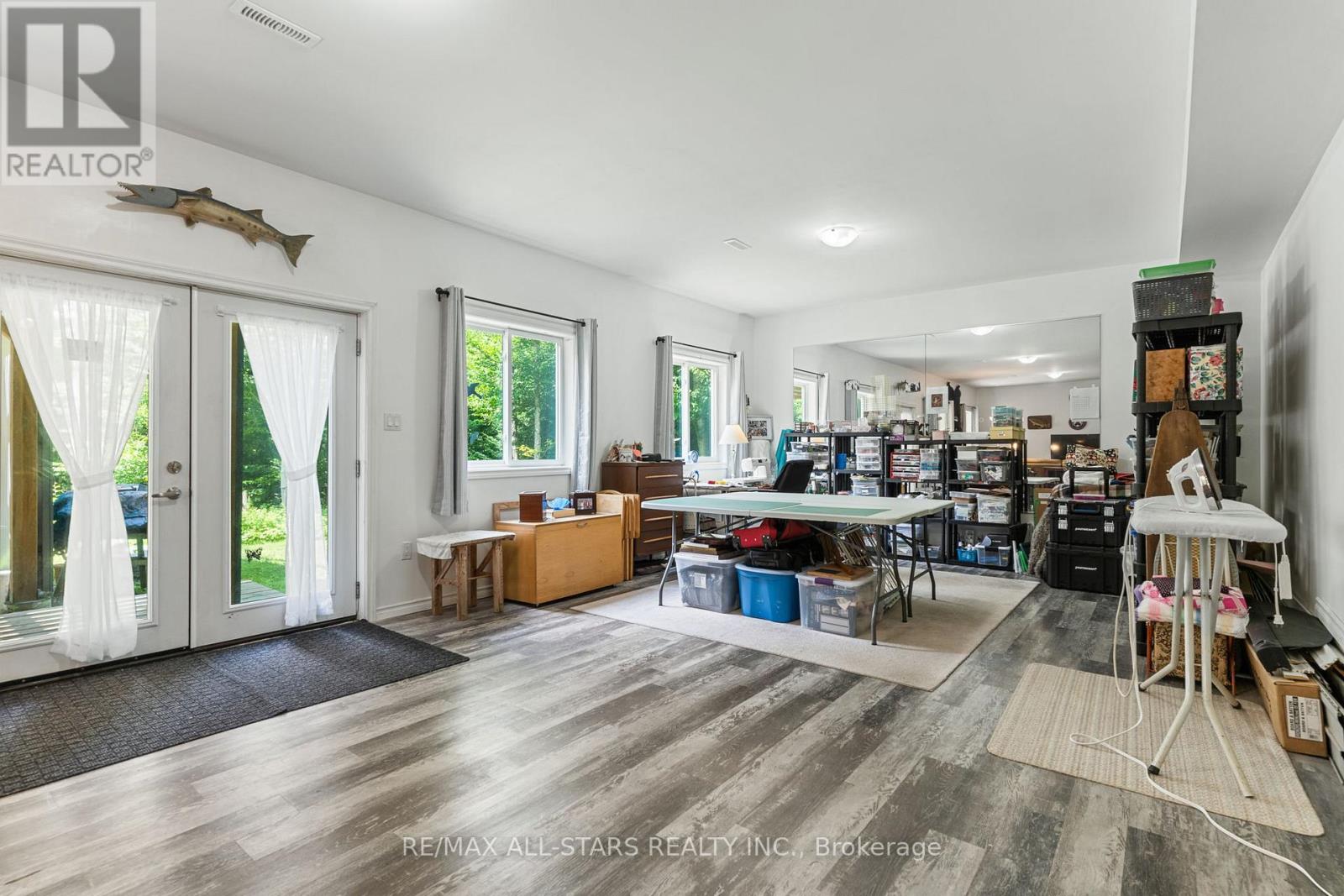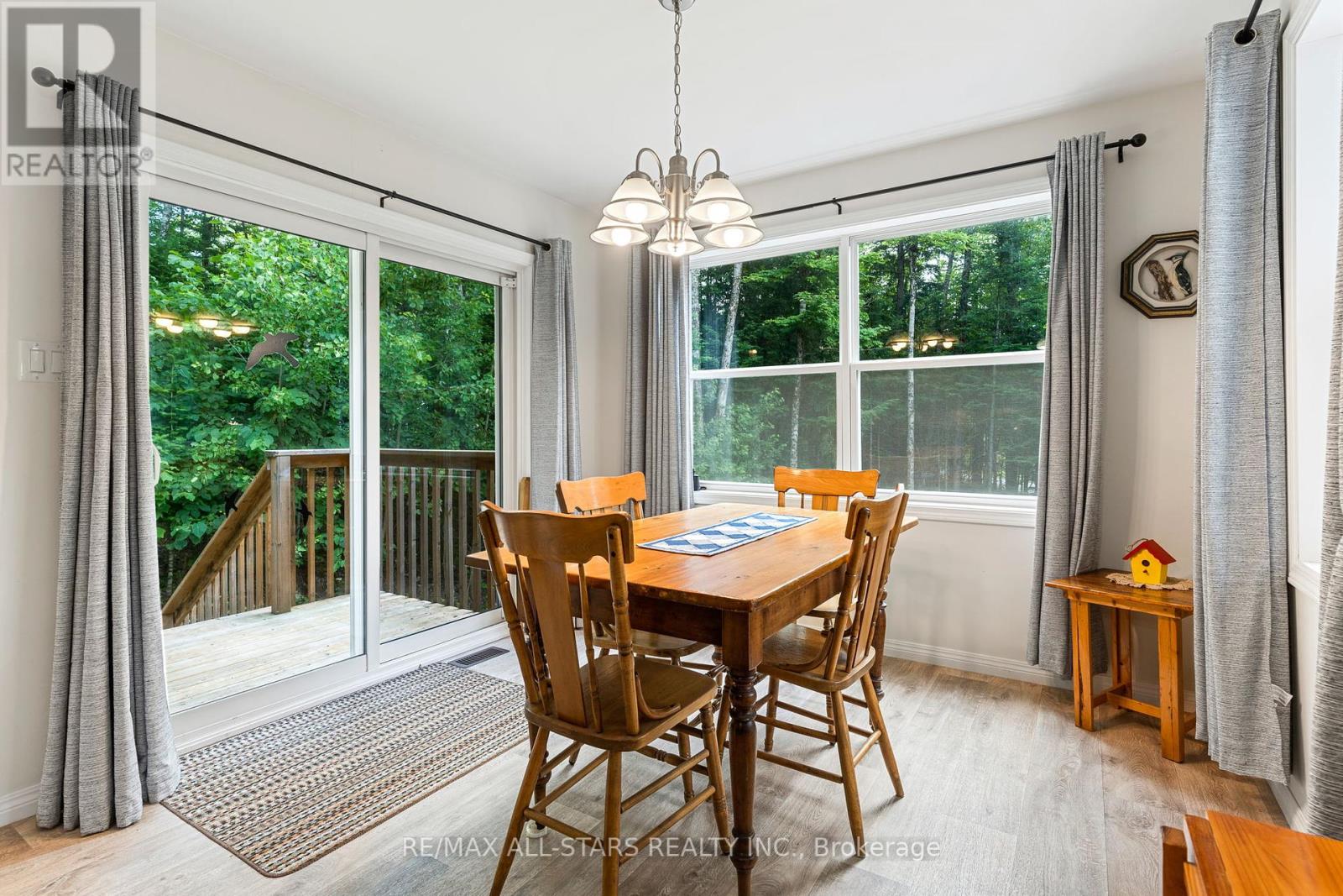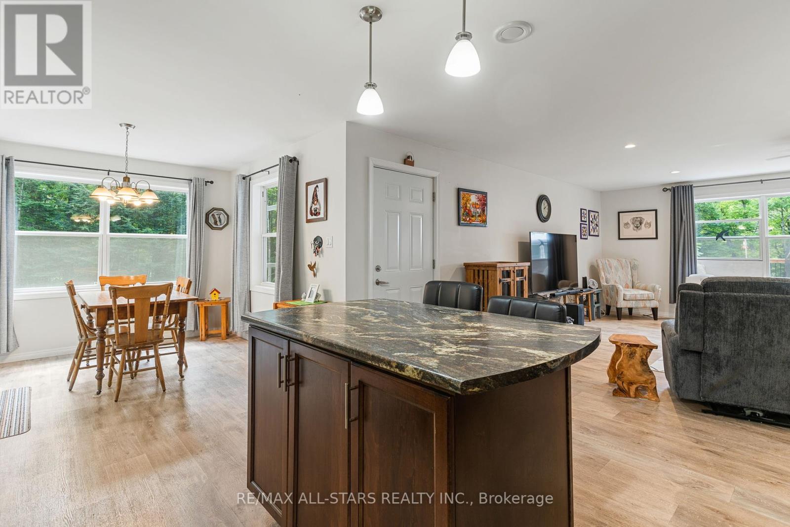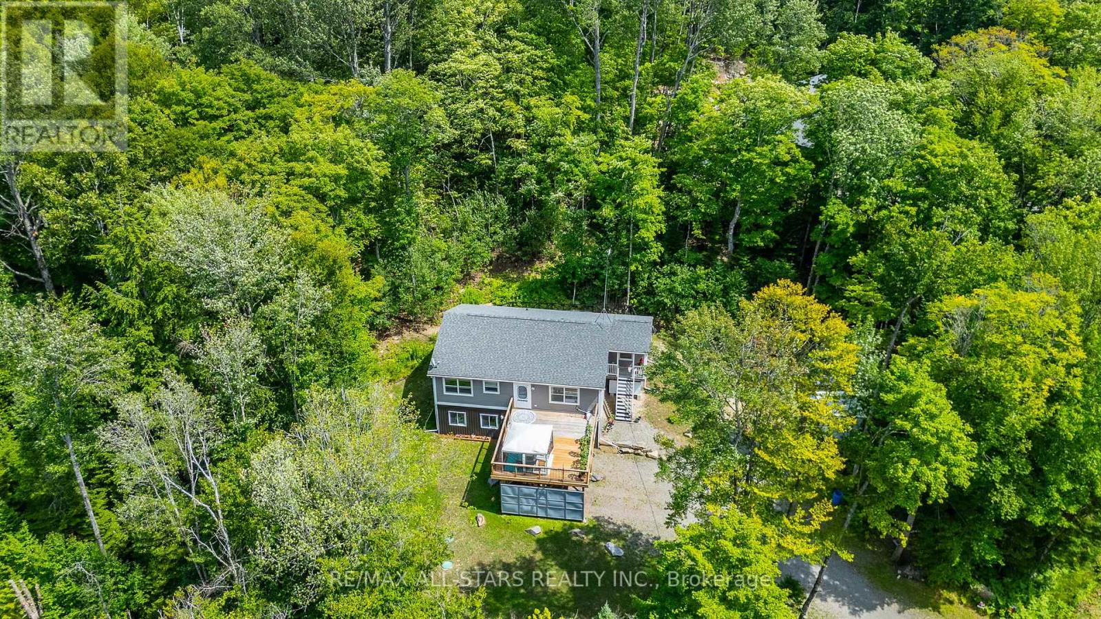 Tucked away on a quiet township road just 10 minutes form Haliburton, this well maintained raised bungalow offers the perfect mix of comfort, privacy, and outdoor adventure.  Set on a peaceful 1.8 -acre lot, this 4-bedroom, 2-bathroom home is only 7 years old and move-in ready.  The main floor features a bright, open-concept layout with a modern kitchen, stainless steel appliances, and a dedicated dining space framed by large windows that bring in views of the surrounding forest.  The spacious living area includes a walkout to a large deck. Ideal for entertaining, relaxing or grilling with friend and family. Downstairs, the finished lower level offers incredible flexibility with a generous rec room, a fourth bedroom, 3-piece bathroom and a dedicated laundry/utility room. A walkout leads directly to the covered carport providing sheltered parking or extra storage for outdoor gear. Just a short stroll down the road brings you to municipal lake access, where you can enjoy swimming at the sandy shoreline or launch your boat for fishing and exploring the waters of Spruce and Drag Lakes (id:51158)