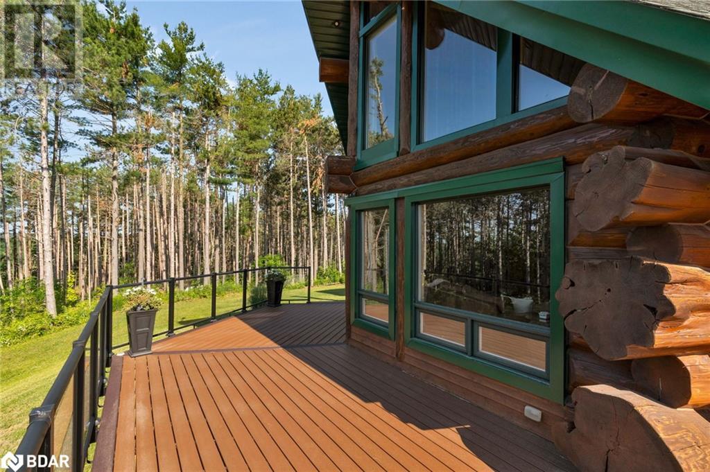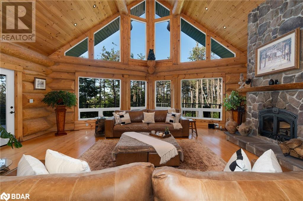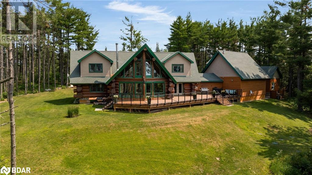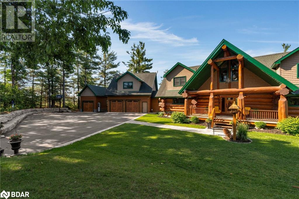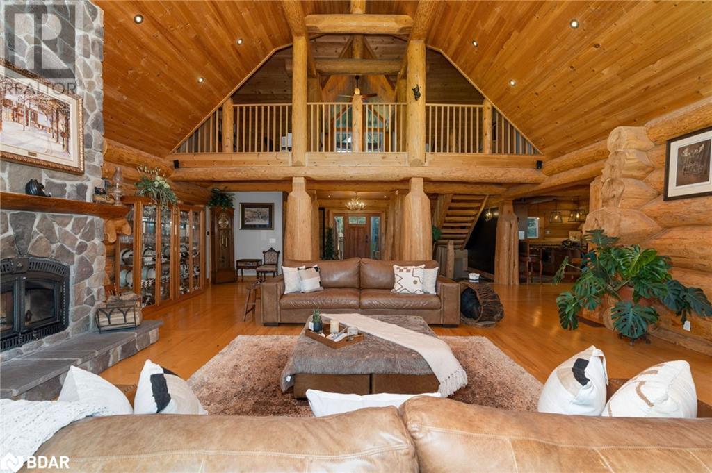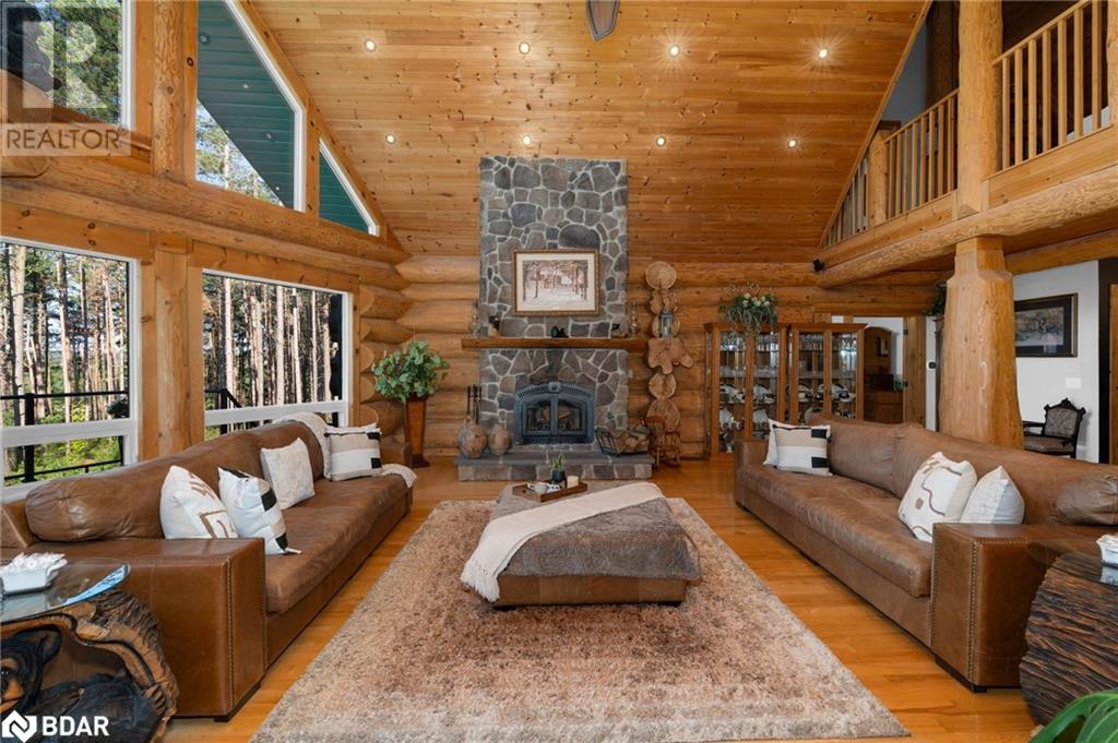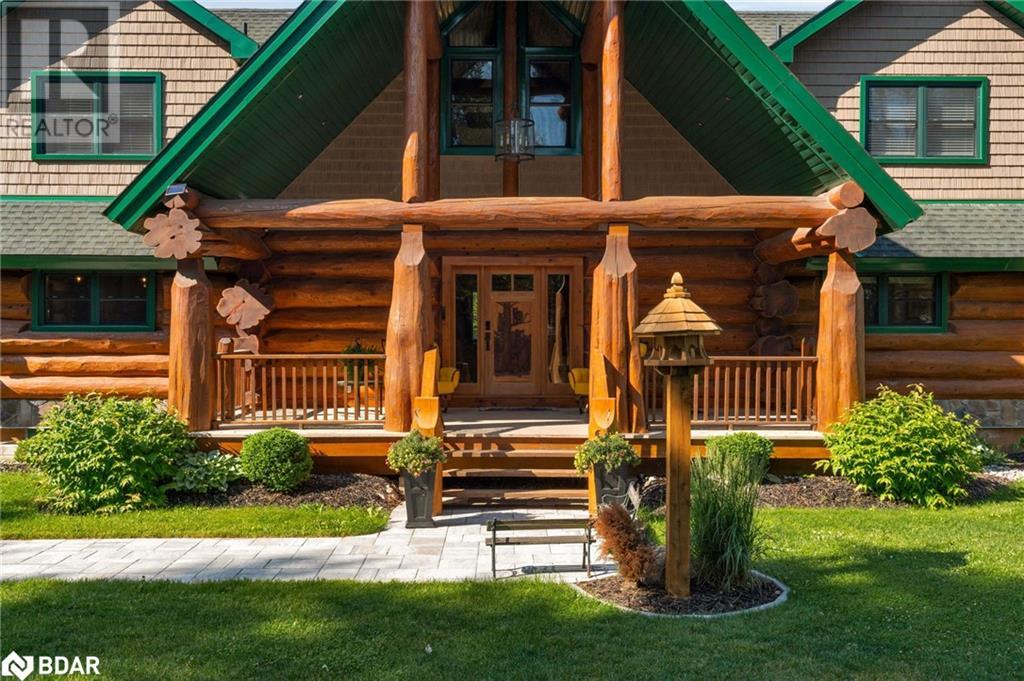Prepare to be awestruck by this one-of-a-kind custom-built log home crafted from hand-peeled Western Red Cedar. Nestled on a private, tree-lined 2.1-acre lot at the end of a peaceful cul-de-sac, this spacious home offers over 5,900 sq. ft. of warm and inviting living space that embodies true character and charm. Exquisite craftsmanship and superior quality are evident in every detail of this home, from its 6 bedrooms and 4.5 baths to its energy-efficient geothermal system, while the Western Red Cedar construction guarantees many lifetimes of low-maintenance beauty. Step into the awe-inspiring great room, where soaring vaulted ceilings and a stunning stone fireplace anchor the home with both grandeur and coziness, seamlessly flowing into a chef’s kitchen equipped with granite countertops, stainless steel appliances, and ample prep space. At the same time, the adjacent dining area offers the perfect setting for intimate family meals or unforgettable gatherings. The main floor master suite is a sanctuary in itself, complete with an ensuite bathroom and walk-in closet. Every corner of this home exudes comfort, from the private upper-level den with scenic views and ensuite bedrooms that provide a retreat-like experience for family and guests, to the radiant-heated lower level, an inviting haven perfect for cozy winter evenings or year-round entertaining. The attached radiant-heated garage with smart openers includes an incredible 650 sq. ft. loft, ideal for a home office, studio, or creative endeavours. Meanwhile enjoy the outdoors from the new 1,100 sq ft back deck or charming front porch surrounded by armor stone landscaping, gardens and walkways. A Year-Round Escape located just 7 minutes from Orillia and 1 hour from Toronto, this home is perfectly positioned for convenience and leisure. Whether you're exploring nearby lakes, trails, or ski hills, or enjoying the magical ambiance of the home during the holidays, this property offers an unparalleled lifestyle. (id:51158)