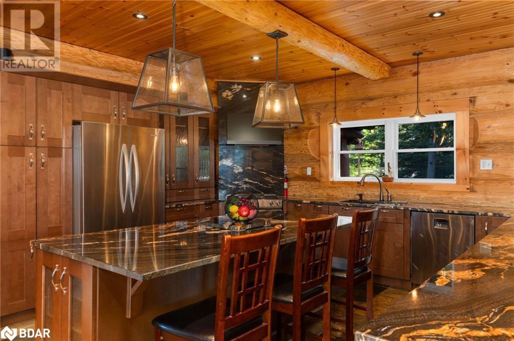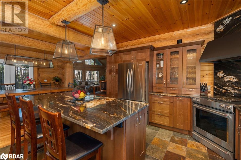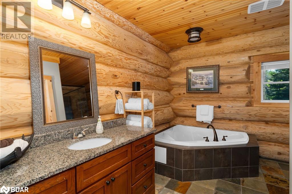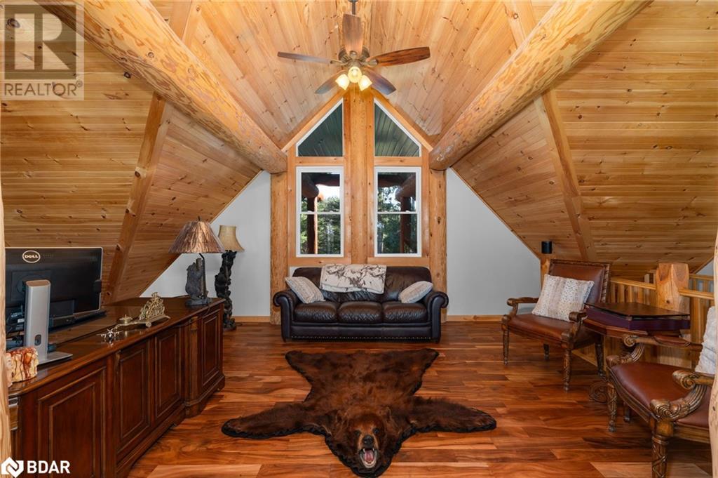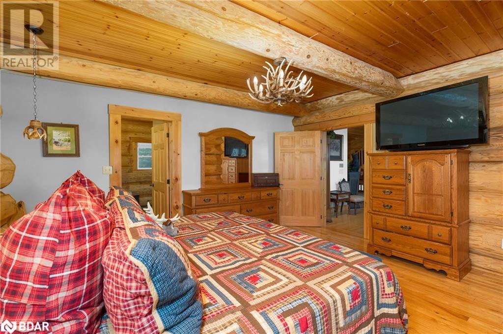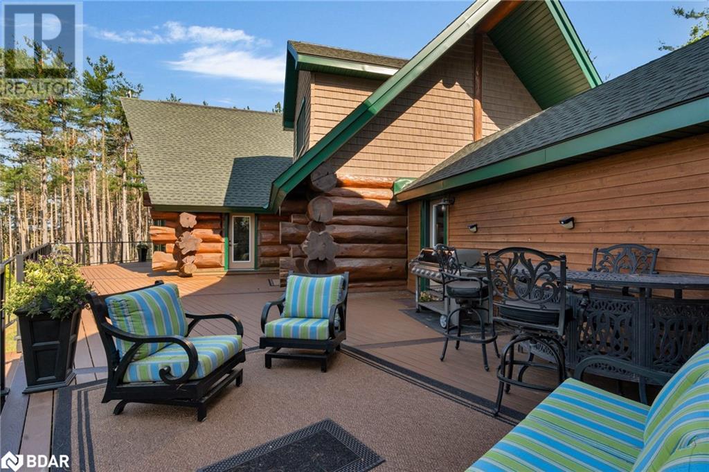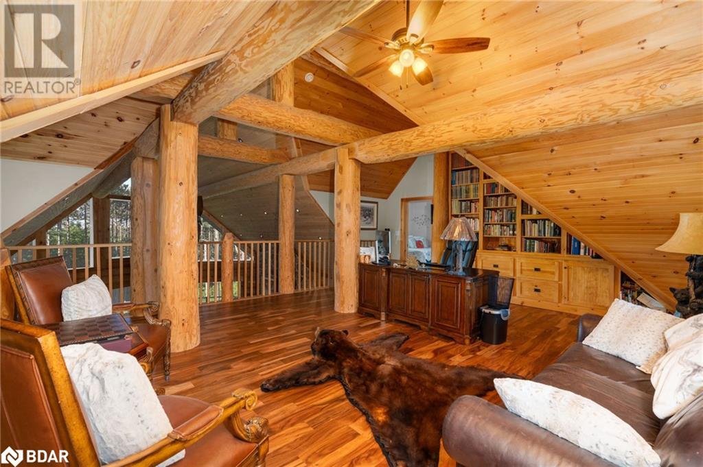 Prepare to be awestruck by this one-of-a-kind custom-built log home crafted from hand-peeled Western Red Cedar. Nestled on a private, tree-lined 2.1-acre lot at the end of a peaceful cul-de-sac, this spacious home offers over 5,900 sq. ft. of warm and inviting living space that embodies true character and charm. Exquisite craftsmanship and superior quality are evident in every detail of this home, from its 6 bedrooms and 4.5 baths to its energy-efficient geothermal system, while the Western Red Cedar construction guarantees many lifetimes of low-maintenance beauty. Step into the awe-inspiring great room, where soaring vaulted ceilings and a stunning stone fireplace anchor the home with both grandeur and coziness, seamlessly flowing into a chef’s kitchen equipped with granite countertops, stainless steel appliances, and ample prep space. At the same time, the adjacent dining area offers the perfect setting for intimate family meals or unforgettable gatherings. The main floor master suite is a sanctuary in itself, complete with an ensuite bathroom and walk-in closet. Every corner of this home exudes comfort, from the private upper-level den with scenic views and ensuite bedrooms that provide a retreat-like experience for family and guests, to the radiant-heated lower level, an inviting haven perfect for cozy winter evenings or year-round entertaining. The attached radiant-heated garage with smart openers includes an incredible 650 sq. ft. loft, ideal for a home office, studio, or creative endeavours. Meanwhile enjoy the outdoors from the new 1,100 sq ft back deck or charming front porch surrounded by armor stone landscaping, gardens and walkways. A Year-Round Escape located just 7 minutes from Orillia and 1 hour from Toronto, this home is perfectly positioned for convenience and leisure. Whether you're exploring nearby lakes, trails, or ski hills, or enjoying the magical ambiance of the home during the holidays, this property offers an unparalleled lifestyle. (id:51158)