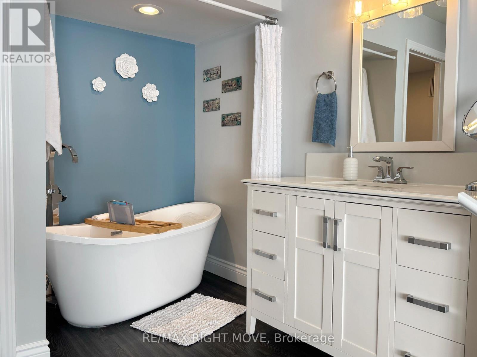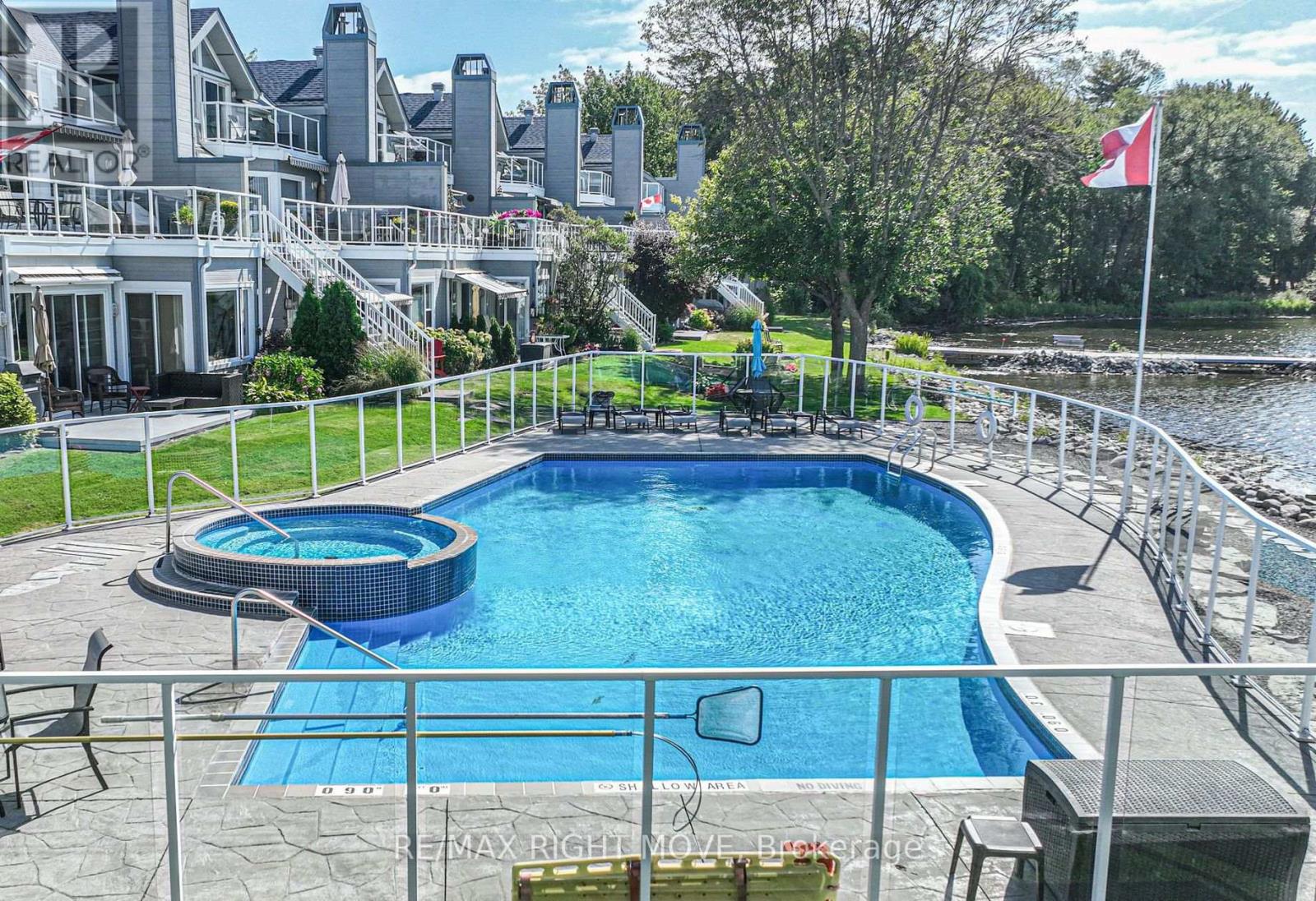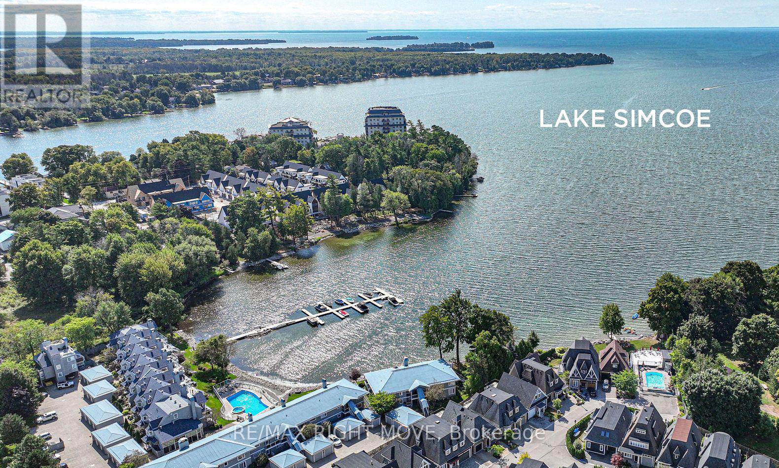 Spectacular south-facing Lake Simcoe views on the Trent Severn Waterway, private dock & effortless waterfront living in the sought-after Invermara Bay community. Unobstructed lake views from principal rooms and the added benefit of this unit enjoying its own private dock. This may be The Right Move for those looking to embrace a year-round waterfront lifestyle or exceptional vacation retreat. This unit shows 10+. Upgraded kitchen w/ stainless appliances: fridge w/ water & ice dispenser, built-in over-range microwave, dishwasher, & breakfast bar w/lake views & w/additional storage. Walk-in pantry adds exceptional functionality w/space for a freezer, coffee bar, & additional storage. Great room combines the dining & living areas & is highlighted by impressive 9.5-ft ceilings enhancing the sense of space. Striking focal point is a floor-to-ceiling tiled gas fireplace w/ beam mantle. Expansive 8-ft high by 12-ft-wide patio door system w/side windows leading to the patio maximizes panoramic lake views . Primary suite, perfectly positioned on the waterside w/ a large picture window captures breathtaking views from the patio door to the private patio. Ensuite includes a stand-alone tub with lake views & separate water closet for added privacy. Second bedroom w/ double french doors provides flex space for guests, a den/office. Other features: Crown moulding, California shutters, carpet-free flooring, F/Air natural gas heating, owned gas water heater, wifi & cable incl. in maintenance. Full crawl space offers valuable additional storage. Uncommon benefits, this unit includes both a garage, an outdoor parking space as well as a private dock. Not all units have a dock or two parking spaces. The main dock includes a ladder for swimming. Residents enjoy shared amenities including a pool & fitness room, sauna, washroom & meeting room. Ideally positioned close to the pool yet not directly in front, this unit offers convenient access to the docks while maintaining privacy. (id:51158)