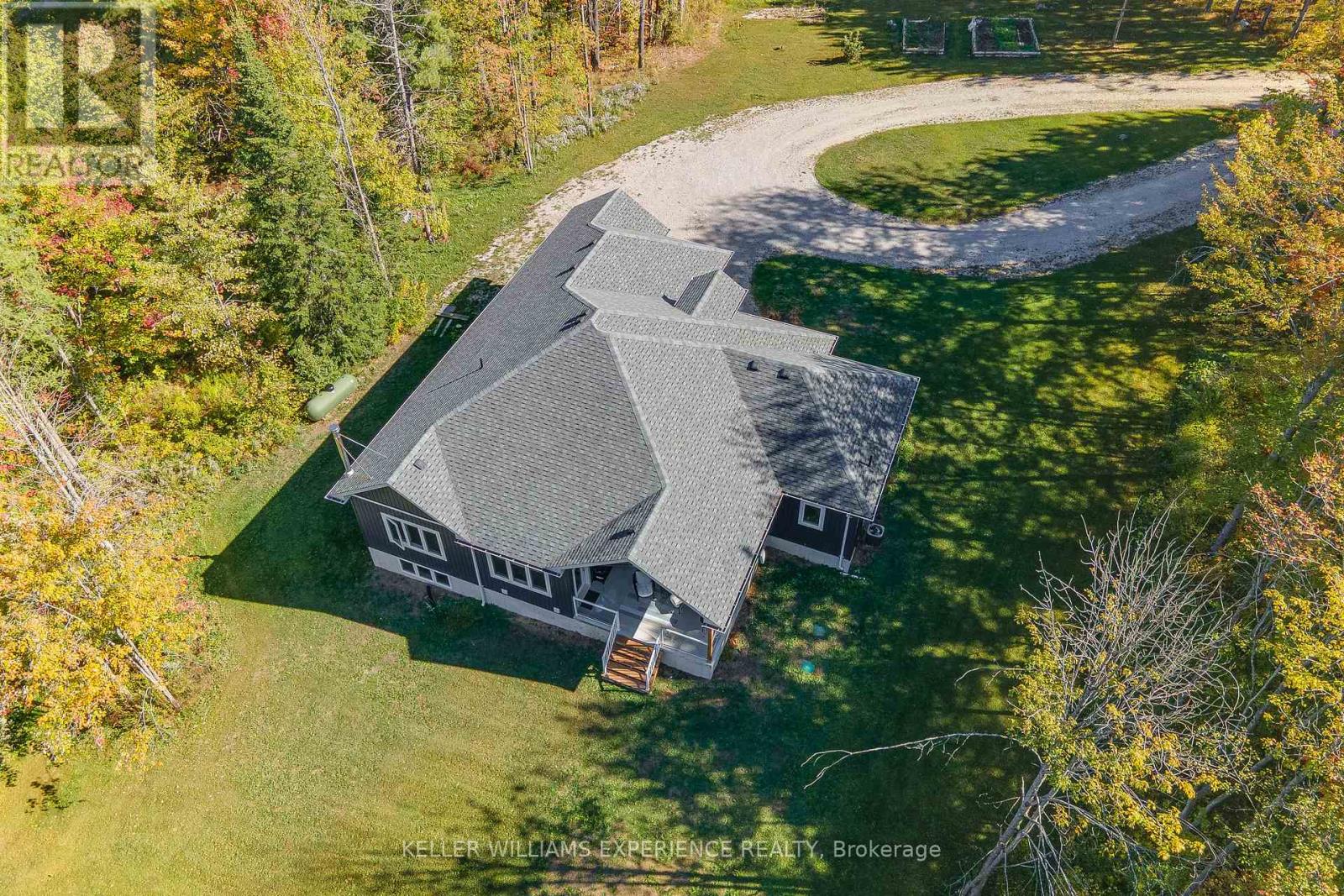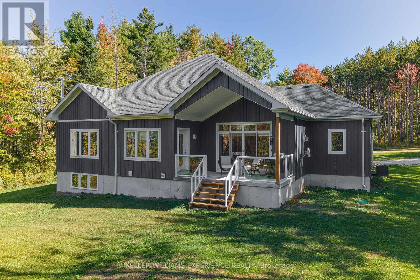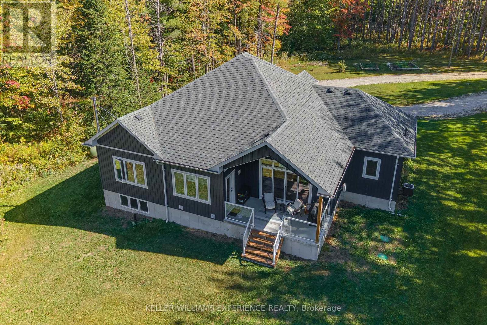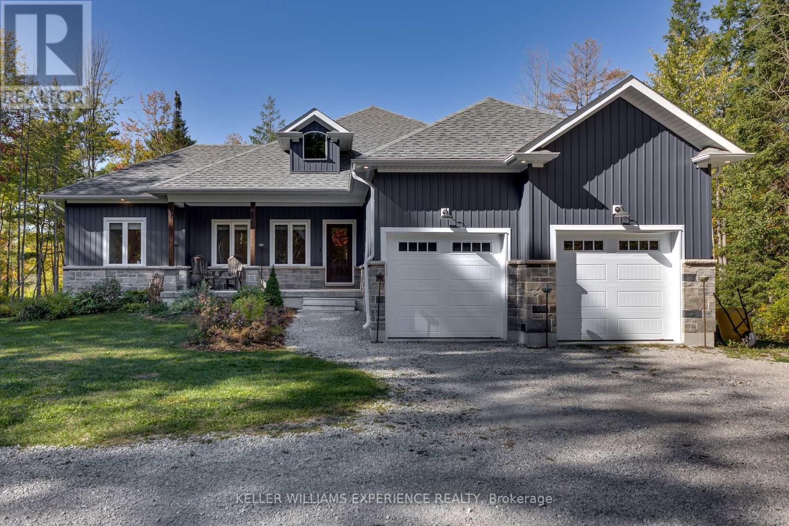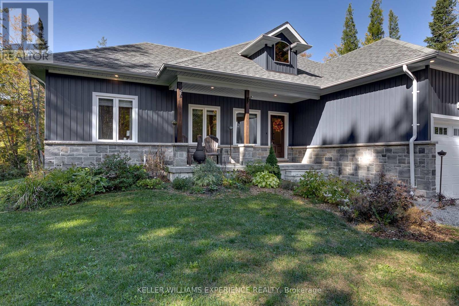 Welcome to your Muskoka retreat! This 1,730 sq. ft. bungalow, built in 2020, sits on over 7 acres of forested privacy just minutes from Hwy 11, 15 minutes to Orillia, and 10 minutes to Gravenhurst. The open-concept layout showcases vaulted ceilings in the living room and primary bedroom, hardwood floors, upgraded lighting, and a chef-inspired kitchen with quartz countertops, soft-close cabinets, and under-valence lighting. The primary suite is a true escape with a spa-like ensuite featuring an oversized glass shower, soaker tub, and double sinks. Two additional bedrooms and a second full bath offer plenty of space for family or guests. Practical design includes a mudroom and laundry with direct access to the 2-car garage, plus an unfinished basement ready for your personal touch. Relax or entertain on the large covered back porch and enjoy the peace and beauty of Muskoka living. (id:51158)