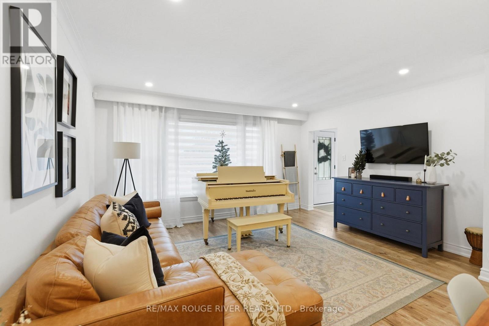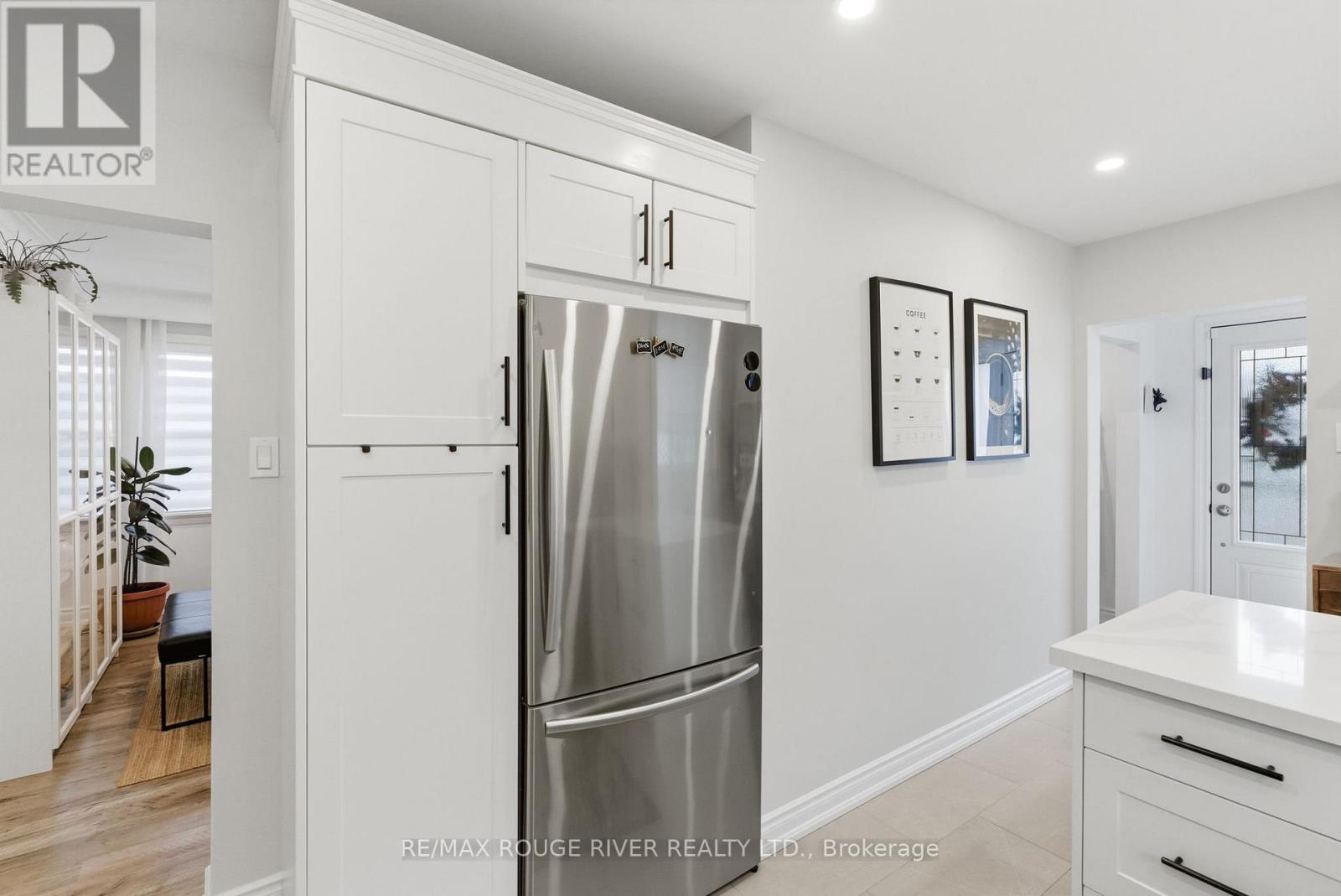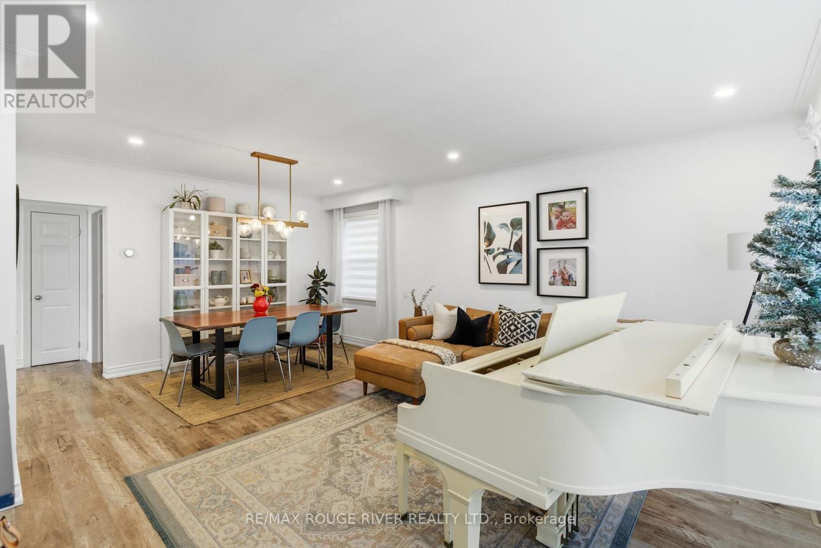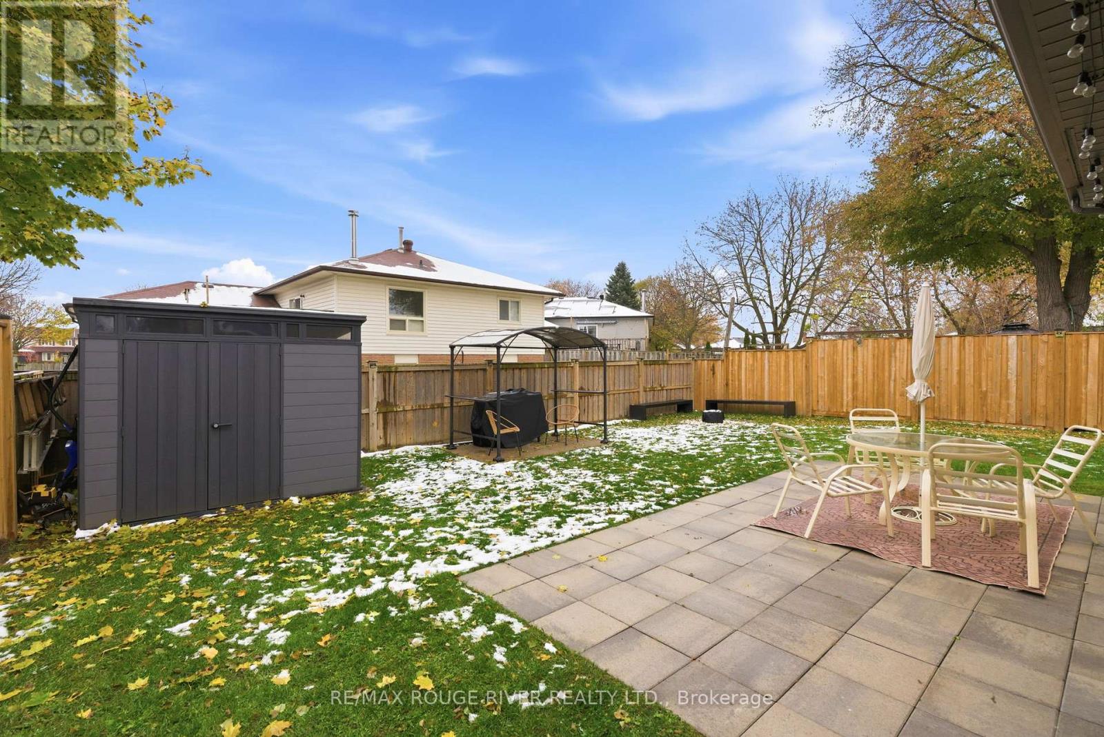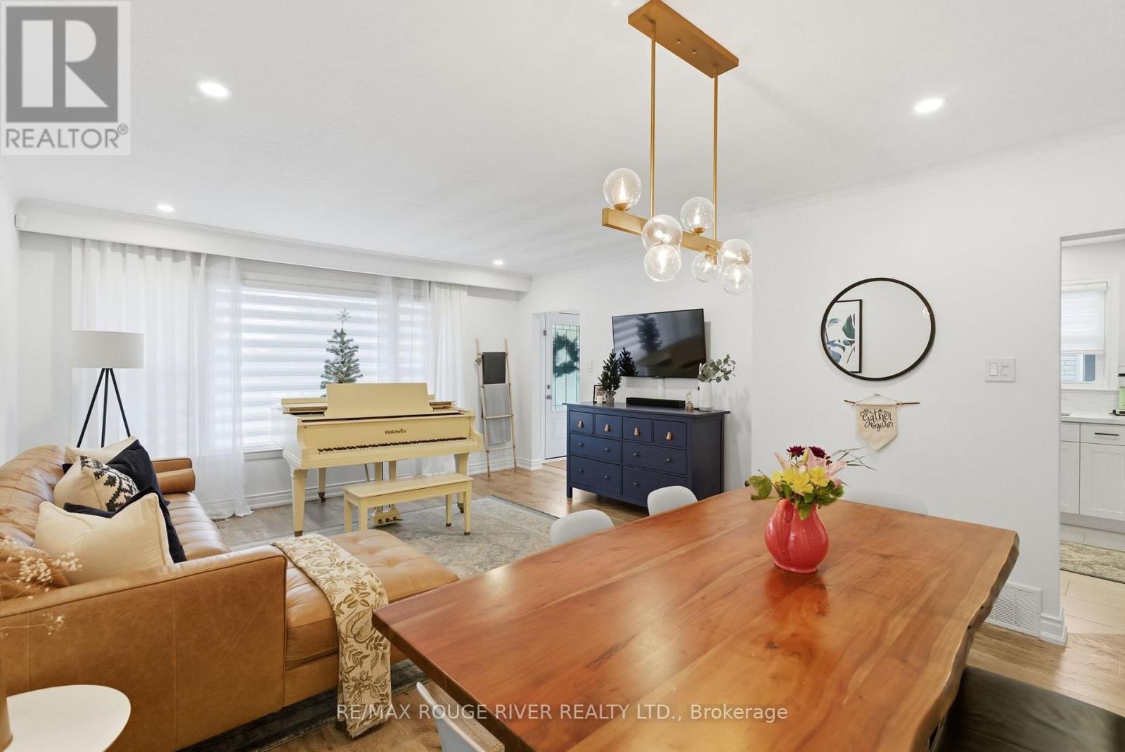 Stunning 3-bedroom bungalow in sought-after Blue Grass Meadows! Welcome to this beautifully updated bungalow perfectly situated on a large 50-foot lot in one of Whitby's most desirable neighbourhoods. Bathed in natural light from expansive windows, the inviting living room showcases elegant laminate flooring that flows seamlessly throughout the home. A stunning picture window provides a beautiful backdrop for everyday living and holiday celebrations alike. The open-concept dining area offers the ideal space for entertaining, enhanced by a striking statement light fixture with dimming capabilities to set the perfect mood. The gorgeous chef-inspired kitchen features custom quartz countertops, a full-height backsplash, sleek stainless steel appliances, and modern white cabinetry accented with black hardware. A convenient bar seating area and cozy nook for a coffee or wine station complete this elegant space. All three bedrooms are located on the main floor, each featuring warm laminate flooring and abundant natural light. The finished basement offers incredible versatility with a spacious family room, pot lights, a large front room ideal as an office or gym, a 3-piece bath, and a separate entrance-perfect for extended family or guests. Step outside to your private backyard oasis. Professionally landscaped, this outdoor haven features lush sod, dual gated fencing, an expansive patio ideal for entertaining, a cozy fire pit seating area, and a practical storage shed. Mature tree removal has opened the space beautifully, allowing sunlight to flood your yard all day long. With a single-car garage, spacious driveway, and an unbeatable location close to parks, schools, and amenities, this exceptional home blends comfort, style, and convenience in one perfect package. (id:51158)