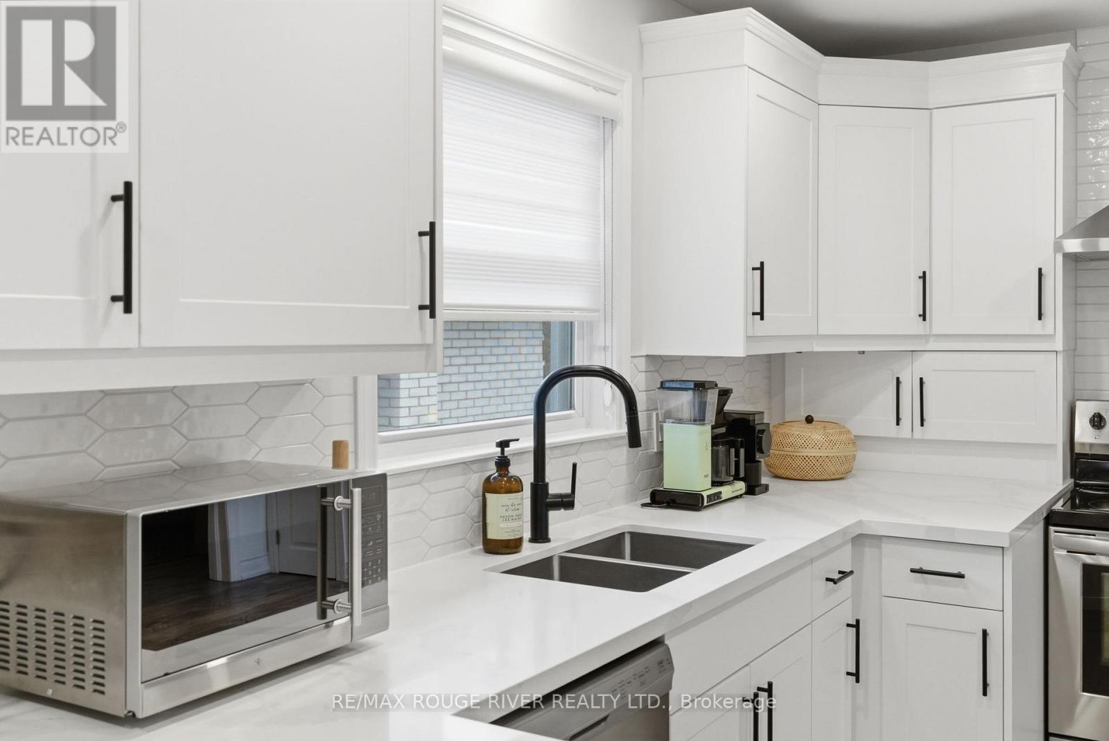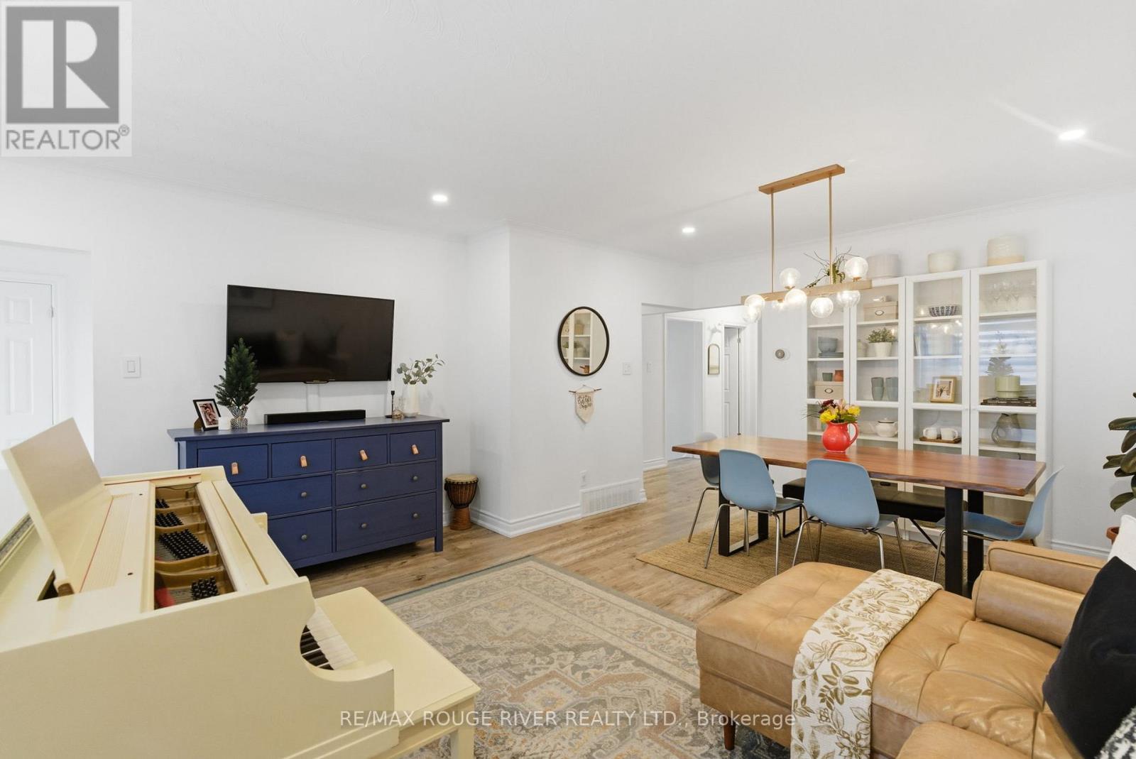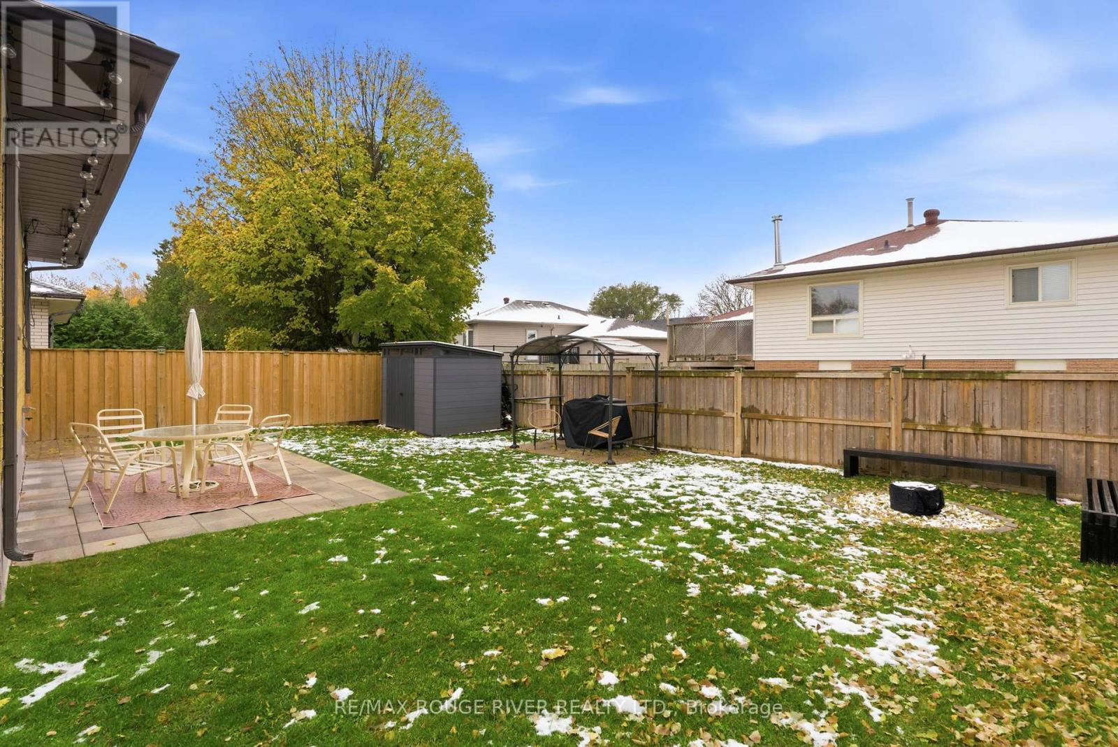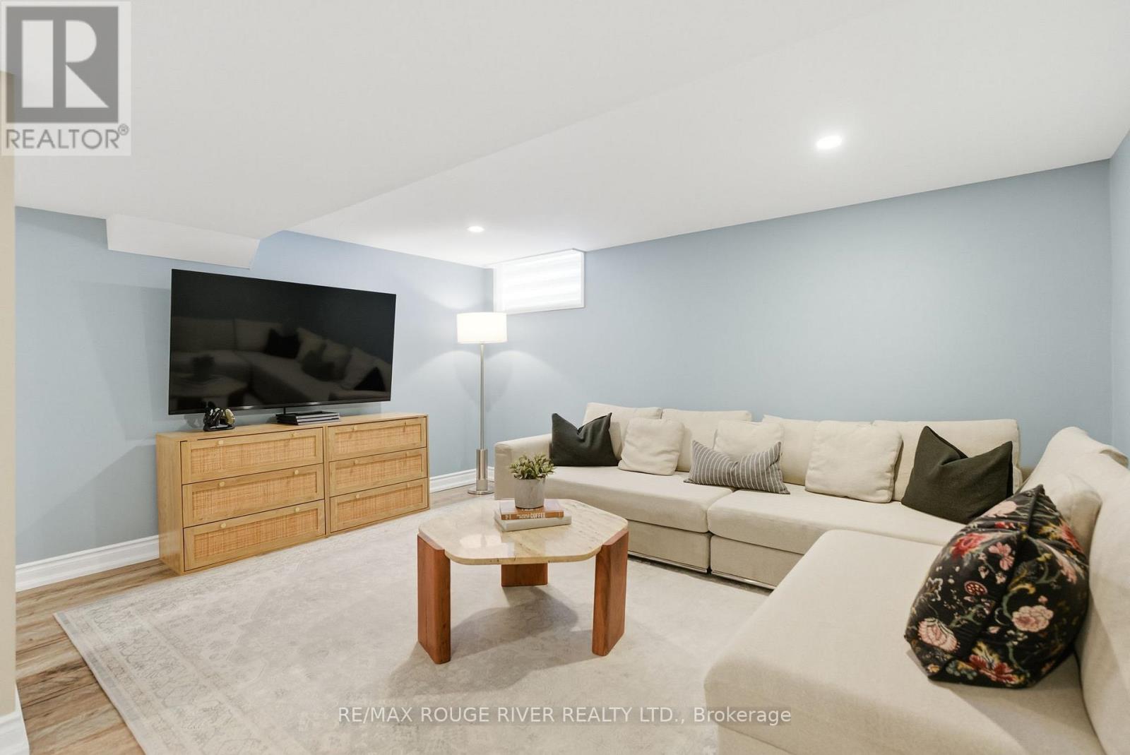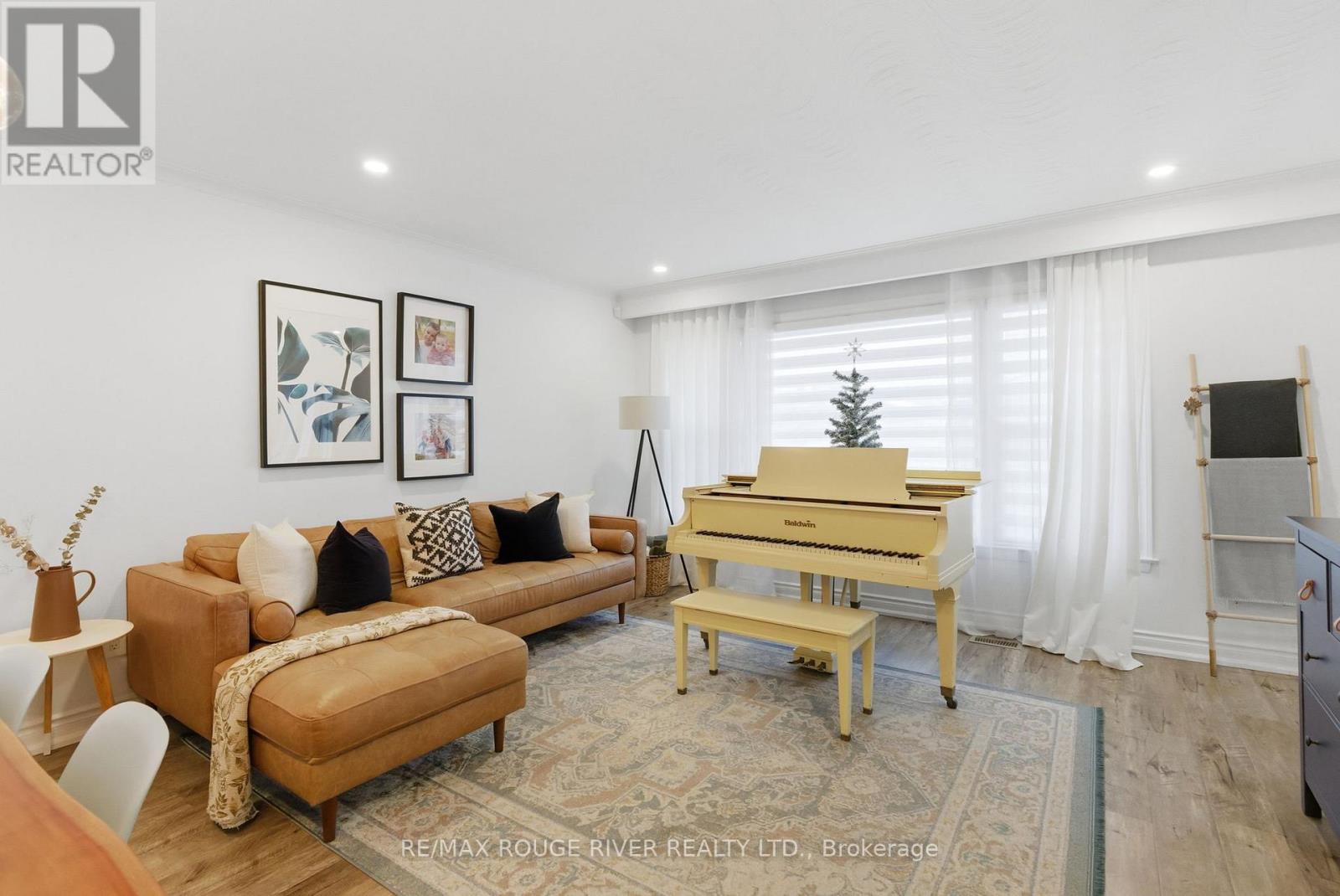 Stunning 3-bedroom bungalow in sought-after Blue Grass Meadows! Welcome to this beautifully updated bungalow perfectly situated on a large 50-foot lot in one of Whitby's most desirable neighbourhoods. Bathed in natural light from expansive windows, the inviting living room showcases elegant laminate flooring that flows seamlessly throughout the home. A stunning picture window provides a beautiful backdrop for everyday living and holiday celebrations alike. The open-concept dining area offers the ideal space for entertaining, enhanced by a striking statement light fixture with dimming capabilities to set the perfect mood. The gorgeous chef-inspired kitchen features custom quartz countertops, a full-height backsplash, sleek stainless steel appliances, and modern white cabinetry accented with black hardware. A convenient bar seating area and cozy nook for a coffee or wine station complete this elegant space. All three bedrooms are located on the main floor, each featuring warm laminate flooring and abundant natural light. The finished basement offers incredible versatility with a spacious family room, pot lights, a large front room ideal as an office or gym, a 3-piece bath, and a separate entrance-perfect for extended family or guests. Step outside to your private backyard oasis. Professionally landscaped, this outdoor haven features lush sod, dual gated fencing, an expansive patio ideal for entertaining, a cozy fire pit seating area, and a practical storage shed. Mature tree removal has opened the space beautifully, allowing sunlight to flood your yard all day long. With a single-car garage, spacious driveway, and an unbeatable location close to parks, schools, and amenities, this exceptional home blends comfort, style, and convenience in one perfect package. (id:51158)