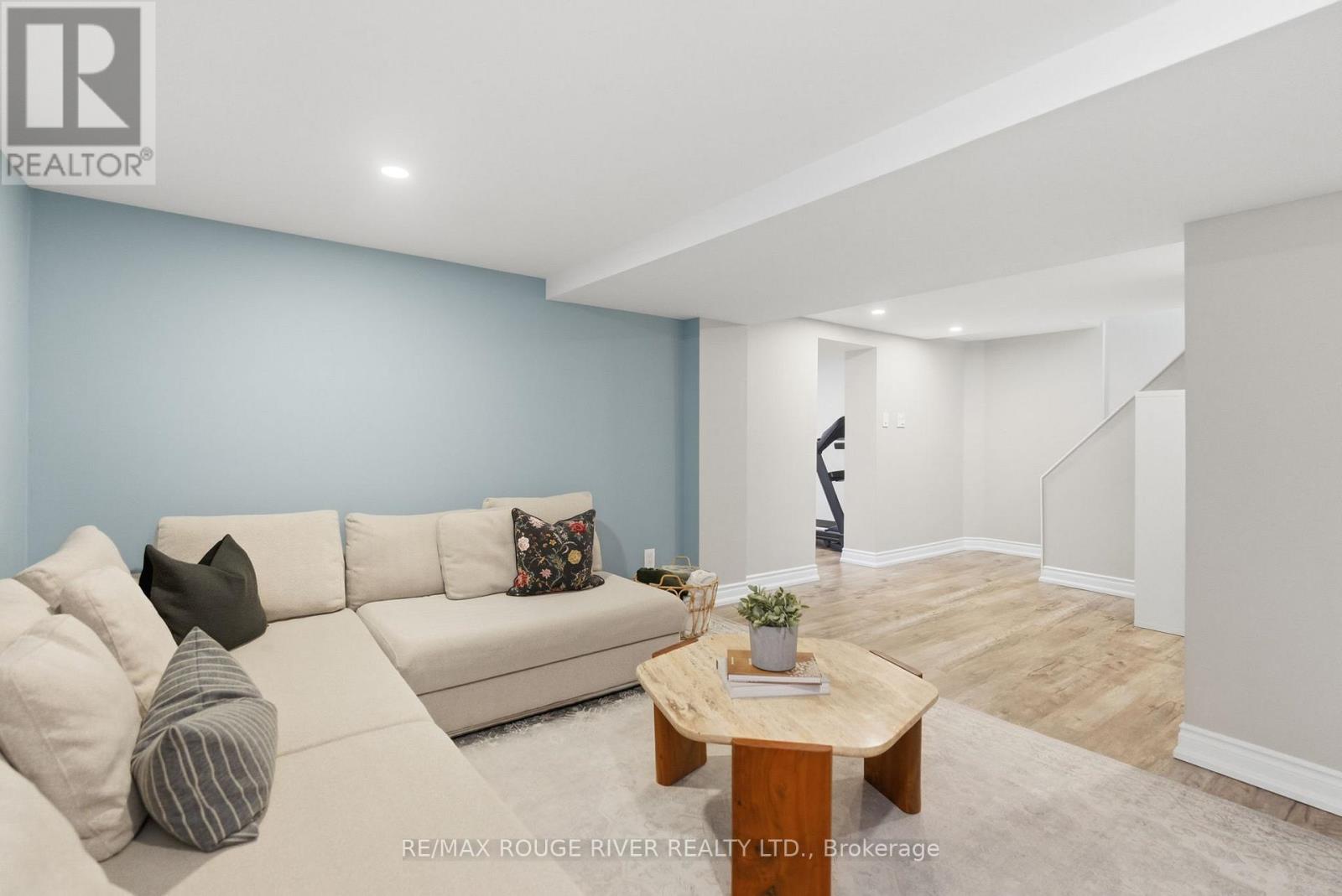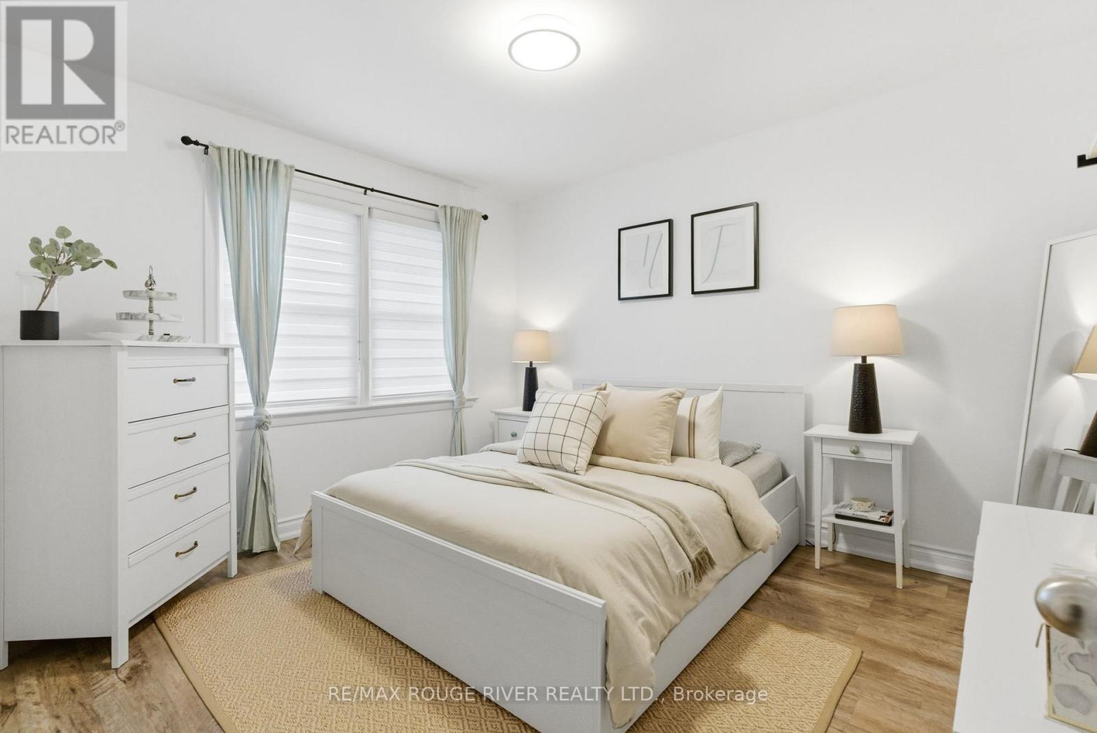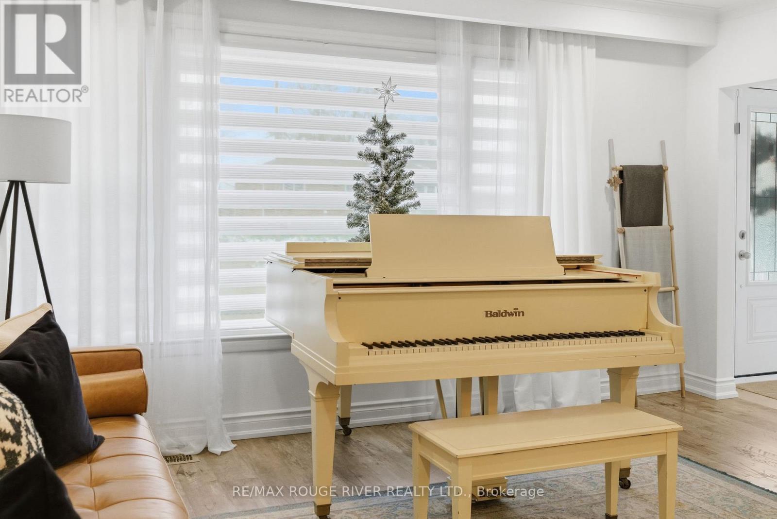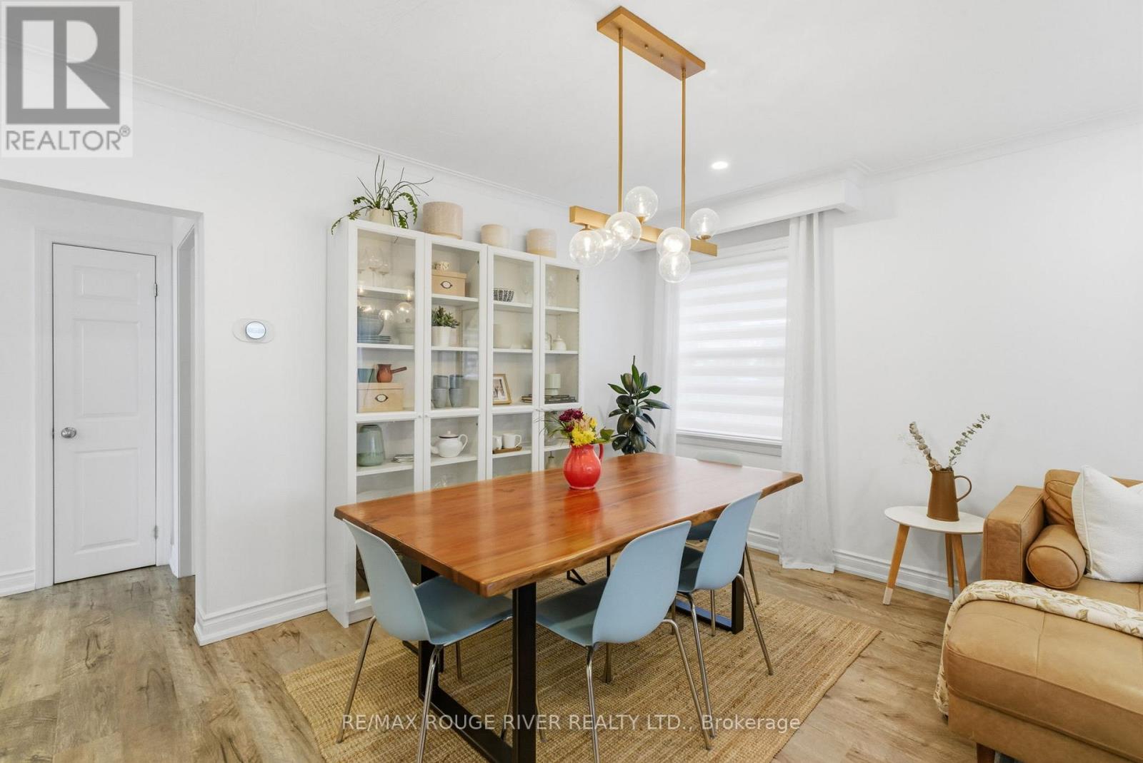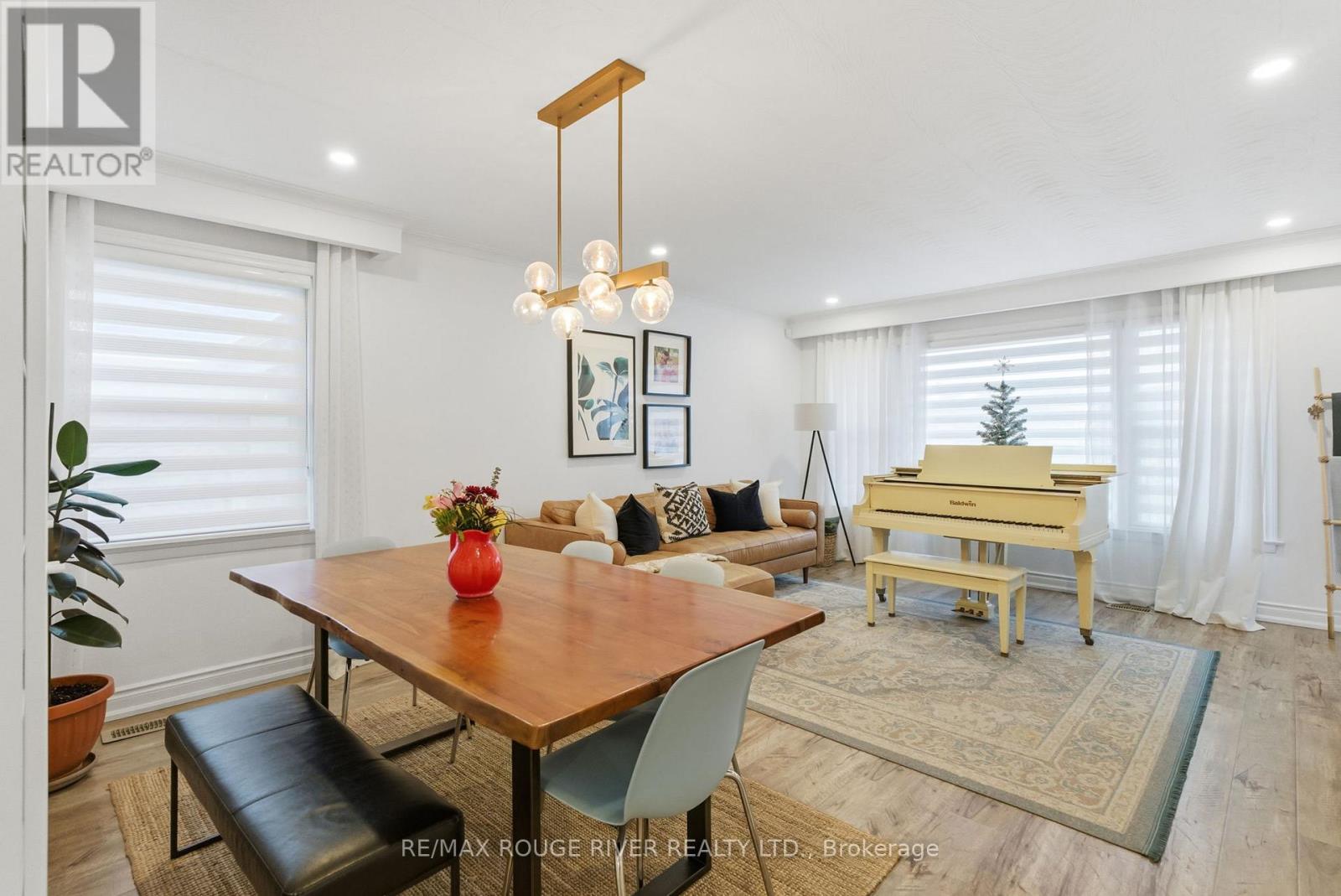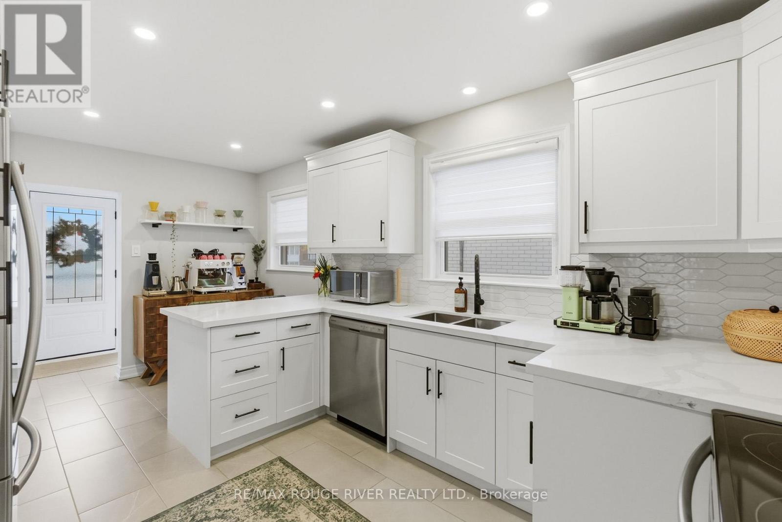 Stunning 3-bedroom bungalow in sought-after Blue Grass Meadows! Welcome to this beautifully updated bungalow perfectly situated on a large 50-foot lot in one of Whitby's most desirable neighbourhoods. Bathed in natural light from expansive windows, the inviting living room showcases elegant laminate flooring that flows seamlessly throughout the home. A stunning picture window provides a beautiful backdrop for everyday living and holiday celebrations alike. The open-concept dining area offers the ideal space for entertaining, enhanced by a striking statement light fixture with dimming capabilities to set the perfect mood. The gorgeous chef-inspired kitchen features custom quartz countertops, a full-height backsplash, sleek stainless steel appliances, and modern white cabinetry accented with black hardware. A convenient bar seating area and cozy nook for a coffee or wine station complete this elegant space. All three bedrooms are located on the main floor, each featuring warm laminate flooring and abundant natural light. The finished basement offers incredible versatility with a spacious family room, pot lights, a large front room ideal as an office or gym, a 3-piece bath, and a separate entrance-perfect for extended family or guests. Step outside to your private backyard oasis. Professionally landscaped, this outdoor haven features lush sod, dual gated fencing, an expansive patio ideal for entertaining, a cozy fire pit seating area, and a practical storage shed. Mature tree removal has opened the space beautifully, allowing sunlight to flood your yard all day long. With a single-car garage, spacious driveway, and an unbeatable location close to parks, schools, and amenities, this exceptional home blends comfort, style, and convenience in one perfect package. (id:51158)