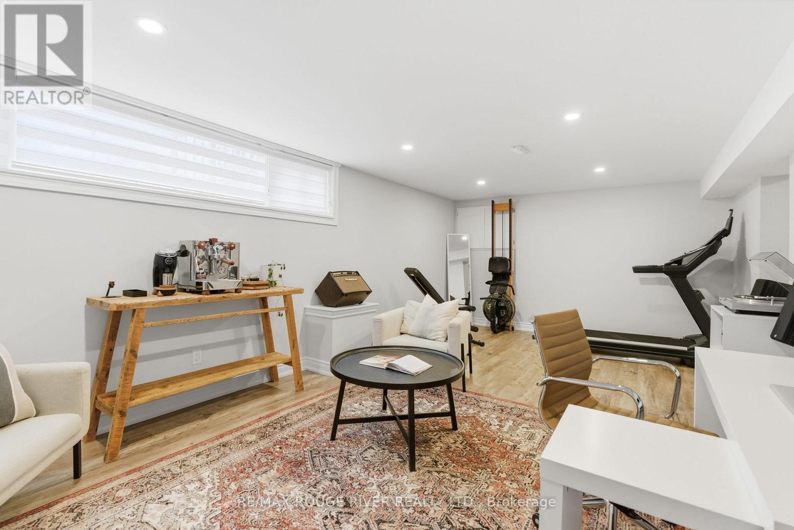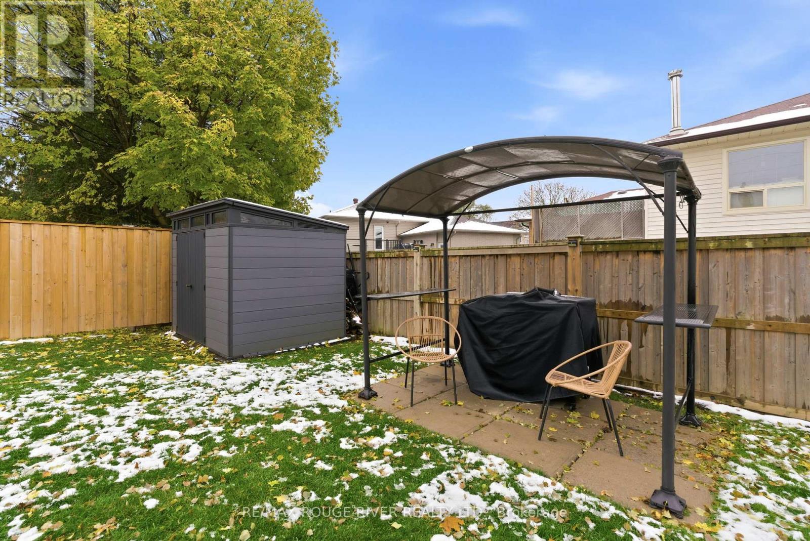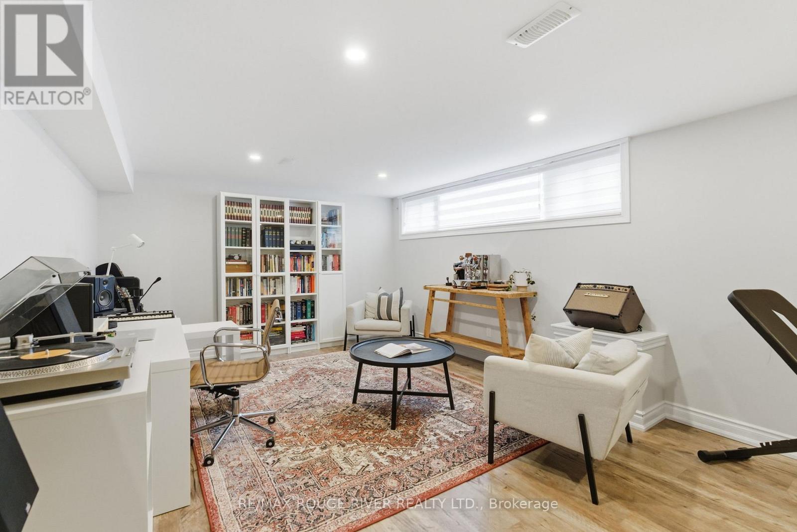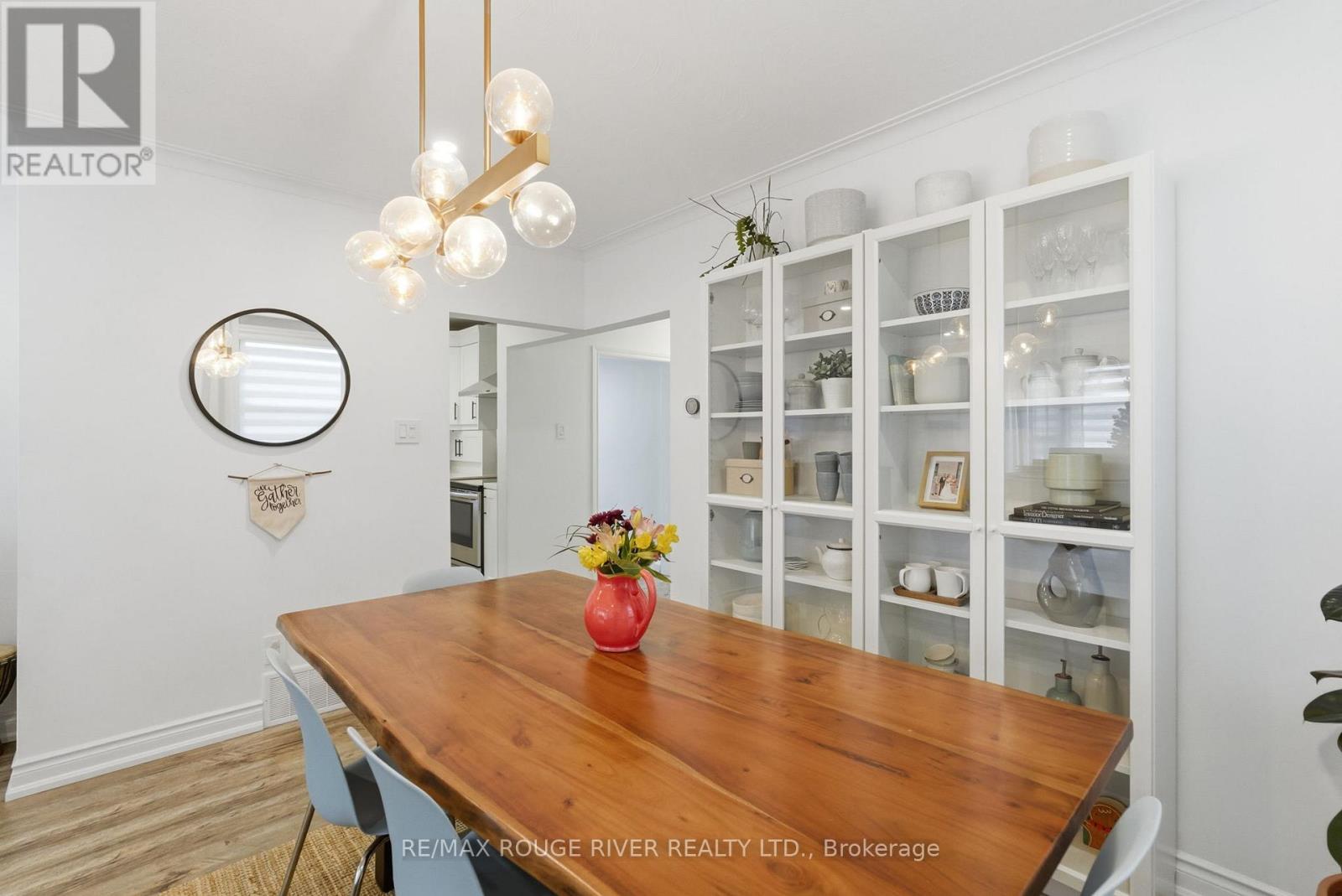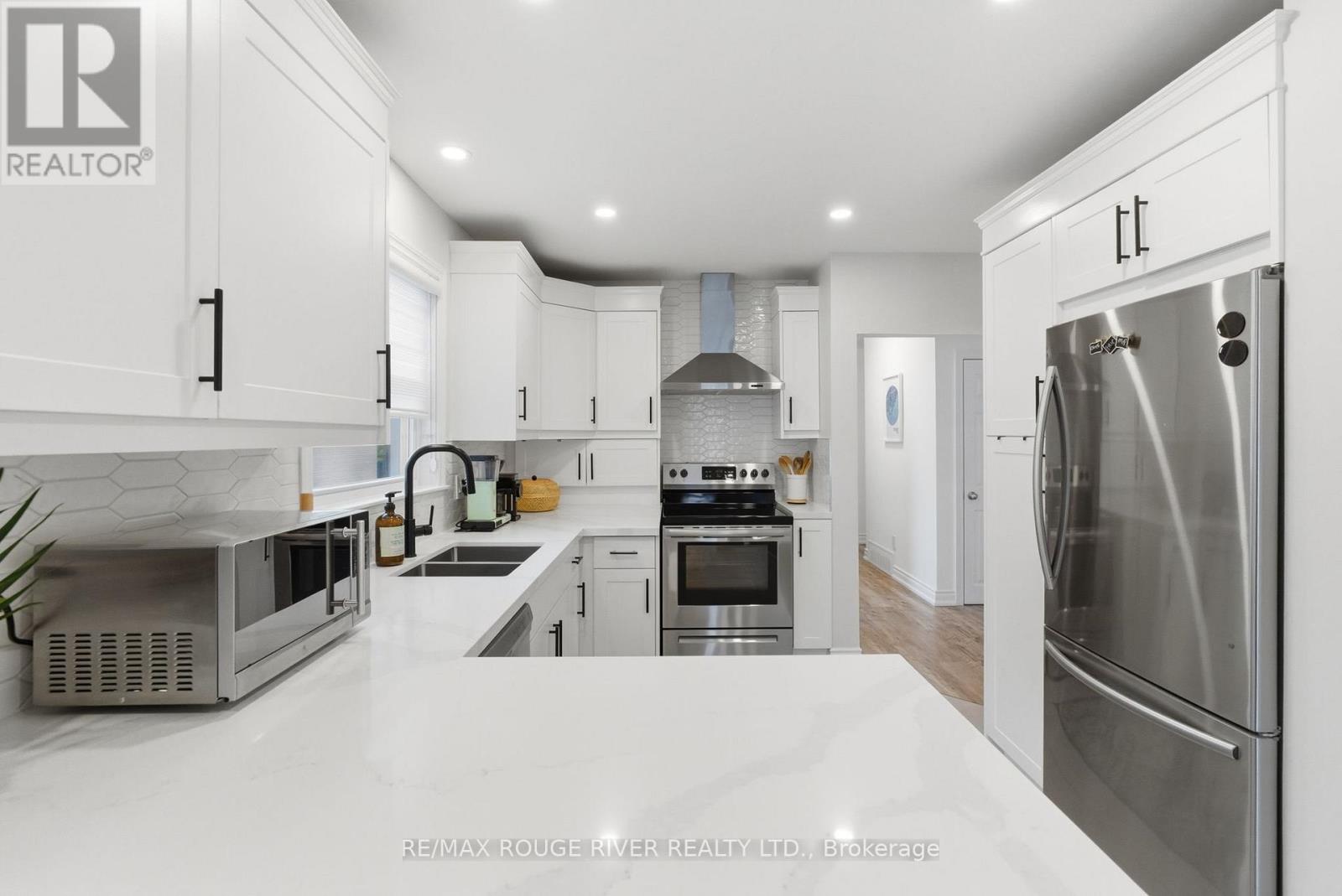 Stunning 3-bedroom bungalow in sought-after Blue Grass Meadows! Welcome to this beautifully updated bungalow perfectly situated on a large 50-foot lot in one of Whitby's most desirable neighbourhoods. Bathed in natural light from expansive windows, the inviting living room showcases elegant laminate flooring that flows seamlessly throughout the home. A stunning picture window provides a beautiful backdrop for everyday living and holiday celebrations alike. The open-concept dining area offers the ideal space for entertaining, enhanced by a striking statement light fixture with dimming capabilities to set the perfect mood. The gorgeous chef-inspired kitchen features custom quartz countertops, a full-height backsplash, sleek stainless steel appliances, and modern white cabinetry accented with black hardware. A convenient bar seating area and cozy nook for a coffee or wine station complete this elegant space. All three bedrooms are located on the main floor, each featuring warm laminate flooring and abundant natural light. The finished basement offers incredible versatility with a spacious family room, pot lights, a large front room ideal as an office or gym, a 3-piece bath, and a separate entrance-perfect for extended family or guests. Step outside to your private backyard oasis. Professionally landscaped, this outdoor haven features lush sod, dual gated fencing, an expansive patio ideal for entertaining, a cozy fire pit seating area, and a practical storage shed. Mature tree removal has opened the space beautifully, allowing sunlight to flood your yard all day long. With a single-car garage, spacious driveway, and an unbeatable location close to parks, schools, and amenities, this exceptional home blends comfort, style, and convenience in one perfect package. (id:51158)