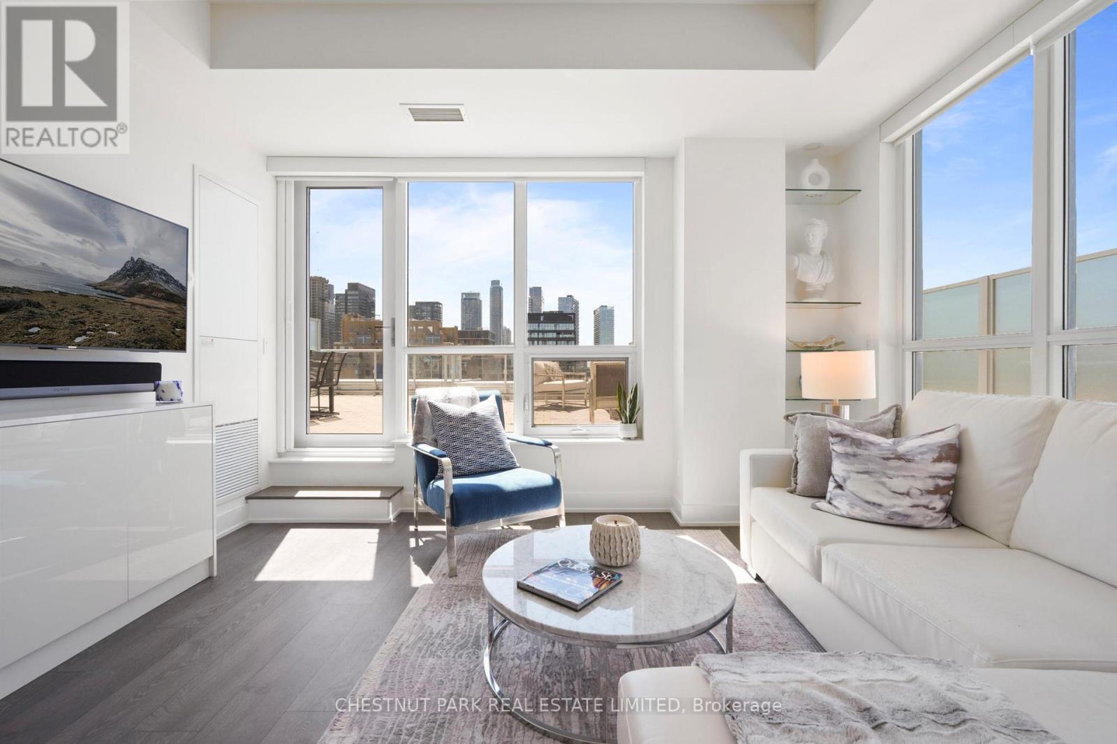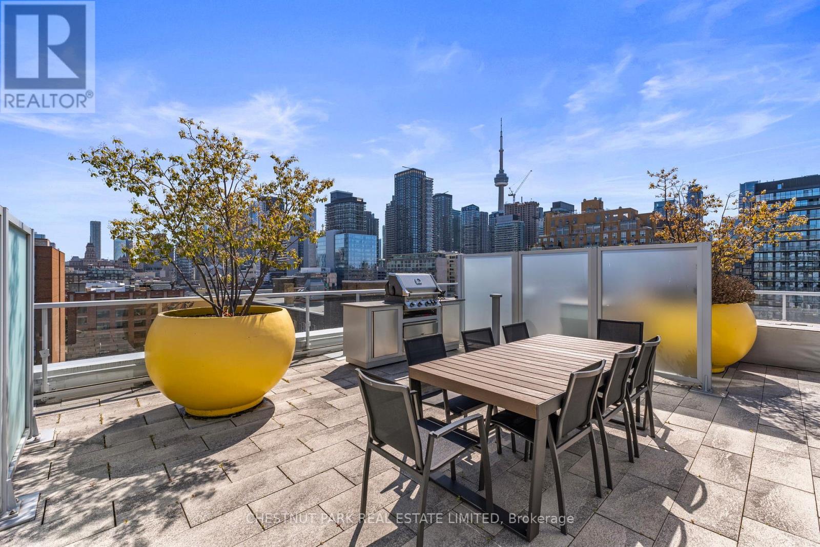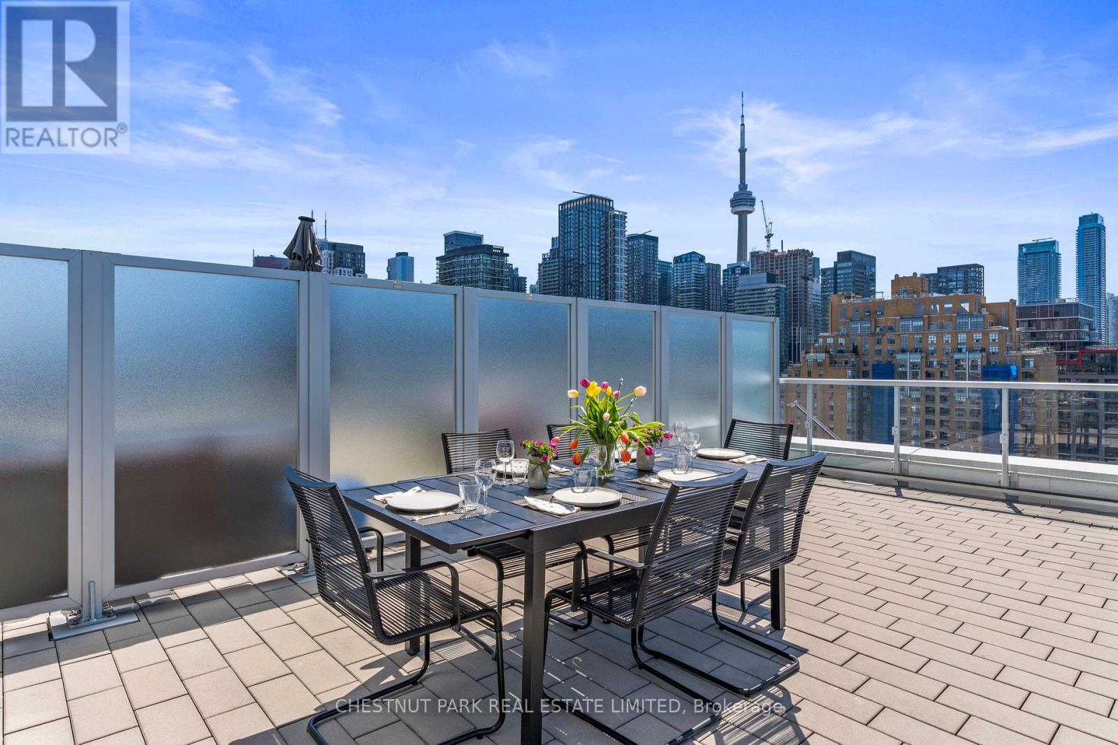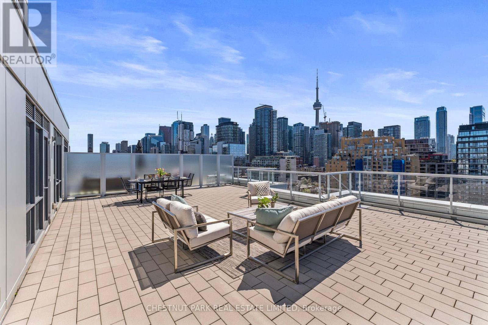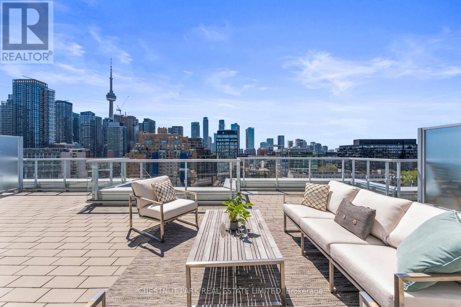 Perched atop the award-winning SQ Building by Tridel, this designer-upgraded suite offers over1,000 SQFT of refined interior space and a RARE 969 SQFT south-facing private terrace withunobstructed views of the CN Tower and Toronto skyline. A true backyard in the sky, theterrace is complete with BBQ and water lines, offering an unrivalled space for outdoor livingand entertaining. Thoughtfully designed with a split two-bedroom layout plus an enclosed denand 2.5-baths, this residence combines functionality with luxurious finishings throughout. Thespacious open-concept living and dining areas are framed by floor-to-ceiling windows, floodingthe space with natural light and offering seamless indoor-outdoor flow to the expansiveterrace an entertainers dream. The chef-inspired kitchen is anchored by an oversized islandwith an integrated wine fridge, upgraded with sleek stone counters and custom cabinetry, andoverlooks the bright, airy main living space. Both bedrooms feature walk-in closets andprivate ensuites, providing ultimate comfort and privacy. The fully enclosed den, outfittedwith a custom-milled Murphy bed and integrated desk, easily functions as a third bedroom or awork-from-home retreat.Upgraded throughout with nearly $90,000 in builder and designerenhancements, including automated blinds, custom millwork, retractable screens, premiumfinishes, and wide-plank flooring. Included are two side-by-side underground parking spaceswith EV charging capability, plus a full-size locker. Located just moments fromTrinityBellwoods Park, Ossington, and the best of Queen West, this rare offering pairs modernconvenience with elevated city living. (id:51158)