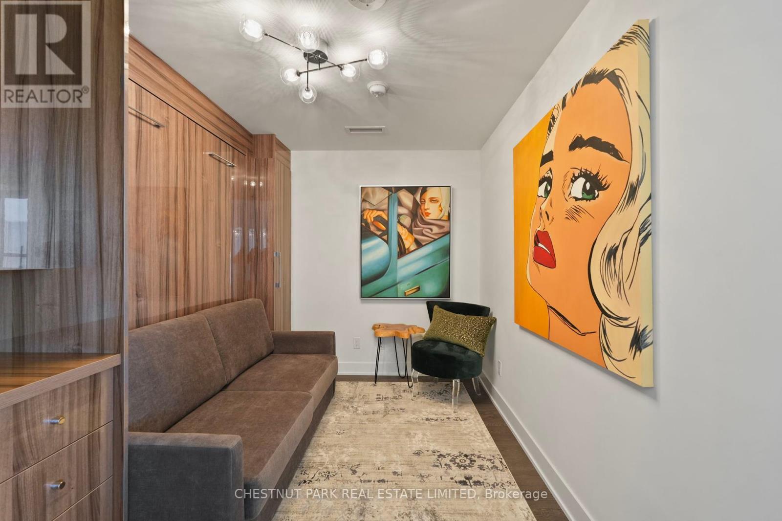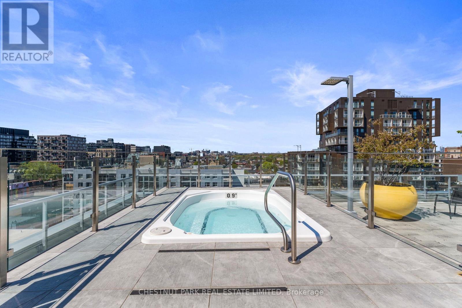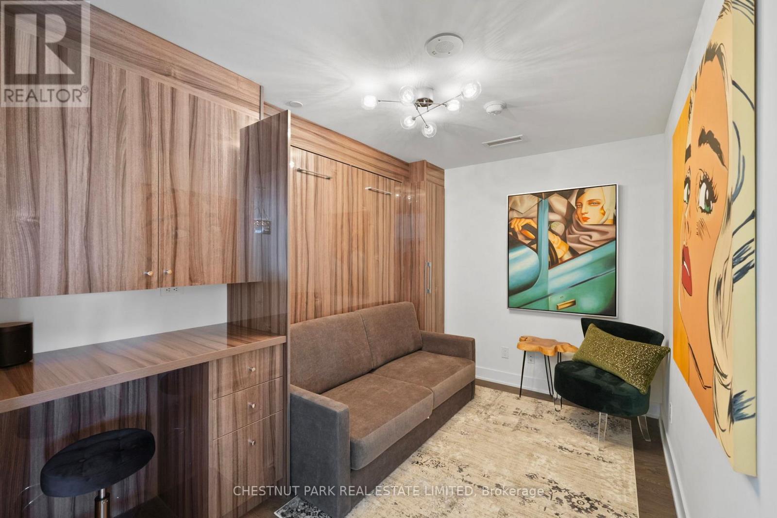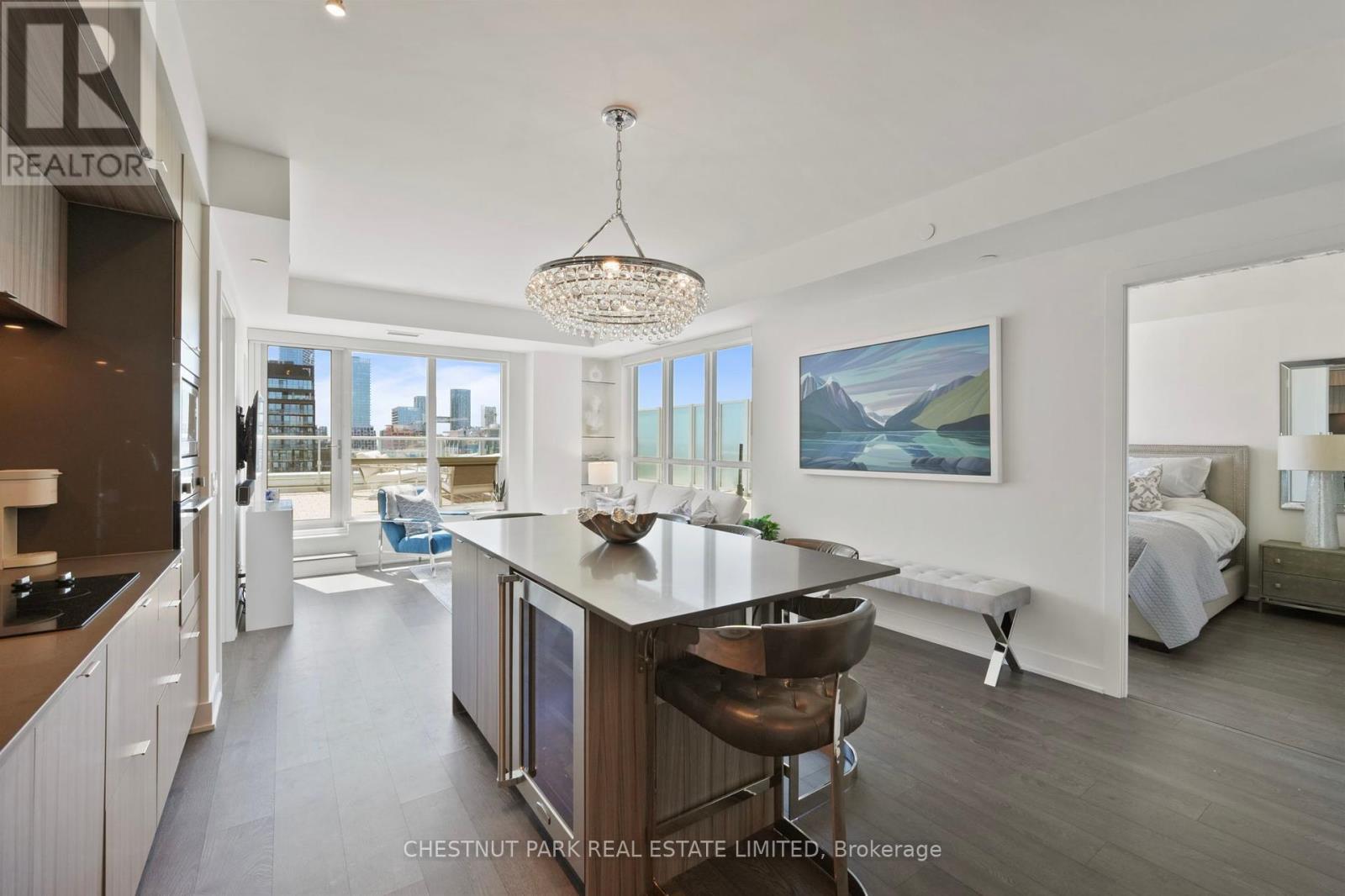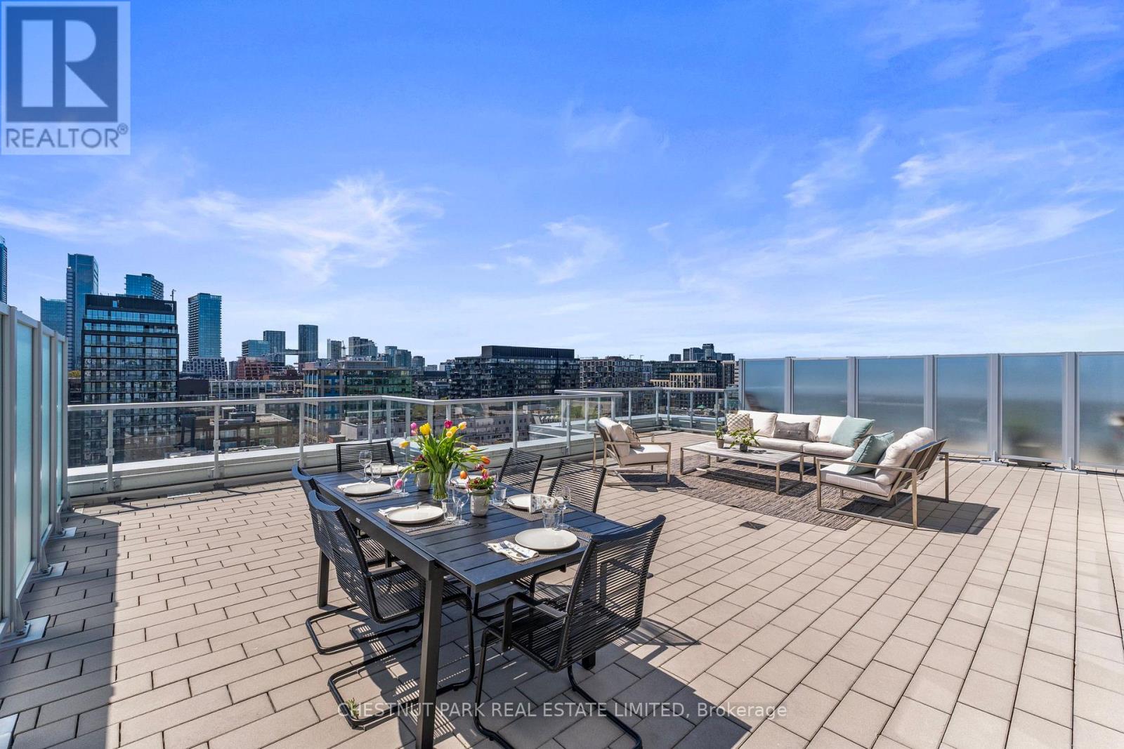 Perched atop the award-winning SQ Building by Tridel, this designer-upgraded suite offers over1,000 SQFT of refined interior space and a RARE 969 SQFT south-facing private terrace withunobstructed views of the CN Tower and Toronto skyline. A true backyard in the sky, theterrace is complete with BBQ and water lines, offering an unrivalled space for outdoor livingand entertaining. Thoughtfully designed with a split two-bedroom layout plus an enclosed denand 2.5-baths, this residence combines functionality with luxurious finishings throughout. Thespacious open-concept living and dining areas are framed by floor-to-ceiling windows, floodingthe space with natural light and offering seamless indoor-outdoor flow to the expansiveterrace an entertainers dream. The chef-inspired kitchen is anchored by an oversized islandwith an integrated wine fridge, upgraded with sleek stone counters and custom cabinetry, andoverlooks the bright, airy main living space. Both bedrooms feature walk-in closets andprivate ensuites, providing ultimate comfort and privacy. The fully enclosed den, outfittedwith a custom-milled Murphy bed and integrated desk, easily functions as a third bedroom or awork-from-home retreat.Upgraded throughout with nearly $90,000 in builder and designerenhancements, including automated blinds, custom millwork, retractable screens, premiumfinishes, and wide-plank flooring. Included are two side-by-side underground parking spaceswith EV charging capability, plus a full-size locker. Located just moments fromTrinityBellwoods Park, Ossington, and the best of Queen West, this rare offering pairs modernconvenience with elevated city living. (id:51158)
