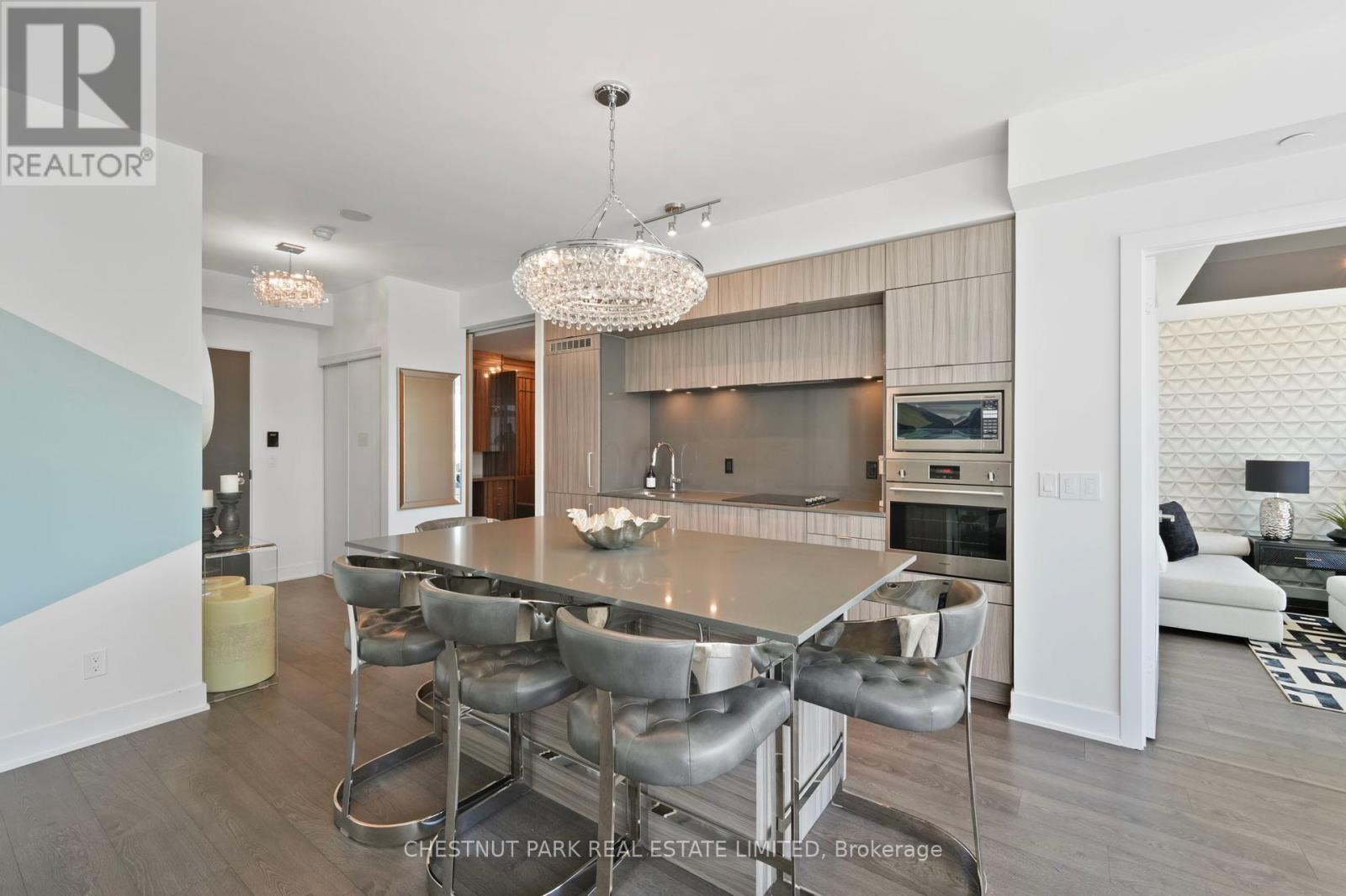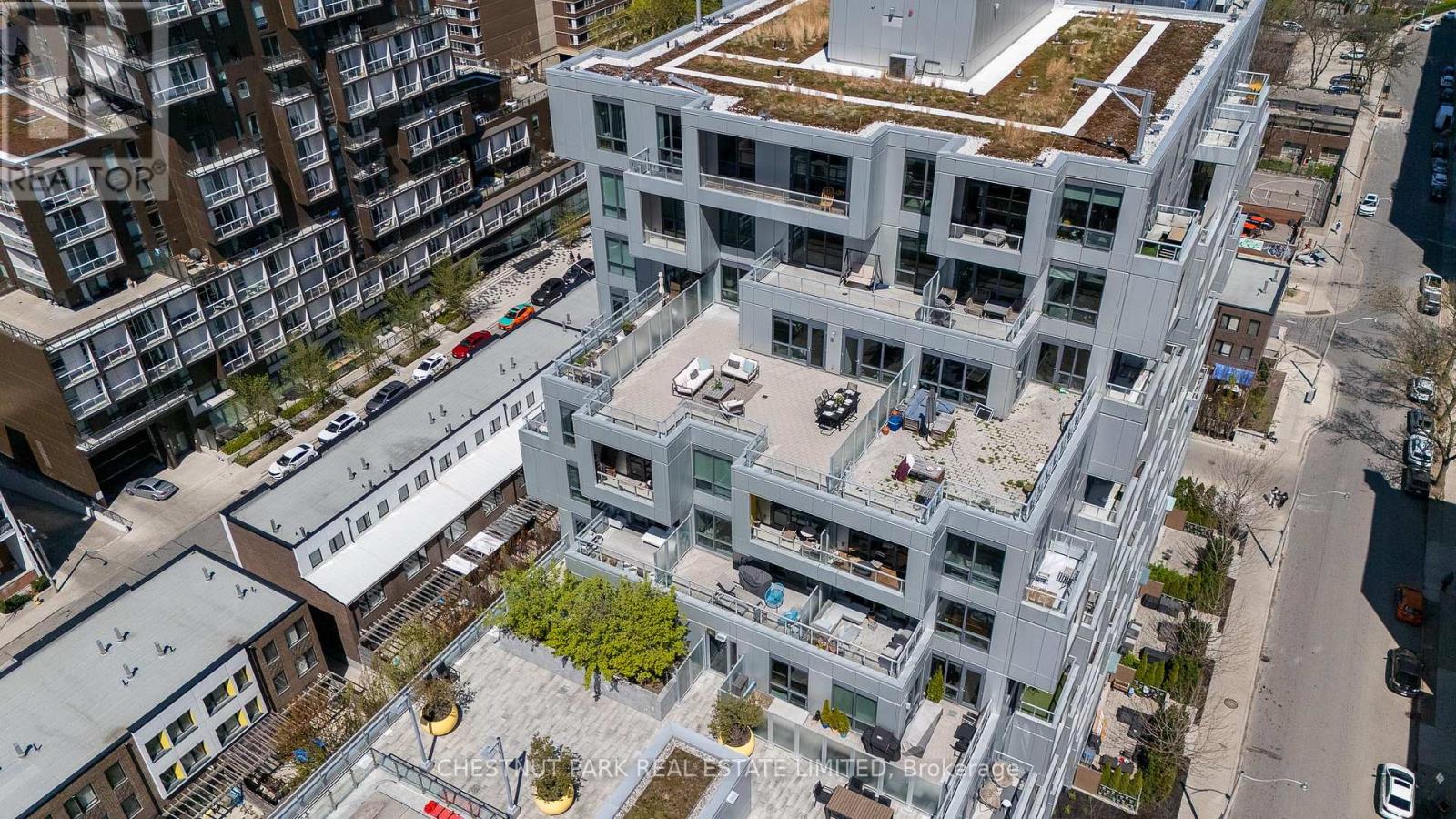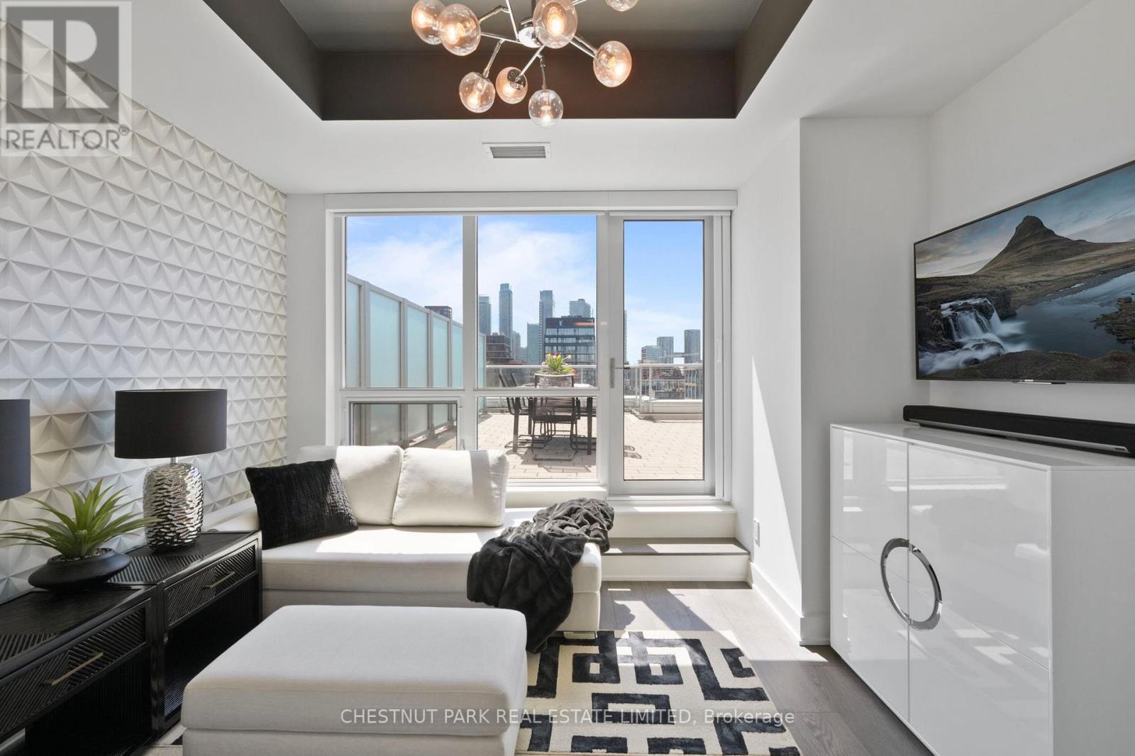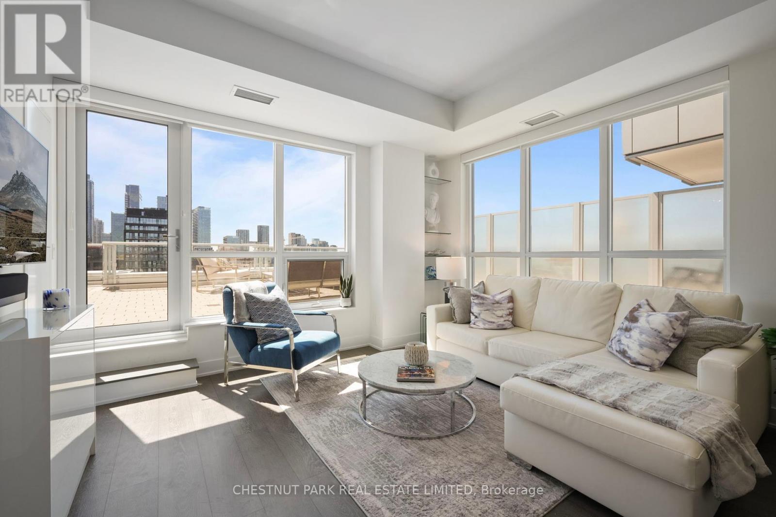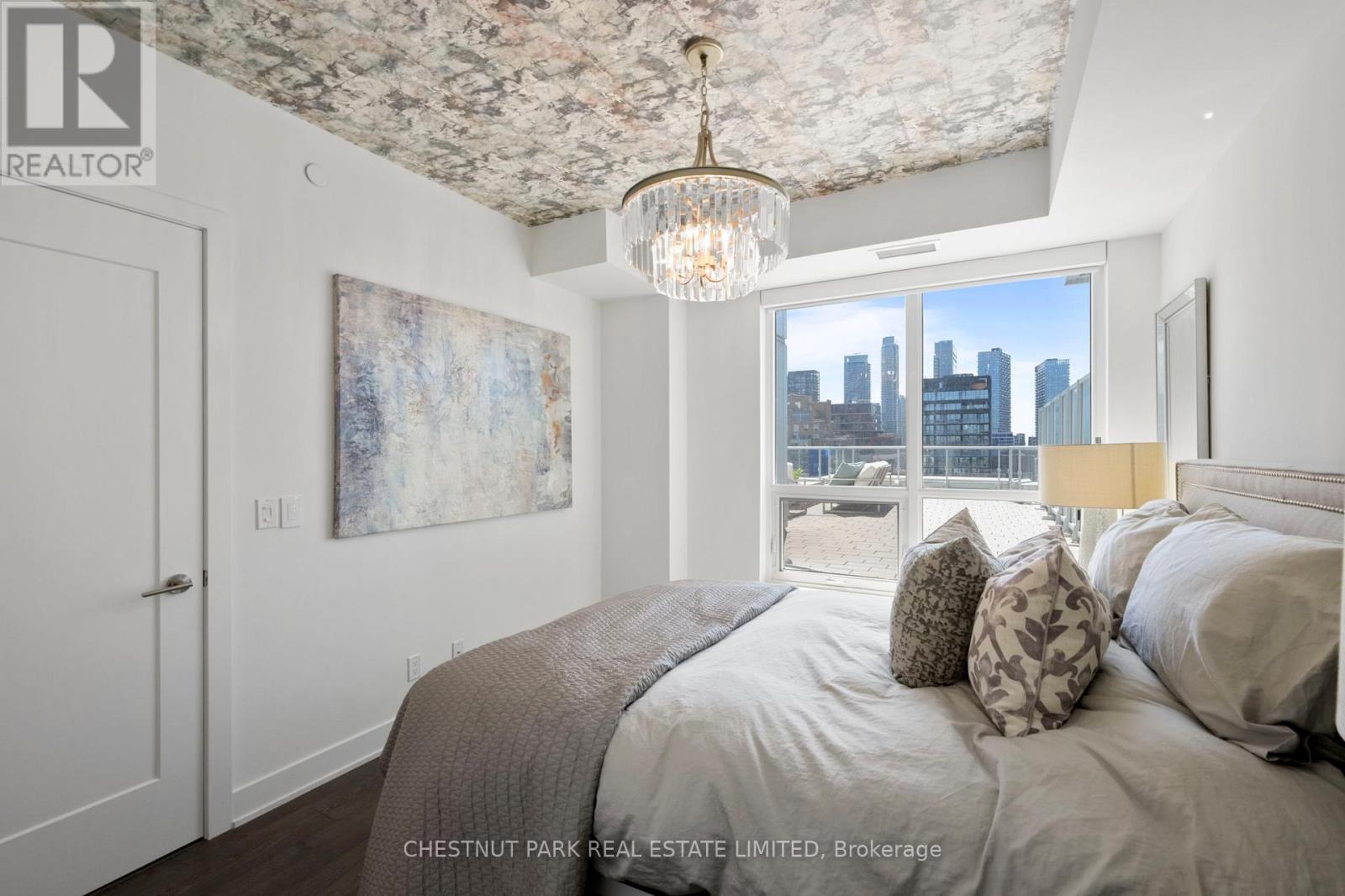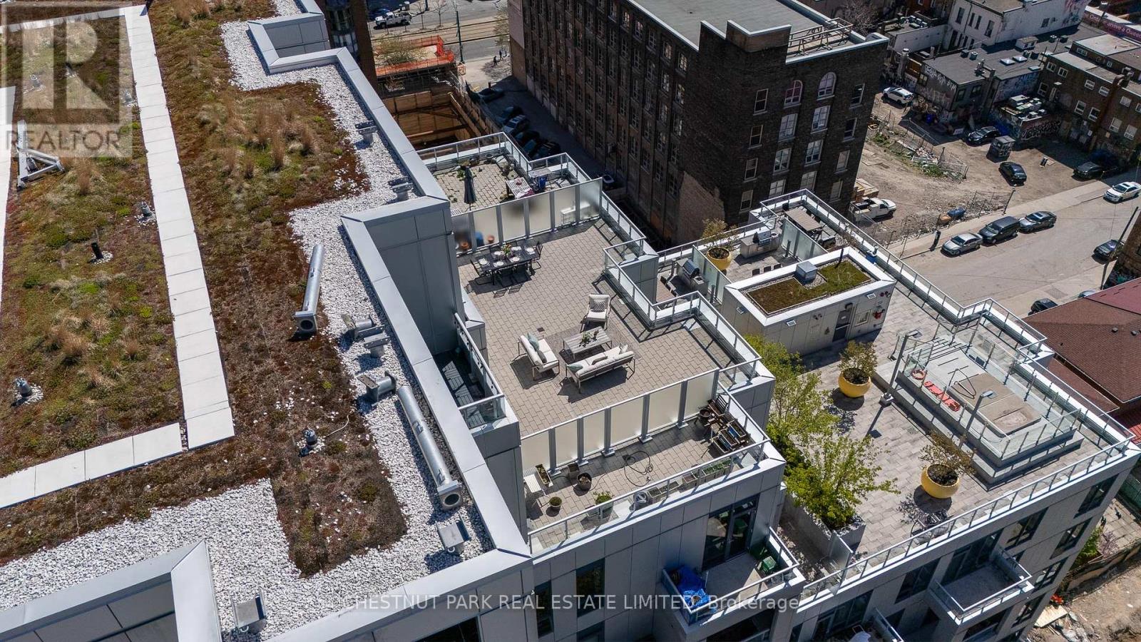 Perched atop the award-winning SQ Building by Tridel, this designer-upgraded suite offers over1,000 SQFT of refined interior space and a RARE 969 SQFT south-facing private terrace withunobstructed views of the CN Tower and Toronto skyline. A true backyard in the sky, theterrace is complete with BBQ and water lines, offering an unrivalled space for outdoor livingand entertaining. Thoughtfully designed with a split two-bedroom layout plus an enclosed denand 2.5-baths, this residence combines functionality with luxurious finishings throughout. Thespacious open-concept living and dining areas are framed by floor-to-ceiling windows, floodingthe space with natural light and offering seamless indoor-outdoor flow to the expansiveterrace an entertainers dream. The chef-inspired kitchen is anchored by an oversized islandwith an integrated wine fridge, upgraded with sleek stone counters and custom cabinetry, andoverlooks the bright, airy main living space. Both bedrooms feature walk-in closets andprivate ensuites, providing ultimate comfort and privacy. The fully enclosed den, outfittedwith a custom-milled Murphy bed and integrated desk, easily functions as a third bedroom or awork-from-home retreat.Upgraded throughout with nearly $90,000 in builder and designerenhancements, including automated blinds, custom millwork, retractable screens, premiumfinishes, and wide-plank flooring. Included are two side-by-side underground parking spaceswith EV charging capability, plus a full-size locker. Located just moments fromTrinityBellwoods Park, Ossington, and the best of Queen West, this rare offering pairs modernconvenience with elevated city living. (id:51158)