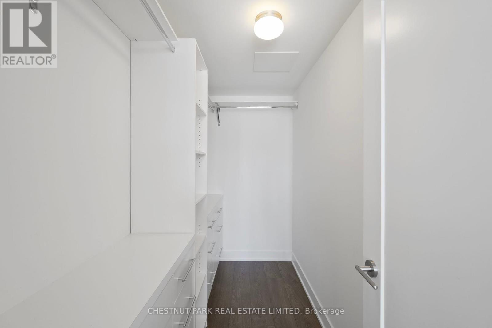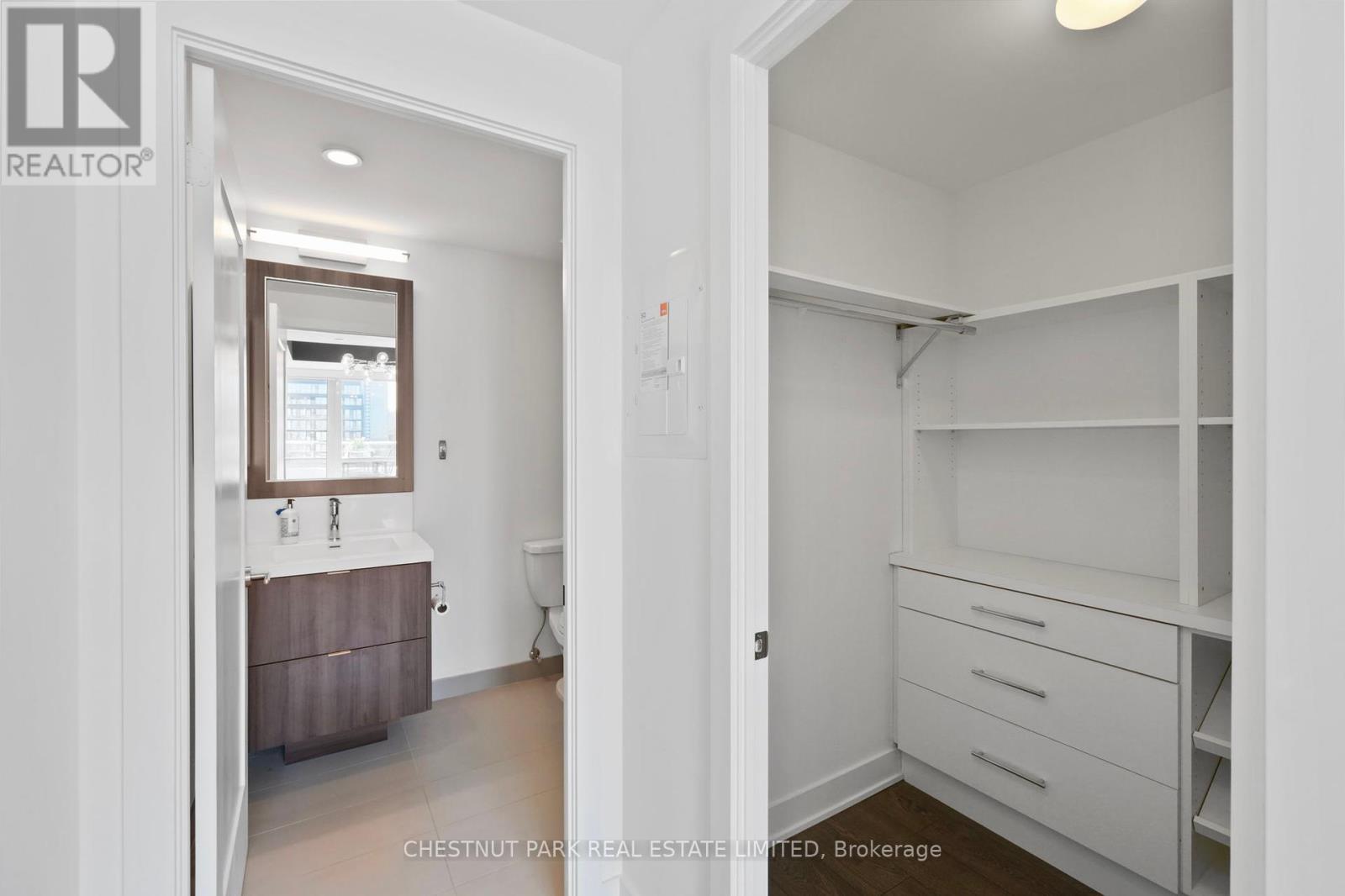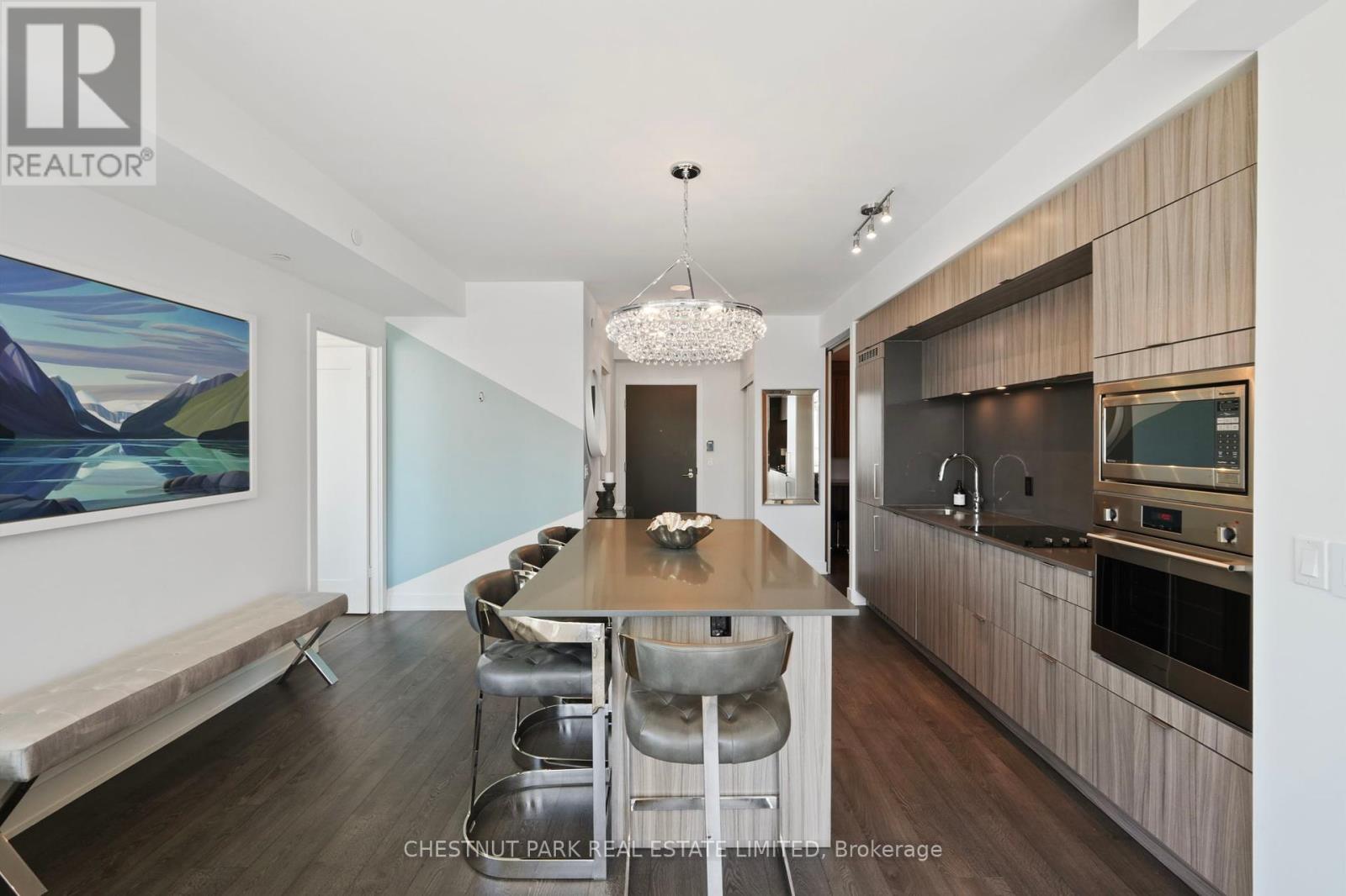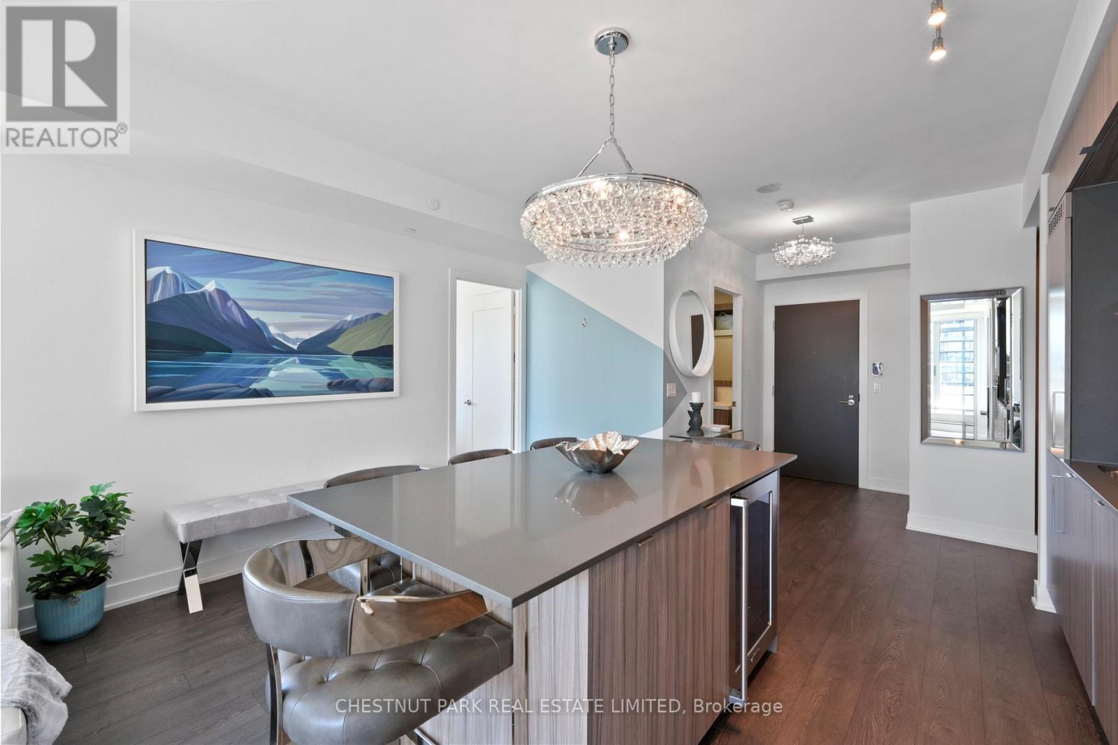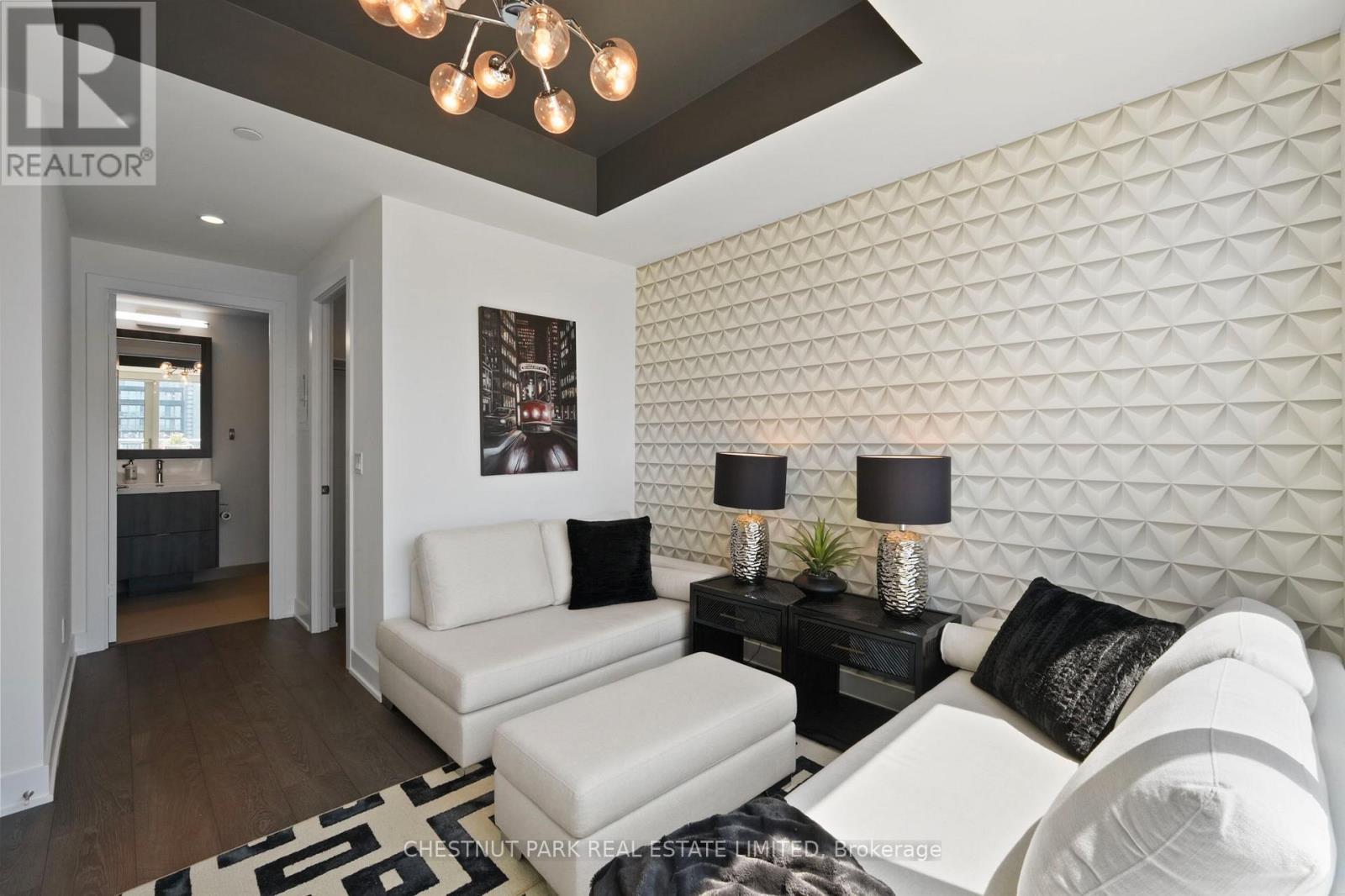 Perched atop the award-winning SQ Building by Tridel, this designer-upgraded suite offers over1,000 SQFT of refined interior space and a RARE 969 SQFT south-facing private terrace withunobstructed views of the CN Tower and Toronto skyline. A true backyard in the sky, theterrace is complete with BBQ and water lines, offering an unrivalled space for outdoor livingand entertaining. Thoughtfully designed with a split two-bedroom layout plus an enclosed denand 2.5-baths, this residence combines functionality with luxurious finishings throughout. Thespacious open-concept living and dining areas are framed by floor-to-ceiling windows, floodingthe space with natural light and offering seamless indoor-outdoor flow to the expansiveterrace an entertainers dream. The chef-inspired kitchen is anchored by an oversized islandwith an integrated wine fridge, upgraded with sleek stone counters and custom cabinetry, andoverlooks the bright, airy main living space. Both bedrooms feature walk-in closets andprivate ensuites, providing ultimate comfort and privacy. The fully enclosed den, outfittedwith a custom-milled Murphy bed and integrated desk, easily functions as a third bedroom or awork-from-home retreat.Upgraded throughout with nearly $90,000 in builder and designerenhancements, including automated blinds, custom millwork, retractable screens, premiumfinishes, and wide-plank flooring. Included are two side-by-side underground parking spaceswith EV charging capability, plus a full-size locker. Located just moments fromTrinityBellwoods Park, Ossington, and the best of Queen West, this rare offering pairs modernconvenience with elevated city living. (id:51158)