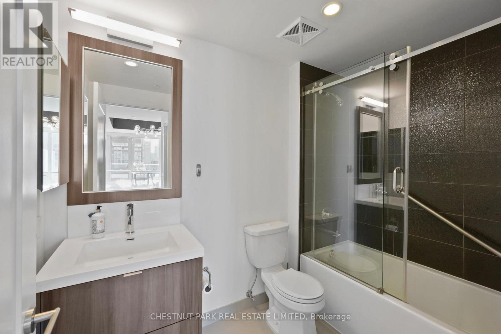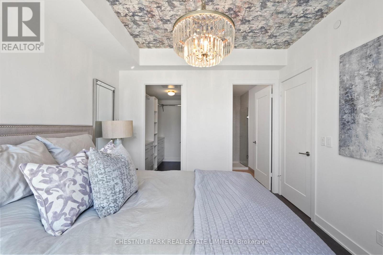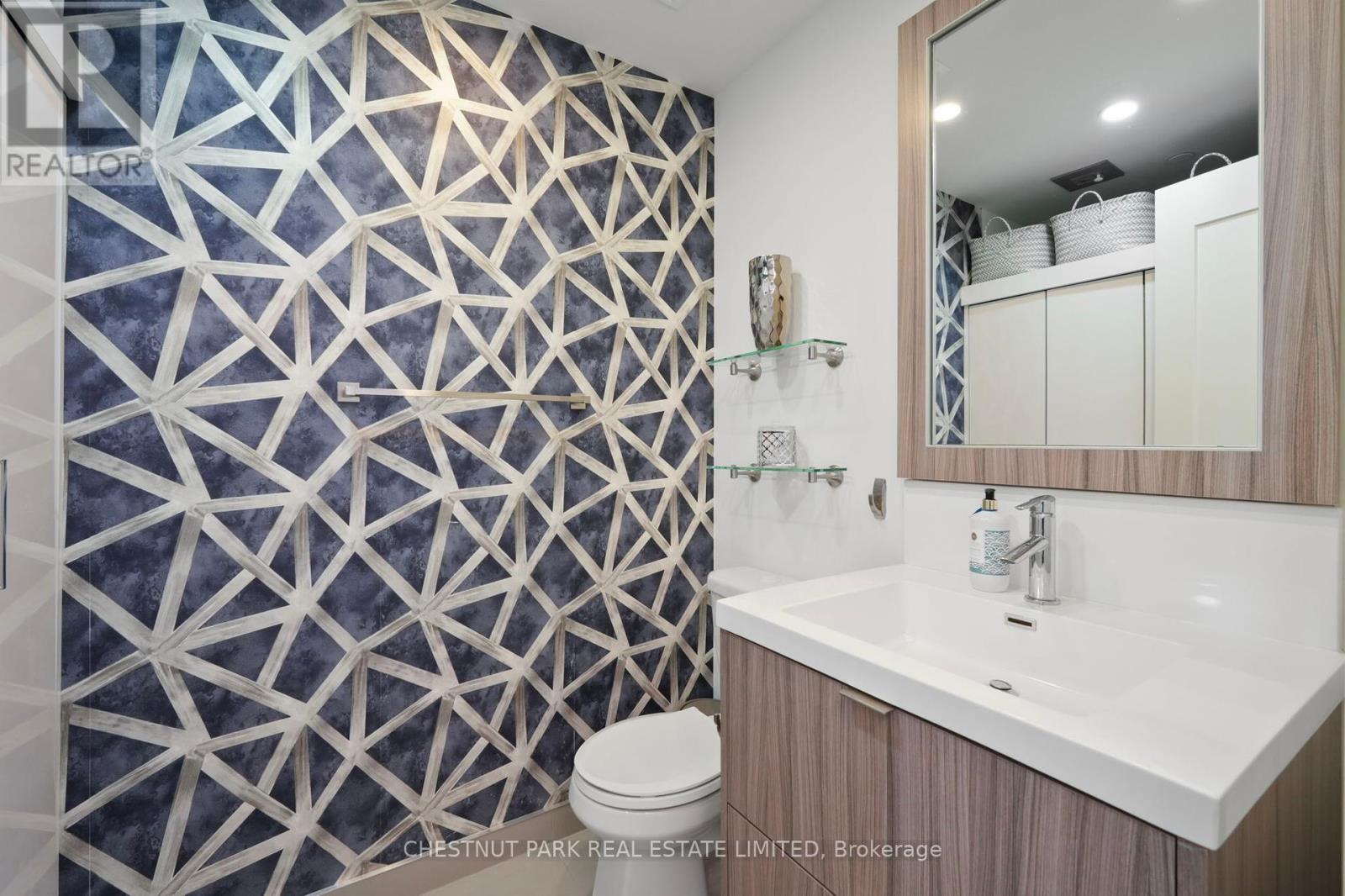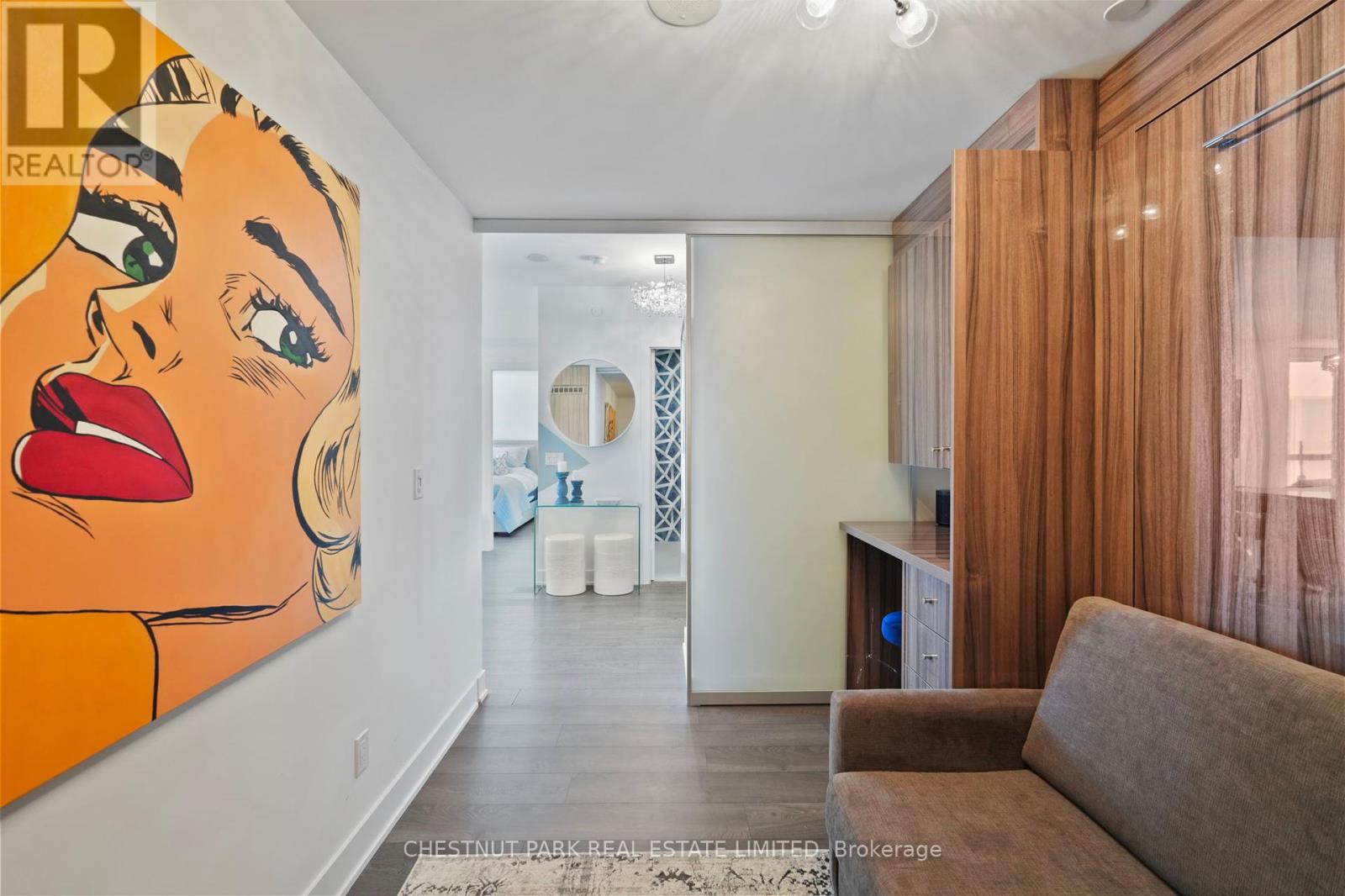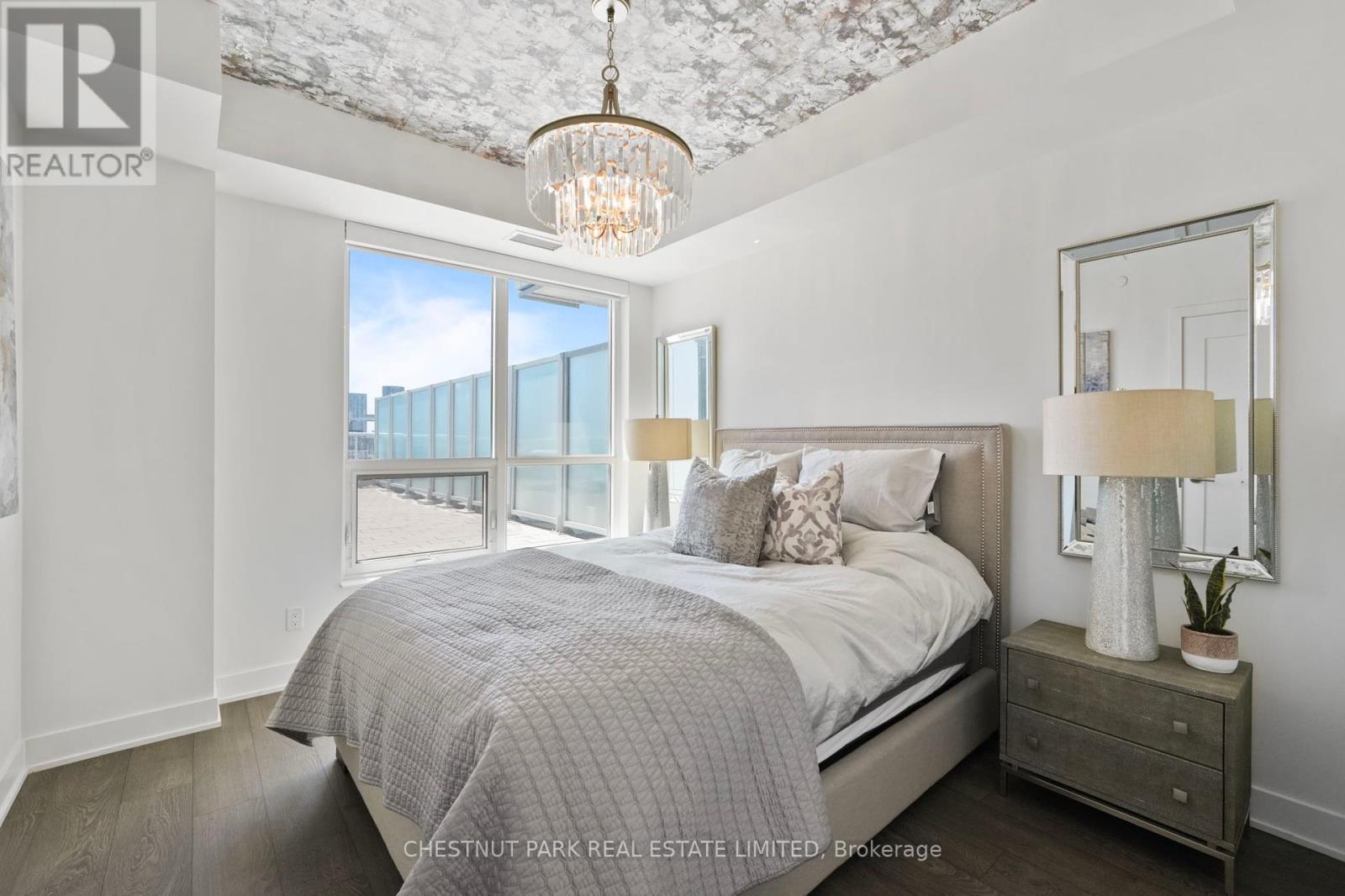 Perched atop the award-winning SQ Building by Tridel, this designer-upgraded suite offers over1,000 SQFT of refined interior space and a RARE 969 SQFT south-facing private terrace withunobstructed views of the CN Tower and Toronto skyline. A true backyard in the sky, theterrace is complete with BBQ and water lines, offering an unrivalled space for outdoor livingand entertaining. Thoughtfully designed with a split two-bedroom layout plus an enclosed denand 2.5-baths, this residence combines functionality with luxurious finishings throughout. Thespacious open-concept living and dining areas are framed by floor-to-ceiling windows, floodingthe space with natural light and offering seamless indoor-outdoor flow to the expansiveterrace an entertainers dream. The chef-inspired kitchen is anchored by an oversized islandwith an integrated wine fridge, upgraded with sleek stone counters and custom cabinetry, andoverlooks the bright, airy main living space. Both bedrooms feature walk-in closets andprivate ensuites, providing ultimate comfort and privacy. The fully enclosed den, outfittedwith a custom-milled Murphy bed and integrated desk, easily functions as a third bedroom or awork-from-home retreat.Upgraded throughout with nearly $90,000 in builder and designerenhancements, including automated blinds, custom millwork, retractable screens, premiumfinishes, and wide-plank flooring. Included are two side-by-side underground parking spaceswith EV charging capability, plus a full-size locker. Located just moments fromTrinityBellwoods Park, Ossington, and the best of Queen West, this rare offering pairs modernconvenience with elevated city living. (id:51158)