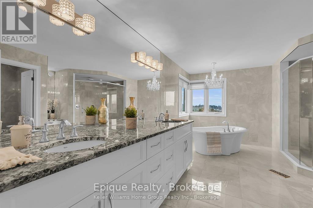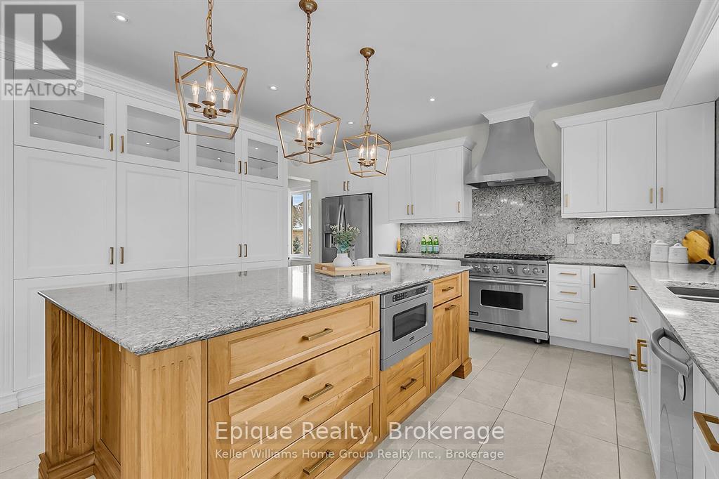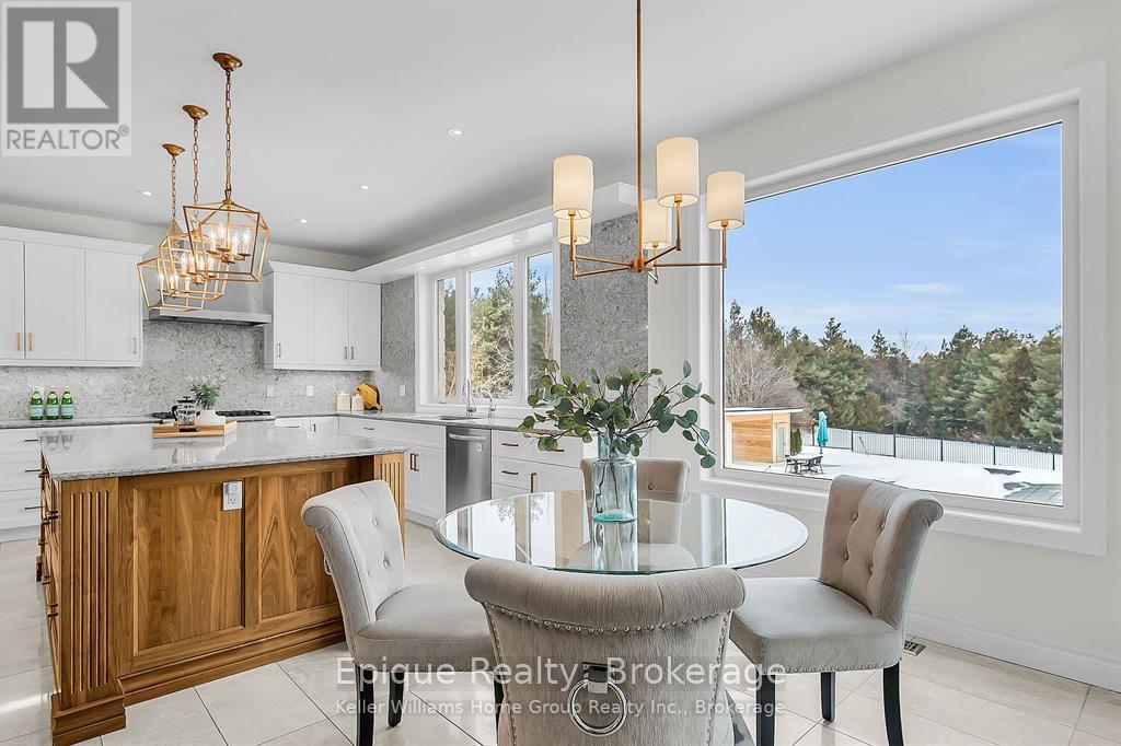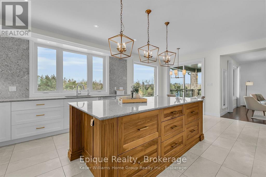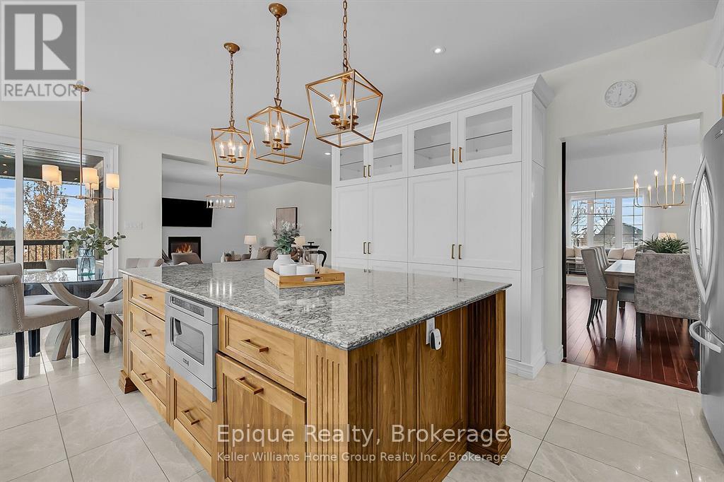 Luxury lives in this Thomasfield-built trophy home in coveted Crewson Ridge Estates. Situated on 3.4 acres of conservation-backed land, it features 6 bedrooms, 5 bathrooms, and over 5,200 sq.ft. of finished space. Highlights include 2 kitchens, a heated saltwater pool (built in 2023) with an automated safety cover, geothermal heating, and a lavish primary suite with an 8-piece ensuite, walkout basement w/ rental potential incl. 2 add'l bedrooms and a separate entrance. A backup generator and energy-efficient systems complete this turnkey estate. A two-story grand entrance with 9' ceilings and luxurious finishes, including heated marble floors and scratch-resistant engineered cherry wood floors.* Custom Kitchen: Paragon-designed with quartz counters, slab backsplash, soft-close cabinetry, extraordinary storage space, and a striking massive cherry wood island. Outfitted with Brigade commercial-grade appliances for a chefs dream.* Living & Dining Areas: Spacious and elegant, designed for entertaining.Family Room: Cosy gathering space featuring shiplap feature wall and gas (propane) fireplace. Upper Floor:* Primary Suite: Features two walk-in closets, an 8-piece ensuite with heated floors, and a versatile adjacent space for an office or nursery.* Bedrooms: Three additional generously sized bedrooms, offering ample privacy and comfort for family or guests. Walkout Basement:* Self-Contained Living Space: Offers 1,823 sq. ft. with 9' ceilings, two bedrooms, two bathrooms, and a full kitchen with quartz counters. Large above-grade windows, a family room, office or gym space, and a separate entrance, ideal for rental or multi-generational livingOutdoor Amenities: Heated inground saltwater pool with an automated safety cover, pool cabana, lush conservation-backed 3.4-acre property.This exquisite estate seamlessly blends elegance, comfort, and functionality, perfect for luxurious living. **EXTRAS** Generac generator (id:51158)