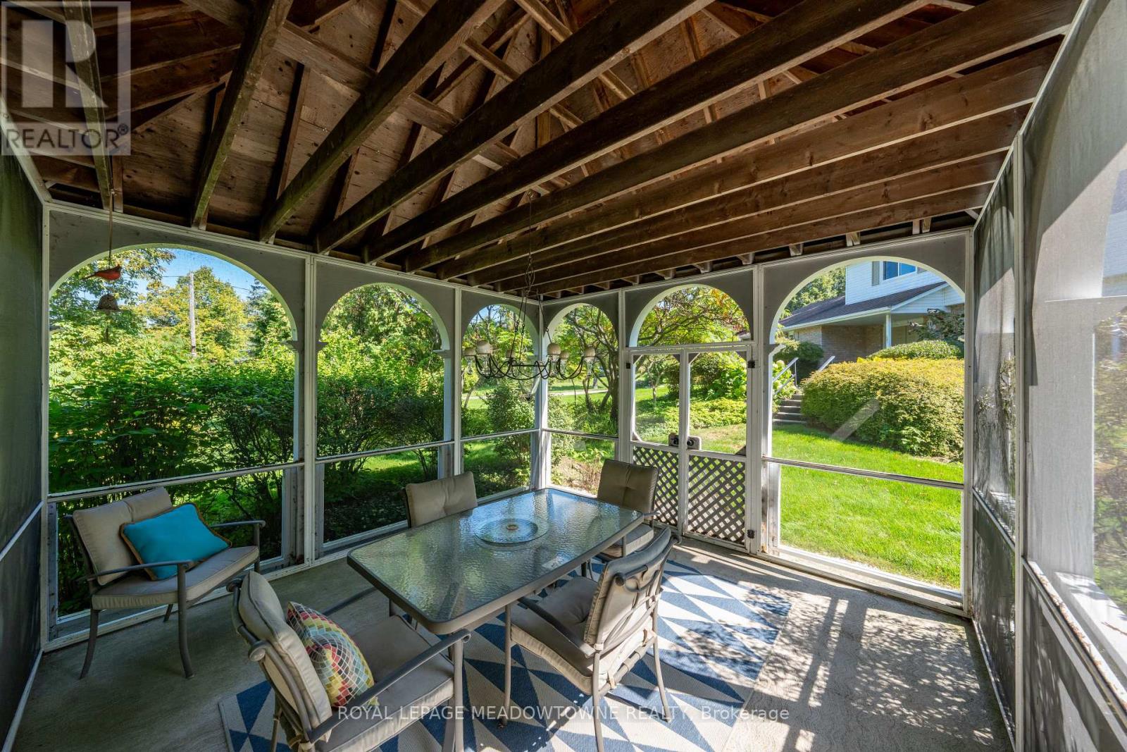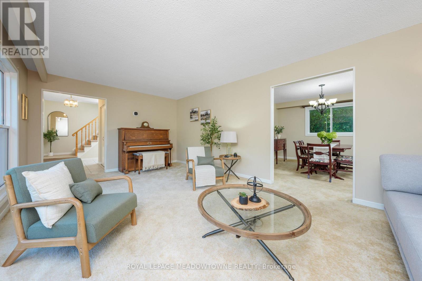 Nestled on a quiet cul-de-sac, this beautifully landscaped 1+ acre property offers peaceful country charm with the convenience of nearby town amenities. A custom enclosed gazebo sets the stage for effortless seasonal entertaining, while a charming stone walkway welcomes you to this well-maintained 4 bedroom, 3 bathroom home.Inside, spacious principal rooms are filled with natural light from oversized windows, showcasing picturesque views of the surrounding mature landscape. The large eat-in kitchen features a walkout and flows seamlessly down to the inviting family room, complete with a fireplace and an additional walkout to a stone patio overlooking the serene, tree-lined grounds.Designed with both comfort and functionality in mind, the home also offers a formal living and dining room-ideal for hosting family gatherings and special occasions. Upstairs, four generously sized bedrooms provide ample storage and beautiful views, including a primary retreat with a 4-piece ensuite.The lower level presents a blank canvas, ready to be customized to suit your family's evolving needs. Additional highlights include an energy-efficient Carrier heat pump system (2024), a 2-car garage with interior access, and convenient main floor laundry.Ideally located just 20 minutes to the 401 and only 10 minutes to Acton, Georgetown, or Erin, this home offers a rare blend of privacy, accessibility, and room to grow. Updates: Heat Pump System (2024), Roof Shingles (2013) (id:51158)