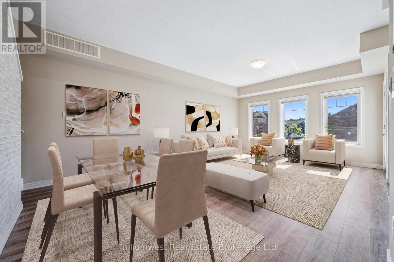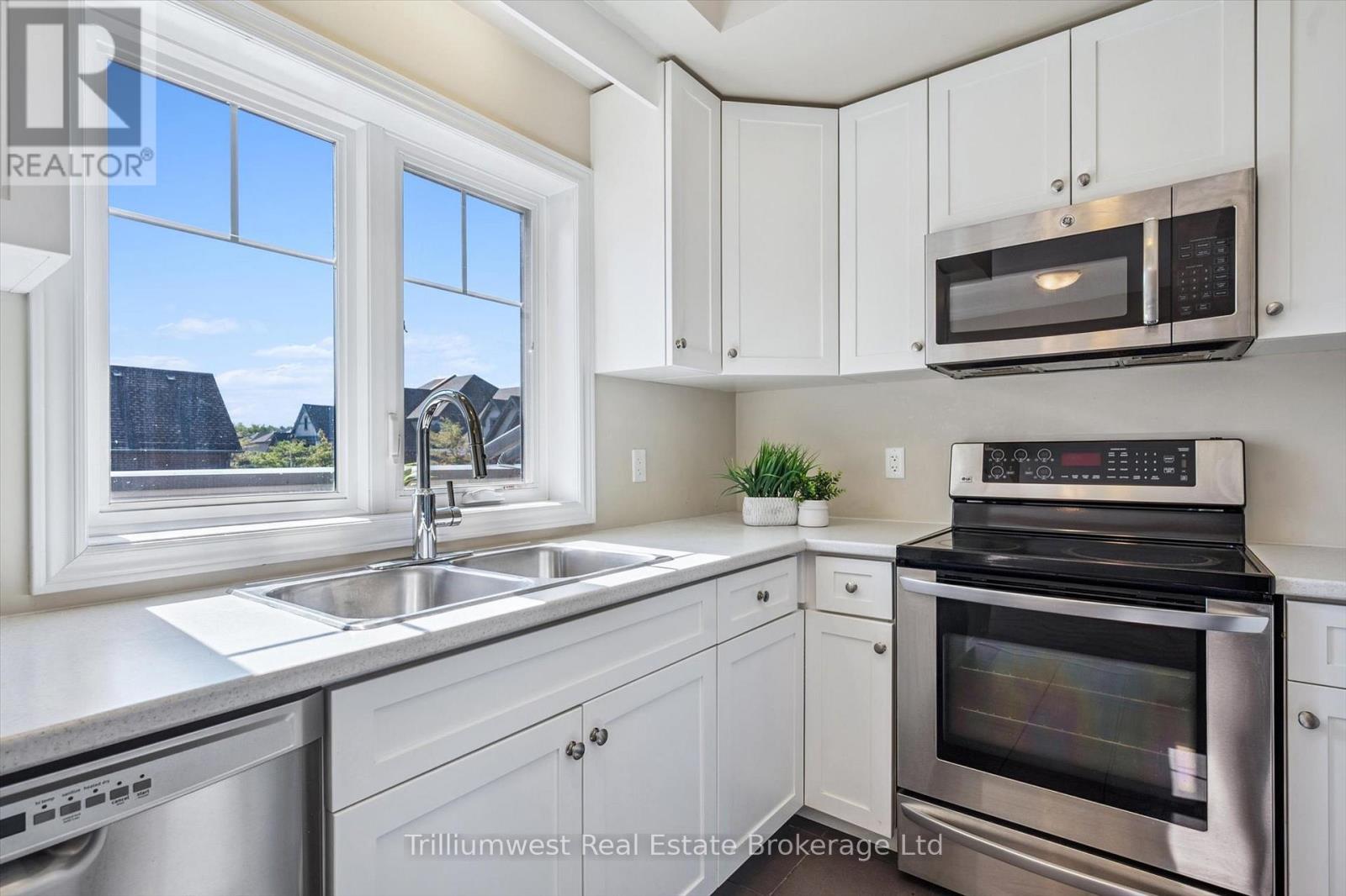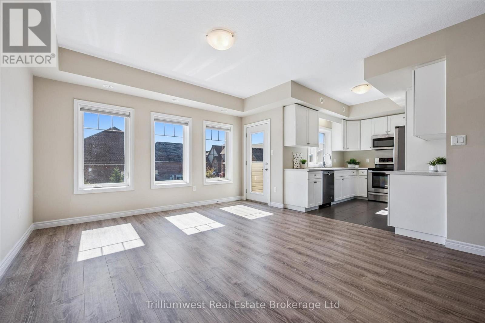 Welcome to 13-39 Kay Crescent, a rare find in Guelph's vibrant South End that offers the best of urban living with exceptional convenience. Located just moments from the Pergola Commons, this home provides unparalleled access to a wealth of amenities, including shopping, groceries, entertainment, and dining. Commuters will appreciate the easy access to Highway 401, making this the perfect blend of central location and accessibility. This stacked condo unit stands out with its flexible and generous parking, featuring one driveway spot and a covered garage with inside entry, plus visitor parking nearby - a true luxury for city living. Step inside to a bright and inviting open-concept main living level that is both functional and spacious. The layout is perfect for entertaining, with room for an extended dining table, a comfortable living area, and a well-appointed kitchen that flow together seamlessly. Large windows bathe the space in natural light and offer picturesque views of the well-maintained common areas, complete with a gazebo, benches, and lush green space. A private balcony off the main living area provides a peaceful retreat for enjoying your morning coffee or evening relaxation. A convenient powder room completes this level. Upstairs, the bright and expansive primary bedroom is a true sanctuary. It features a striking accent wall, a spacious walk-in closet, and enough room for a king-sized bed and all your furniture. The second floor is designed for practicality, offering a good-sized second bedroom, a main bathroom with ample storage, and a dedicated utility room with a washer & dryer. This unit is a standout for its thoughtful design, premium parking, and incredible location. It's not just a home; it's a lifestyle waiting to be enjoyed. (id:51158)