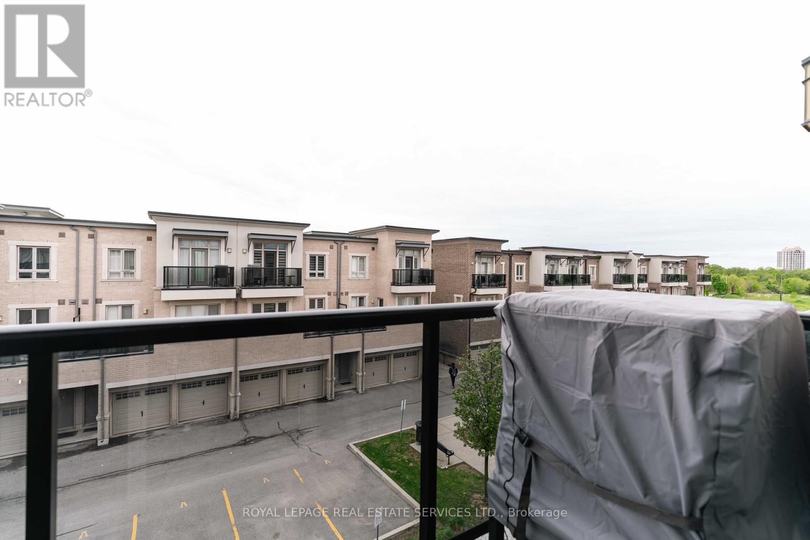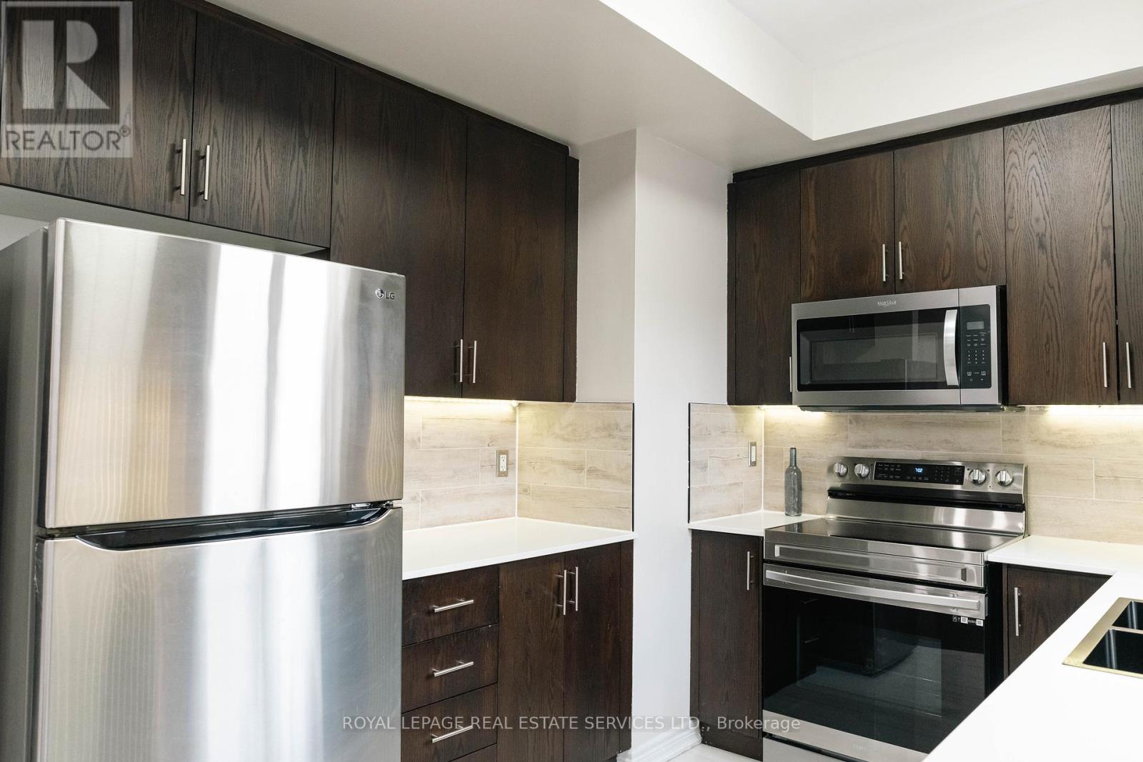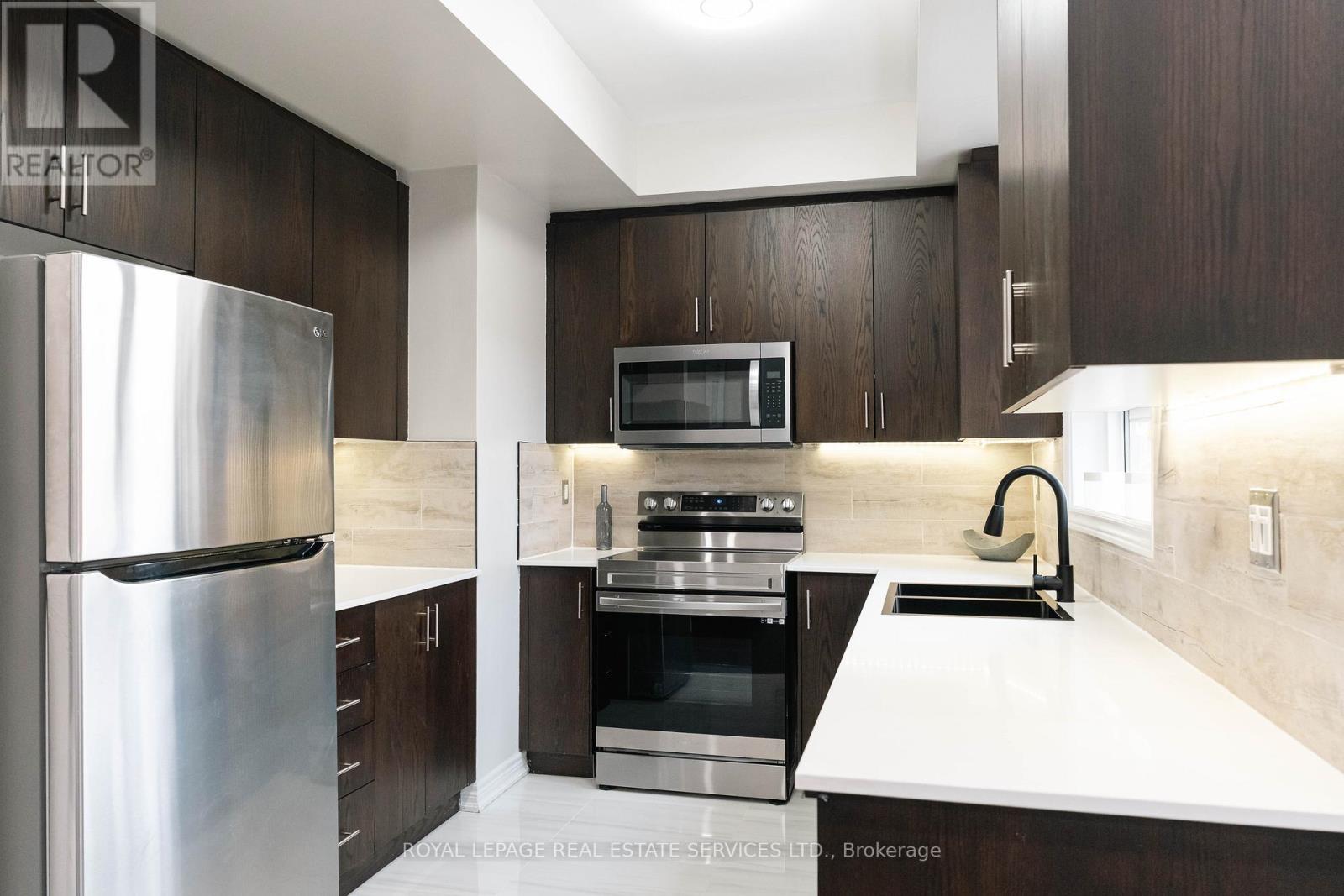 $325.35 MonthlyWelcome to this modern and stunning end unit condo townhome located at 9621 Jane St, Unit 13. This unit offers upscale living in one of Vaughan's most desirable communities. This home is bathed in natural light and showcases elegant dark tones, designer finishes, and new laminate flooring throughout. Featuring two spacious bedrooms and two fully upgraded bathrooms. The home is designed for comfort and style with oversized windows and custom zebra blinds. The gourmet kitchen is a chef's dream, complete with new stainless-steel appliances, quartz countertops, a double in-mount sink, stone backsplash, and ample cabinetry. The open-concept living and dining area boasts soaring ceilings and a walkout to your own private balcony, perfect for entertaining or relaxing. A beautifully stained oak staircase leads to the upper level, where the oversized primary bedroom impresses with 10' ceilings, a second balcony and a full walk-in closet. Additional features include ensuite laundry and generous storage throughout. This is refined townhouse living at its finest. (id:51158)