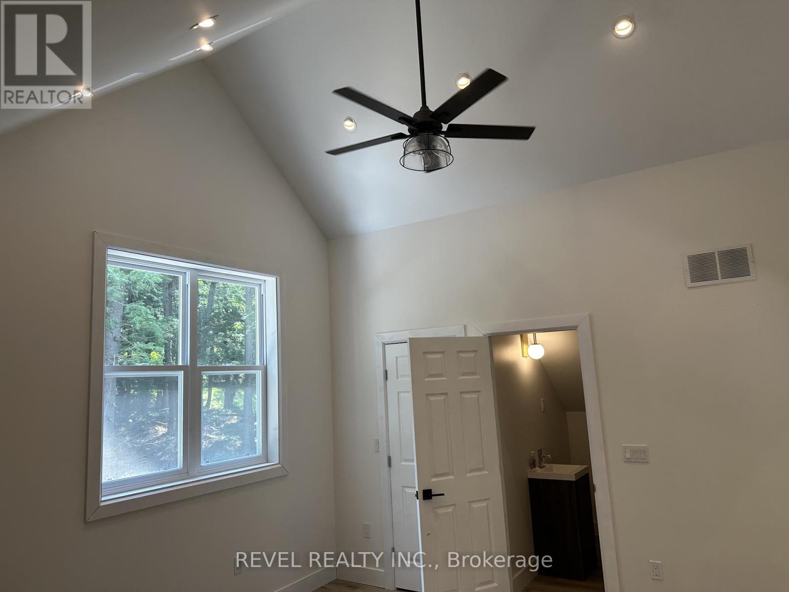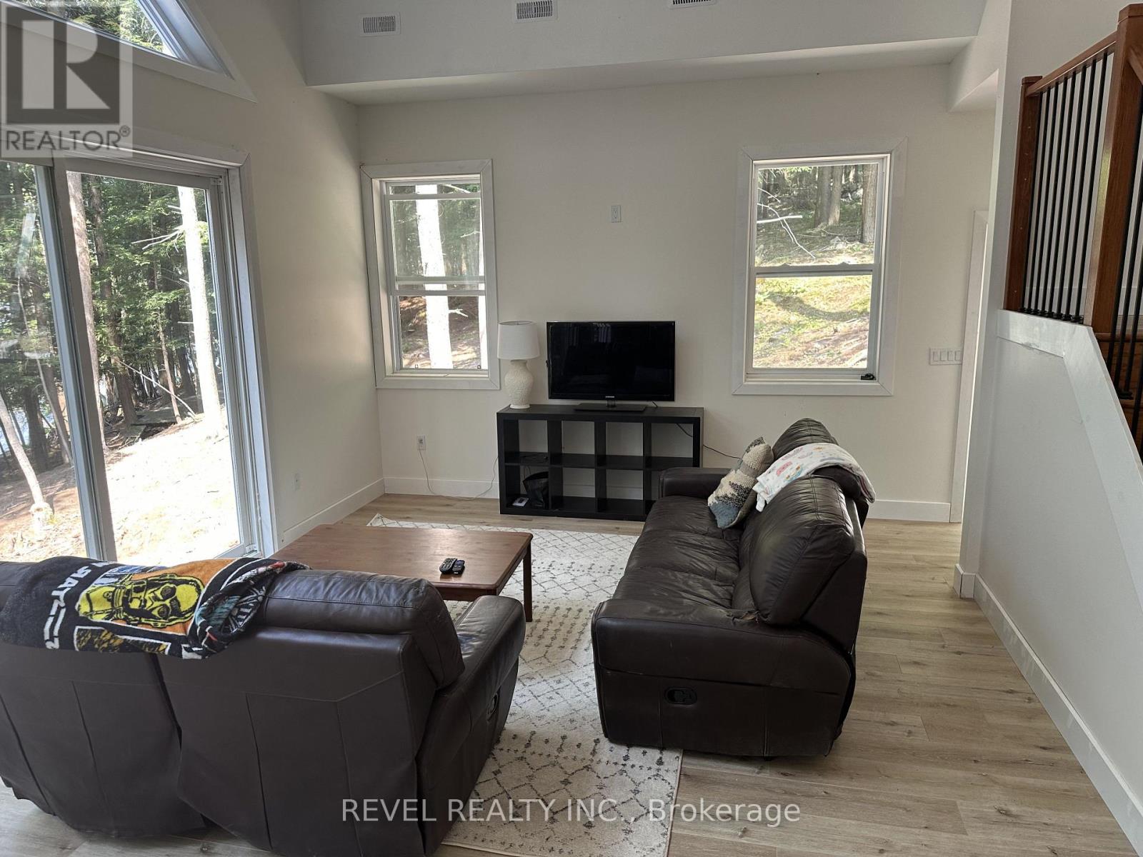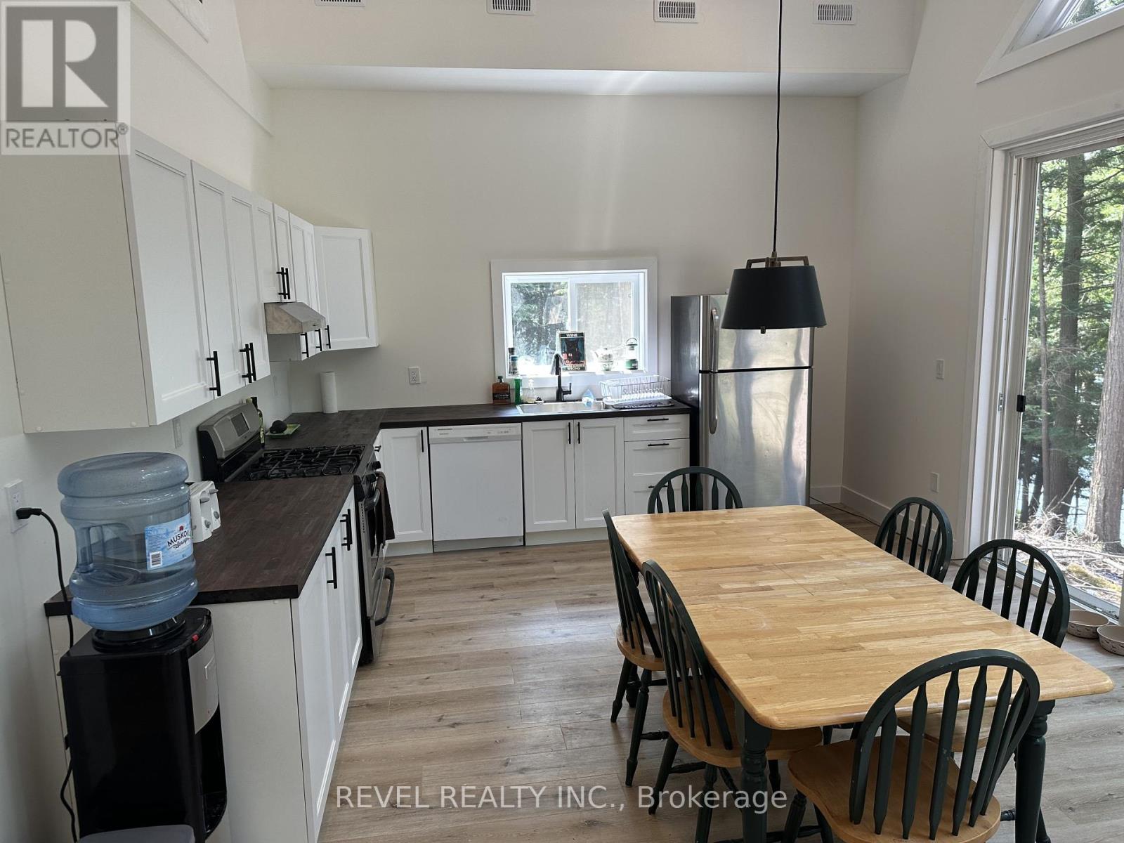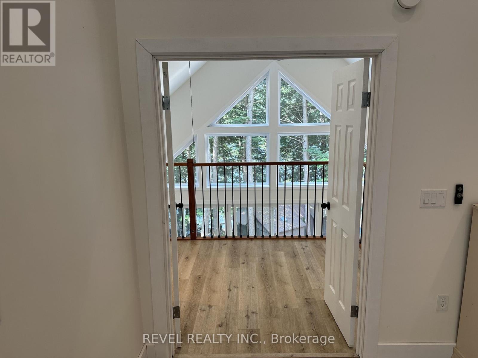 Privacy and seclusion! This stunning custom built cottage will wow you. Sitting atop 11 pristine acres on a laneway with only 3 other cottages and surrounded by forest, it boasts 300+ feet of shoreline where East and West Poverty Bay open up. The main floor consists of a huge great room with vaulted ceilings, gorgeous windows and triple sliding doors overlooking the water. Full kitchen with propane stove, loads of counter and cupboard space and a deep sink. The living room is huge with an eating area as well. Approved plans for a 36x10 foot deck out the front with lumber on site waiting to be built. There's also 2 huge bedrooms that can sleep additional people, a full laundry room setup and a large 4 piece bathroom. Fully spray foamed and with a propane furnace for potential winter use - depending on keeping the laneway plowed. Upstairs boasts an impressive loft space overlooking the great room with full view of the forest and the water. Walk through the double doors into the massive master bedroom, complete with en suite bathroom and large closet. The property also has a full bunkie that can sleep 3 more, plus a screened in kitchenette right by the water. Brand new dock, lake water, this remarkable property is waiting for you to start making family memories, or earn additional income through rental. Book your showing today and find out what true peace and tranquility looks like! (id:51158)