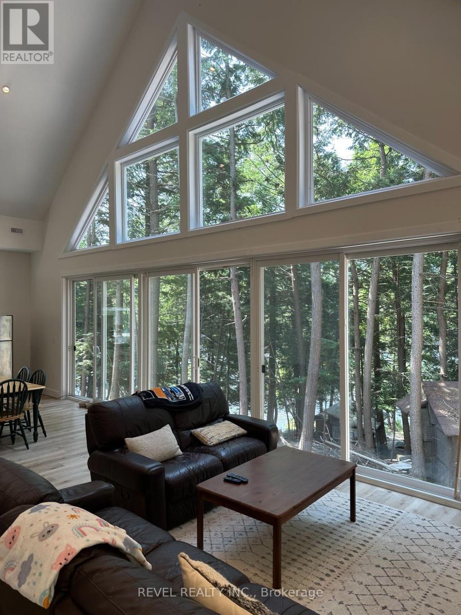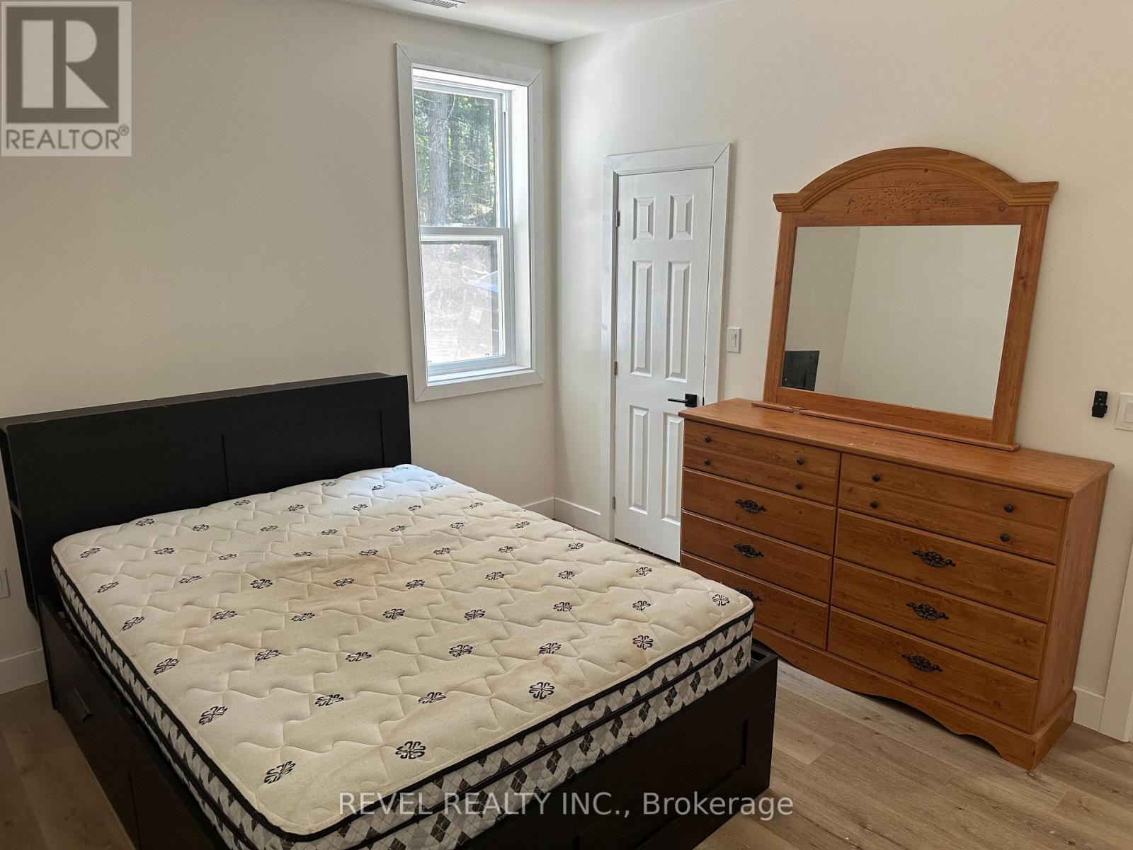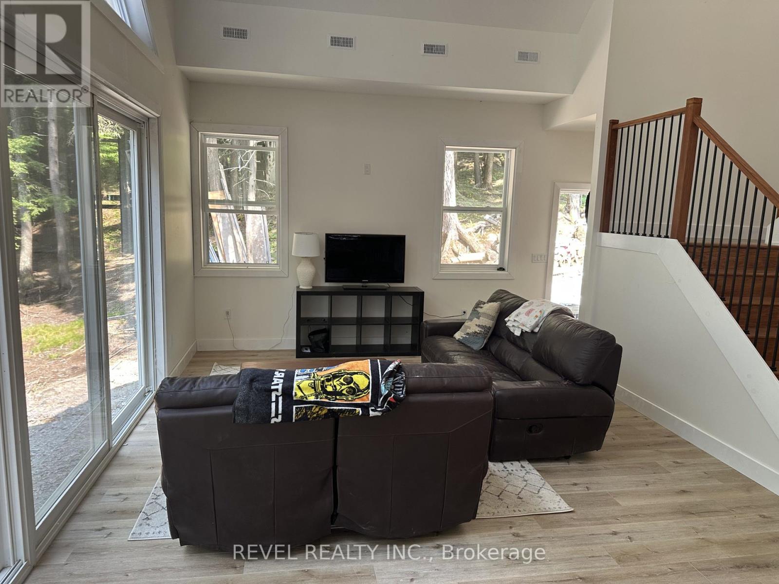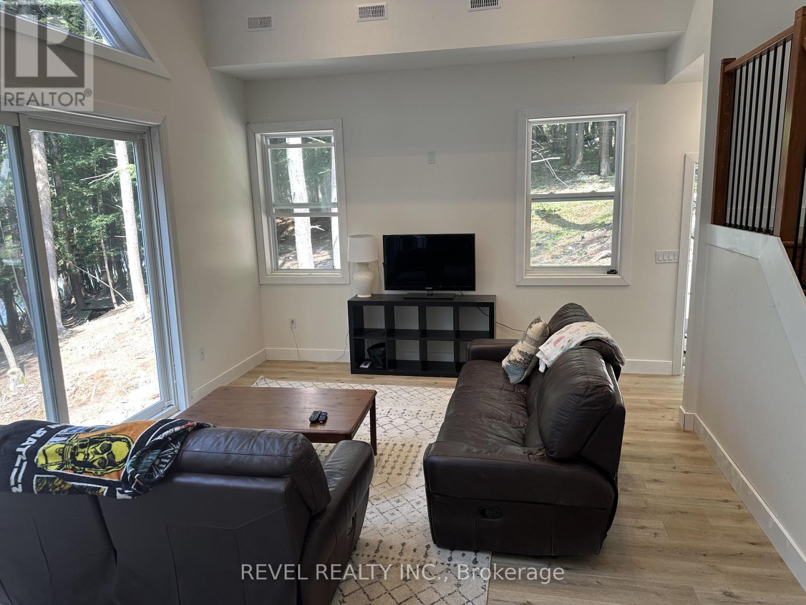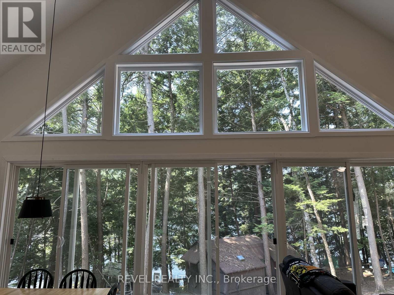 Privacy and seclusion! This stunning custom built cottage will wow you. Sitting atop 11 pristine acres on a laneway with only 3 other cottages and surrounded by forest, it boasts 300+ feet of shoreline where East and West Poverty Bay open up. The main floor consists of a huge great room with vaulted ceilings, gorgeous windows and triple sliding doors overlooking the water. Full kitchen with propane stove, loads of counter and cupboard space and a deep sink. The living room is huge with an eating area as well. Approved plans for a 36x10 foot deck out the front with lumber on site waiting to be built. There's also 2 huge bedrooms that can sleep additional people, a full laundry room setup and a large 4 piece bathroom. Fully spray foamed and with a propane furnace for potential winter use - depending on keeping the laneway plowed. Upstairs boasts an impressive loft space overlooking the great room with full view of the forest and the water. Walk through the double doors into the massive master bedroom, complete with en suite bathroom and large closet. The property also has a full bunkie that can sleep 3 more, plus a screened in kitchenette right by the water. Brand new dock, lake water, this remarkable property is waiting for you to start making family memories, or earn additional income through rental. Book your showing today and find out what true peace and tranquility looks like! (id:51158)