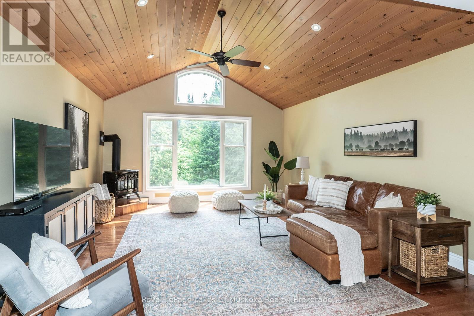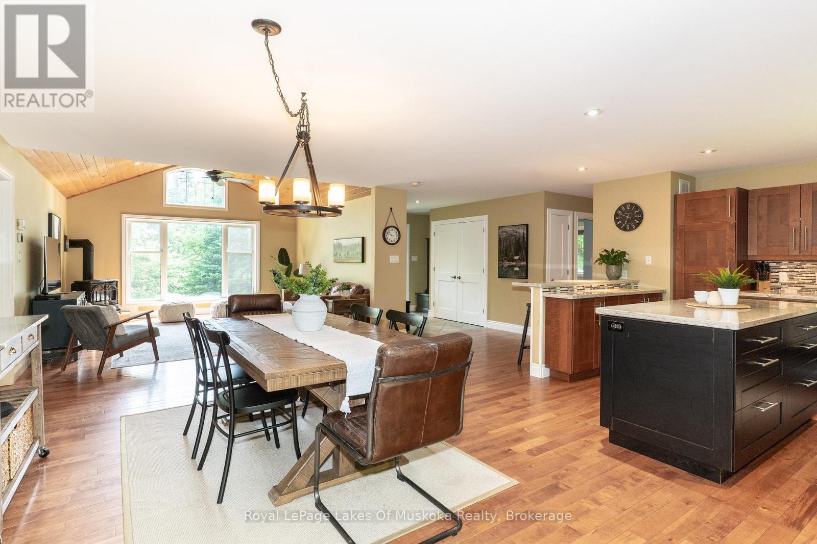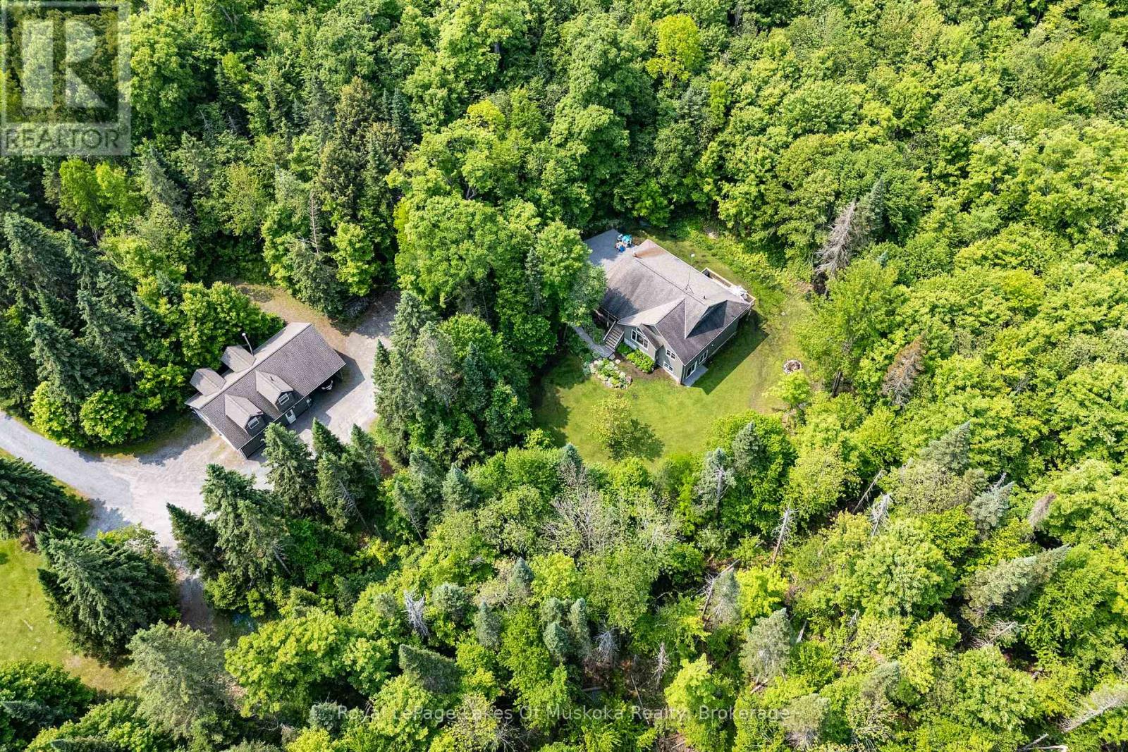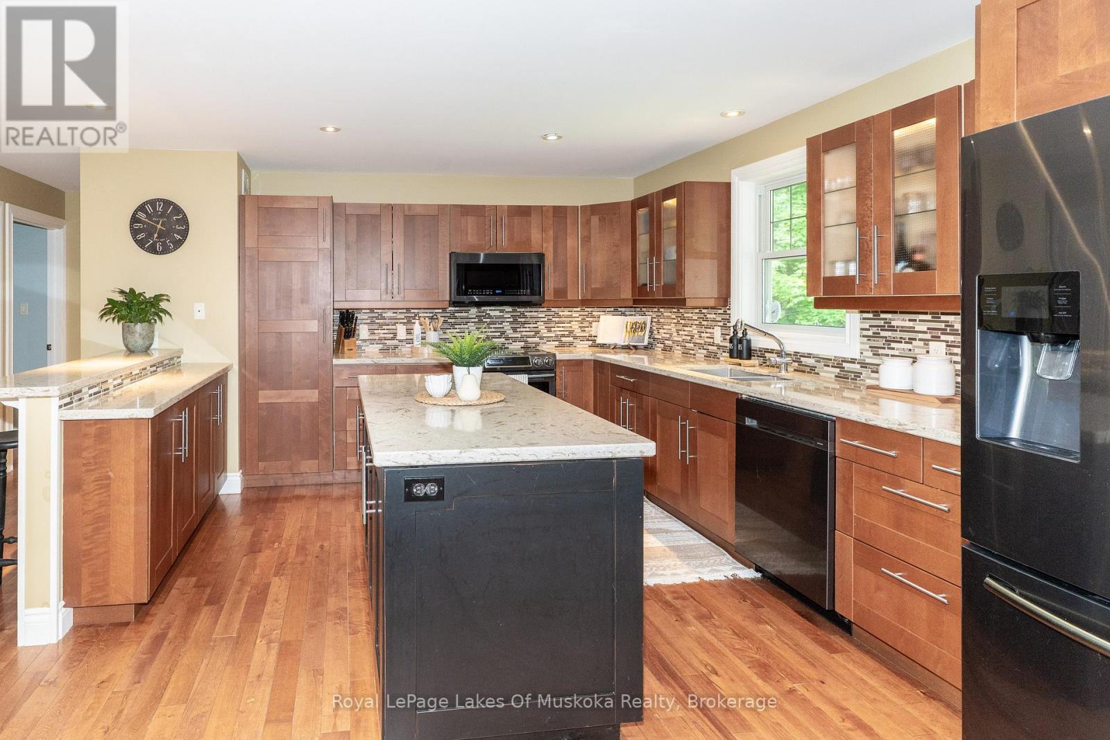 Gorgeous custom built family home centrally located only minutes from Bracebridge, Huntsville or Port Carling in a discrete country setting, offering ultimate privacy! 2.07 acre landscaped lot with the home tastefully positioned away from the year round road backing onto a lovely hardwood forest. Featuring a raised bungalow design with covered front porch, level entrance foyer & sprawling open concept main floor w/hardwood flooring throughout, gorgeous custom kitchen has a large center island, granite countertops & loads of cupboard space + formal dining area w/walkout to private deck, main floor laundry & a bright living room with pine cathedral ceilings, gas fireplace & lots of natural light. 3 main floor bedrooms + 2 full bathrooms including a primary bedroom suite w/walk-in closet & 4pc en-suite bath w/soaker tub & standing shower. Full basement offers a large finished rec room with gas fireplace & walkout, 3pc bathroom, separate den/office, large utility room & separate storage room. Gorgeous landscaped lot with perennial gardens & granite walkway, detached 30' x 32' garage is fully insulated & heated offering a 2nd floor storage space (2nd floor space is currently occupied by renters - Contact the listing agent for additional details on 2nd floor space). 22kw backup generator, drilled well, forced air high eff propane furnace & central air conditioning (new in 2025), located within the Bracebridge School District with bus pickup, OFSC snowmobile trails located just down the road & much more. (id:51158)