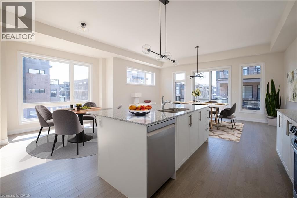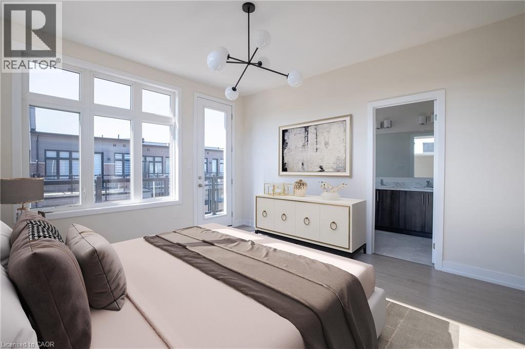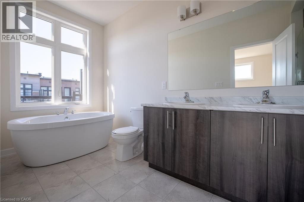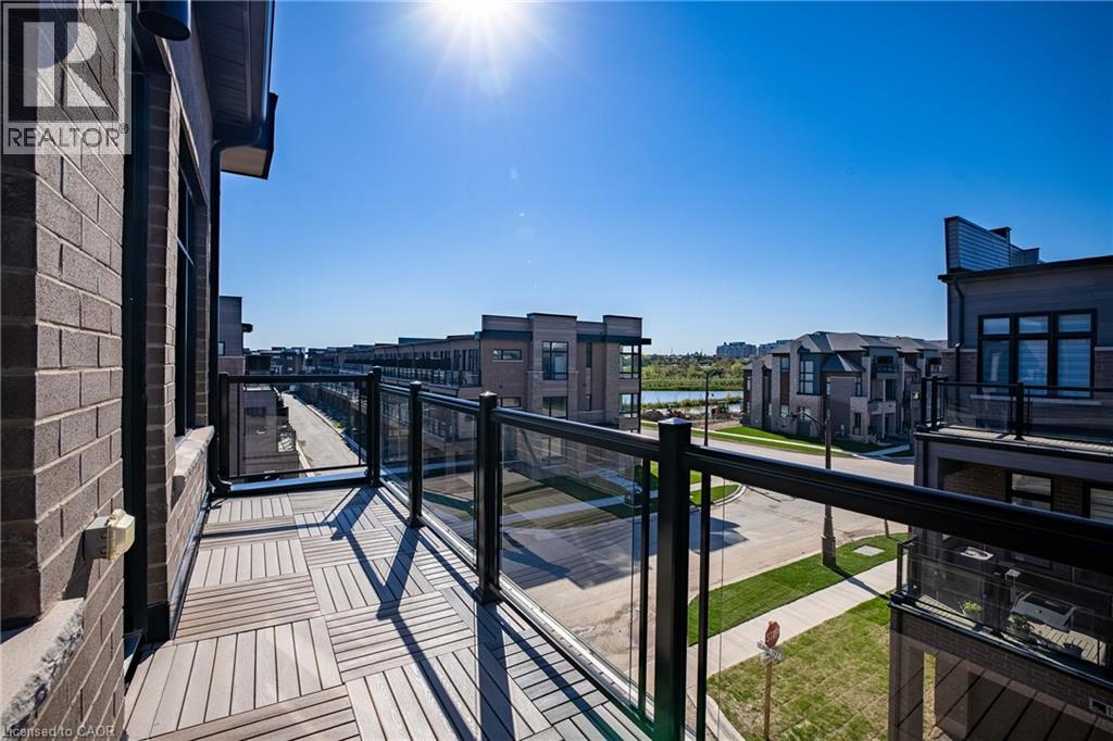 Welcome to Upper Joshua Creek. This modern end unit townhome offers 5 bedrooms, 4 full and 1 half baths, and 2,560 sq ft of finished living space. The ground level opens to a welcoming foyer with a laundry room that has direct garage access, plus a bright corner bedroom with its own three piece ensuite. Hardwood and ceramic tile run throughout the home. The second floor is light filled with an open concept kitchen, dining, and living area under 10 ft ceilings. The kitchen features stainless steel appliances, a centre island, and generous storage. The dining room has a walkout to the balcony for easy indoor to outdoor entertaining, and a powder room completes the level. The primary bedroom includes a private balcony and a 5 piece ensuite with a freestanding deep soaker tub, seamless glass shower, and a double vanity with undermount sinks. Three additional bedrooms and two 4 piece baths provide flexible space for family, guests, or a home office. Minutes to 403, QEW, and 407, and close to parks, trails, shops, and well regarded schools. (id:51158)