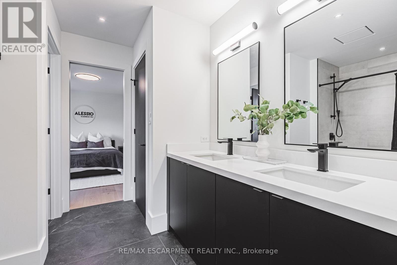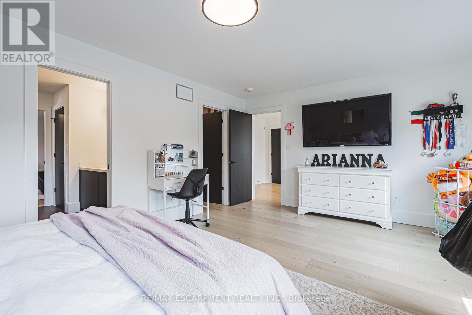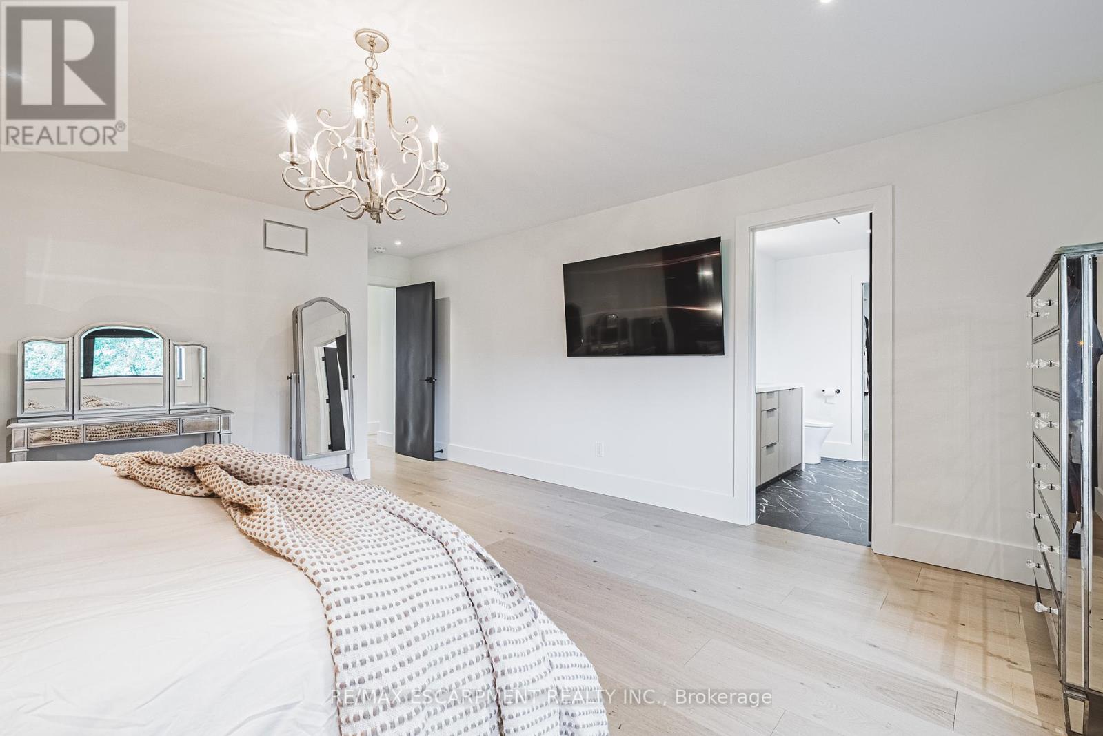 Custom, all brick, 2024 new build masterpiece sitting on a gorgeous lot backing onto mature greenery, and boasting a stately-modern presence from the road. Prestigious street lined with other custom homes. Prepare to be memorized by soaring ceiling in foyer open to above with breathtaking chandelier and open riser, white oak staircase with rod iron spindles. Perfect main level design with dining/living room separated by two sided fireplace. Family room overlooking private backyard with massive high end aluminum windows that continue through out the home. Tasteful black kitchen features chic flat panels and undermount lighting and is accentuated with high-end appliances, quartz countertops and massive island with ample storage on both sides. Gorgeous LED lighting in ceiling gives a modern presence. Second floor is well equipped with four generous size bedrooms each featuring their own walk in closets. Master bedroom boasts luxurious ensuite with glass shower, soaker tub, double sink with high end faucets and walks through to a dream closet with custom built ins and ideal design. Second bath is a jack and fill being shared by two of the four bedrooms. All bedrooms are blanketed in stunning hardwood floors and boast light drenched windows giving a lively presence. Open staircase also leads to basement featuring 9 foot ceilings and oversized basement windows. Paved four car driveway and premium garage doors complete this homes curb appeal. This home is minutes to arterial infrastructure and all amenities. Luxury Certified. (id:51158)