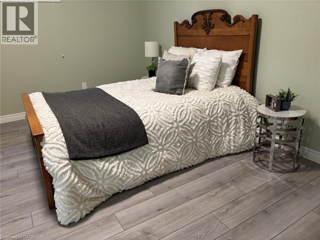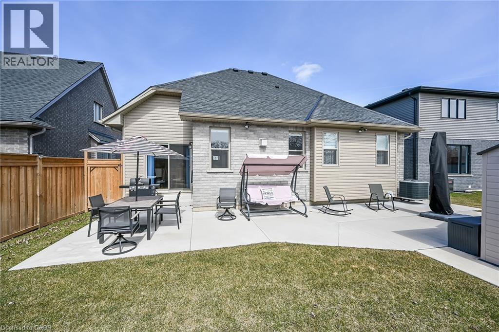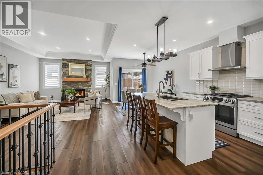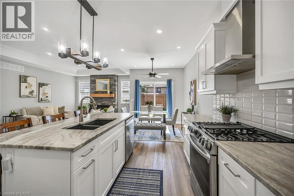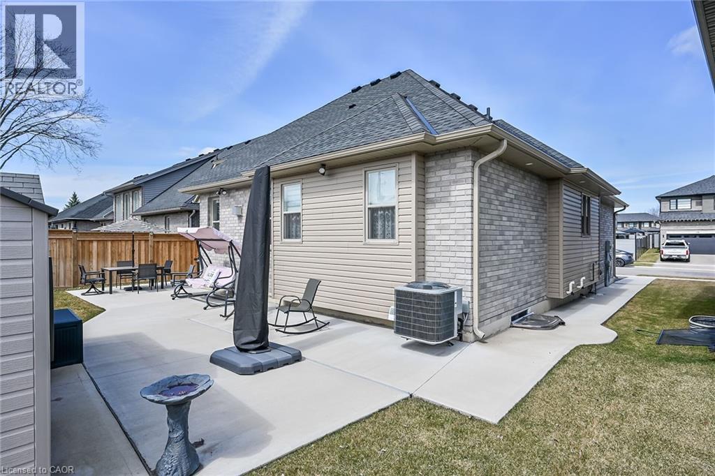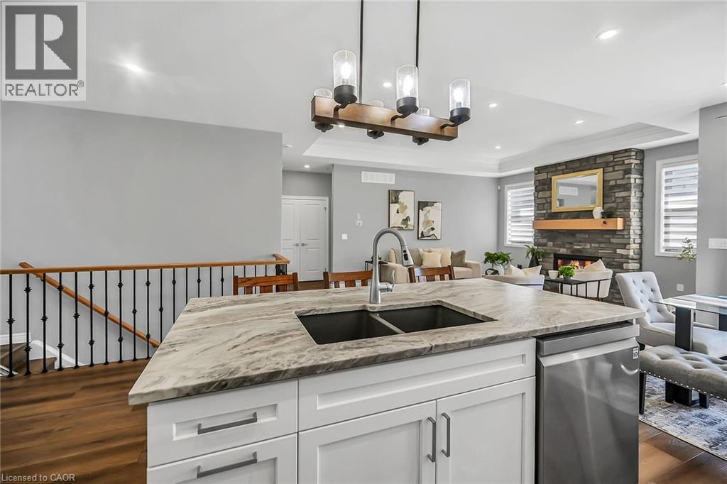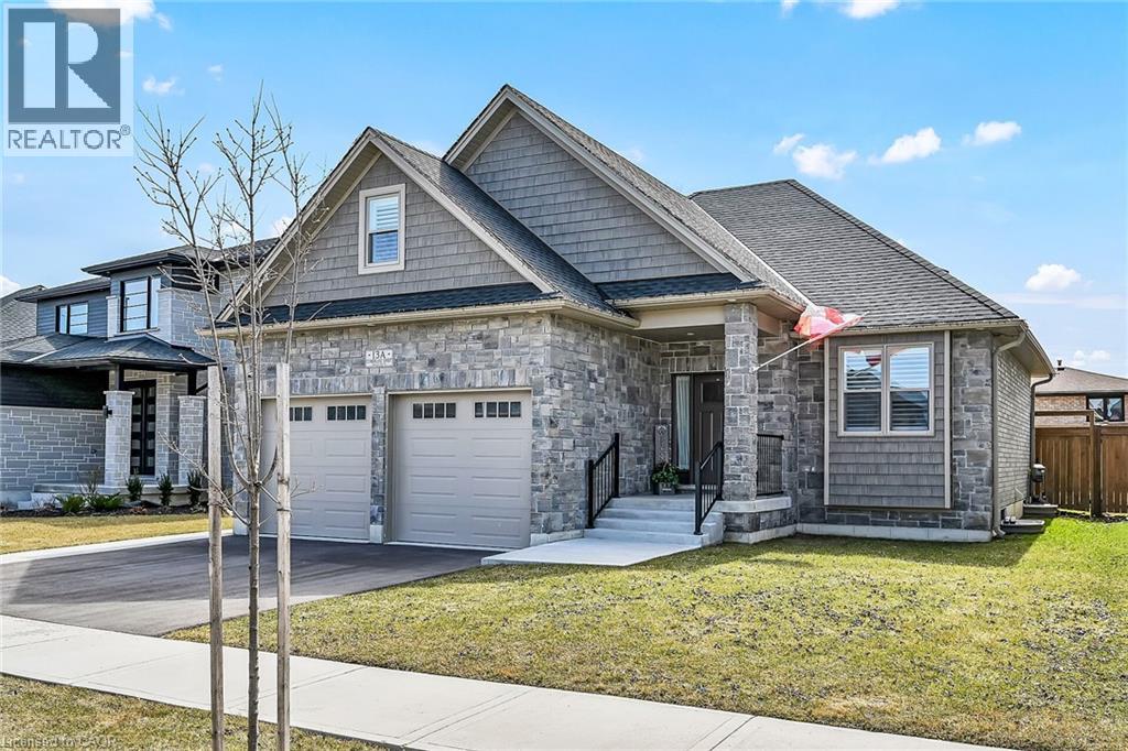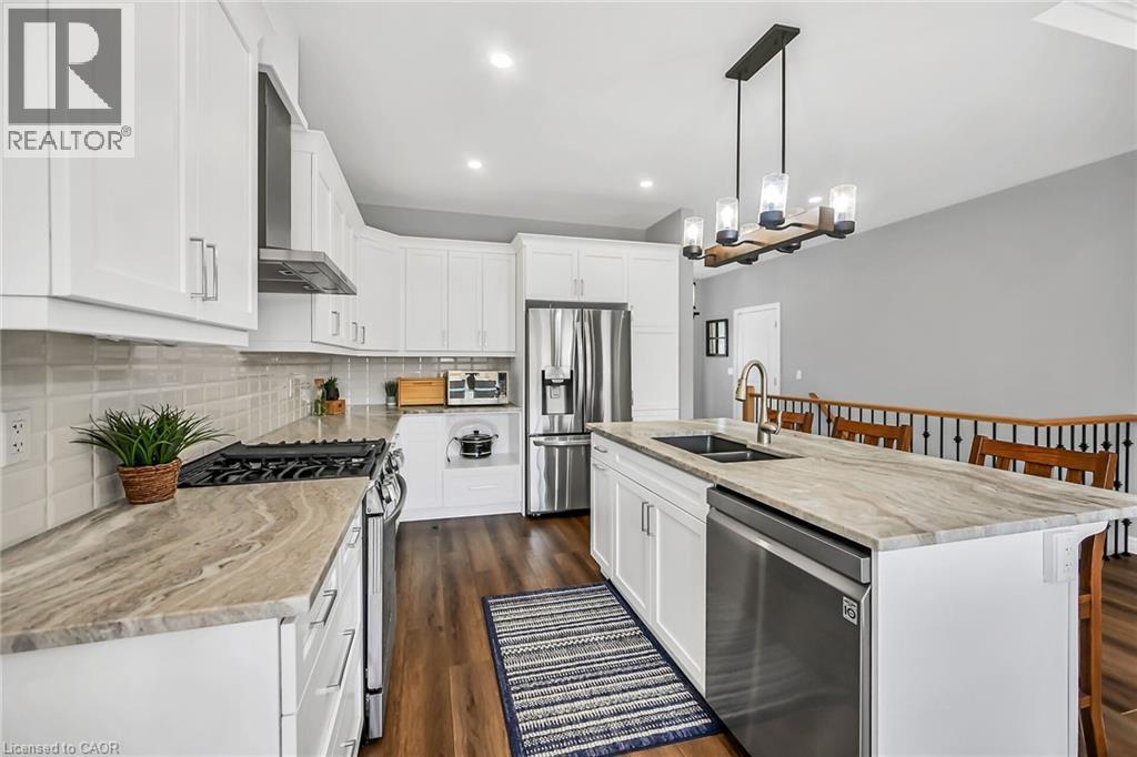 Looking for a newer bungalow with loft? This beauty has all the bells and whistles - even a separate entrance for a possible in-law or rental unit in the basement! Built in 2021 by quality reputable builder, the home offers almost 1600 square feet above grade plus finished basement, 2+2 bedrooms, 3 bathrooms, and high ceilings through out! Open concept main living area features modern white kitchen with stainless steel appliances (all LG under warranty), leathered quartz counter tops, work island/breakfast bar and pot lighting. Living room with cozy natural gas fireplace in a stone hearth, and dining area featuring a patio door walk out to back yard. Primary bedroom on the main offers a 4 pc ensuite bath with gorgeous soaker tub and glass walk in shower, plus his and hers oversized closets. Upstairs is a loft space perfect for a craft room/den/office or an extra bedroom. The fully finished lower level (finished by the builder) includes 2 more bedrooms, a full bath, family room and lots of storage, plus bonus staircase that leads into the two car garage. Lots of money spent here on extras including california shutters and zebra blinds (lifetime warranty), outdoor sprinkler system, security system, massive concrete patio across the back of the house with BBQ hook-up, quaint garden shed, fence, exterior lighting and more! Parking for two cars on the asphalt driveway, plus 2 spots in the garage. Exterior is stone, brick and vinyl, heated by natural gas furnace, plus central air - everything only 3 years old. Still under Tarion Warranty! No maintenance worries for years to come! (id:51158)