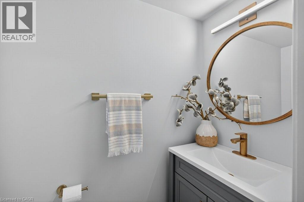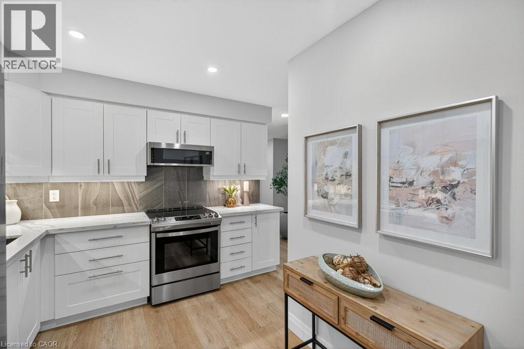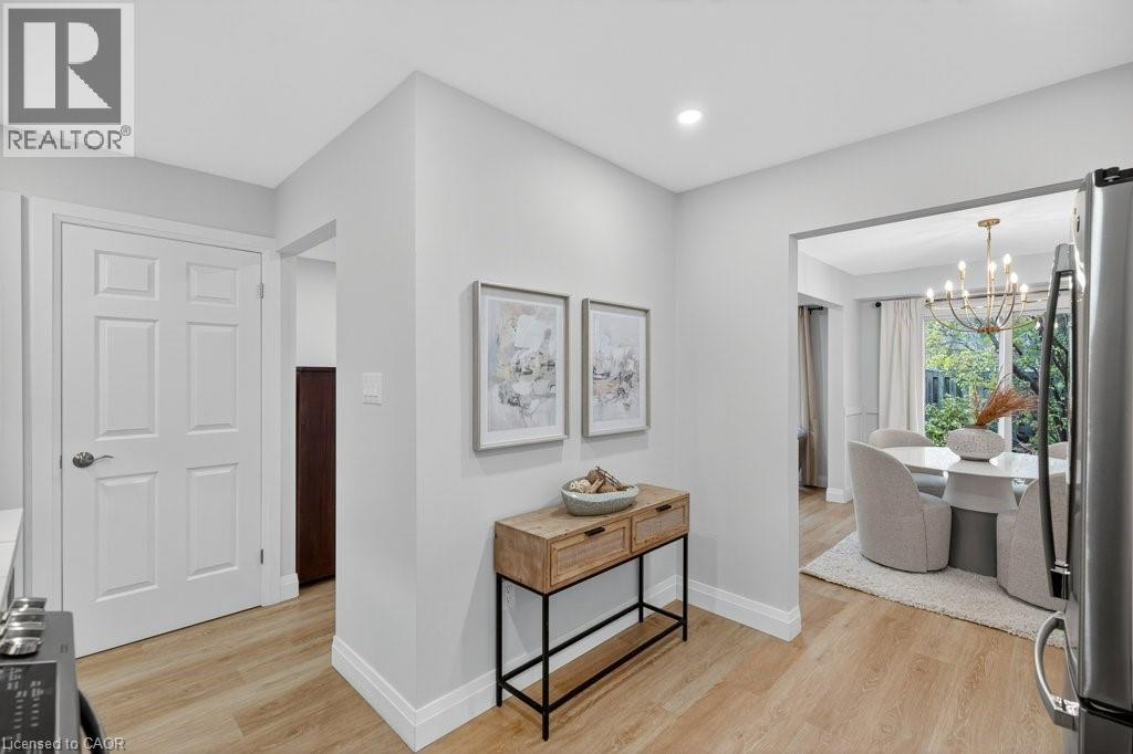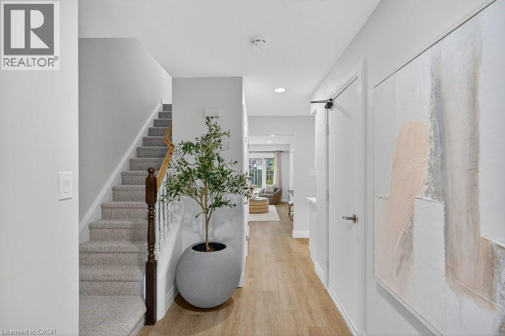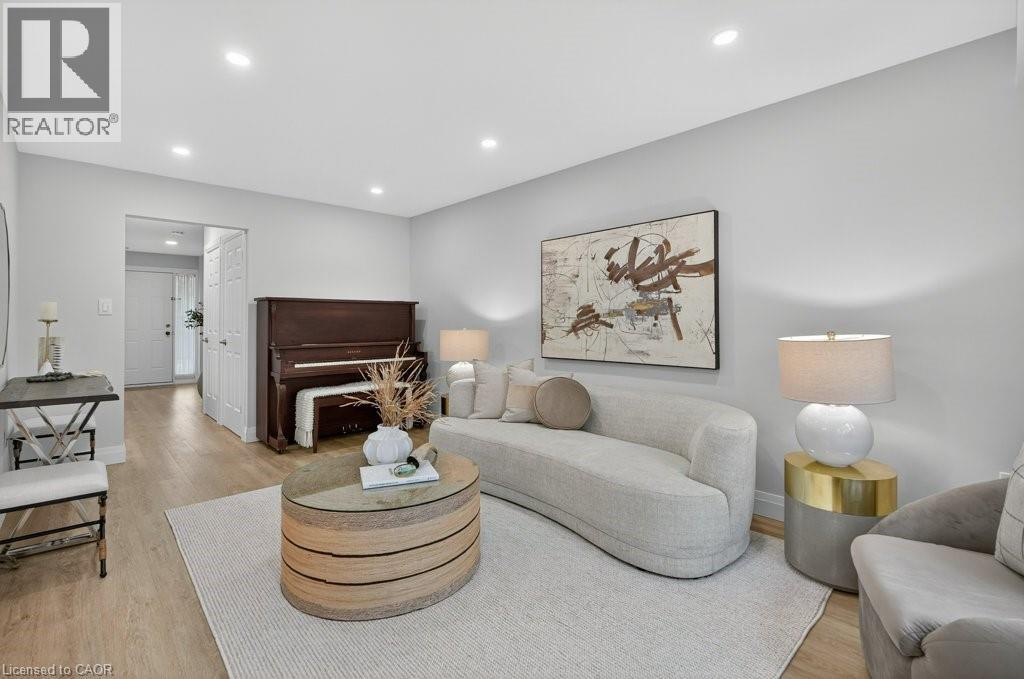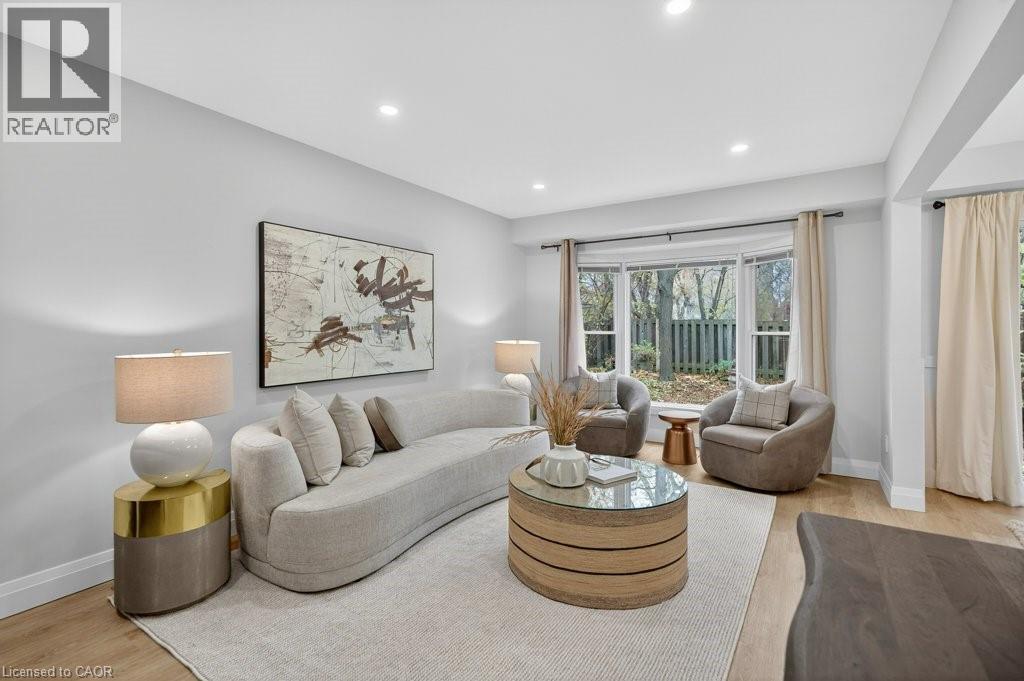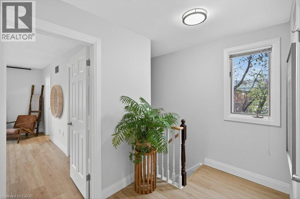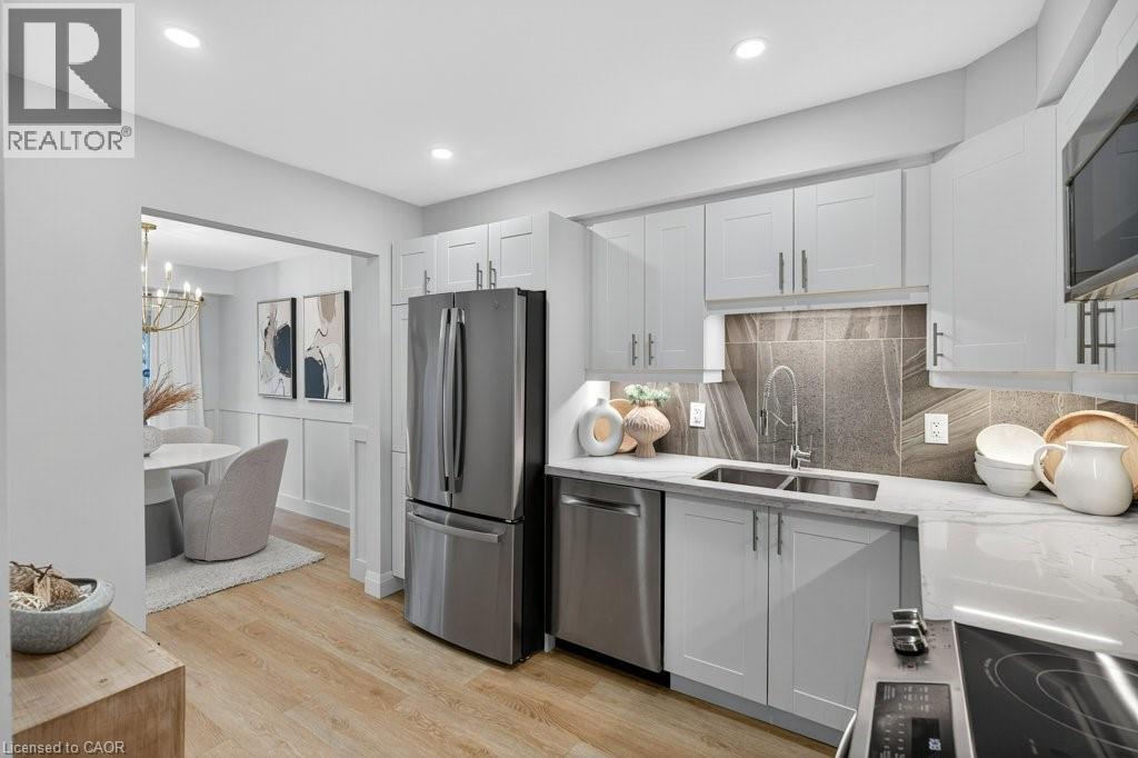 This beautifully renovated 3-bedroom, 4-bath end-unit townhome offers the perfect blend of style, space and low-maintenance living in a quiet small enclave of homes. Step inside and you’ll immediately appreciate the attention to detail throughout. Completely renovated from top to bottom, this home features all the finishes and design choices you love. The updated kitchen is loaded with cupboard space and showcases quartz countertops and stainless steel appliances. The main floor offers updated flooring, pot lights, and an ideal layout that flows seamlessly from the large family room with a newer bay window to the dining area highlighted by elegant wall mouldings, a stunning light fixture, and a walkout to your private backyard.Upstairs, natural light fills the home thanks to an extra side window exclusive to an end unit. The spacious primary bedroom features an oversized window and a beautifully updated ensuite with a walk-in shower and double sinks. Two additional bedrooms offer flexibility, one even includes a charming balcony overlooking the backyard. The main bathroom on this level has also been stylishly updated.The finished lower level adds even more living space with updated flooring and a 3-piece bathroom, perfect for all of your growing needs. The true standout is the private backyard, a rare find for a townhome. With no neighbours beside or behind, this end unit offers an extra-wide yard surrounded by mature trees, providing a greater sense of privacy and openness, ideal for relaxing, entertaining, or letting kids play freely. Enjoy easy, maintenance-free living with snow removal and exterior upkeep are all taken care of for you. Located close to parks, schools, trails, shopping, and transit, this home provides convenient access to everything the Hamilton Mountain has to offer, with quick connections to the LINC and downtown. (id:51158)