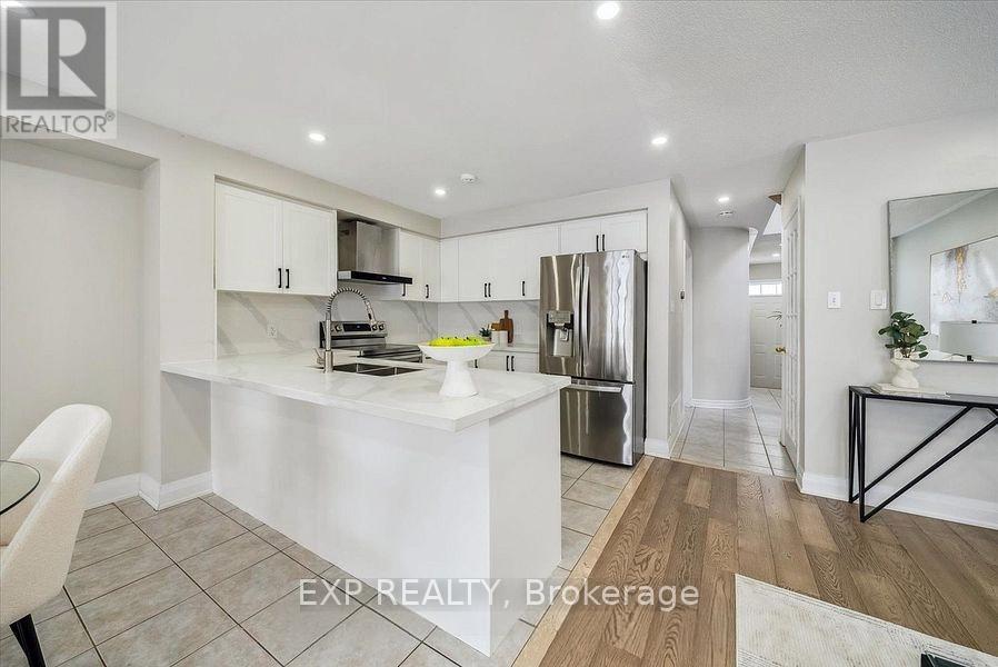 Bright and modern freehold end-unit townhome on a quiet court in North Whitby. Featuring 3+1 bedrooms, 3 bathrooms, open-concept main floor with hardwood floors and pot lights, and a newly upgraded kitchen with quartz countertops, modern cabinetry, backsplash, and stainless steel appliances. Main-floor laundry with garage access. Walkout to a large deck and private fenced backyard. Finished basement with rec room and storage. Freshly painted and move-in ready with recent updates including roof, garage door, central air, and new washer/dryer. Prime location close to Hwy 401/407, shopping, parks, schools, and all amenities. (id:51158)