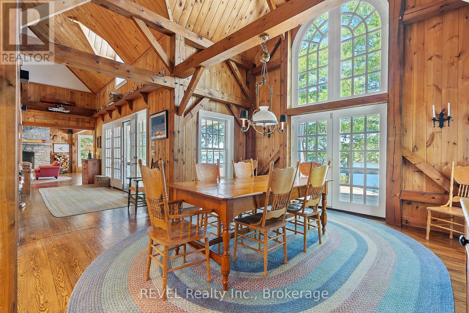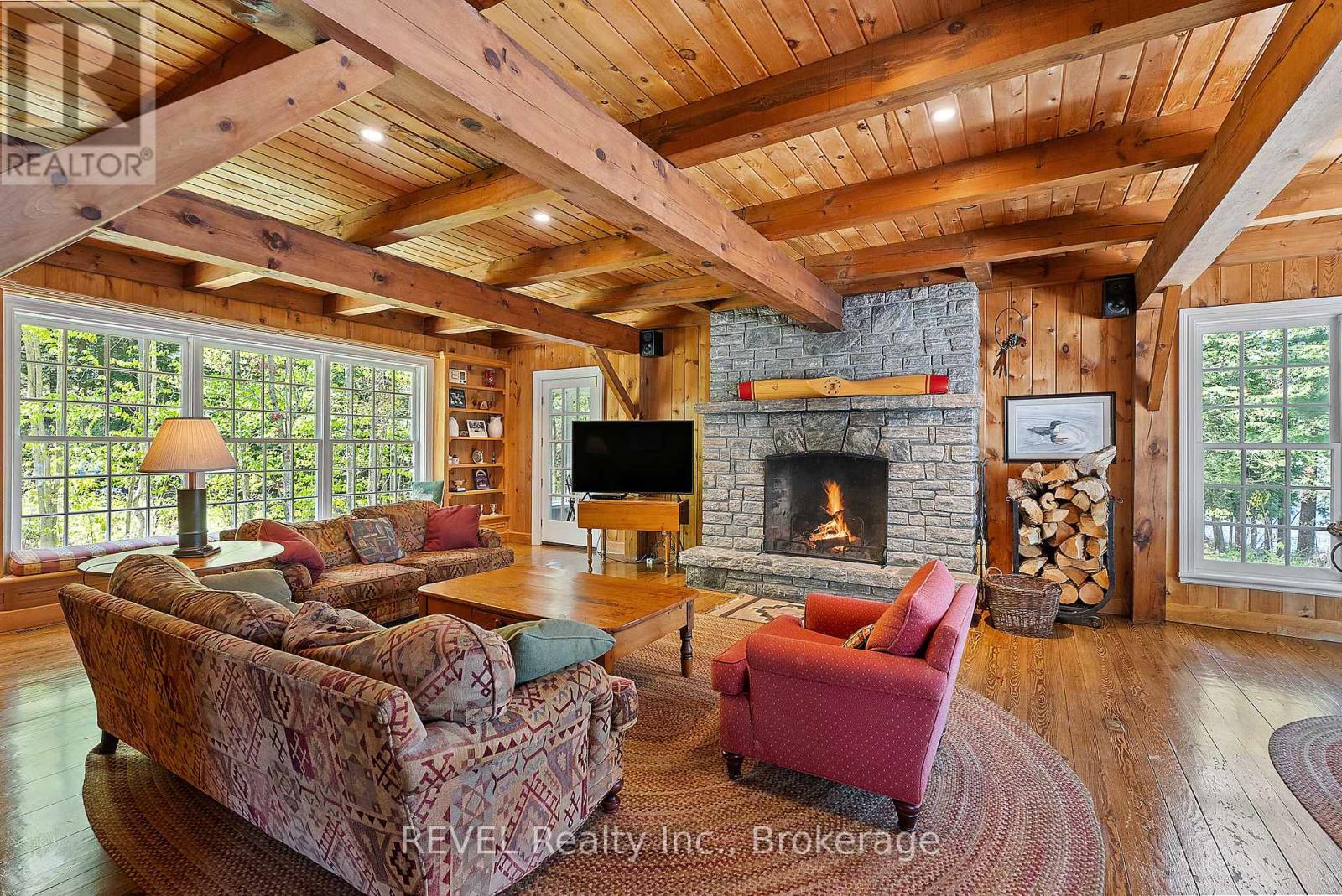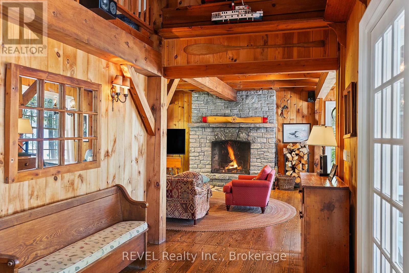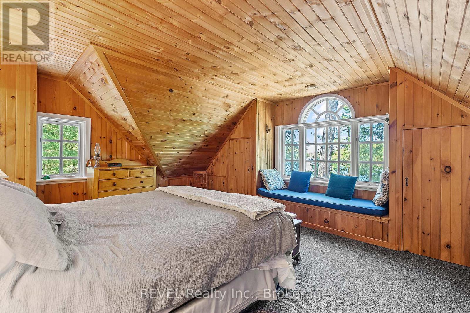 A rare opportunity to own a timeless 4.5-acre estate with 1,160 ft of pristine, level frontage in the coveted Beaumaris corridor. This private four-season retreat offers unmatched tranquility, with walking paths, towering pines, and open meadows - perfect for families of all ages.Nestled away from the main boat channel, the property enjoys exceptional privacy and features a beautiful sandy cove, oversized swim dock, and panoramic island-dotted views. The current cottage and boathouse are ideally sited, offering potential to sever a large parcel without sacrificing privacy. Built by renowned Elmo Starr, the 5-bed cottage showcases vaulted ceilings, post-and-beam detailing, gleaming wood floors, and expansive windows that fill the space with natural light. Enjoy both formal and informal living areas, a Muskoka room, and a large unfinished basement ready for a gym, theatre, or rec room.The grandfathered boathouse is a true gem, with 3 boat slips and 1,100 sq ft of living space above - complete with 3 bedrooms, kitchen, bath, living/dining, and covered porch, ideal for guests or multi-generational stays.With space for 10 boats, west wind protection, and close proximity to Bala, Port Carling, and Bracebridge, this rare offering blends location, lifestyle, and limitless potential. Build your dream compound or enjoy it as-is: this is Muskoka living at its finest. (id:51158)