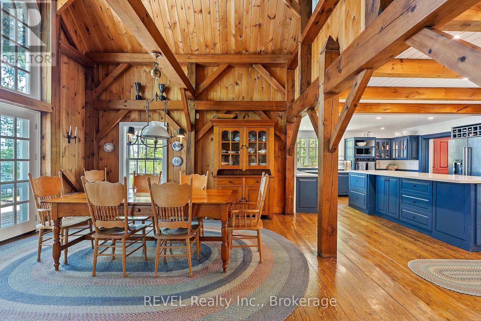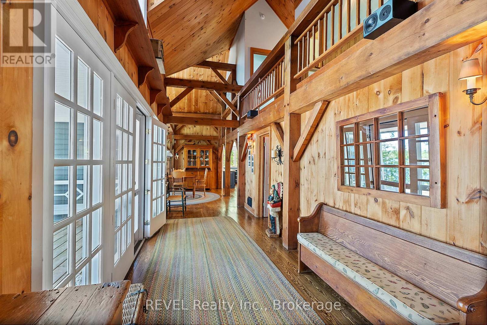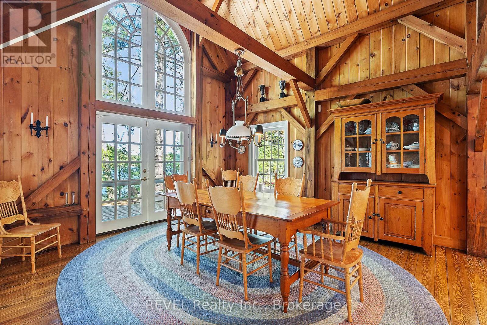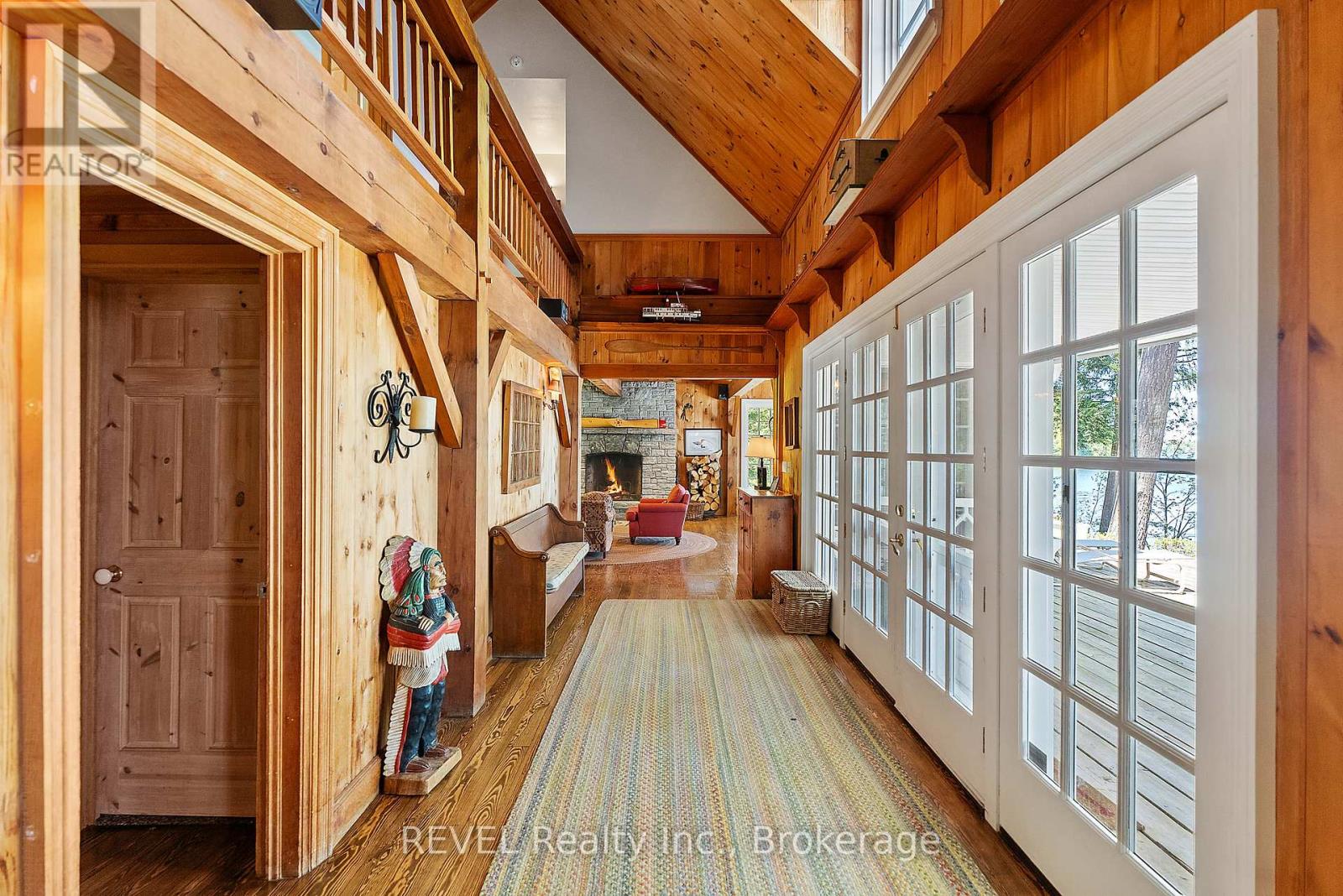 A rare opportunity to own a timeless 4.5-acre estate with 1,160 ft of pristine, level frontage in the coveted Beaumaris corridor. This private four-season retreat offers unmatched tranquility, with walking paths, towering pines, and open meadows - perfect for families of all ages.Nestled away from the main boat channel, the property enjoys exceptional privacy and features a beautiful sandy cove, oversized swim dock, and panoramic island-dotted views. The current cottage and boathouse are ideally sited, offering potential to sever a large parcel without sacrificing privacy. Built by renowned Elmo Starr, the 5-bed cottage showcases vaulted ceilings, post-and-beam detailing, gleaming wood floors, and expansive windows that fill the space with natural light. Enjoy both formal and informal living areas, a Muskoka room, and a large unfinished basement ready for a gym, theatre, or rec room.The grandfathered boathouse is a true gem, with 3 boat slips and 1,100 sq ft of living space above - complete with 3 bedrooms, kitchen, bath, living/dining, and covered porch, ideal for guests or multi-generational stays.With space for 10 boats, west wind protection, and close proximity to Bala, Port Carling, and Bracebridge, this rare offering blends location, lifestyle, and limitless potential. Build your dream compound or enjoy it as-is: this is Muskoka living at its finest. (id:51158)