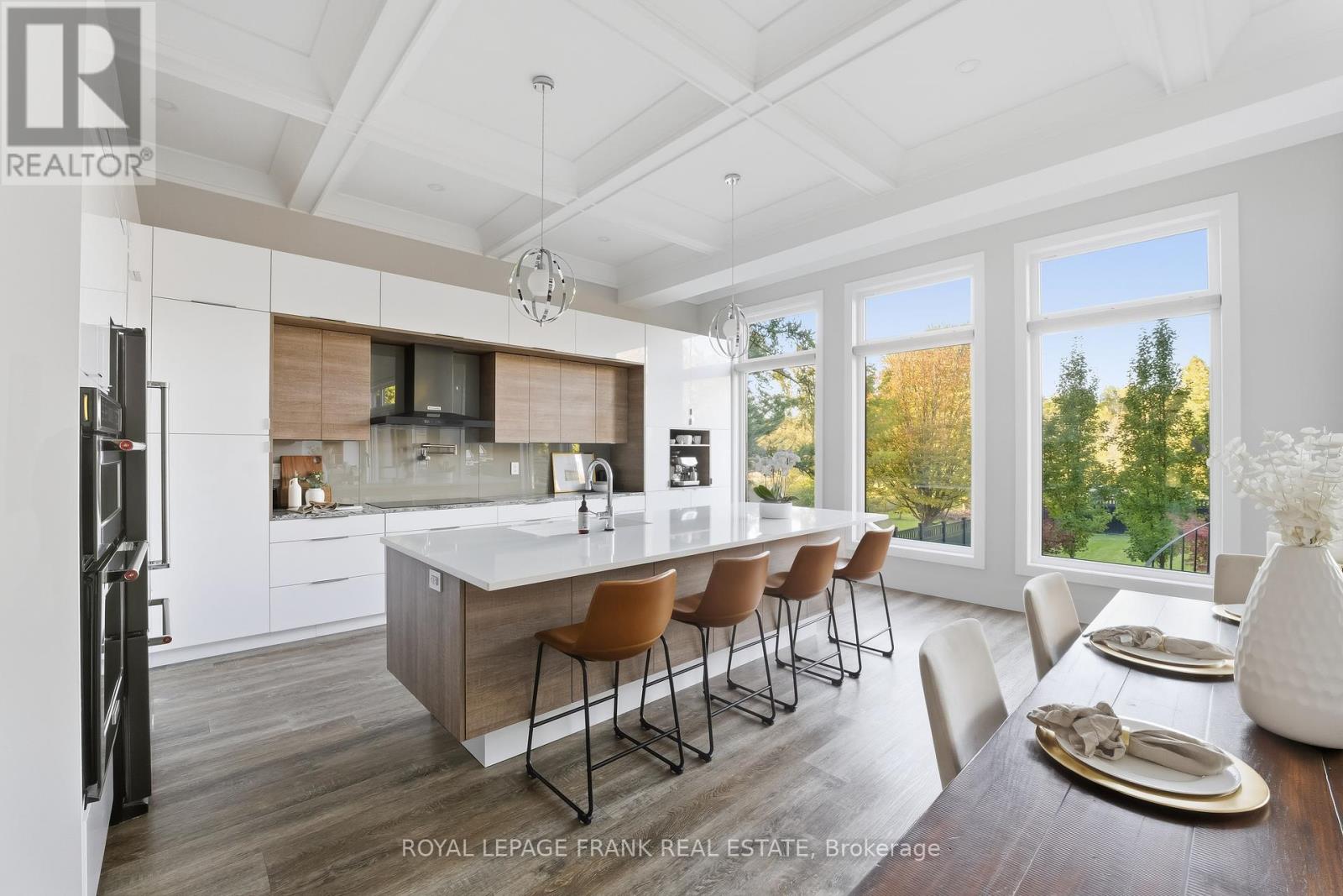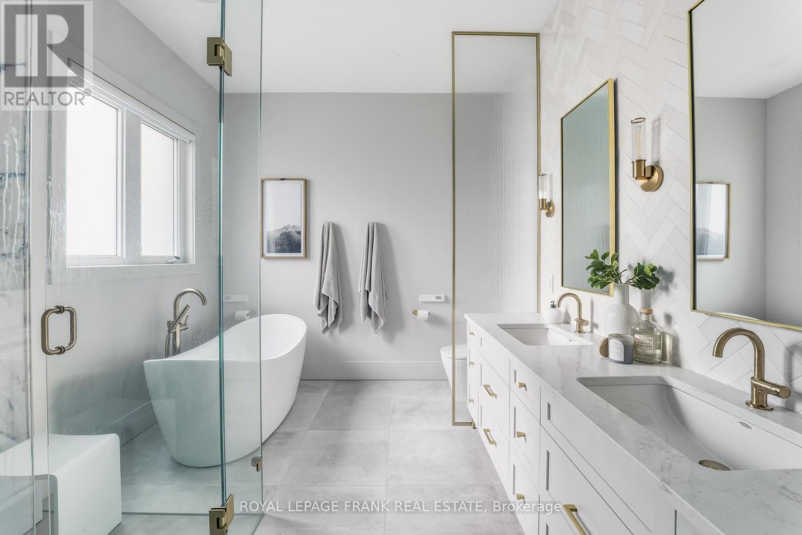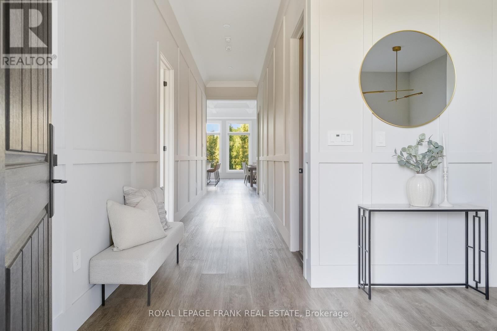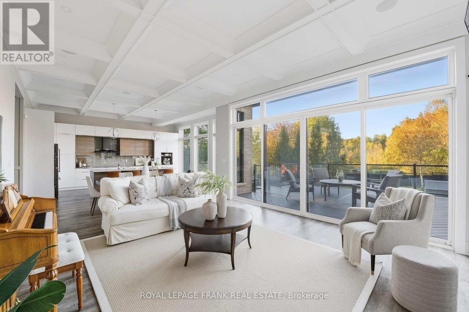 Welcome to an extraordinary custom-built estate offering over 4,000 square feet of luxurious living space on a meticulously landscaped 1.35-acre lot. Originally built in 2018 and enhanced with hundreds of thousands in recent high-end renovations, this home is a flawless blend of sophistication, comfort, and modern design. From the moment you arrive, you'll be captivated by the grand covered porch, new fluted glass entryway, and stunning curb appeal. Inside, soaring vaulted and coffered ceilings, detailed crown moulding, and expansive floor-to-ceiling windows fill the home with light and elegance. The main floor showcases a modern luxury kitchen complete with a massive center island, wall oven, cooktop, pot filler, and coffee bar, all overlooking the serene, private backyard and greenspace beyond. The open-concept living area features a gas fireplace surrounded by custom built-ins and integrated speakers, perfect for entertaining or relaxing. Two main-floor primary sites each offer walk-in closets and spa-like en-suites, with the main primary featuring built-in cabinetry, a lavish dressing room, and a magazine-worthy 5-piece ensuite with heated floors and a built-in speaker system. The windows, a four-piece bathroom with heated floors, a theatre room with surround sound and entertainment zones with beautifully landscaped patio featuring a built-in gas fireplace and heated spa pool with waterfall, a putting green, and a grass area enclosed by a high-quality vinyl fence (+/-$70K). Beyond the fenced area is an extra-wide green space with forest. Additional highlights include a luxury laundry/mudroom with quartz counters and custom cabinetry, indoor/outdoor speakers, 200-amp electrical, HRV humidifier, security system with cameras, and a tankless water heater. Conveniently located near all amenities and highways with easy access to Toronto and the airport, this exceptional property offers the perfect balance of luxury, privacy, and convenience. (id:51158)