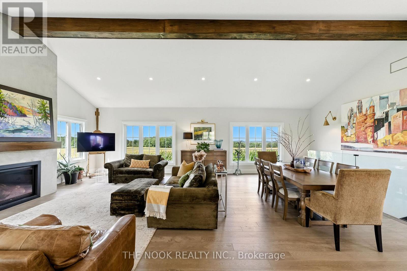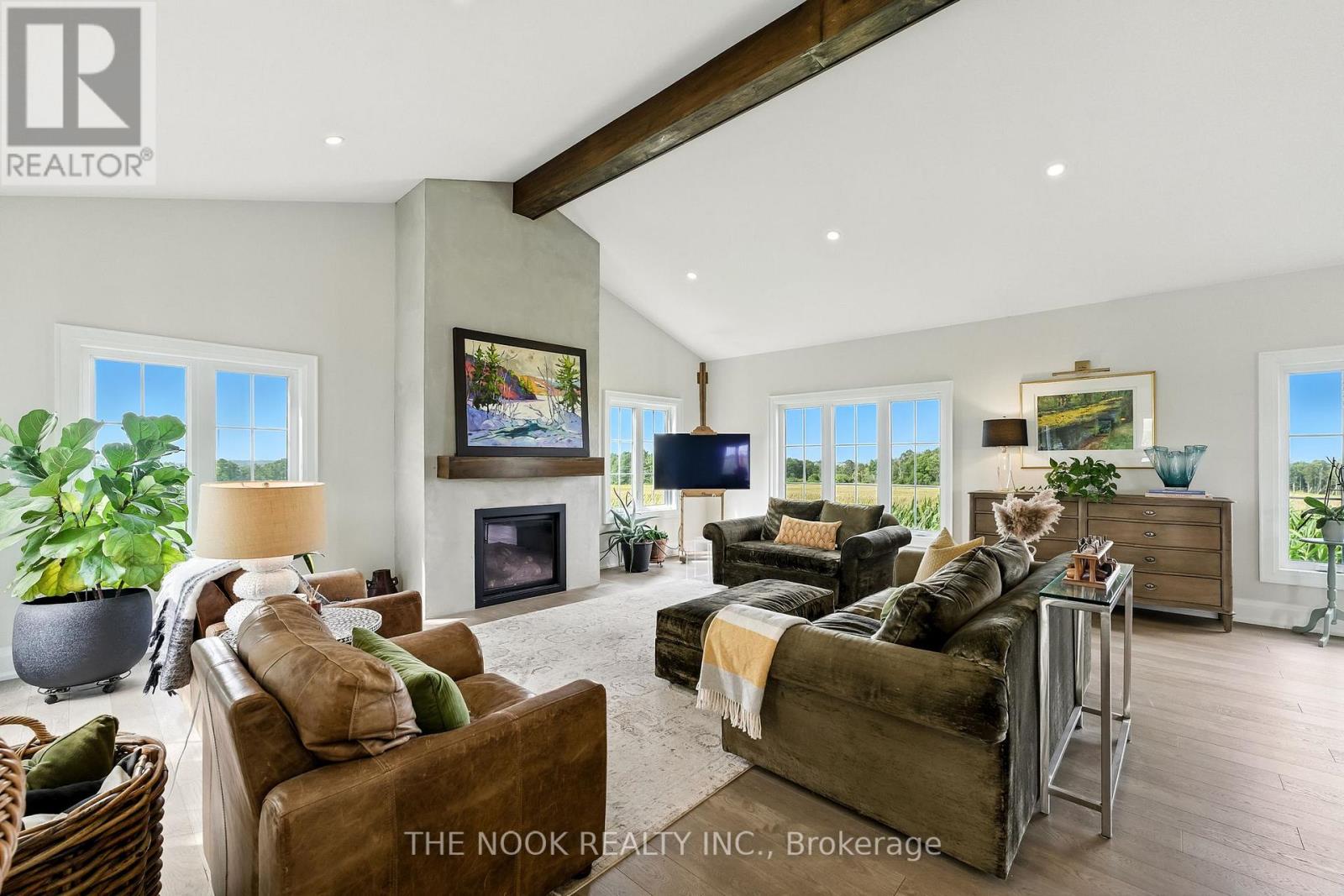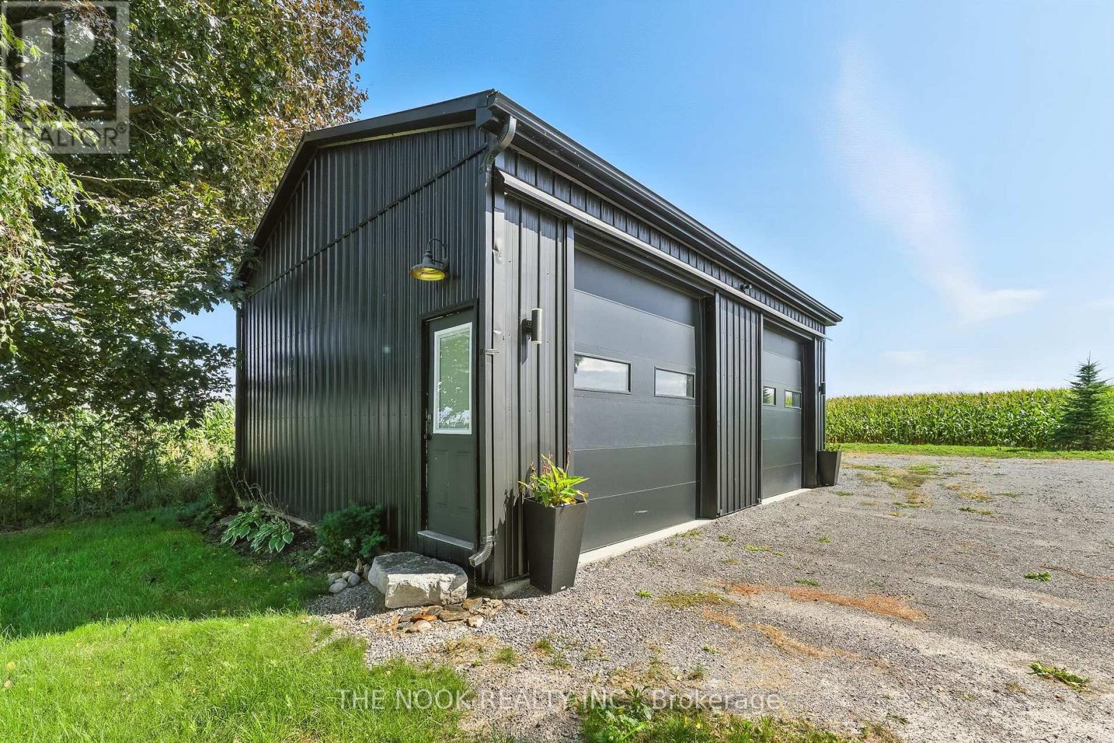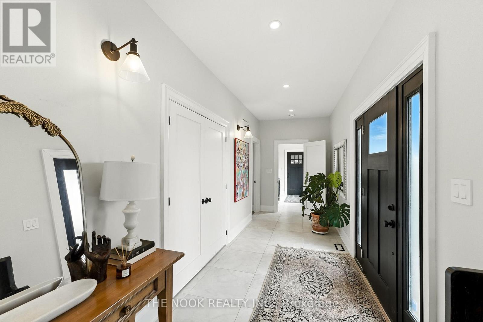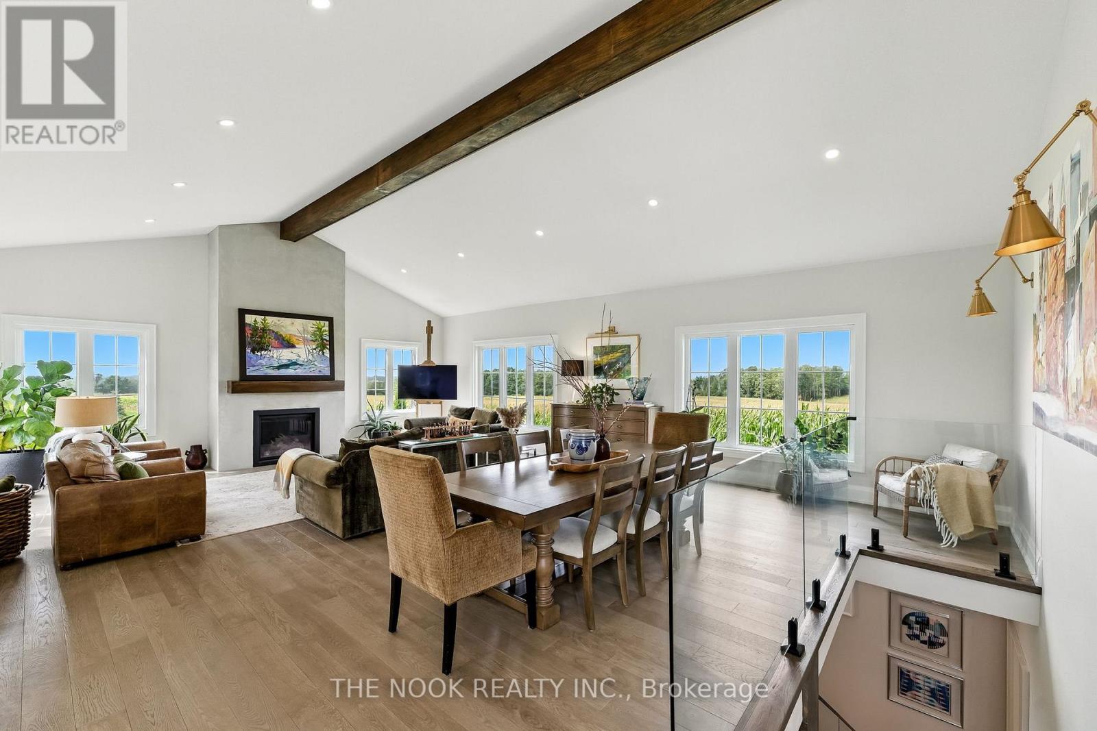 Welcome to this custom-built luxury bungalow on 1.54 acres of private countryside, offering modern comfort with timeless rural charm. A tree-lined driveway leads to beautifully landscaped grounds, a welcoming front porch, & multiple outdoor living spaces, including a raised deck & spacious patio for entertaining. The main level of this home is thoughtfully designed to combine everyday functionality with elegant style. A welcoming foyer with a double closet leads into the open-concept living spaces, where soaring ceilings with wood beams, expansive windows, & a striking fireplace create a bright & inviting atmosphere. The chefs kitchen is a true highlight, featuring high-end appliances, custom cabinetry, a large center island, & a walkout to the deck. Seamlessly connected, the dining area & living room provide an ideal setting for gatherings, with natural light flooding the space from every angle. The primary retreat offers built-in cabinetry, a luxurious 5-piece ensuite with soaker tub & glass shower, & private access to the deck. A second bedroom, currently staged as a home office, adds convenience for guests. Completing the main floor is a well-equipped laundry & mudroom with direct access to the attached garage. The fully finished lower level extends the living space beautifully. A wide staircase with glass railing opens to the rec room, complete with a sleek wet bar, custom built-in shelving, & a cozy fireplace. A glass-enclosed gym provides a dedicated space for fitness while maintaining an open, modern feel. Two generously sized bedrooms, each with large above-grade windows, are complemented by a stylish 4-piece bathroom. The lower level offers the ideal blend of relaxation, recreation, & practicality, while also housing a utility room for added convenience. With an attached garage plus a detached workshop, this property is ideal for both relaxation & practicality, all while surrounded by sweeping farmland views & just minutes from nearby amenities. (id:51158)