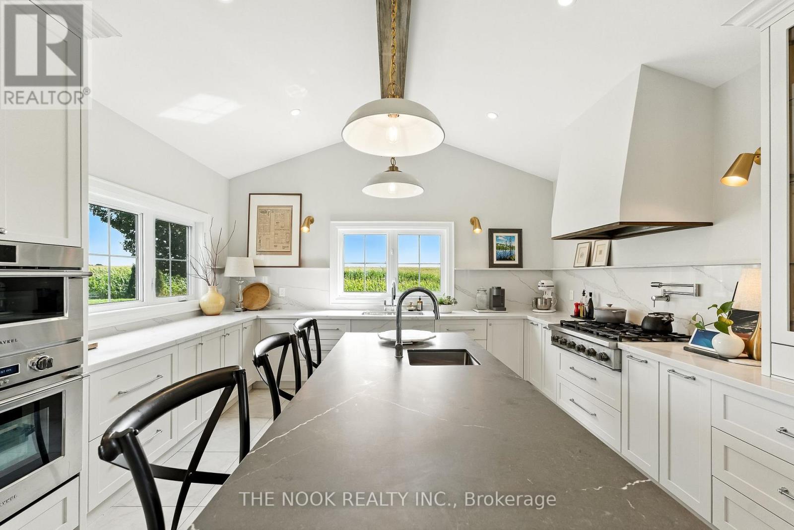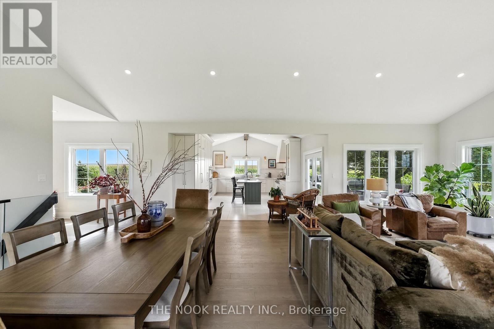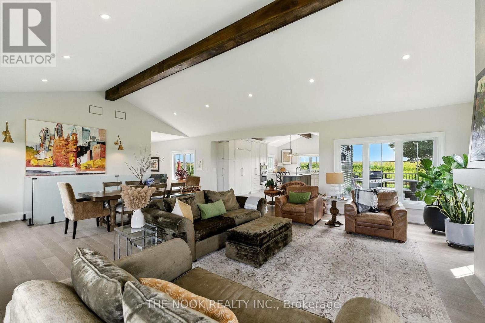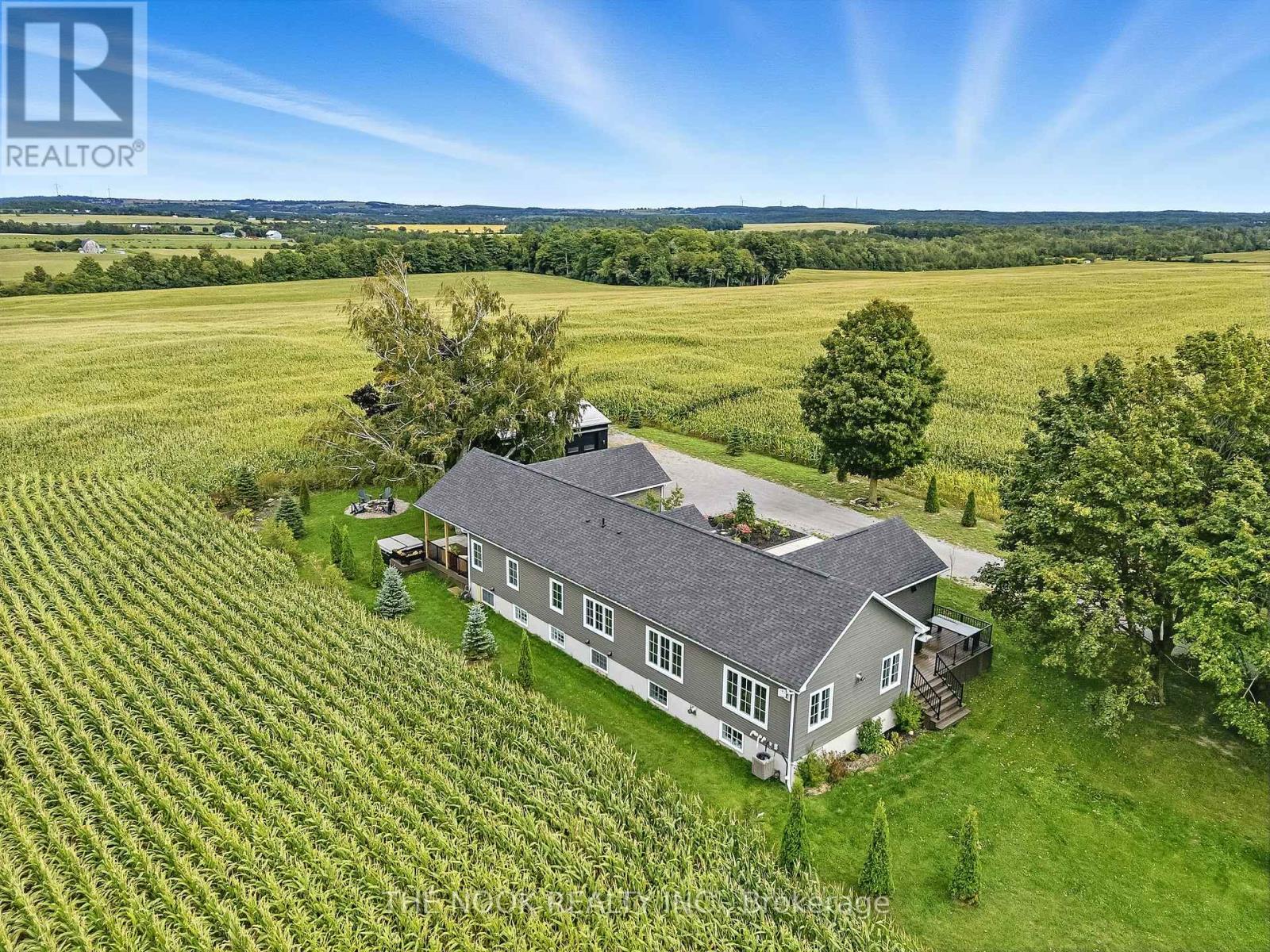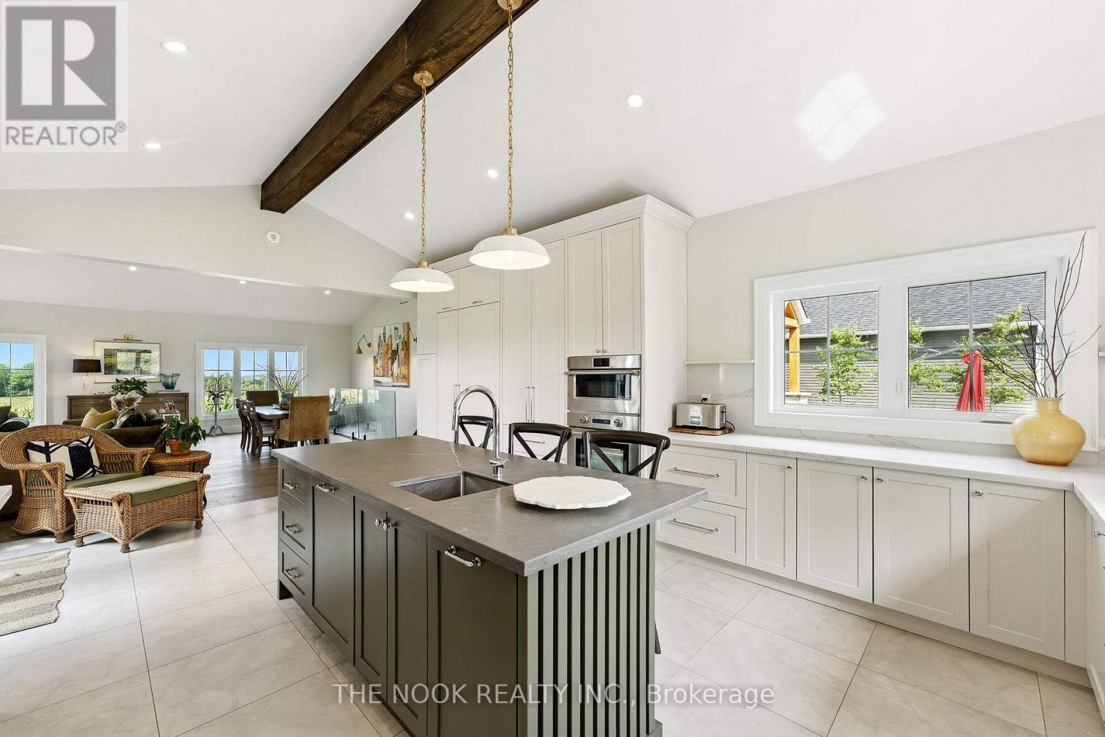 Welcome to this custom-built luxury bungalow on 1.54 acres of private countryside, offering modern comfort with timeless rural charm. A tree-lined driveway leads to beautifully landscaped grounds, a welcoming front porch, & multiple outdoor living spaces, including a raised deck & spacious patio for entertaining. The main level of this home is thoughtfully designed to combine everyday functionality with elegant style. A welcoming foyer with a double closet leads into the open-concept living spaces, where soaring ceilings with wood beams, expansive windows, & a striking fireplace create a bright & inviting atmosphere. The chefs kitchen is a true highlight, featuring high-end appliances, custom cabinetry, a large center island, & a walkout to the deck. Seamlessly connected, the dining area & living room provide an ideal setting for gatherings, with natural light flooding the space from every angle. The primary retreat offers built-in cabinetry, a luxurious 5-piece ensuite with soaker tub & glass shower, & private access to the deck. A second bedroom, currently staged as a home office, adds convenience for guests. Completing the main floor is a well-equipped laundry & mudroom with direct access to the attached garage. The fully finished lower level extends the living space beautifully. A wide staircase with glass railing opens to the rec room, complete with a sleek wet bar, custom built-in shelving, & a cozy fireplace. A glass-enclosed gym provides a dedicated space for fitness while maintaining an open, modern feel. Two generously sized bedrooms, each with large above-grade windows, are complemented by a stylish 4-piece bathroom. The lower level offers the ideal blend of relaxation, recreation, & practicality, while also housing a utility room for added convenience. With an attached garage plus a detached workshop, this property is ideal for both relaxation & practicality, all while surrounded by sweeping farmland views & just minutes from nearby amenities. (id:51158)