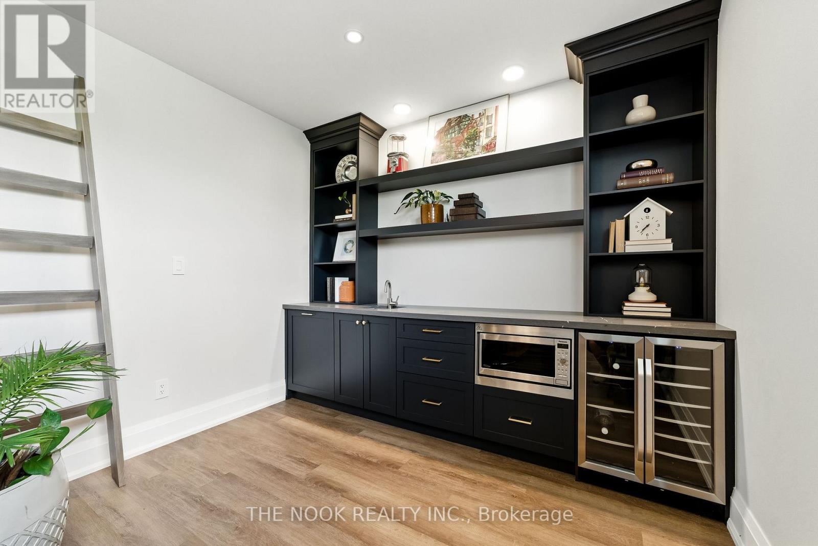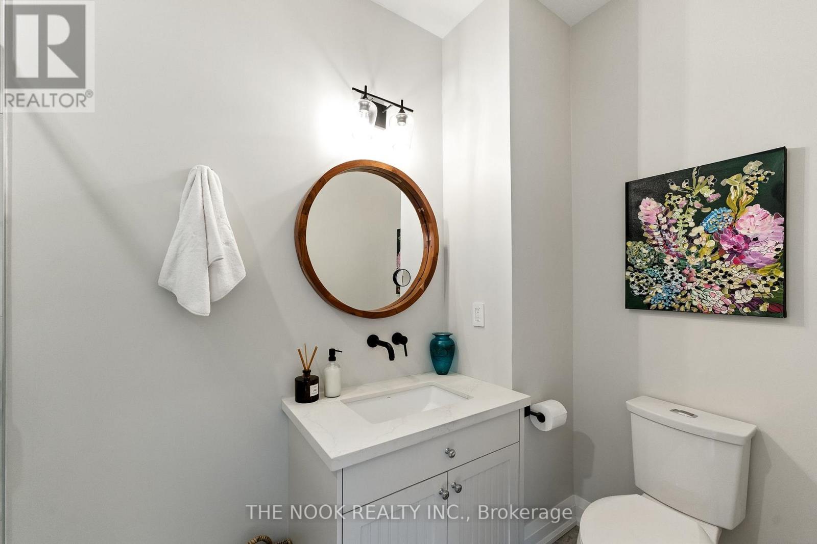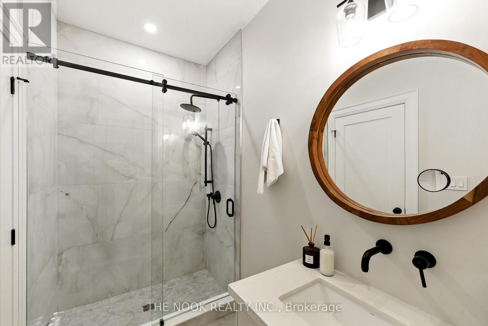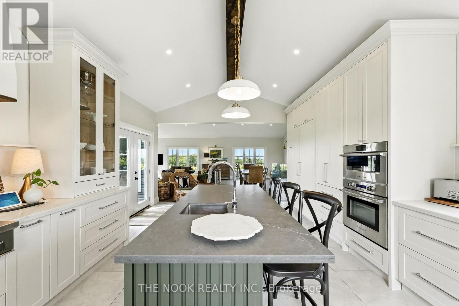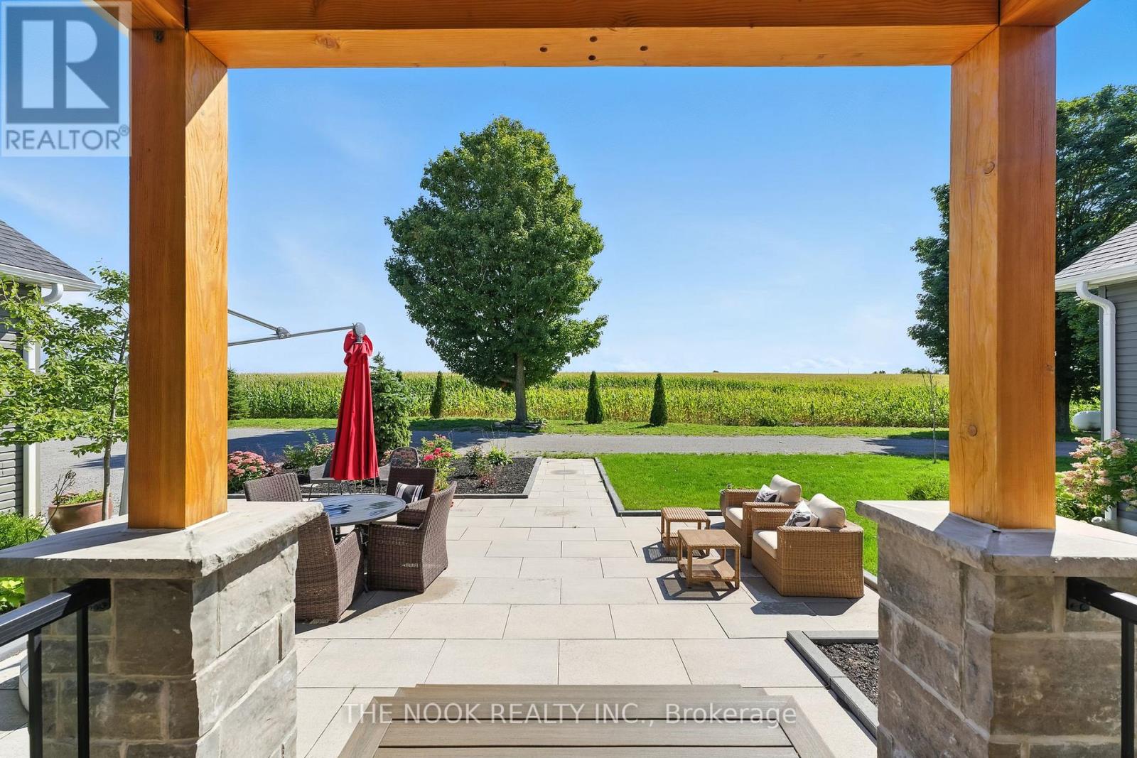 Welcome to this custom-built luxury bungalow on 1.54 acres of private countryside, offering modern comfort with timeless rural charm. A tree-lined driveway leads to beautifully landscaped grounds, a welcoming front porch, & multiple outdoor living spaces, including a raised deck & spacious patio for entertaining. The main level of this home is thoughtfully designed to combine everyday functionality with elegant style. A welcoming foyer with a double closet leads into the open-concept living spaces, where soaring ceilings with wood beams, expansive windows, & a striking fireplace create a bright & inviting atmosphere. The chefs kitchen is a true highlight, featuring high-end appliances, custom cabinetry, a large center island, & a walkout to the deck. Seamlessly connected, the dining area & living room provide an ideal setting for gatherings, with natural light flooding the space from every angle. The primary retreat offers built-in cabinetry, a luxurious 5-piece ensuite with soaker tub & glass shower, & private access to the deck. A second bedroom, currently staged as a home office, adds convenience for guests. Completing the main floor is a well-equipped laundry & mudroom with direct access to the attached garage. The fully finished lower level extends the living space beautifully. A wide staircase with glass railing opens to the rec room, complete with a sleek wet bar, custom built-in shelving, & a cozy fireplace. A glass-enclosed gym provides a dedicated space for fitness while maintaining an open, modern feel. Two generously sized bedrooms, each with large above-grade windows, are complemented by a stylish 4-piece bathroom. The lower level offers the ideal blend of relaxation, recreation, & practicality, while also housing a utility room for added convenience. With an attached garage plus a detached workshop, this property is ideal for both relaxation & practicality, all while surrounded by sweeping farmland views & just minutes from nearby amenities. (id:51158)