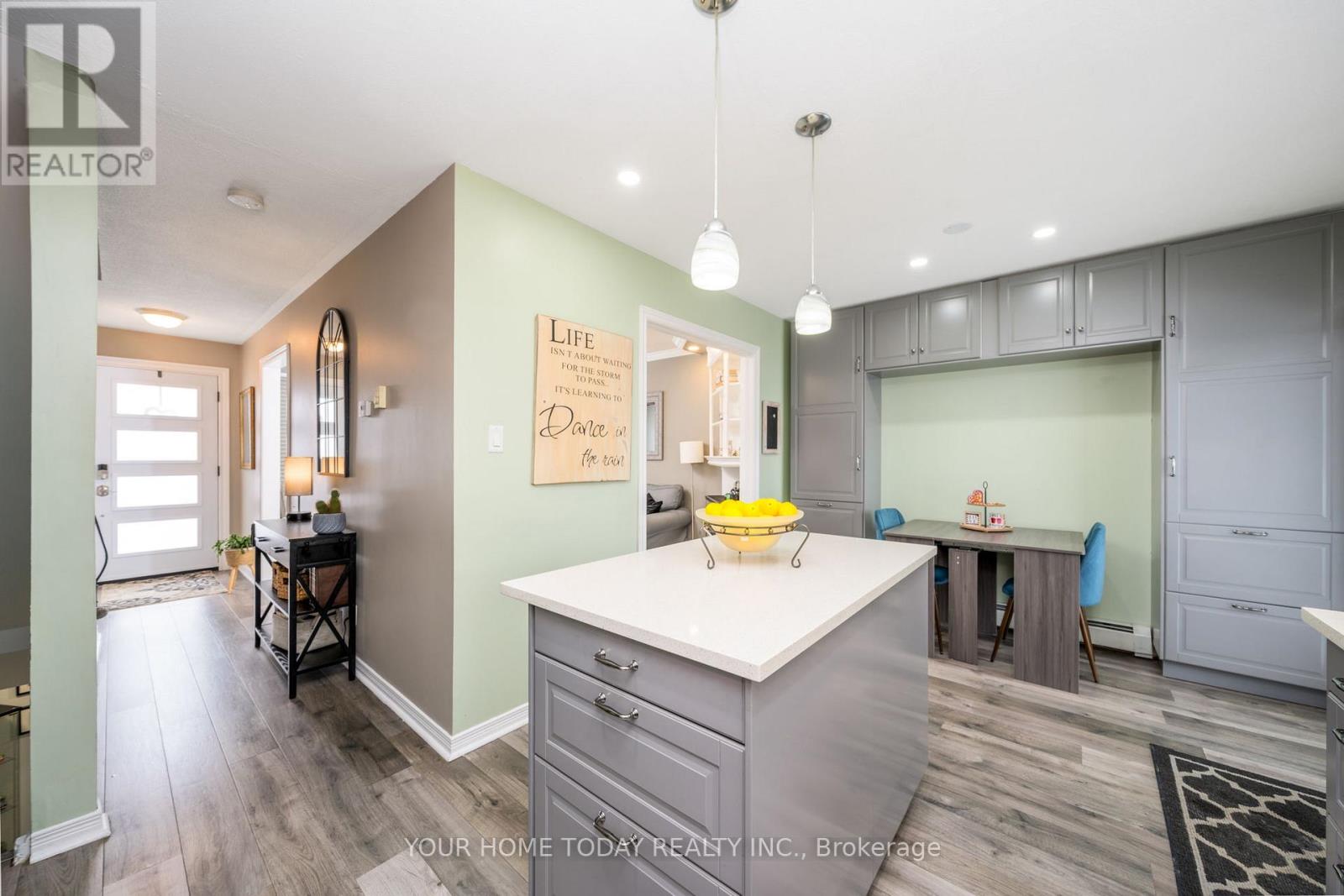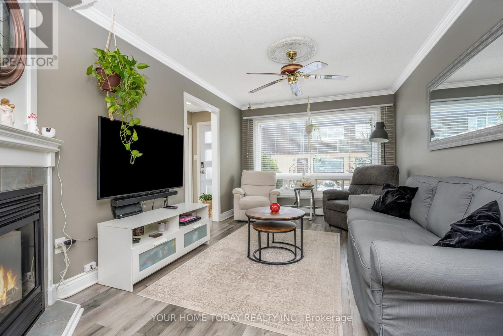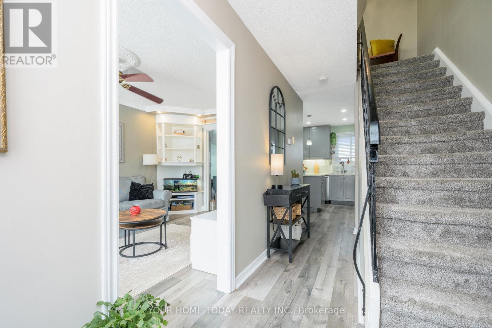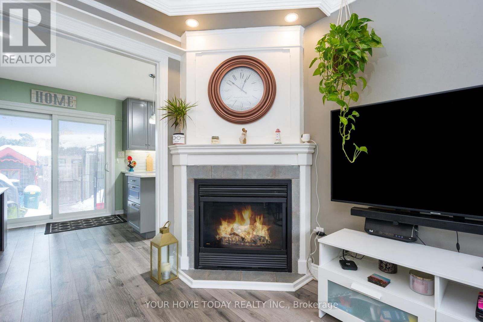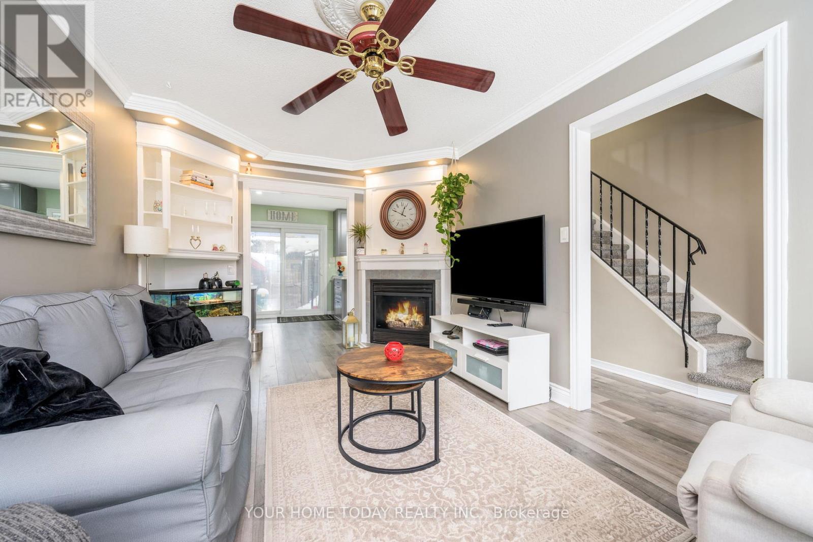 $415 MonthlyAffordable living awaits in this beautifully updated three-bedroom, two-bathroom townhouse that's been finished to perfection and truly move-in ready. The main level showcases stylish laminate flooring and tasteful finishes throughout. The modern kitchen features sleek cabinetry, quartz countertops, glass tile backsplash and an island with seating and storage, plus a walkout to a private, fenced yard with gazebo - perfect for relaxing or entertaining. The sun-filled living room offers a warm and welcoming atmosphere with a corner gas fireplace accented by an attractive wood mantel, an eye-catching built-in corner cabinet, crown molding, and pot lighting. Open to the kitchen, this space creates a seamless setting for family life and entertaining. Upstairs, you'll find three generous bedrooms, including a primary bedroom with his-and-hers closets and semi-ensuite access to a four-piece bathroom. A finished basement adds valuable living space with a spacious rec room featuring an electric fireplace, pot lighting and a built-in bar/serving area, along with a four-piece bathroom and laundry/utility/storage area. Ideally located just steps to the mall and close to schools, parks, restaurants, arena, GO Transit and more, with easy access to main roads for commuters. (id:51158)