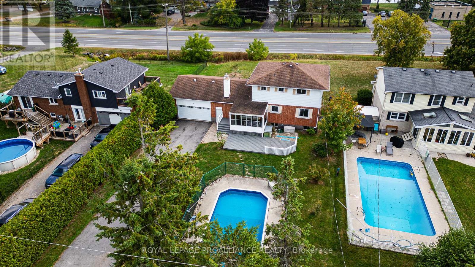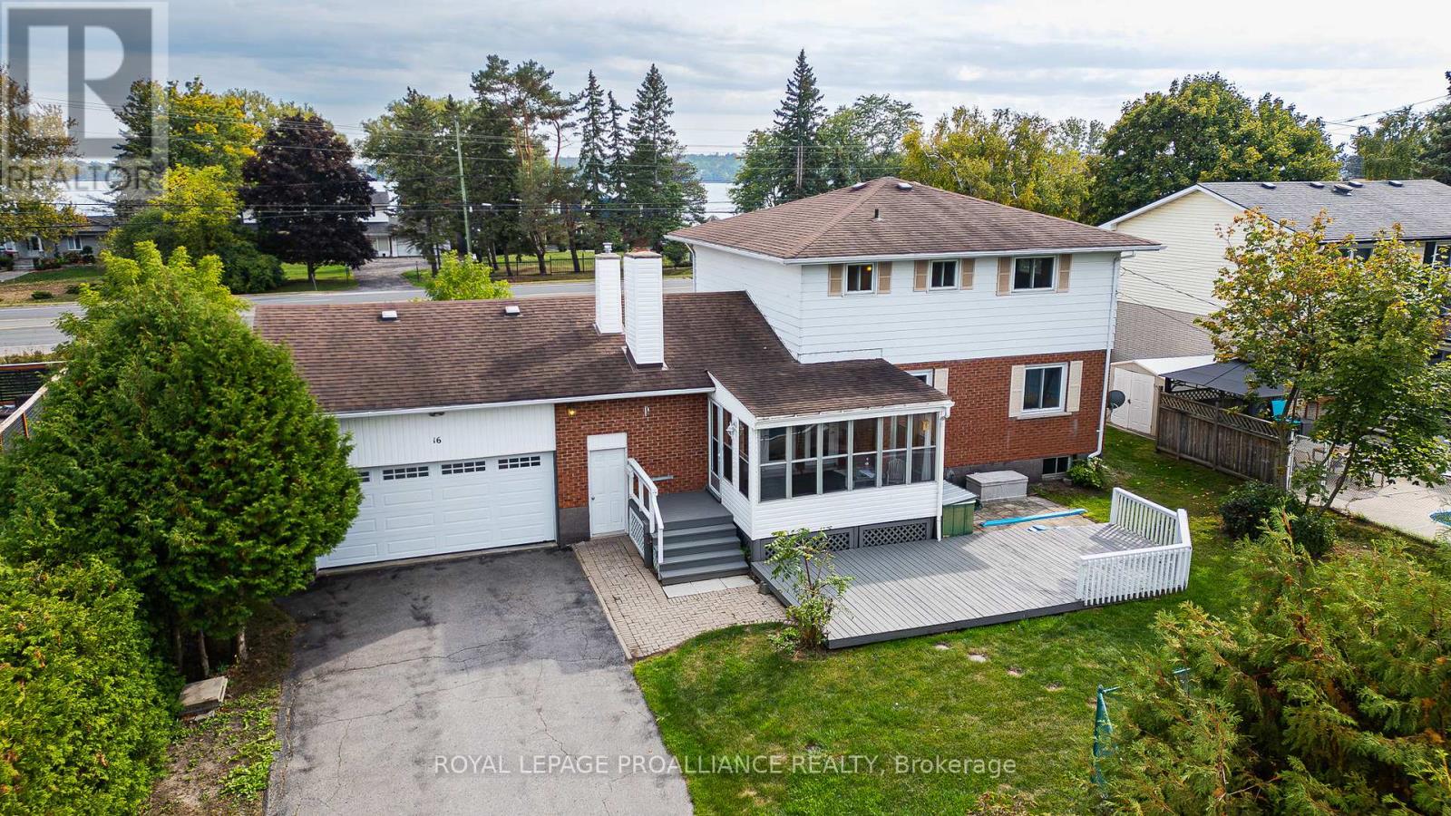 Montrose Subdivision with Bay of Quinte water views! Spacious 2sty detached home in popular Montrose Subdivision, offering of an acre lot, municipal water, natural gas & an inground pool for those hot summer days (next year anyway). Approx. 2000sqft above grade with 3 bdrms & 3 bathrooms including a 4pc. main bath on 2nd floor, a 3pc. ensuite off Primary & a 2pc. bathroom on main. The main floor family rm has French doors, a wood fireplace & a bathroom, making it ideal for those looking for a main floor 4th bdrm or additional living space. Tile floors, tile backsplash, white cabinets, appliances & a pantry grace the homes' kitchen while hardwood floors can be found in the homes dining, family & living rooms. Bright living rm has a bay window & takes advantage of the Southern exposure including views of the Bay from this side of the house, especially from the upper level. 3 season sunroom at North end of house overlooking yard, deck & pool. Upstairs has 3 spacious bdrms & 2 baths including a primary suite with dbl closets & its own ensuite bath with tile shower. Part finished lower lvl offers a rec rm with corner gas fireplace, laundry area with sinks, cold rm & utility/storage rm. Other features include: municipal water, natural gas furnace (2012), C/Air, gas BBQ hookup, attached double garage, paved parking for 5+ cars, C/Vac & pool liner June 2025. Montrose Subdivision is conveniently located in Quinte West between Belleville & Trenton, with easy access to amenities, Hwy 401 & even Prince Edward County region. Great family home in family-friendly neighbourhood. (id:51158)