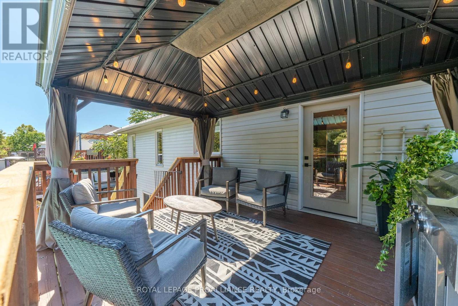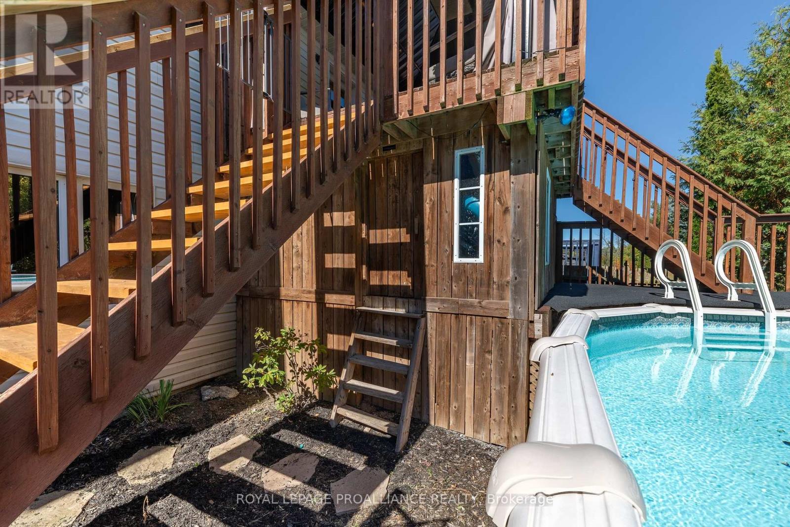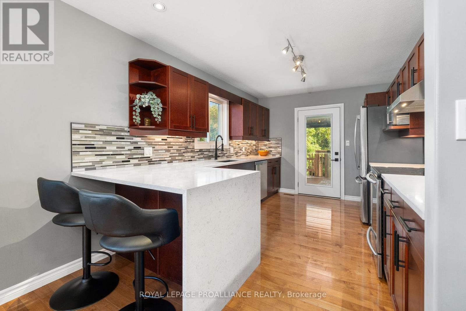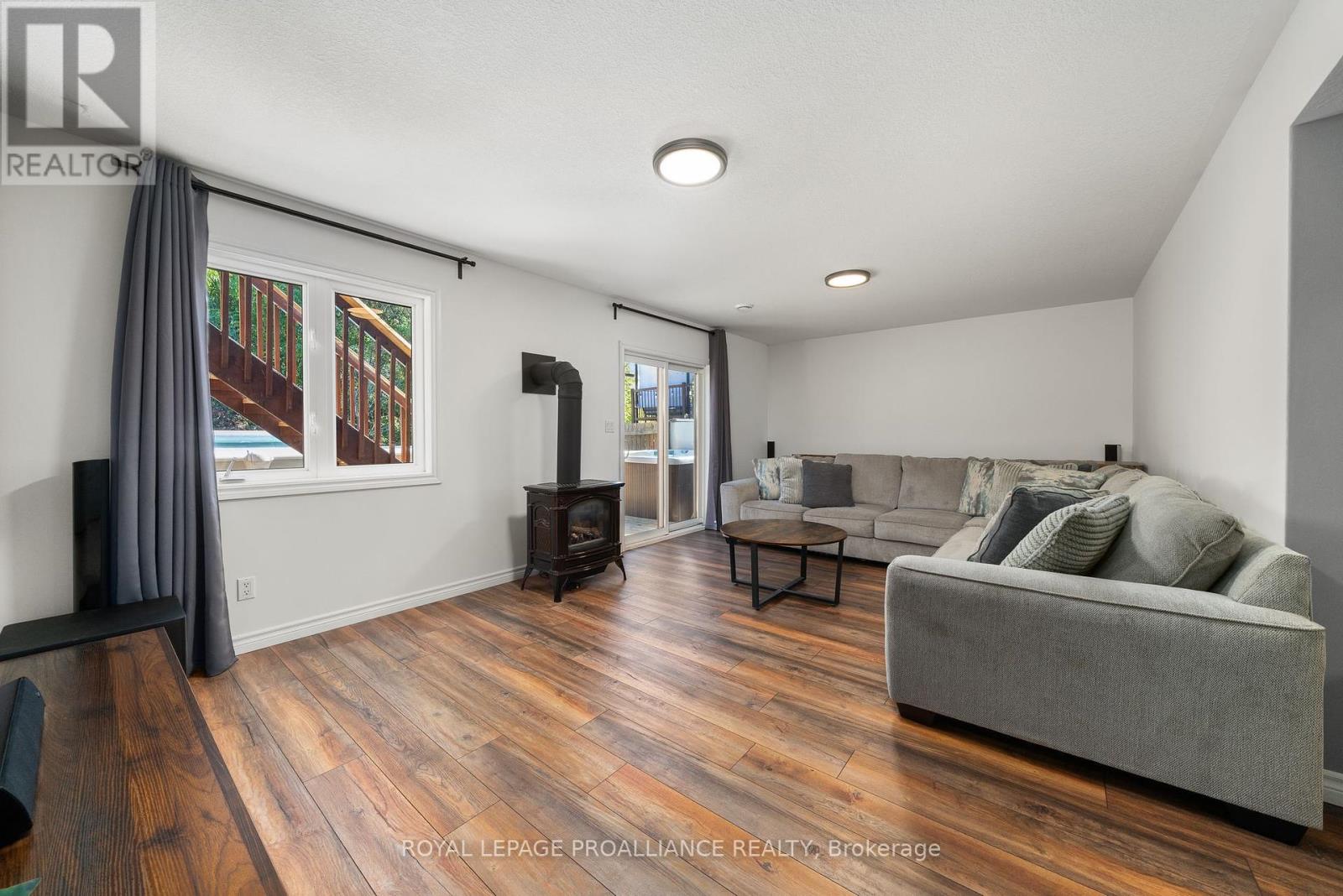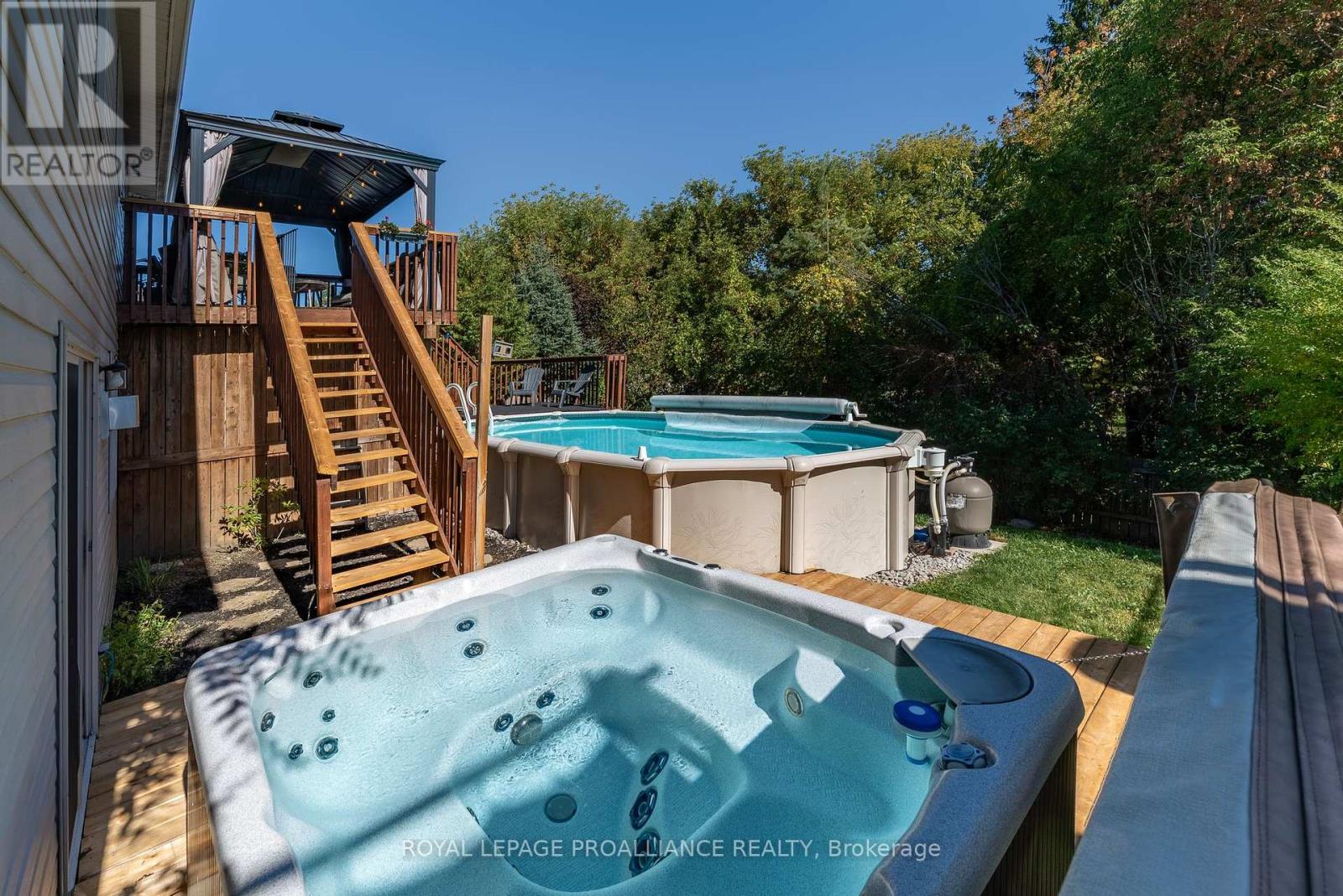 This not-so-ordinary 5-bedroom, 3-bath walk-out raised bungalow offers great space for entertaining indoors and out with plenty of space for families of all sizes. The vaulted main level living room with soaring picture window and cozy gas fireplace creates a unique and impressive, bright and open feeling throughout the main living areas. Generous dining area, great for family meals and dinner parties, is open to the stylish kitchen with waterfall quartz countertop, peninsula seating, tiled backsplash, and stainless steel appliances. Step through the garden door to the upper deck with metal pergola the perfect spot to start your day or enjoy warm summer nights. 3 bed 2 bath main floor layout makes daily routines flow easily. The spacious primary suite includes a 3-piece ensuite, while 2 additional bedrooms are served by a spacious 4pc family bath with plenty of storage. The walk-out lower level offers fun and flexibility with 2 additional bedrooms, a 4-piece bath, and a large rec room with gas fireplace and direct access to the hot tub. Great space for large families or hosting overnight guests, or create dedicated home gym and office space. A generous laundry room with access to plenty of storage completes the space. Outdoors, enjoy a fully fenced, low-maintenance backyard with an above-ground pool, hot tub area, handy under-deck storage, and mature trees backing onto the scenic Lower Trent Trail. The double attached garage provides excellent parking and storage, with space versatile enough for a golf simulator. Located in the welcoming community of Frankford, you'll enjoy riverfront fun, outdoor recreation, and a quick drive to Batawa's ski hill and trails. Updates include: Roof (2022), On Demand Hot Water Heater: (2025) and AC (2025). With space to relax, play, and entertain, your family is sure to Feel at Home at 16 Kyle Court. (id:51158)