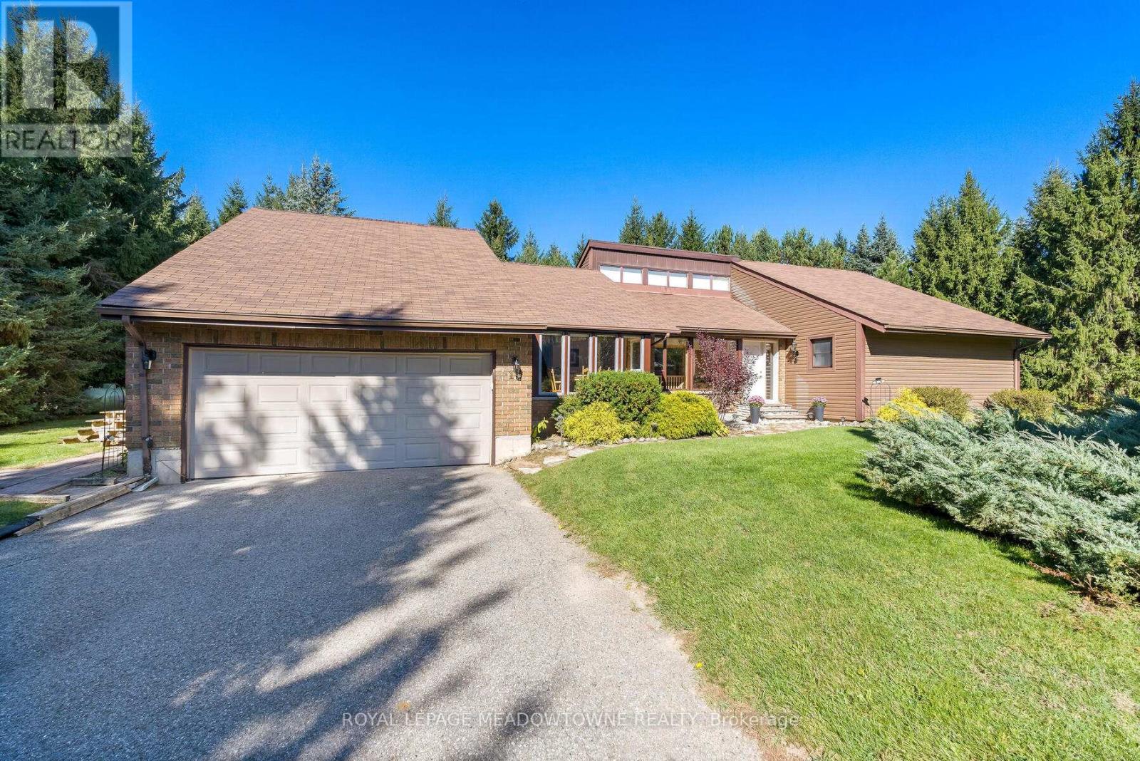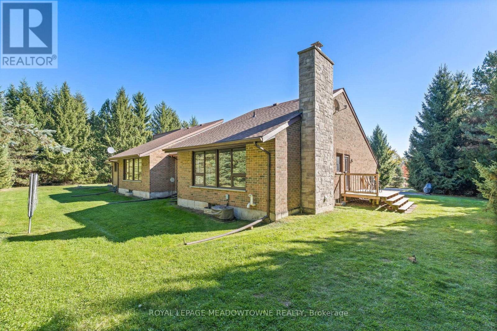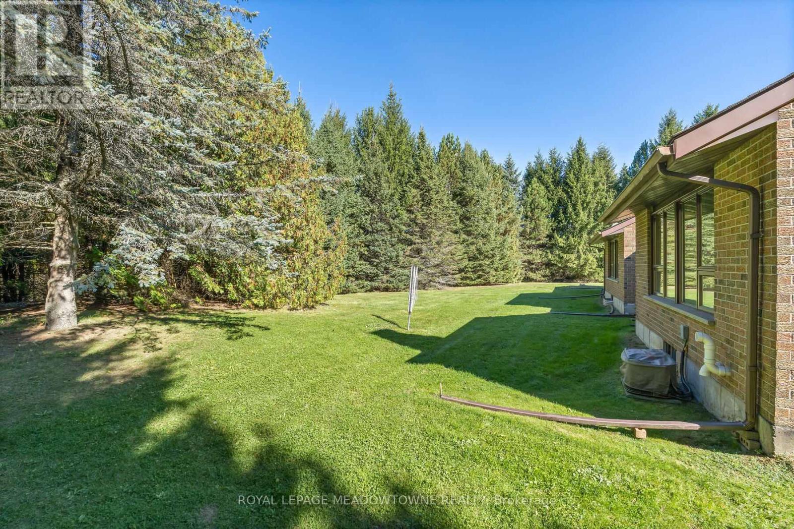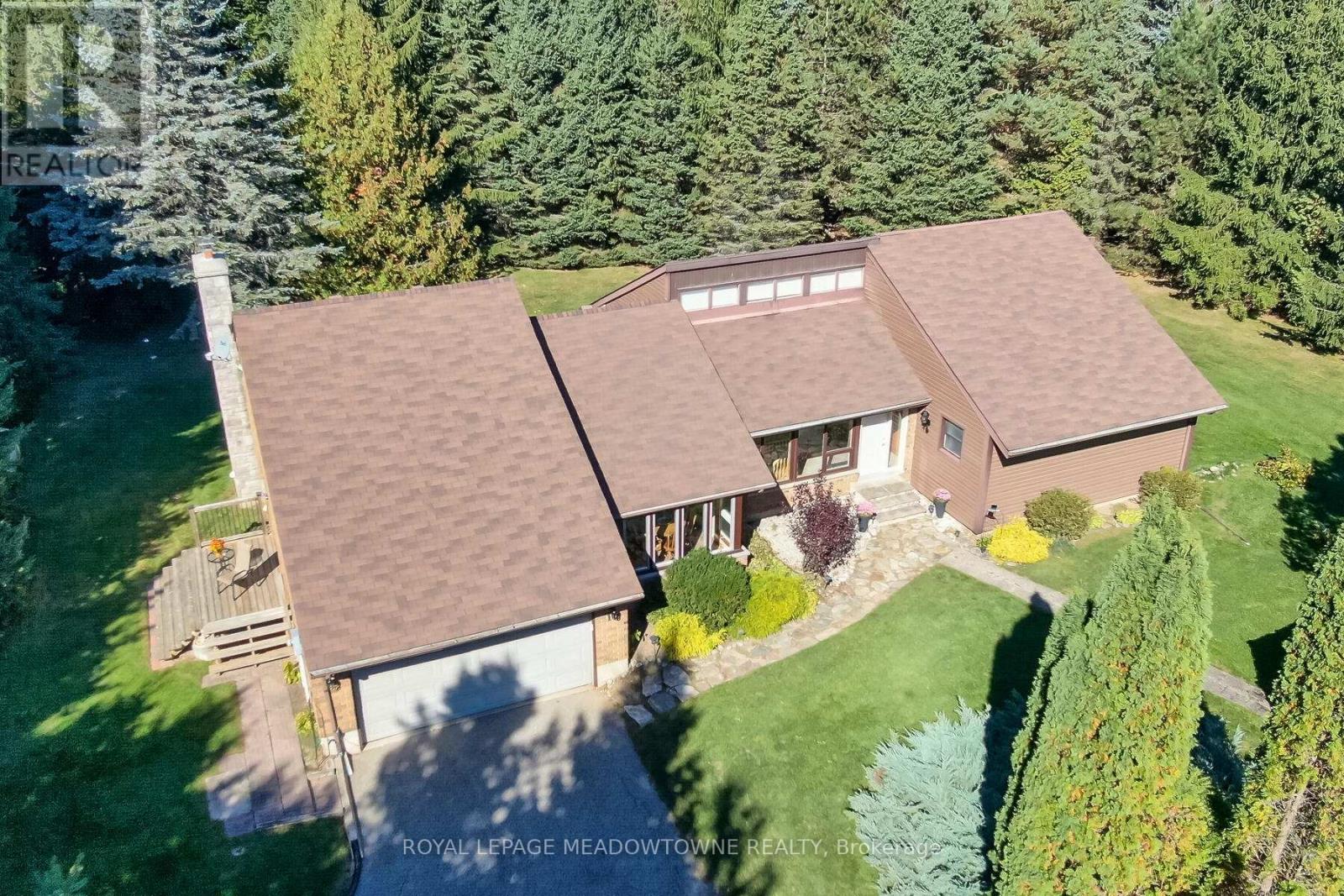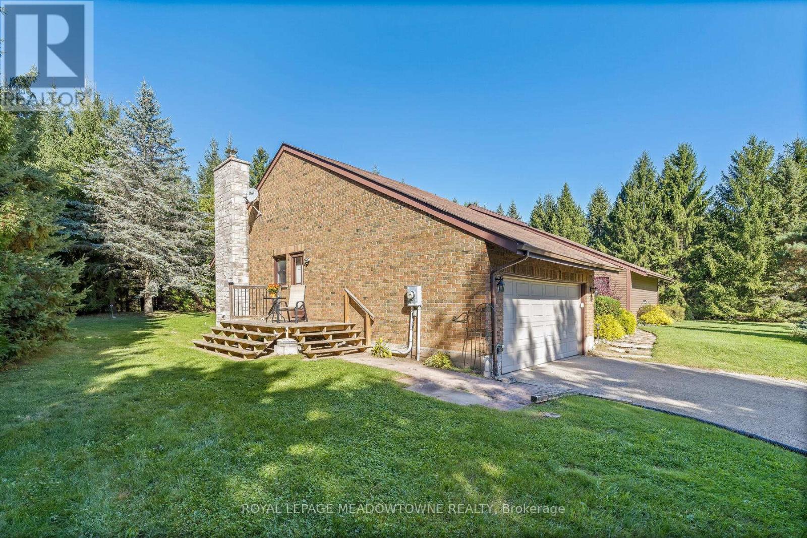 Fabulous bungalow on private 2 acre lot in prime location in Halton Hills. Quiet pocket of custom homes just minutes to Georgetown, Acton, the Limehouse kilns and Bruce trail. Lovingly cared for by original owners. The principal rooms are quite large and all have gorgeous country views. The family room features a wood-burning fireplace and gleaming hardwood floors. Enjoy the sun-filled eat-in kitchen with granite counters and a huge wall-to-wall pantry. The primary suite offers a walkout to the yard plus a 4-pc ensuite and two closets. Main floor laundry with garage and side door entrance. There is a massive lower level that is currently finished as a rec room with loads of room for the large pool table, exercise area and it also features a separate room ideal for a bedroom or storage space. Nature abounds this beautiful property with numerous evergreens and its own little backyard forest with trails. The two-car garage is oversize and there is a super long driveway for all your guests' vehicles and your toys too. Shingles 2018, Furnace rebuilt 2023, many updated windows. Survey available. Enjoy the peace and quiet of the country living just minutes to town. (id:51158)