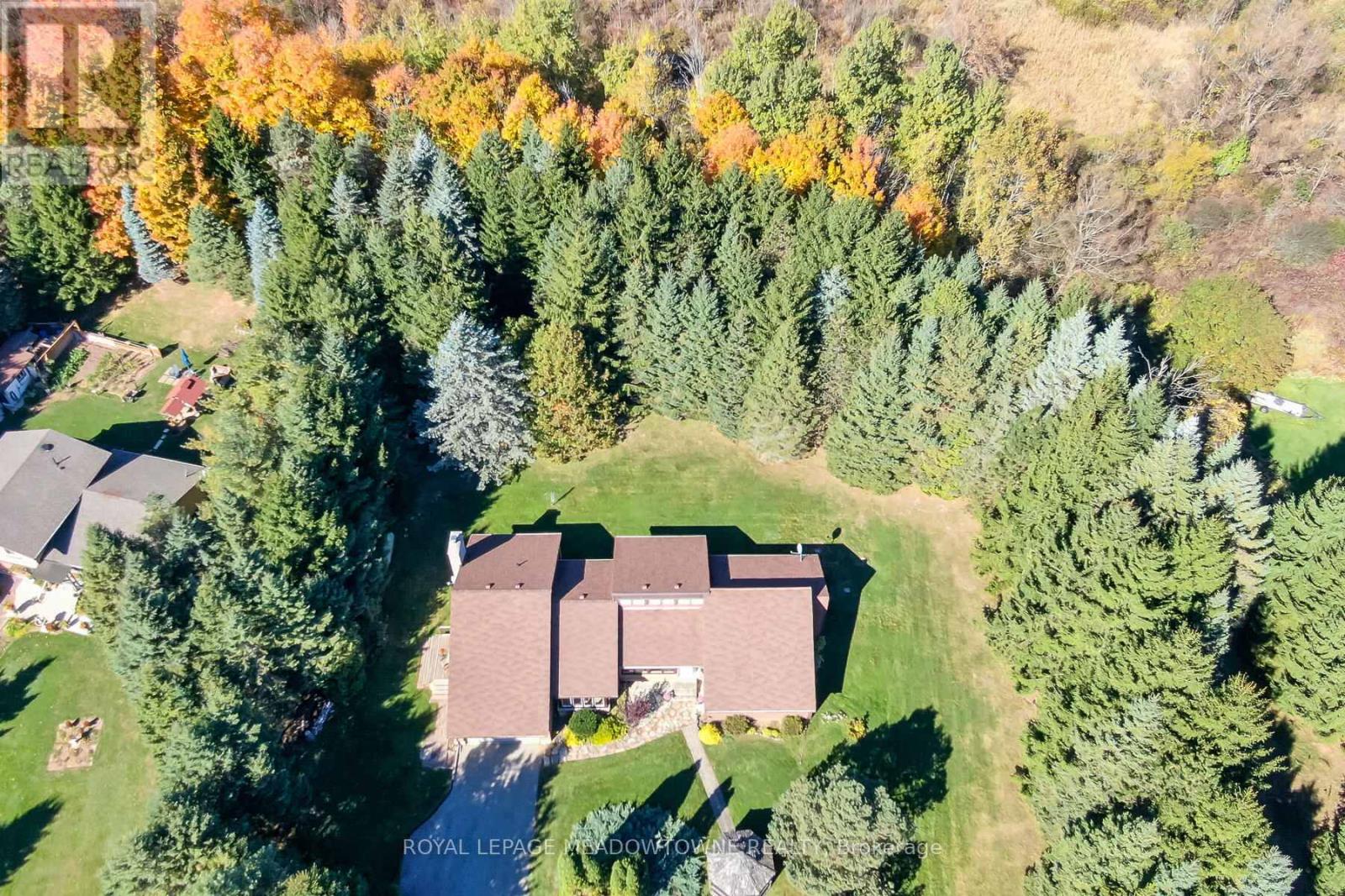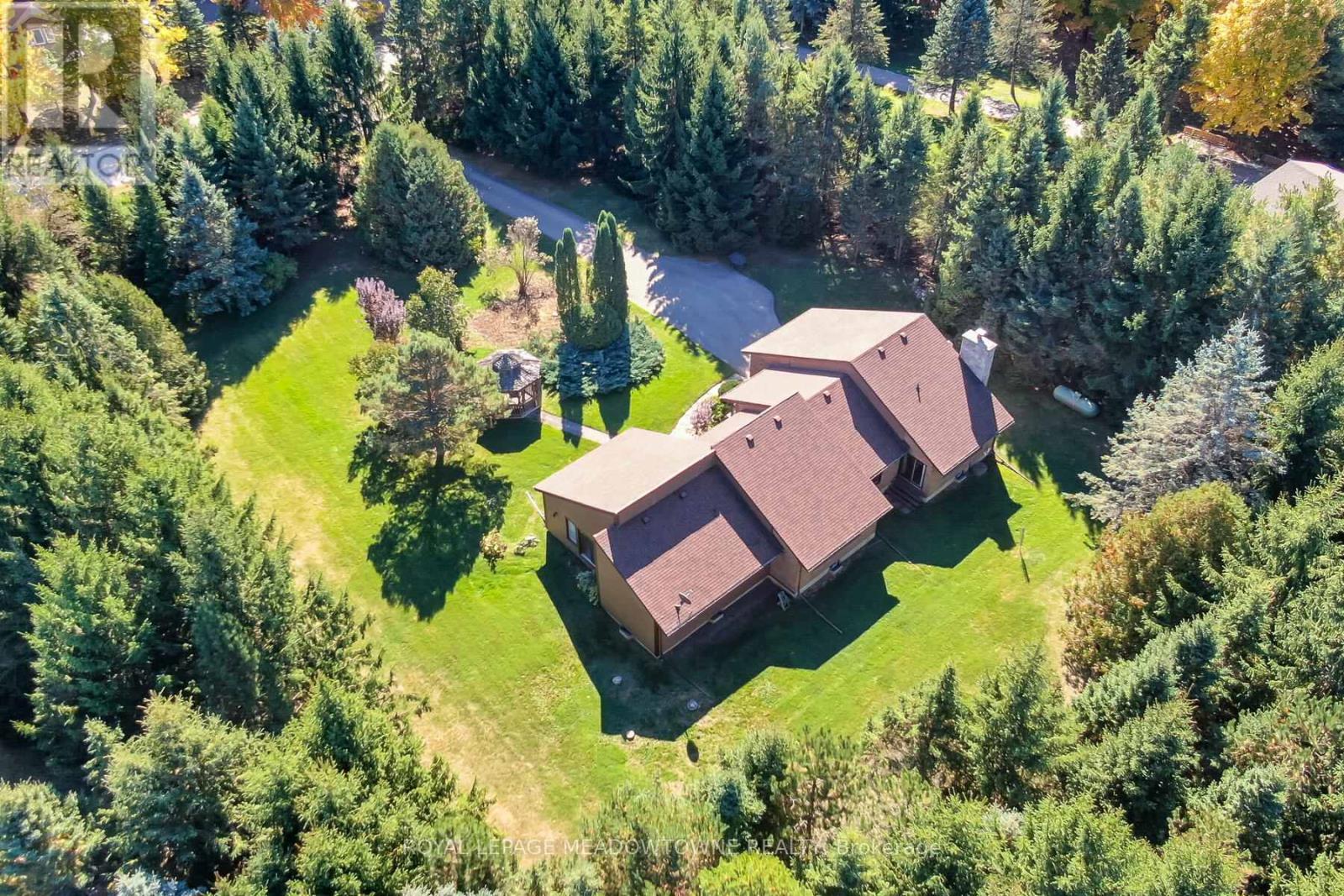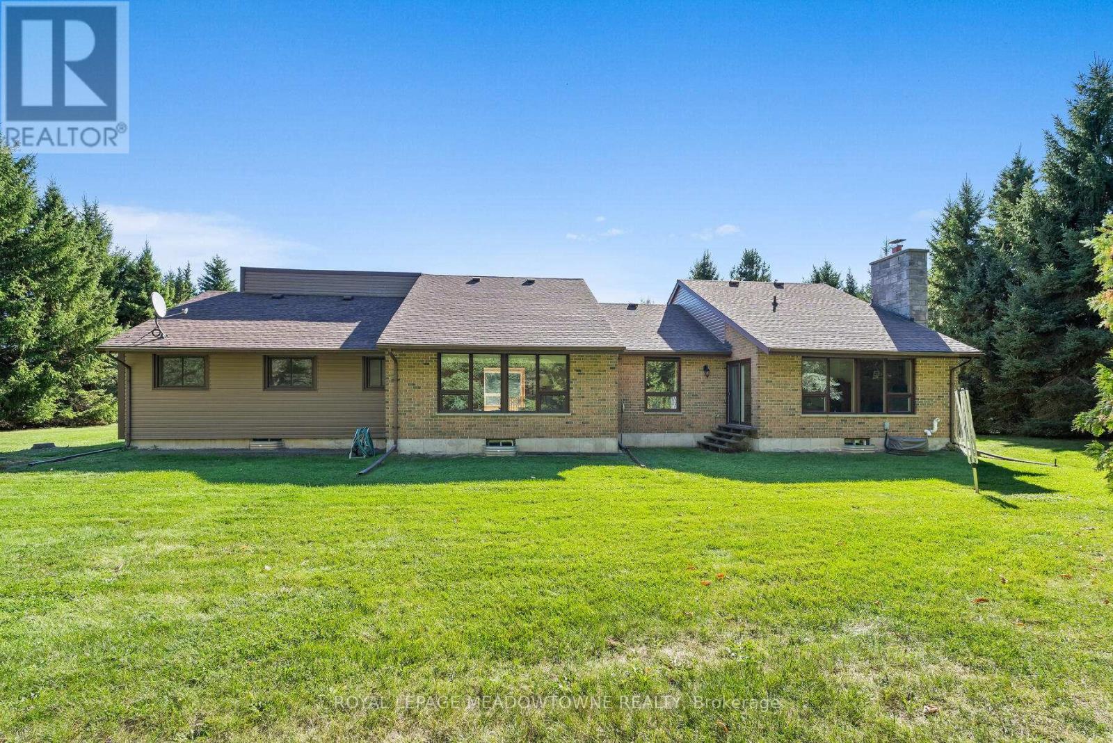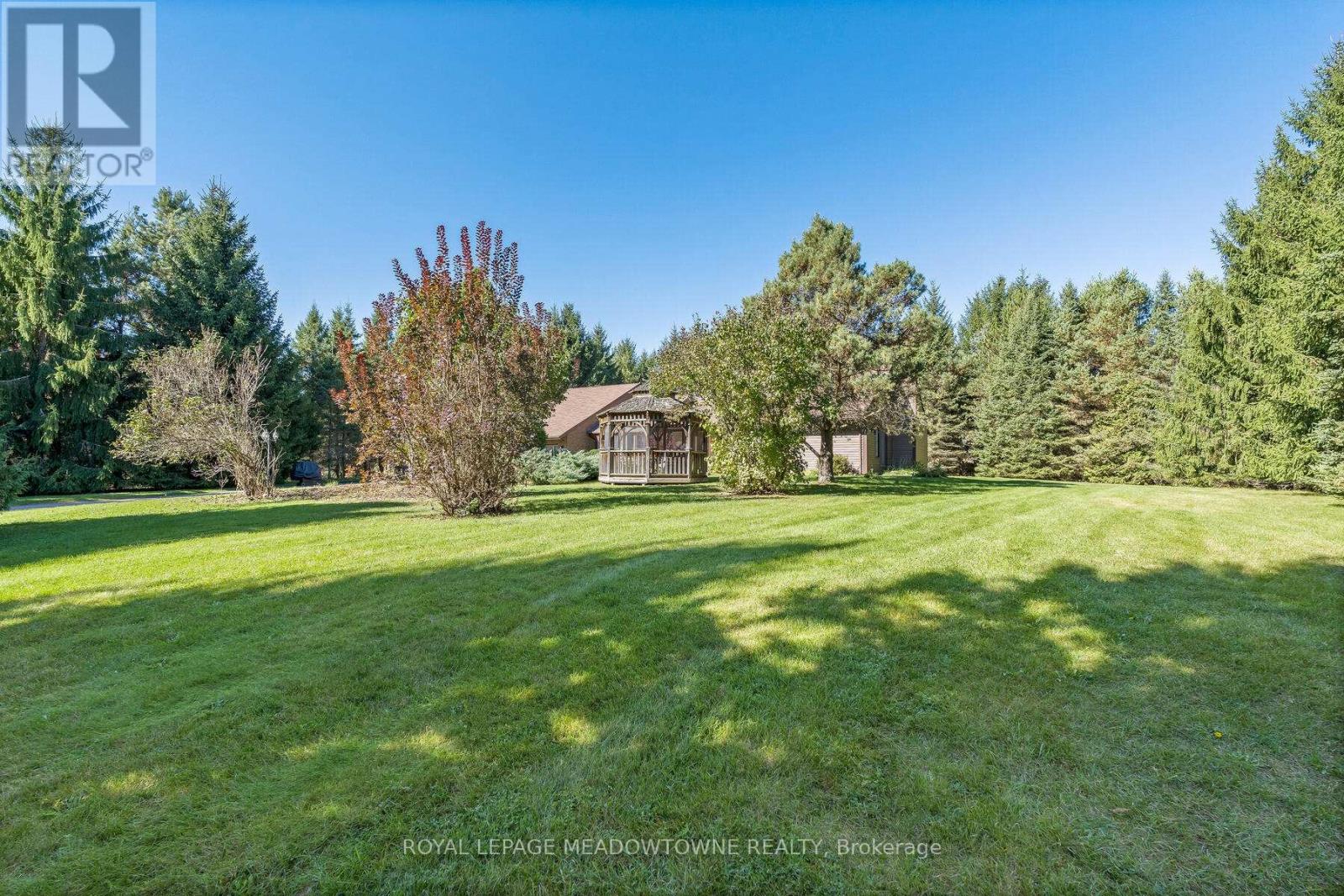 Fabulous bungalow on private 2 acre lot in prime location in Halton Hills. Quiet pocket of custom homes just minutes to Georgetown, Acton, the Limehouse kilns and Bruce trail. Lovingly cared for by original owners. The principal rooms are quite large and all have gorgeous country views. The family room features a wood-burning fireplace and gleaming hardwood floors. Enjoy the sun-filled eat-in kitchen with granite counters and a huge wall-to-wall pantry. The primary suite offers a walkout to the yard plus a 4-pc ensuite and two closets. Main floor laundry with garage and side door entrance. There is a massive lower level that is currently finished as a rec room with loads of room for the large pool table, exercise area and it also features a separate room ideal for a bedroom or storage space. Nature abounds this beautiful property with numerous evergreens and its own little backyard forest with trails. The two-car garage is oversize and there is a super long driveway for all your guests' vehicles and your toys too. Shingles 2018, Furnace rebuilt 2023, many updated windows. Survey available. Enjoy the peace and quiet of the country living just minutes to town. (id:51158)