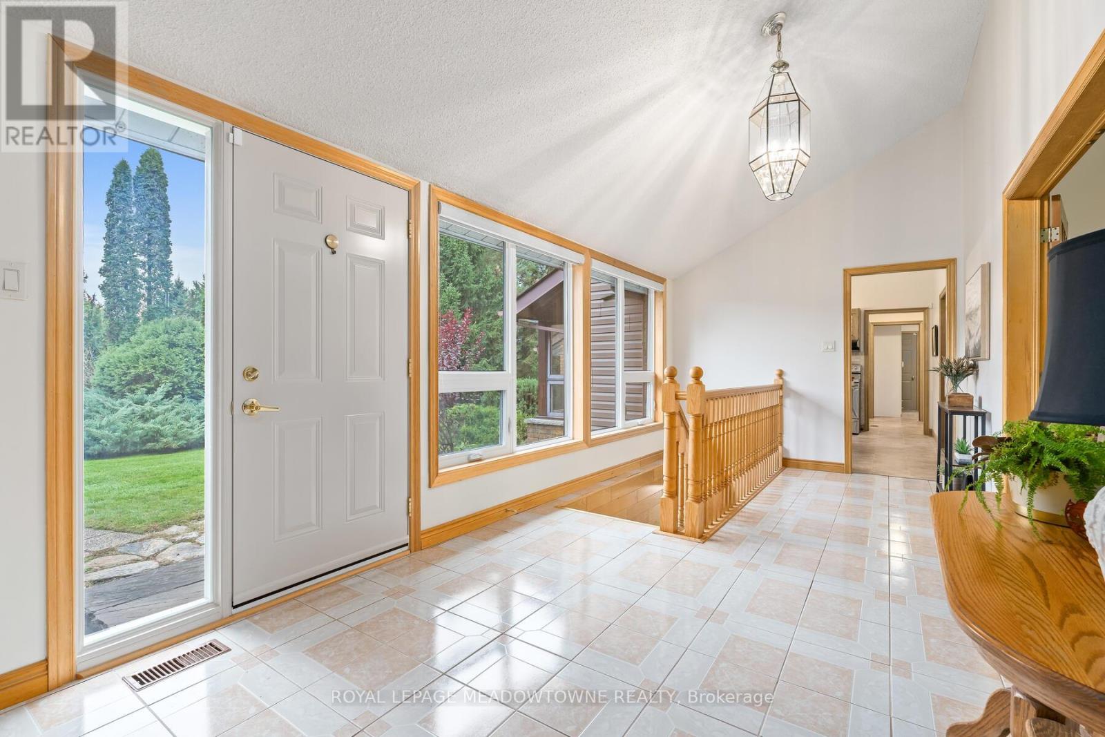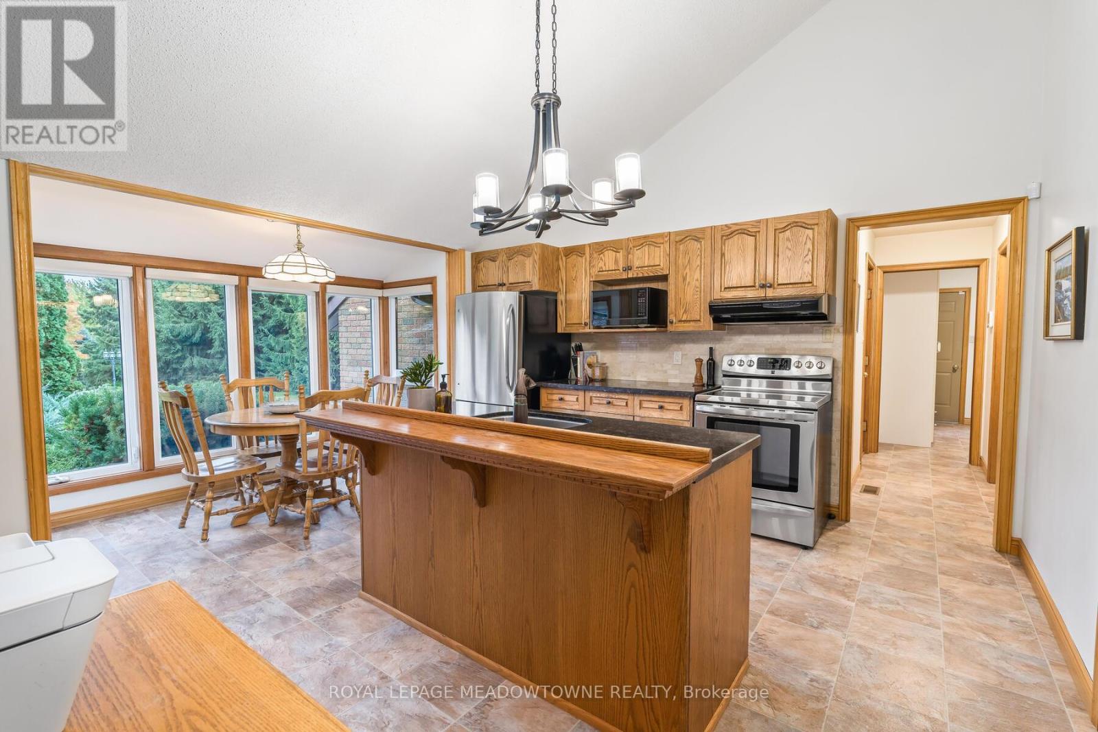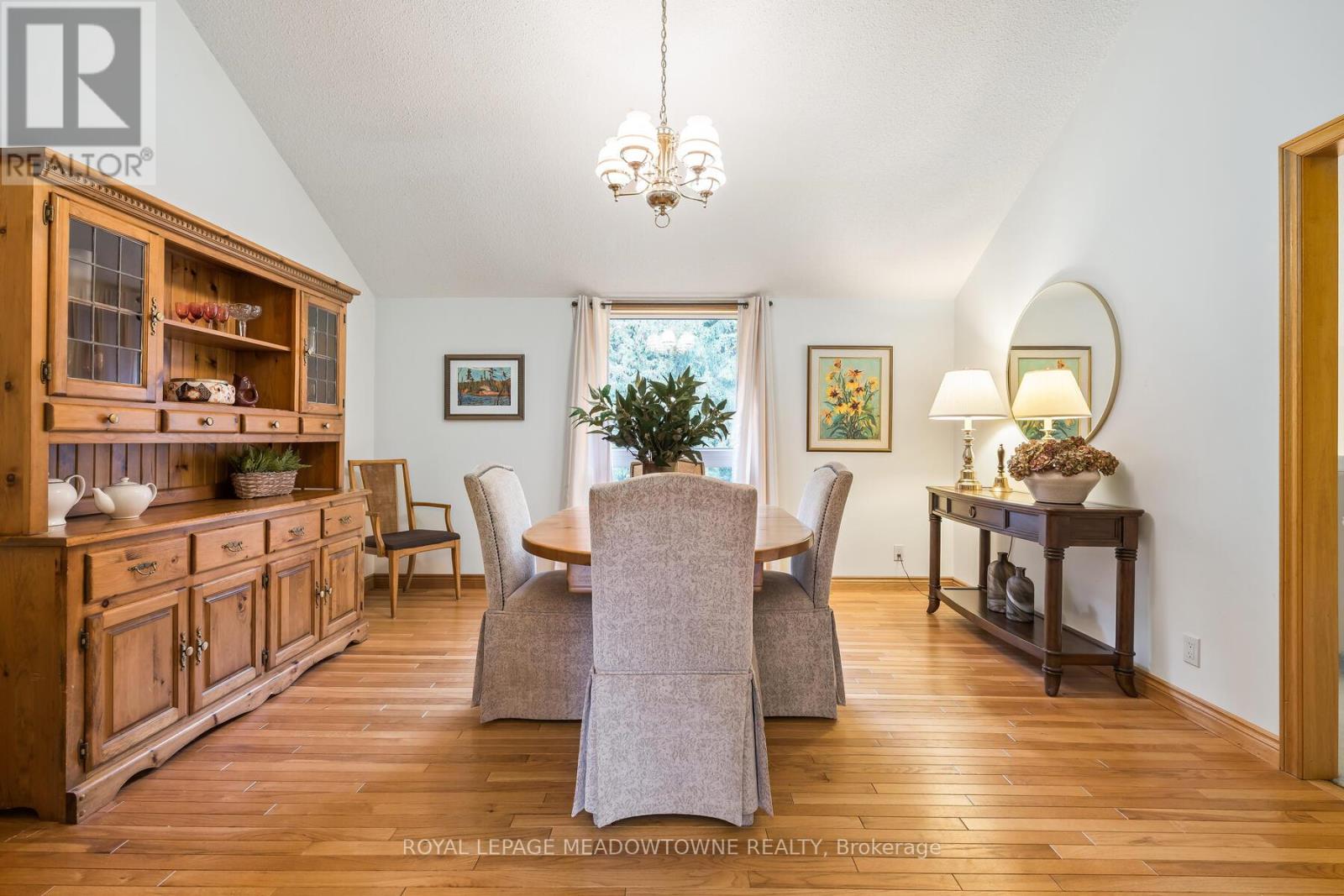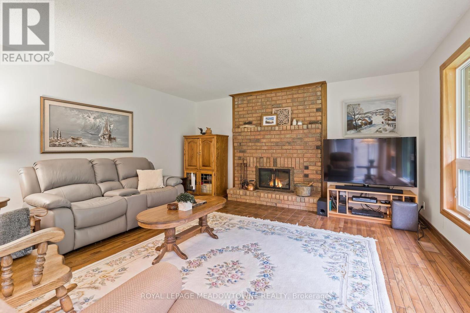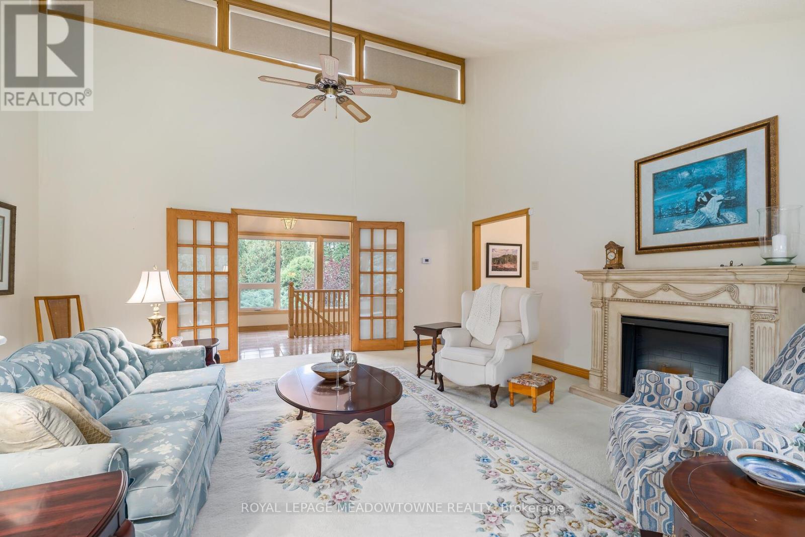 Fabulous bungalow on private 2 acre lot in prime location in Halton Hills. Quiet pocket of custom homes just minutes to Georgetown, Acton, the Limehouse kilns and Bruce trail. Lovingly cared for by original owners. The principal rooms are quite large and all have gorgeous country views. The family room features a wood-burning fireplace and gleaming hardwood floors. Enjoy the sun-filled eat-in kitchen with granite counters and a huge wall-to-wall pantry. The primary suite offers a walkout to the yard plus a 4-pc ensuite and two closets. Main floor laundry with garage and side door entrance. There is a massive lower level that is currently finished as a rec room with loads of room for the large pool table, exercise area and it also features a separate room ideal for a bedroom or storage space. Nature abounds this beautiful property with numerous evergreens and its own little backyard forest with trails. The two-car garage is oversize and there is a super long driveway for all your guests' vehicles and your toys too. Shingles 2018, Furnace rebuilt 2023, many updated windows. Survey available. Enjoy the peace and quiet of the country living just minutes to town. (id:51158)